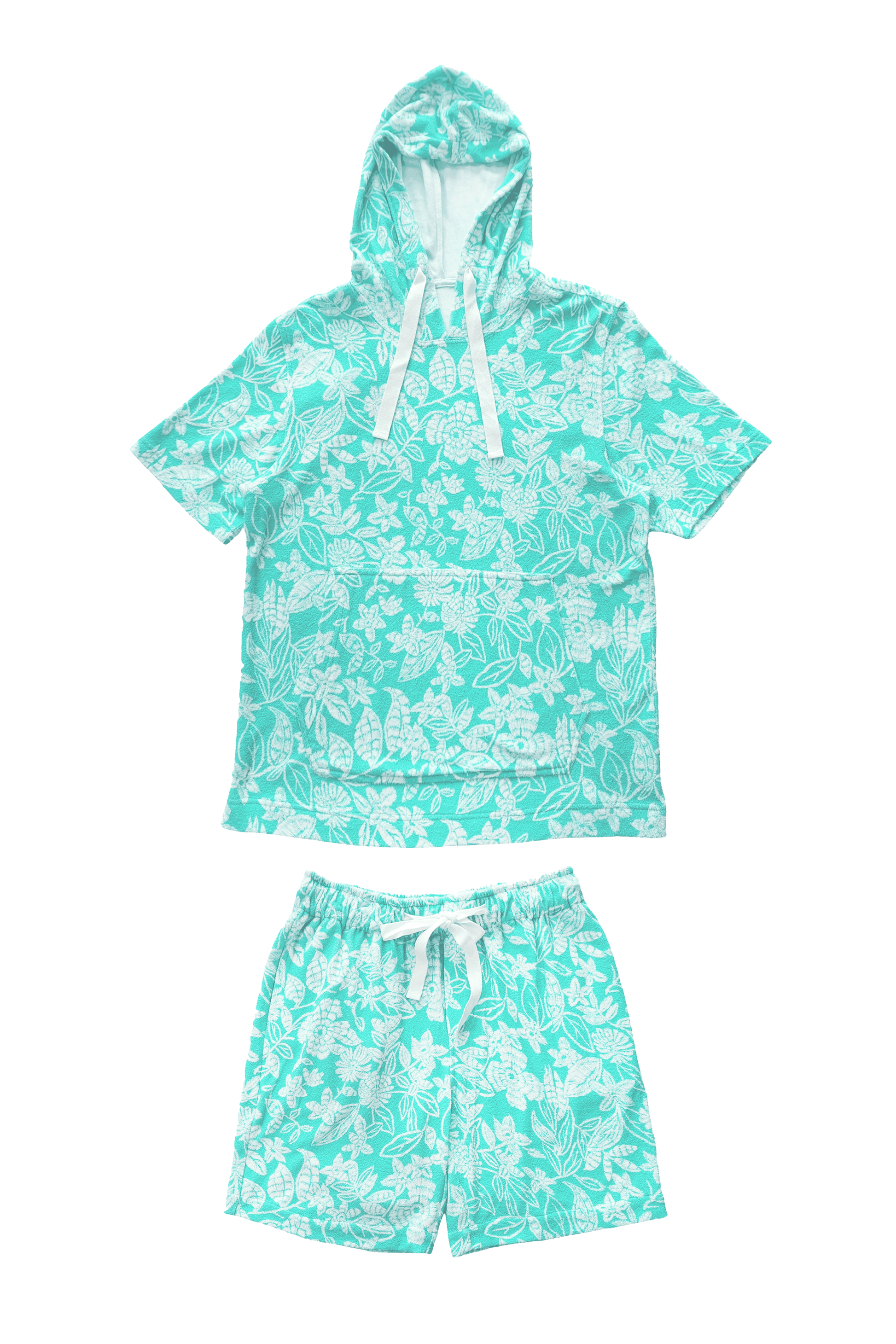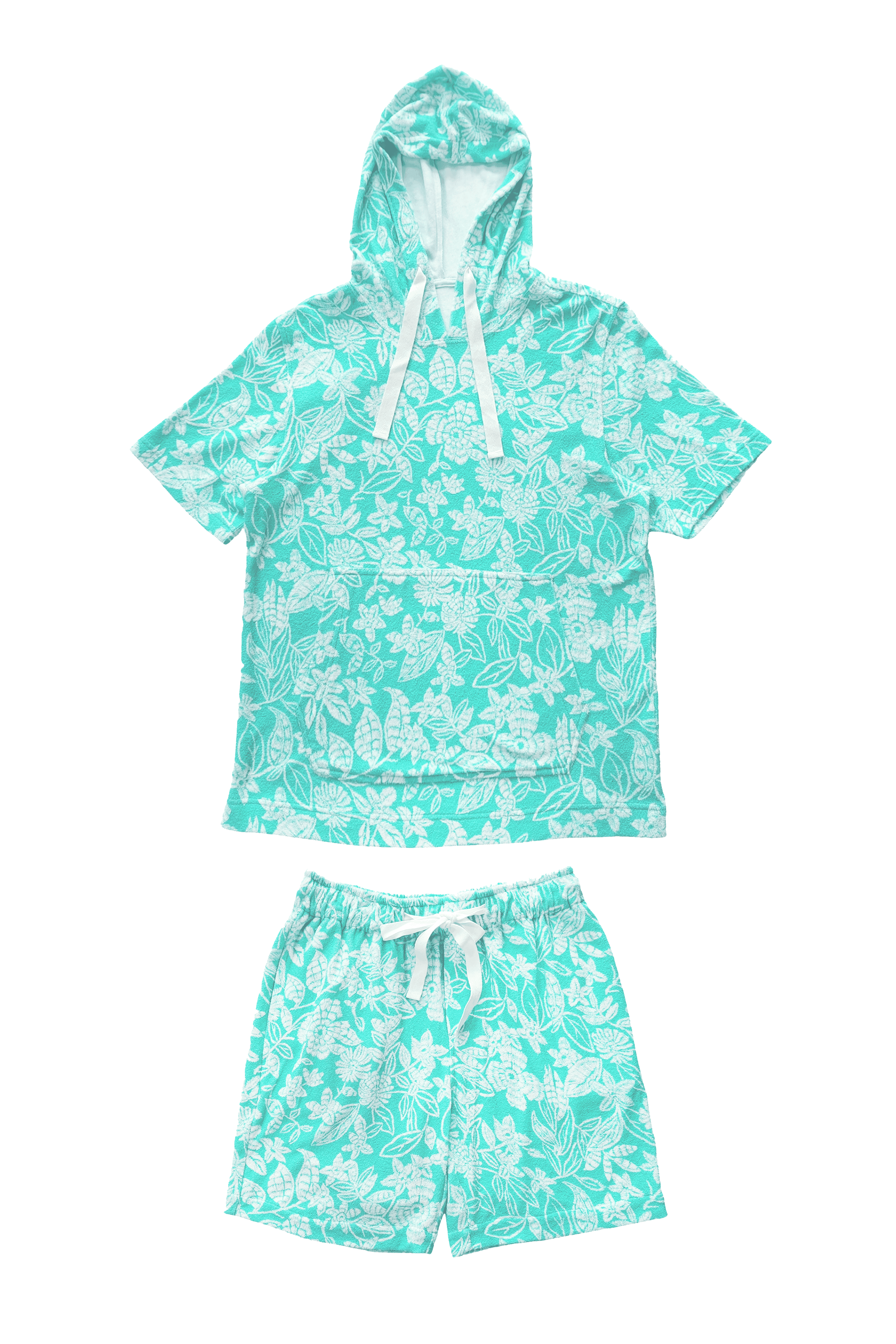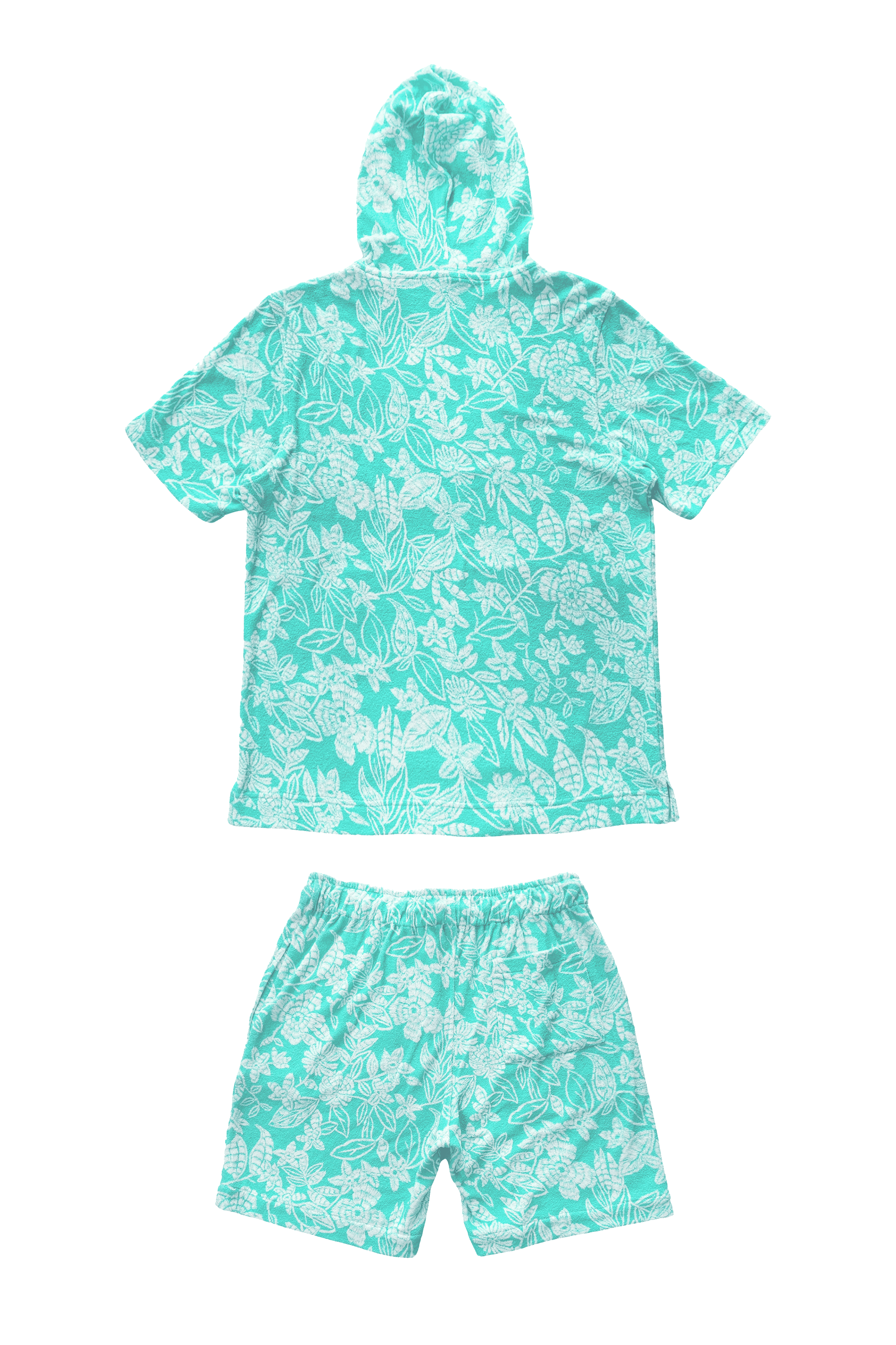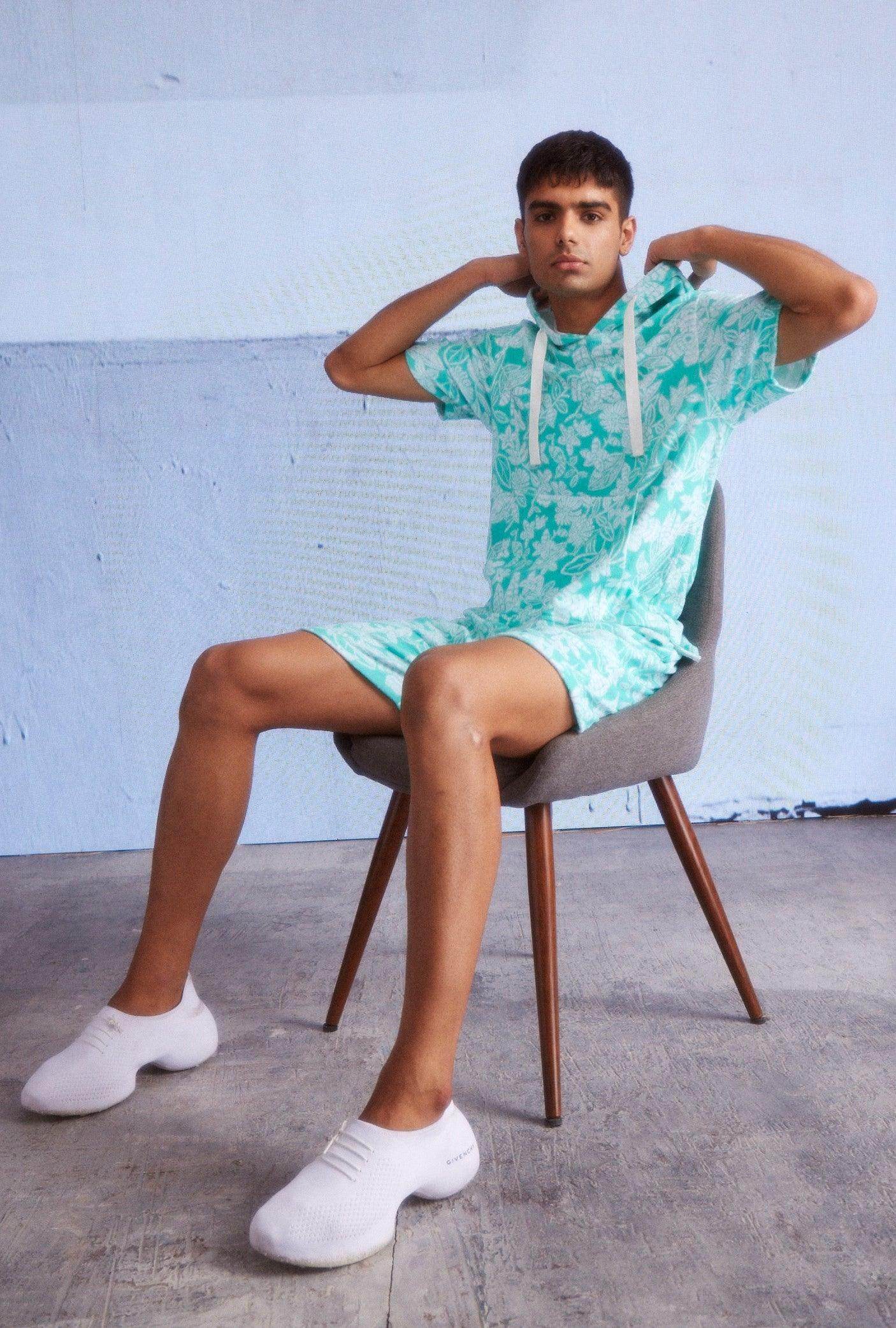 Half sleeve hoodie in patterned mint green and ivory towel terry. Drawstring detail at the collar. Kangaroo pockets in the front. Half sleeve, relaxed fit. Paired with matching shorts. Elasticated at the waist and drawstrings. Pockets on the sides and back. Relaxed fit.