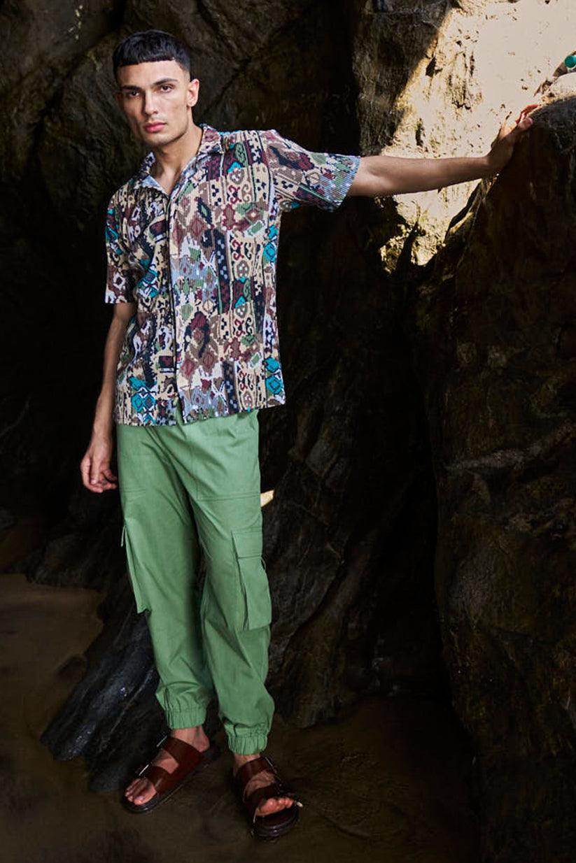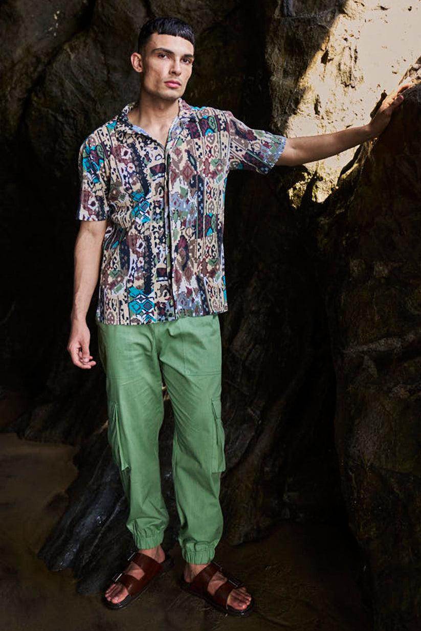 Pleated half sleeve shirt in our signature Tribal print. Concealed button placket. Relaxed fit. The print is cut at random and each piece is unique!