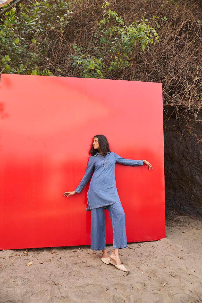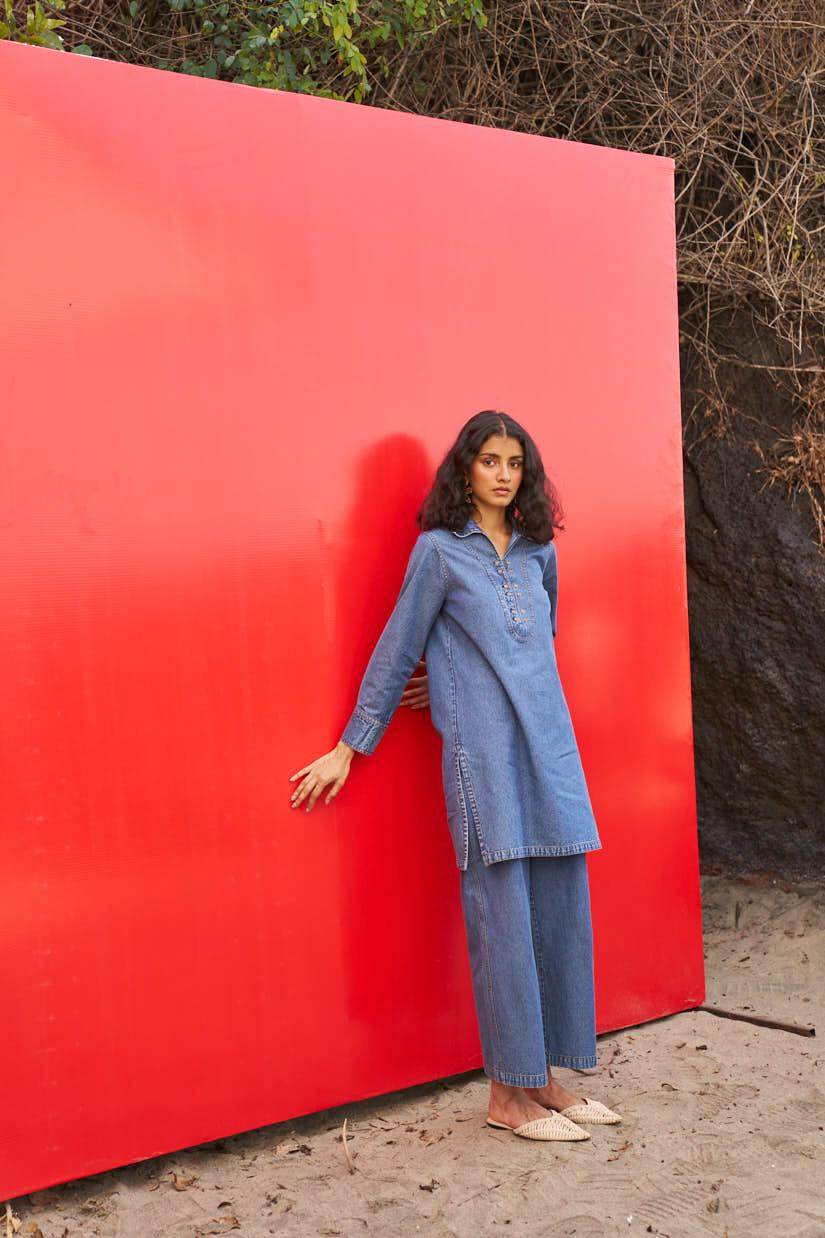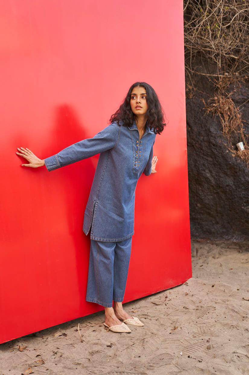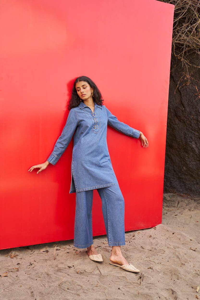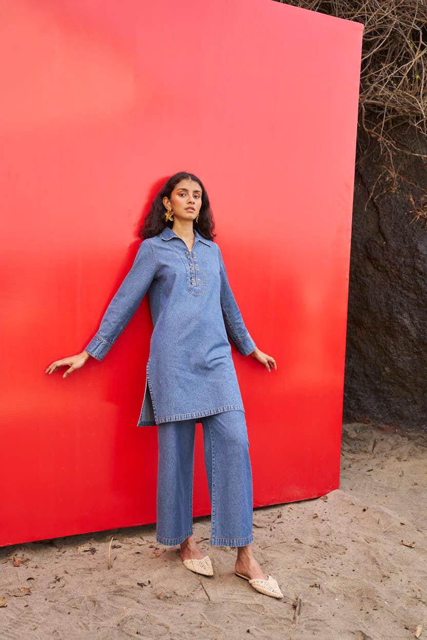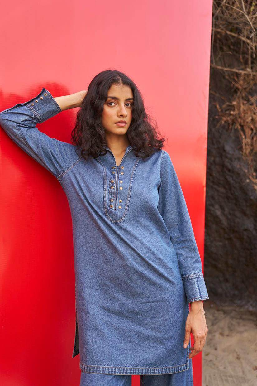Washed soft denim longline popover top with jeanswear inspired stitch lines. Shirt collar and henley placket. Metal buttons in the front and sleeve cuff.