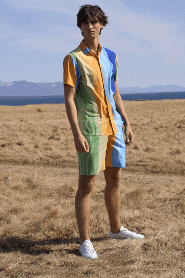 Shorts set in hand-painted water colour-inspired print. Half-sleeve button-down shirt with concealed button placket. Vent on the sides. Relaxed fit. Paired with matching swim shorts. Elasticated at the waist. Metallic snap button and zip closure at the front. Pockets on the side and back. Lined with recycled polyester mesh.
