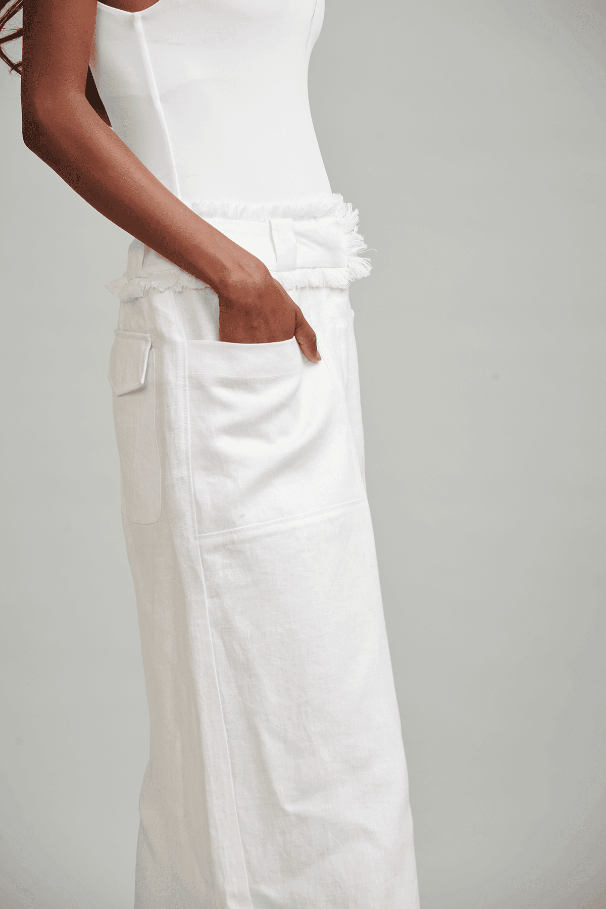 Wide-legged white linen pants with frayed detail on the belt. Patch pockets on the front and back.