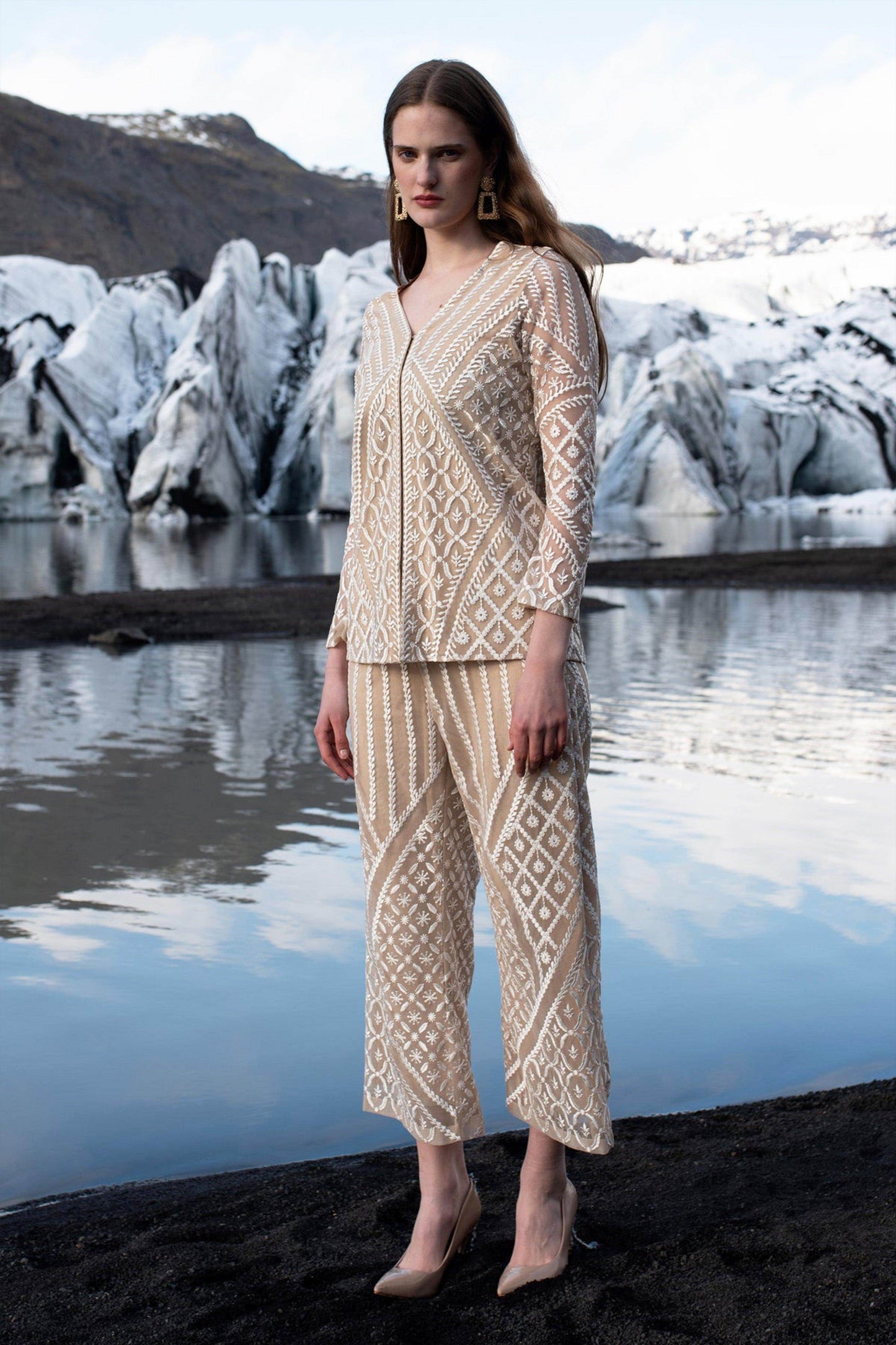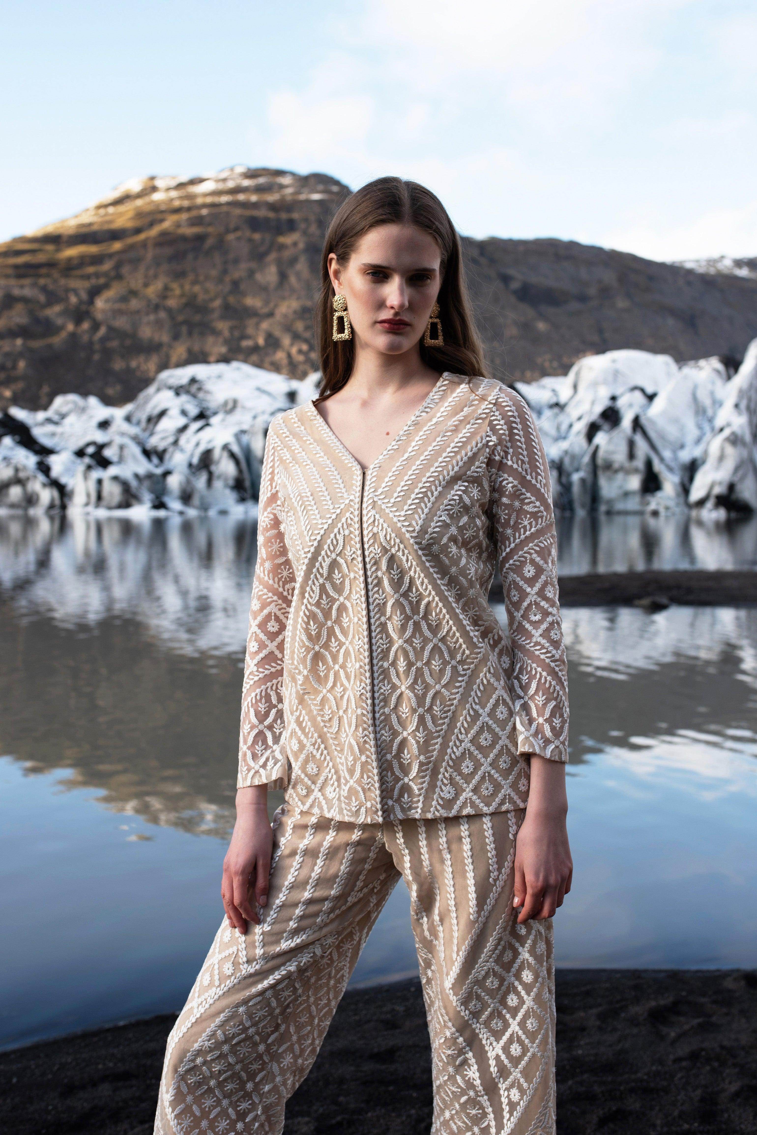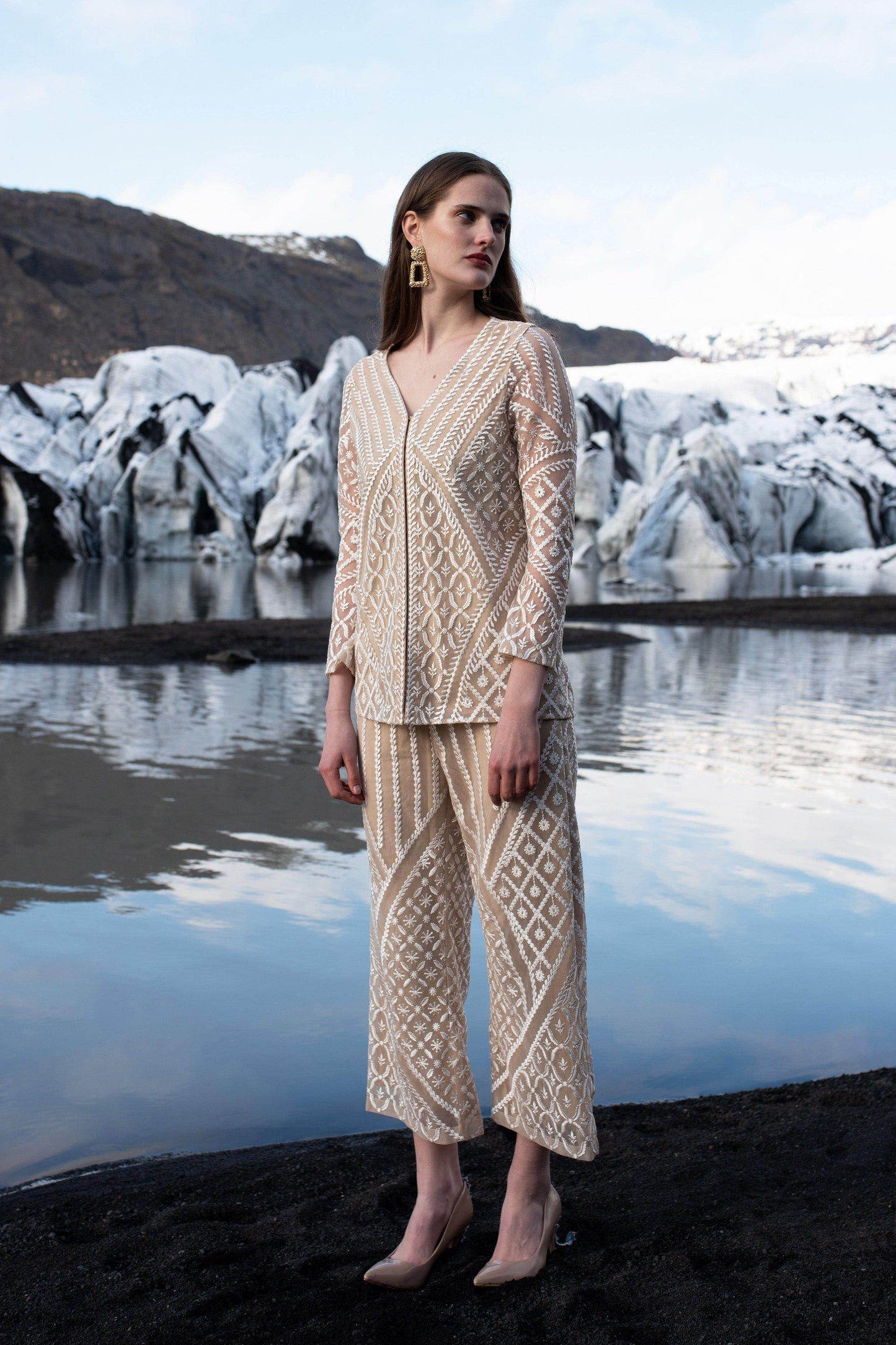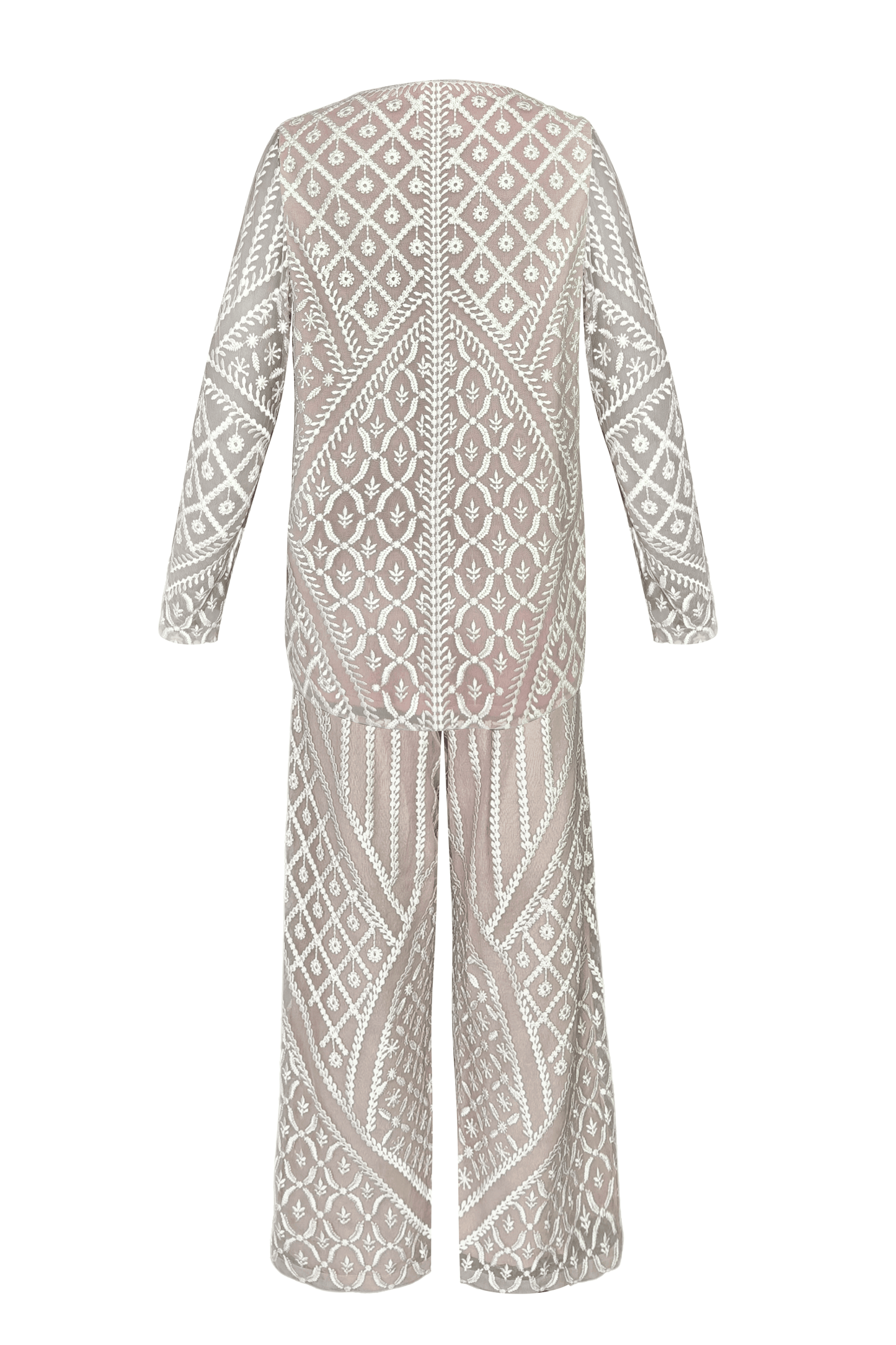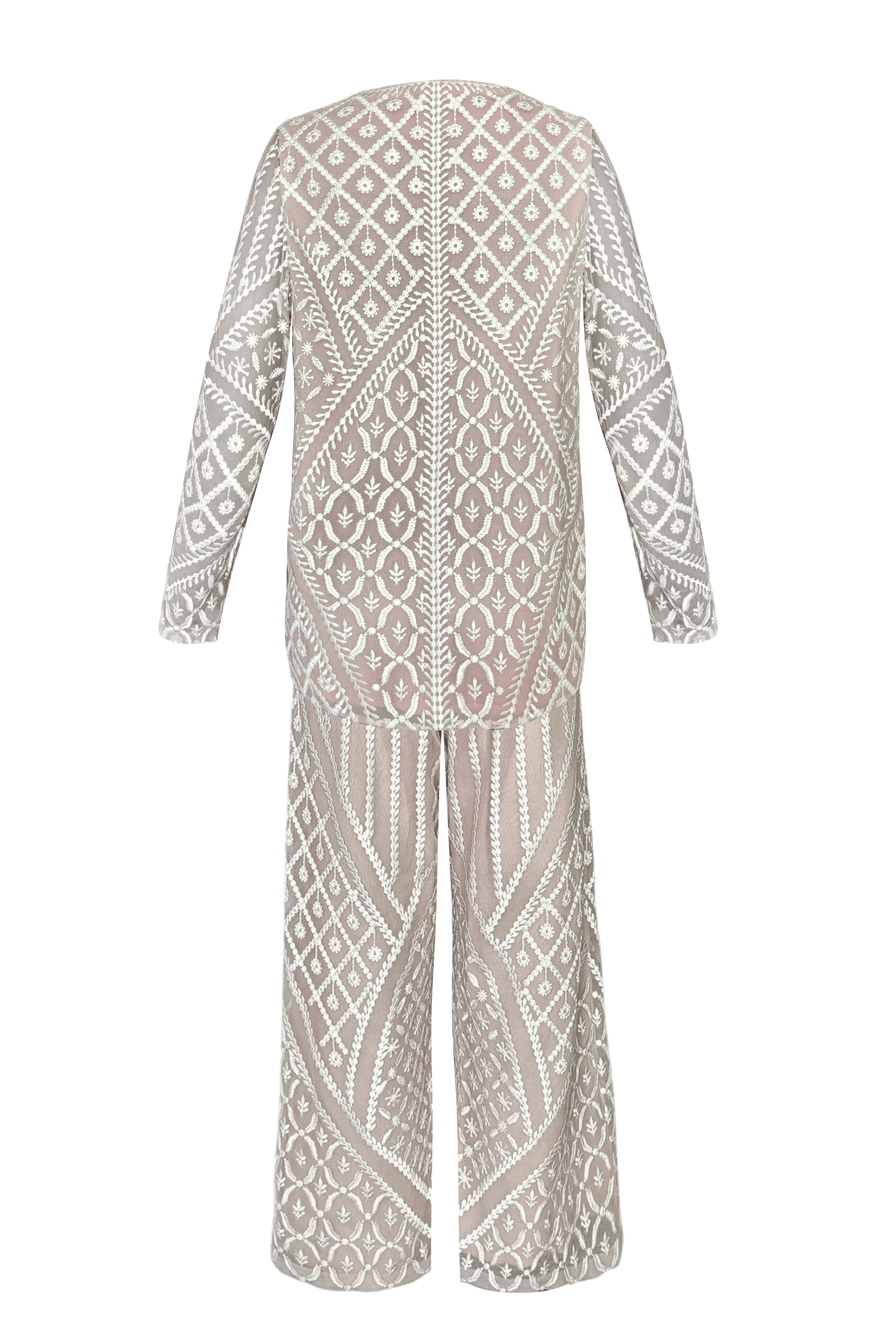 Allover placement embroidery in white resham thread, mixing delicate floral and opulent baroque inspired motifs. V neck top has a full front placket with hook-eye closure. Relaxed fit and slight A-line silhouette on the front and back, soft bell shape on the sleeves. Paired with matching ankle length straight fit pants that are elasticated at the waist. Hook-eye and zip closure on the side. The front and back of the top are lined in a contrasting nude colour to show off the detailed embroidery. The sleeves are unlined. The pants are fully lined in a contrasting nude colour.