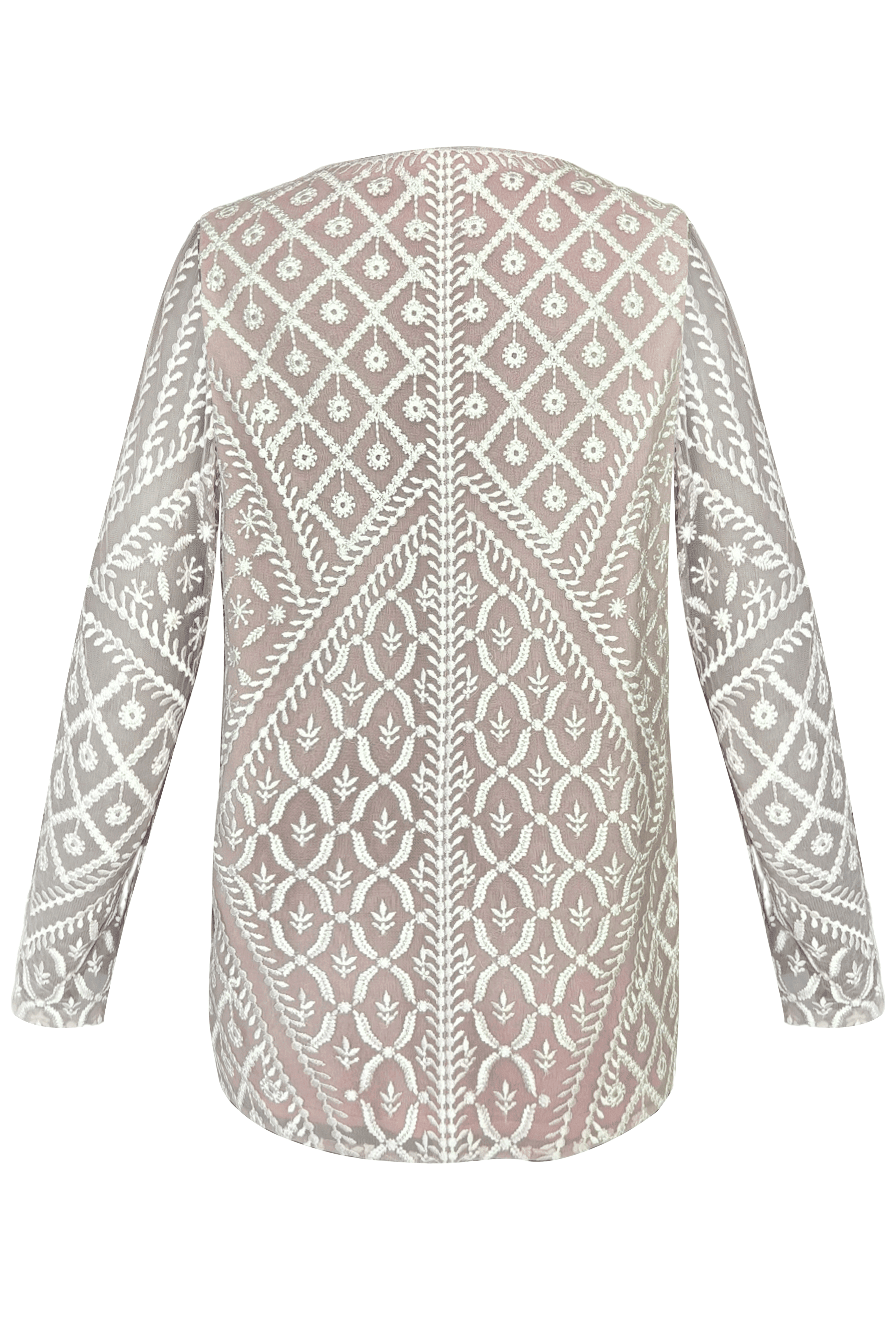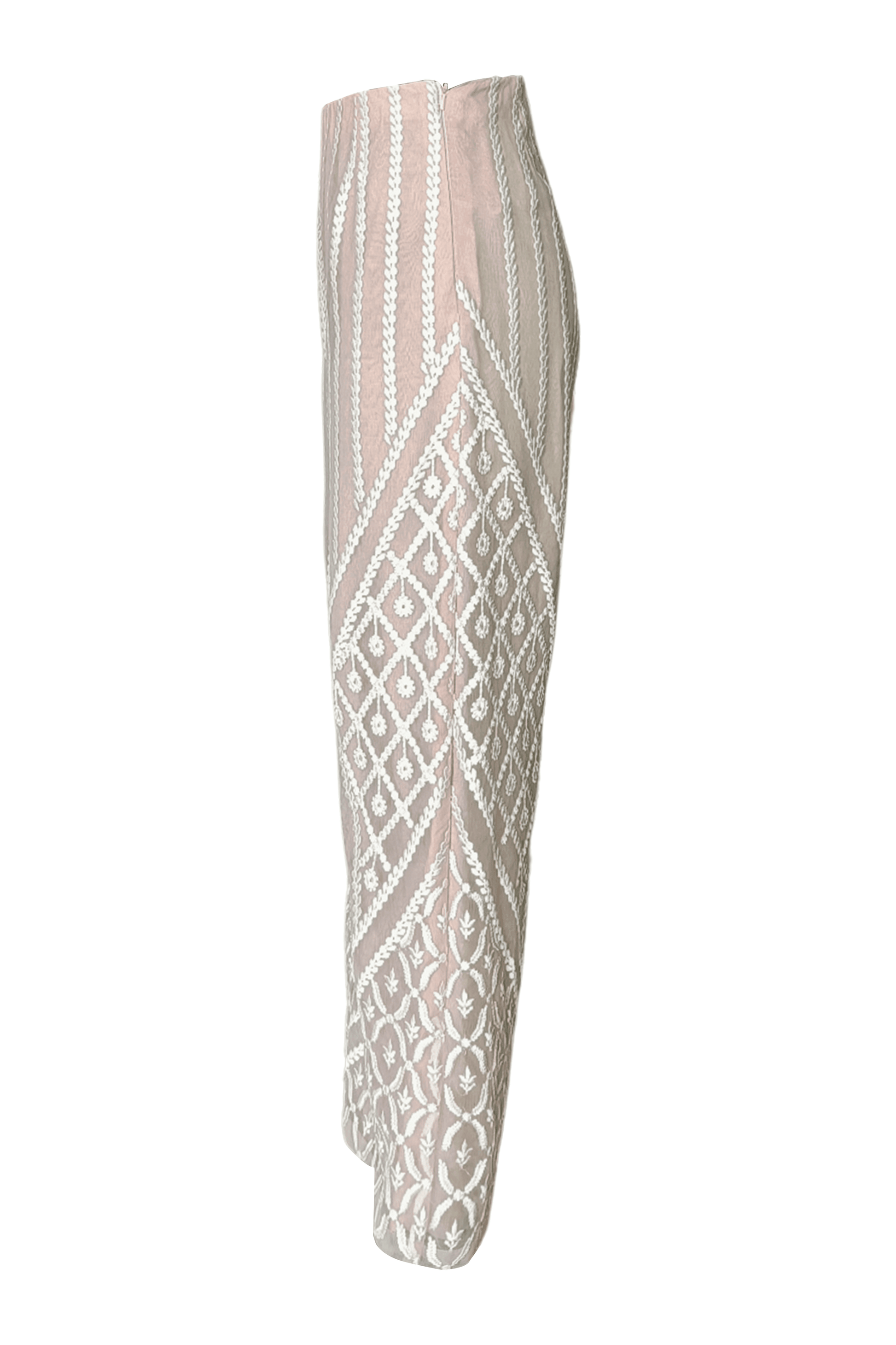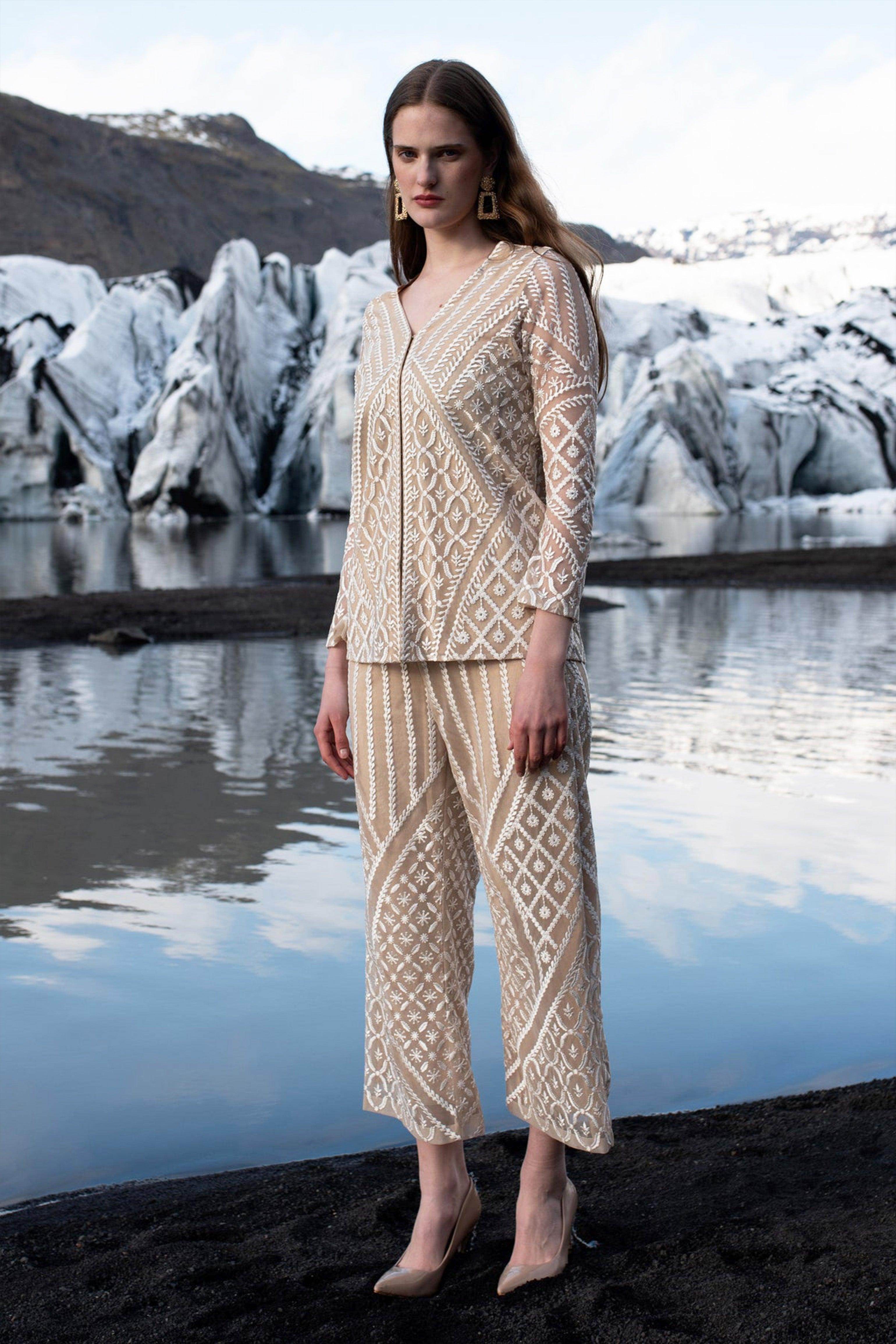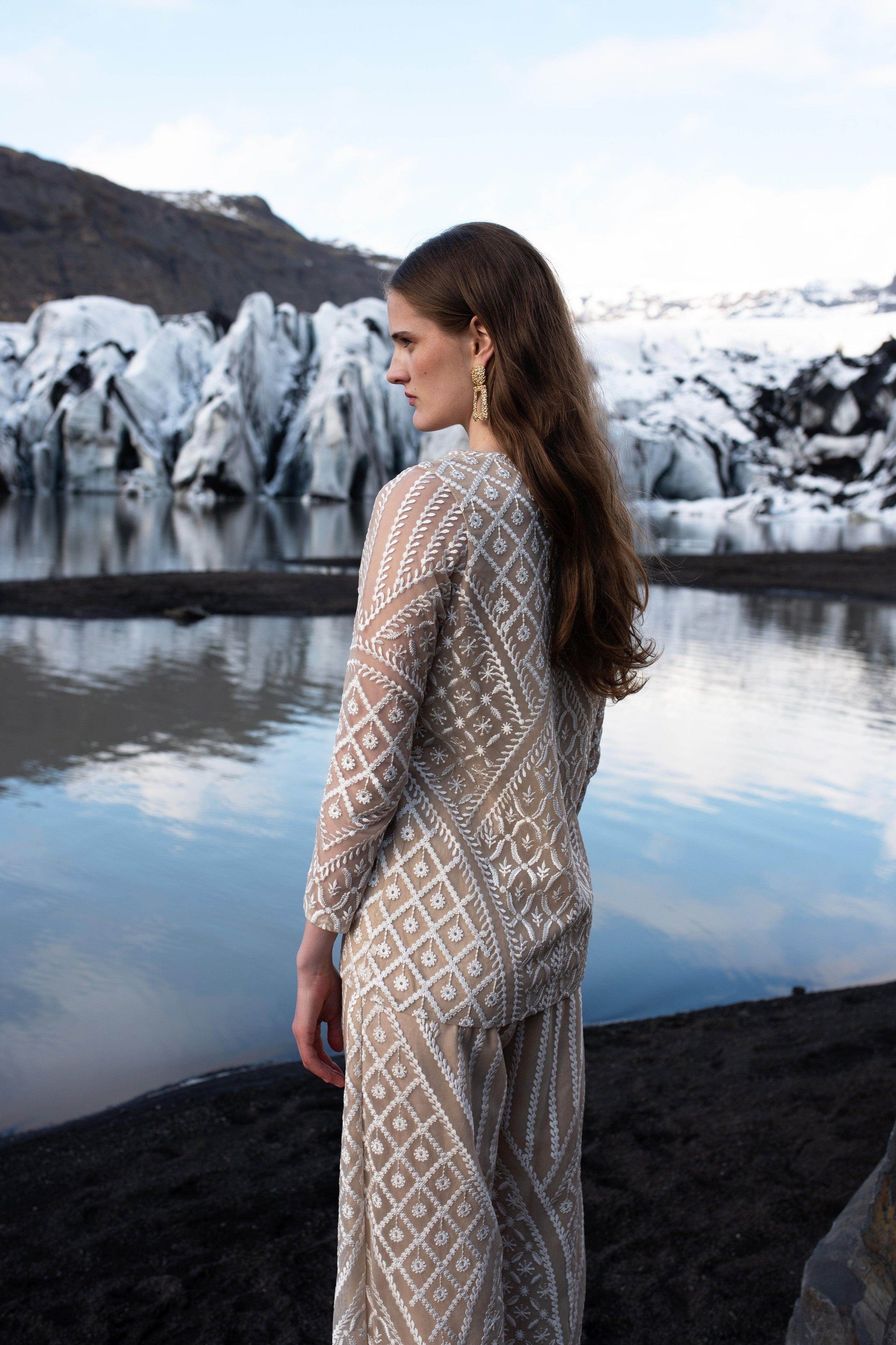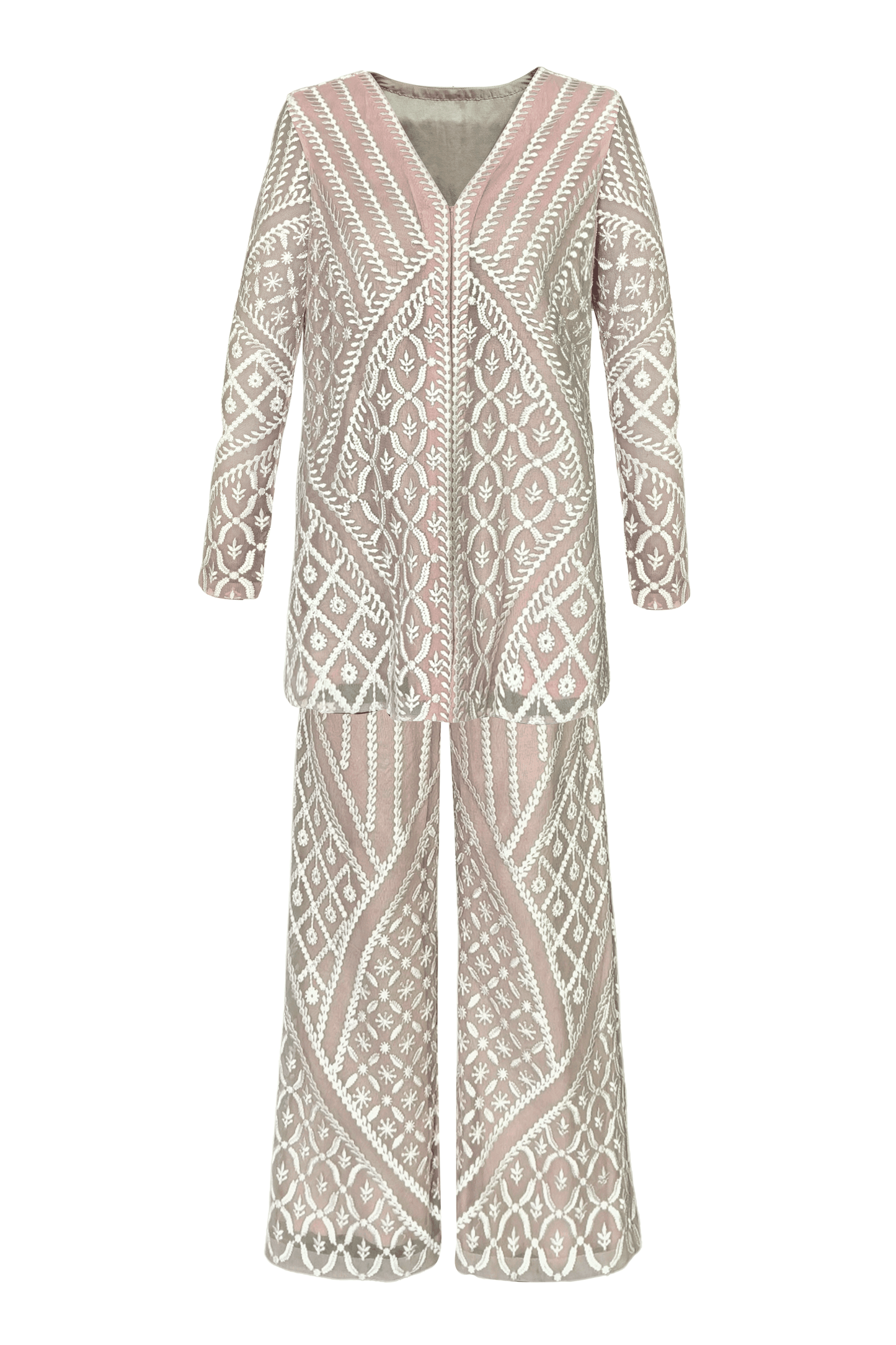 Allover placement embroidery in white resham thread, mixing delicate floral and opulent baroque inspired motifs. V neck top has a full front placket with hook-eye closure. Relaxed fit and slight A-line silhouette on the front and back, soft bell shape on the sleeves. Paired with matching ankle length straight fit pants that are elasticated at the waist. Hook-eye and zip closure on the side. The front and back of the top are lined in a contrasting nude colour to show off the detailed embroidery. The sleeves are unlined. The pants are fully lined in a contrasting nude colour.