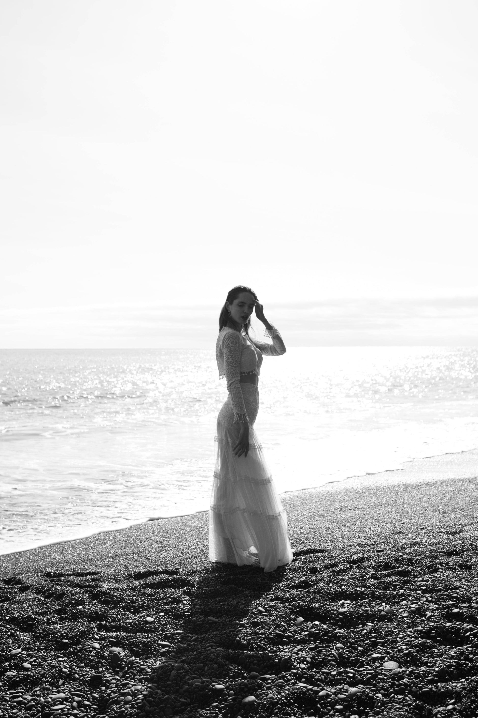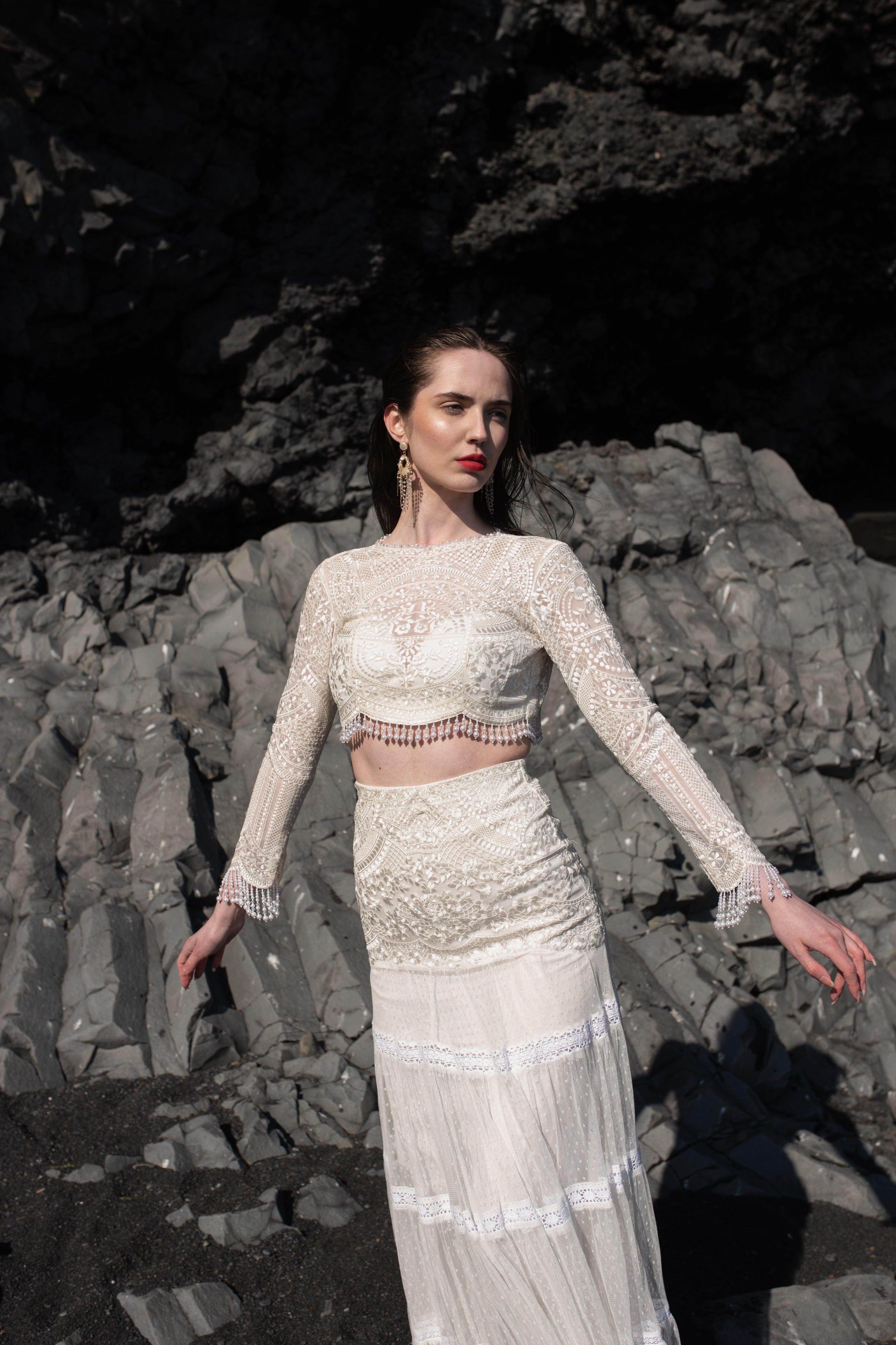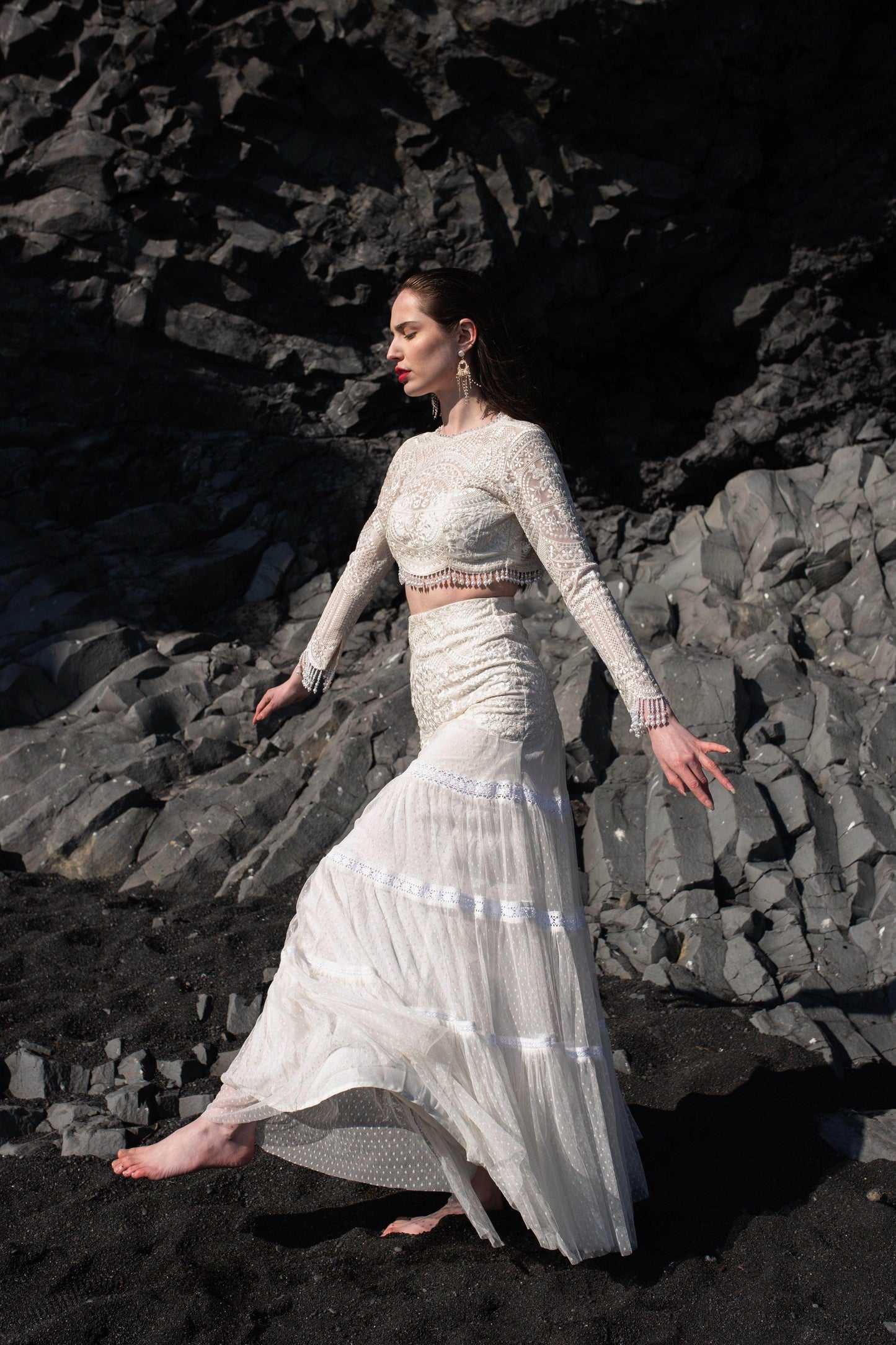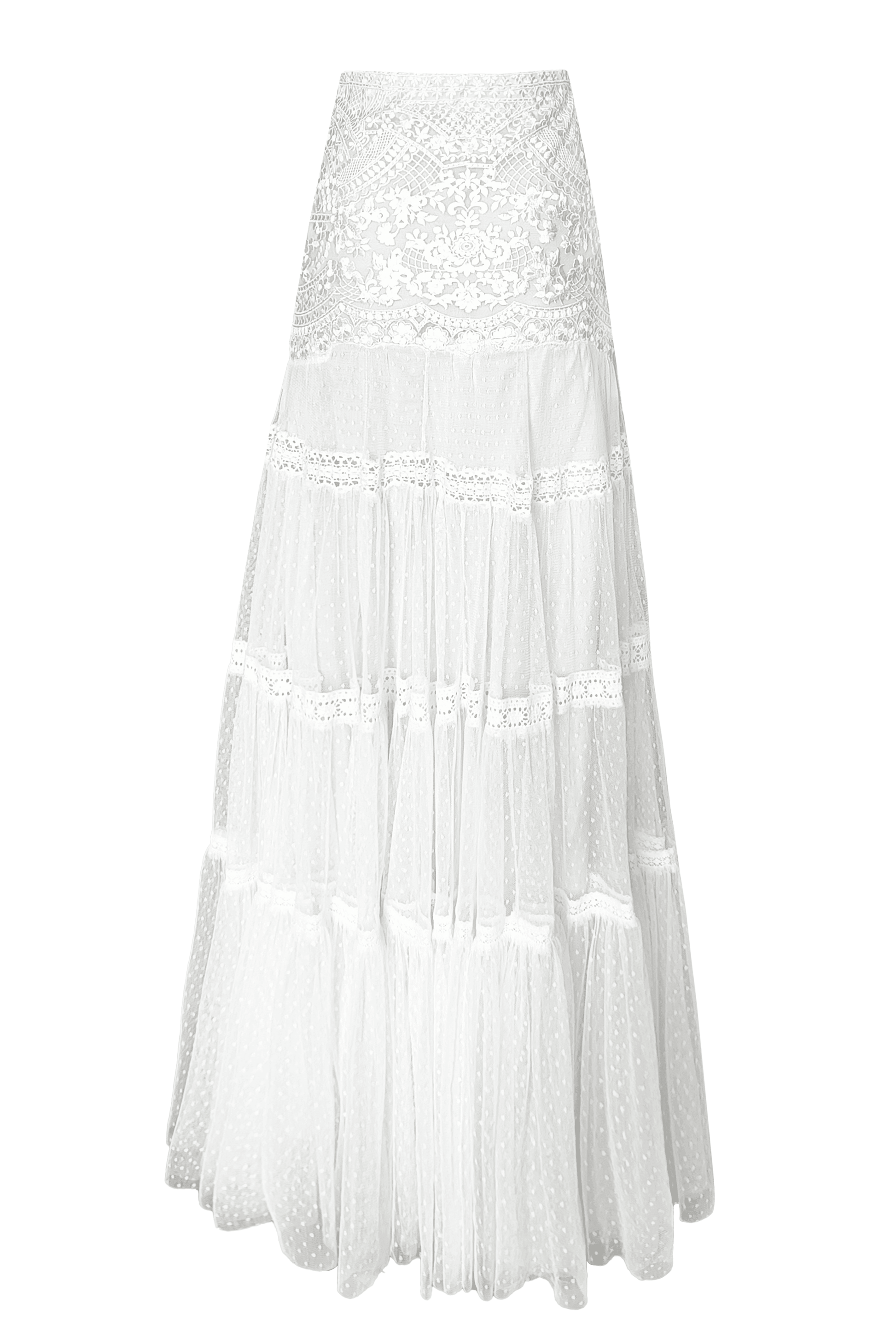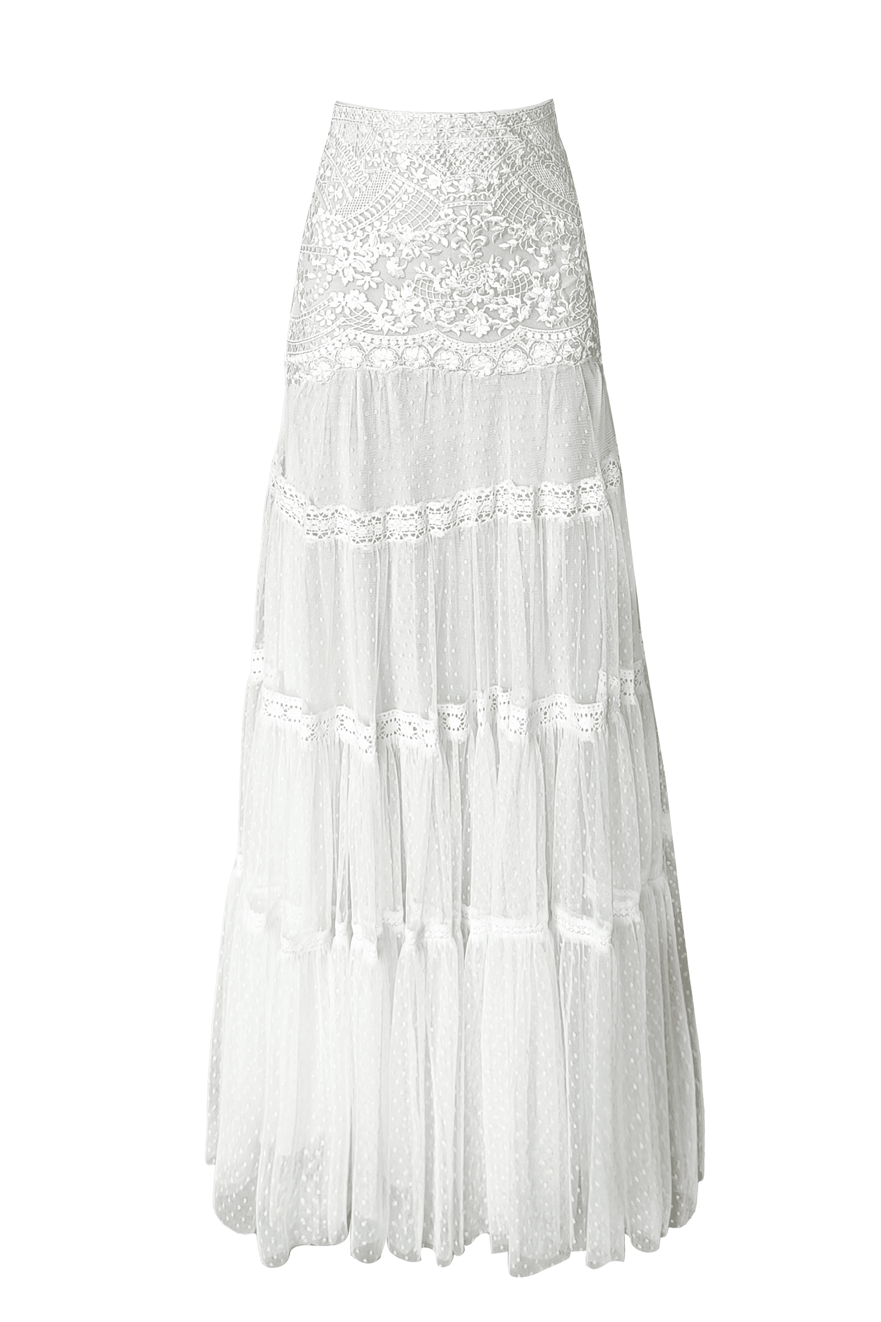 White flowy tiered tulle maxi-length skirt with delicate white on white embroidery from the high waist till the mid thigh. Tiers of tulle are attached with soft cotton lace inserts. The skirt is elasticated at the waist and has a button and zip closure on the side. The garment is fully lined.