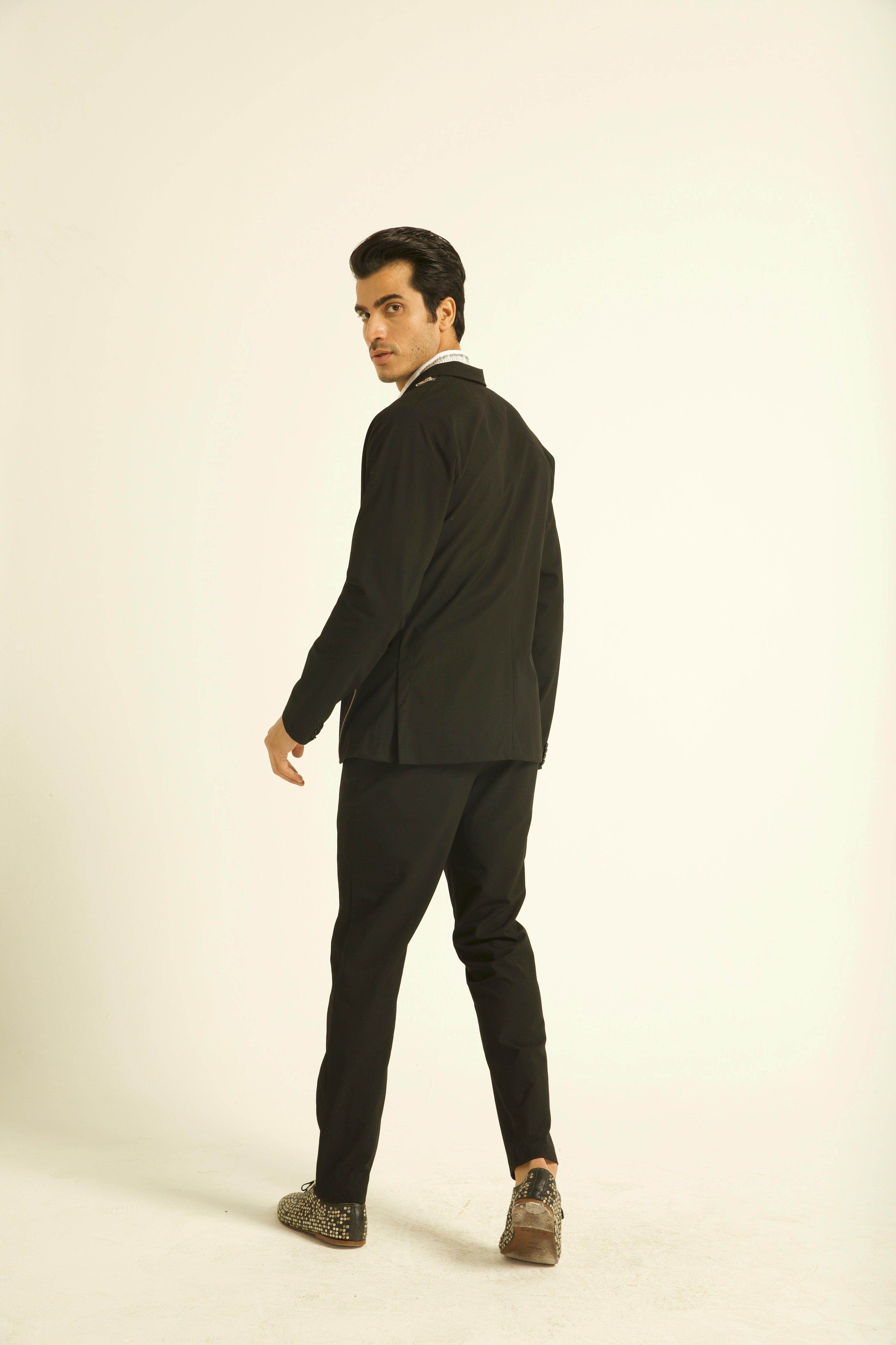 Single button blazer with a zipper detailing down the wearer's left side. Unlined and deconstructed, regular fit. Paired with straight-fit pants with zipper detailing down the wearer's left pant leg. Side pockets, regular fit. Made of all weather suiting material.