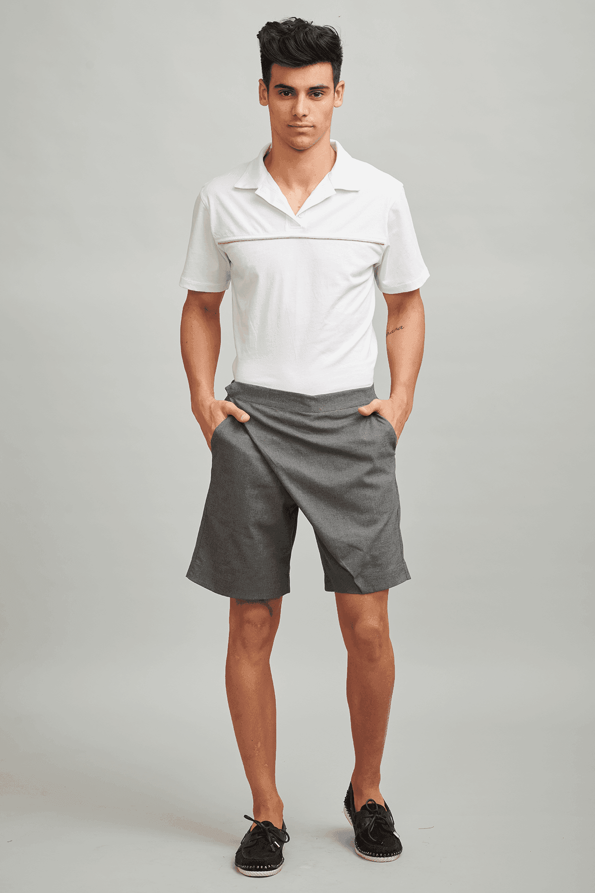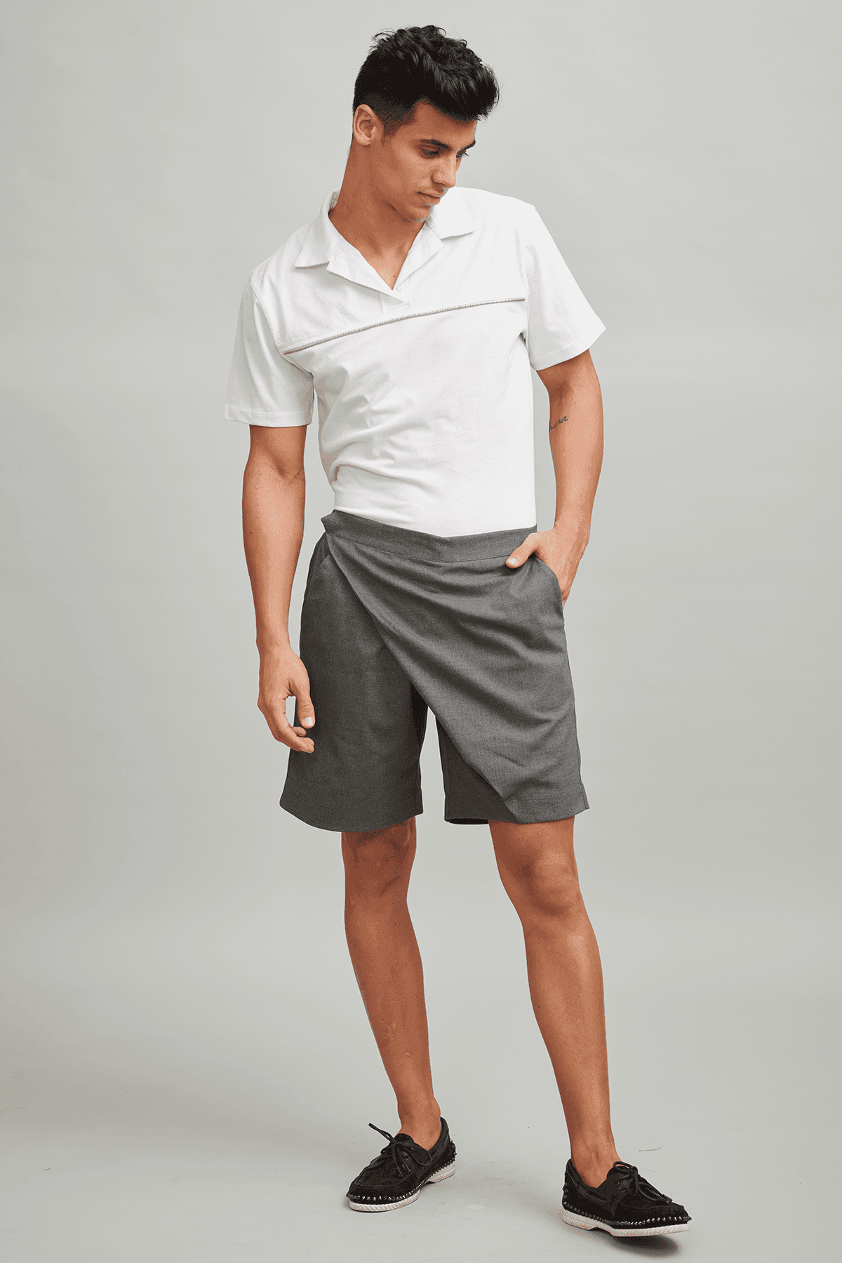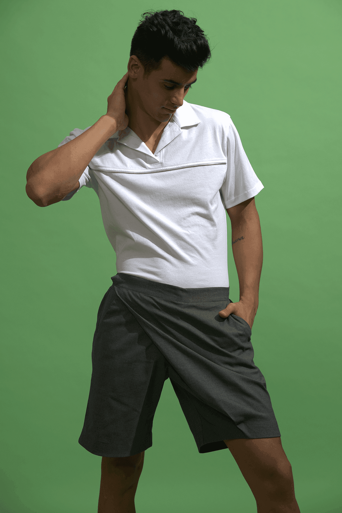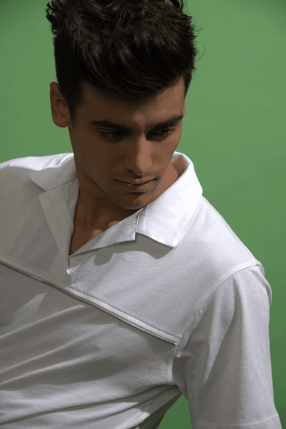 Organic cotton relaxed fit polo with single side zip teeth applique across the chest.