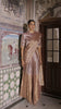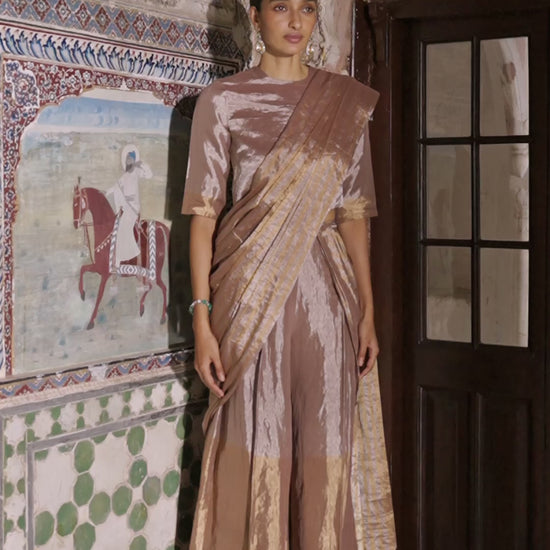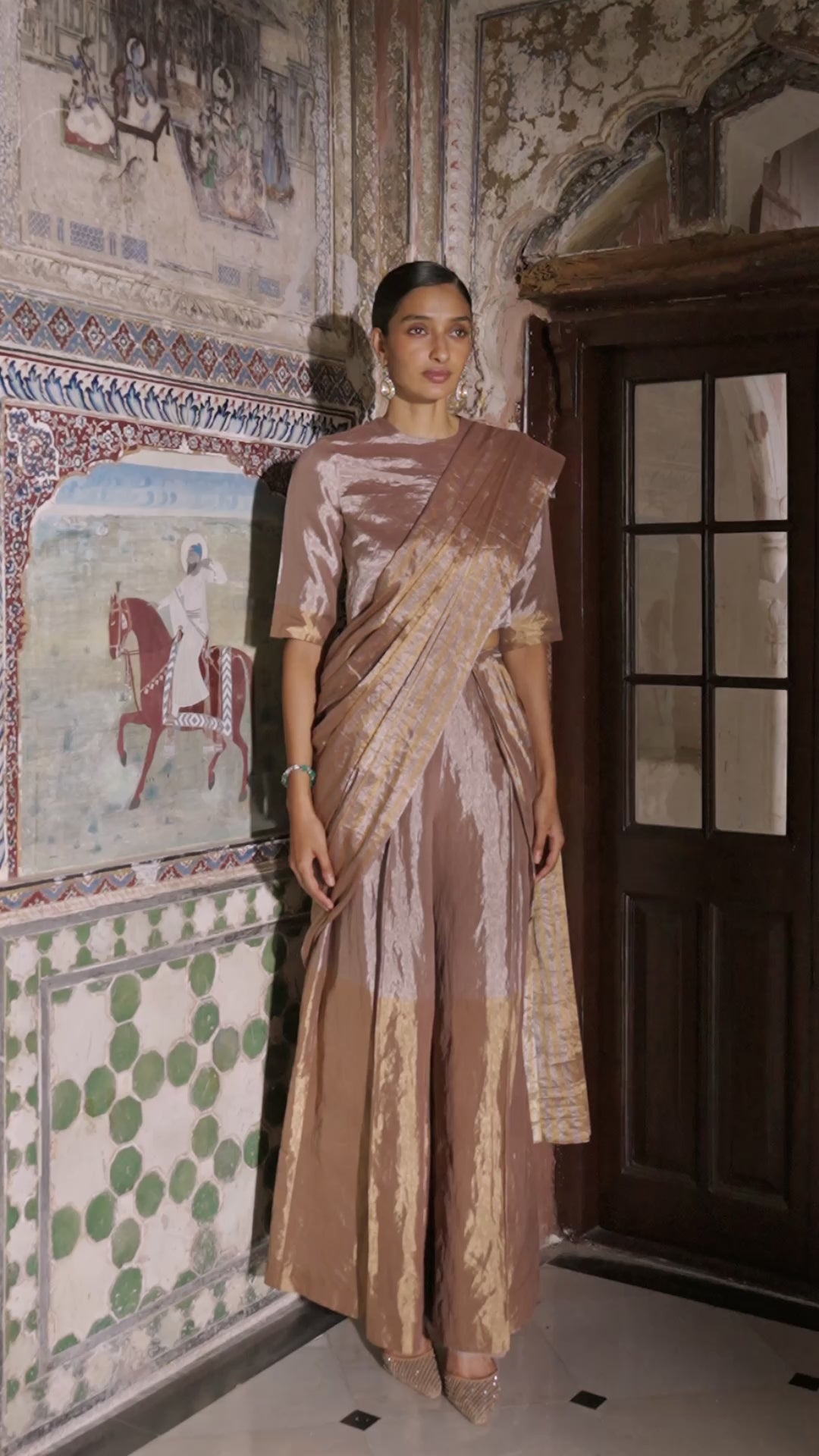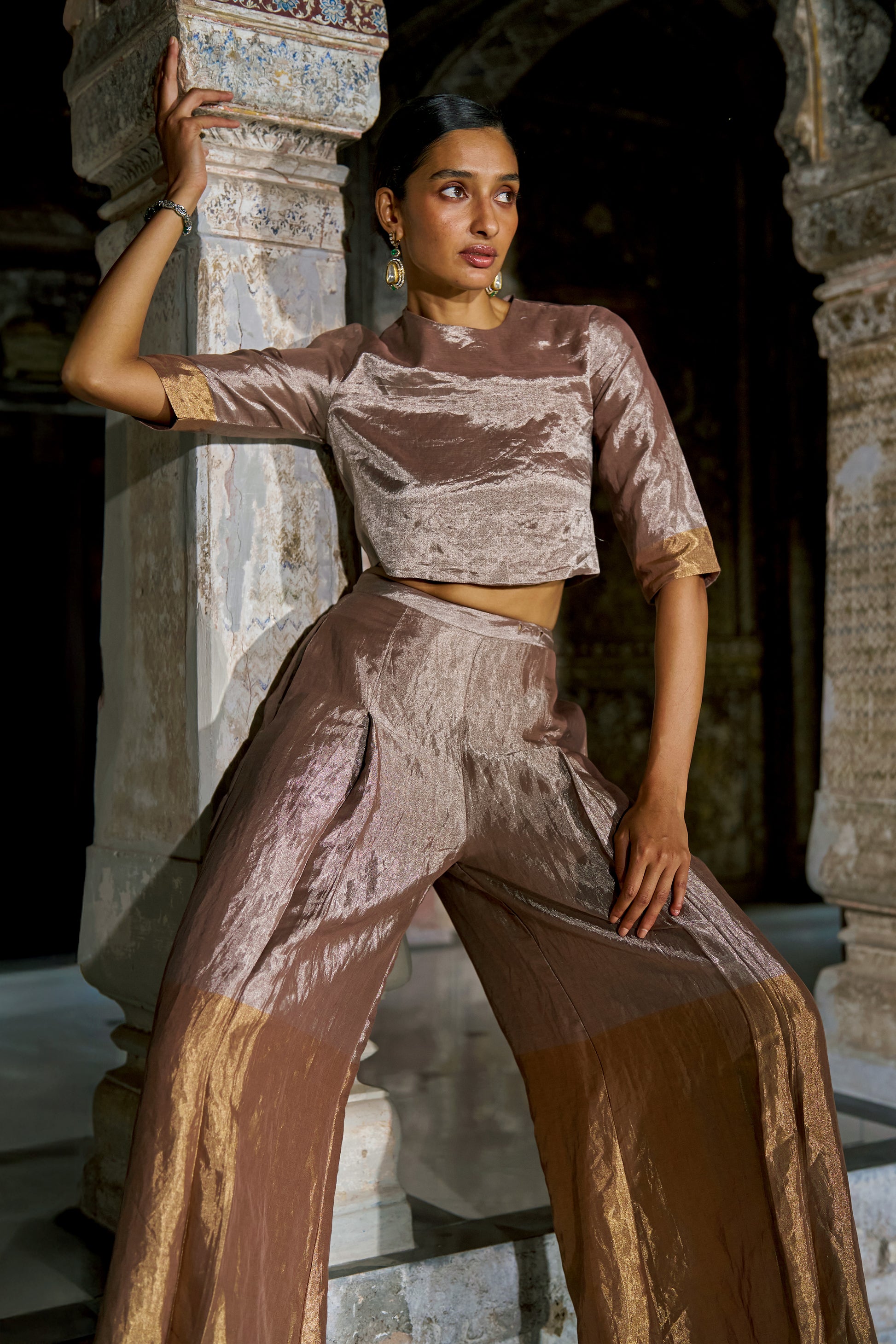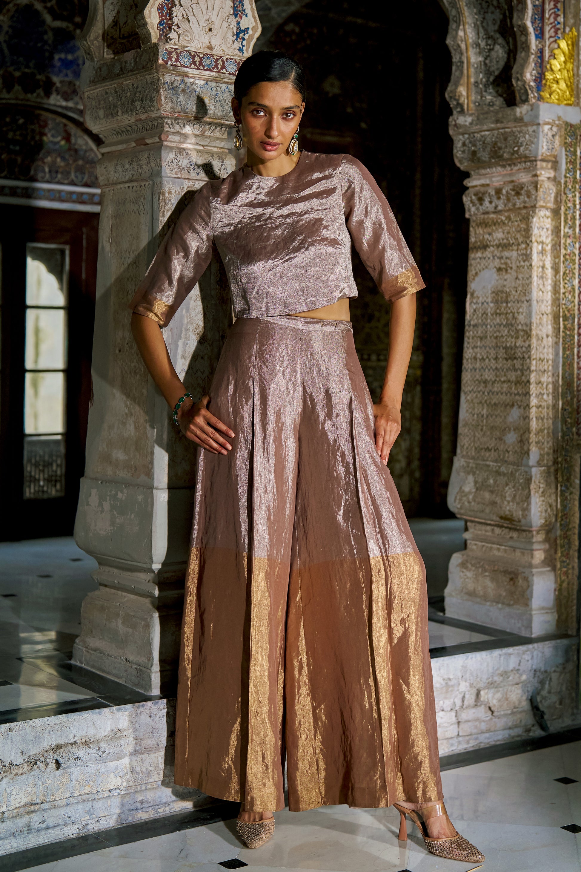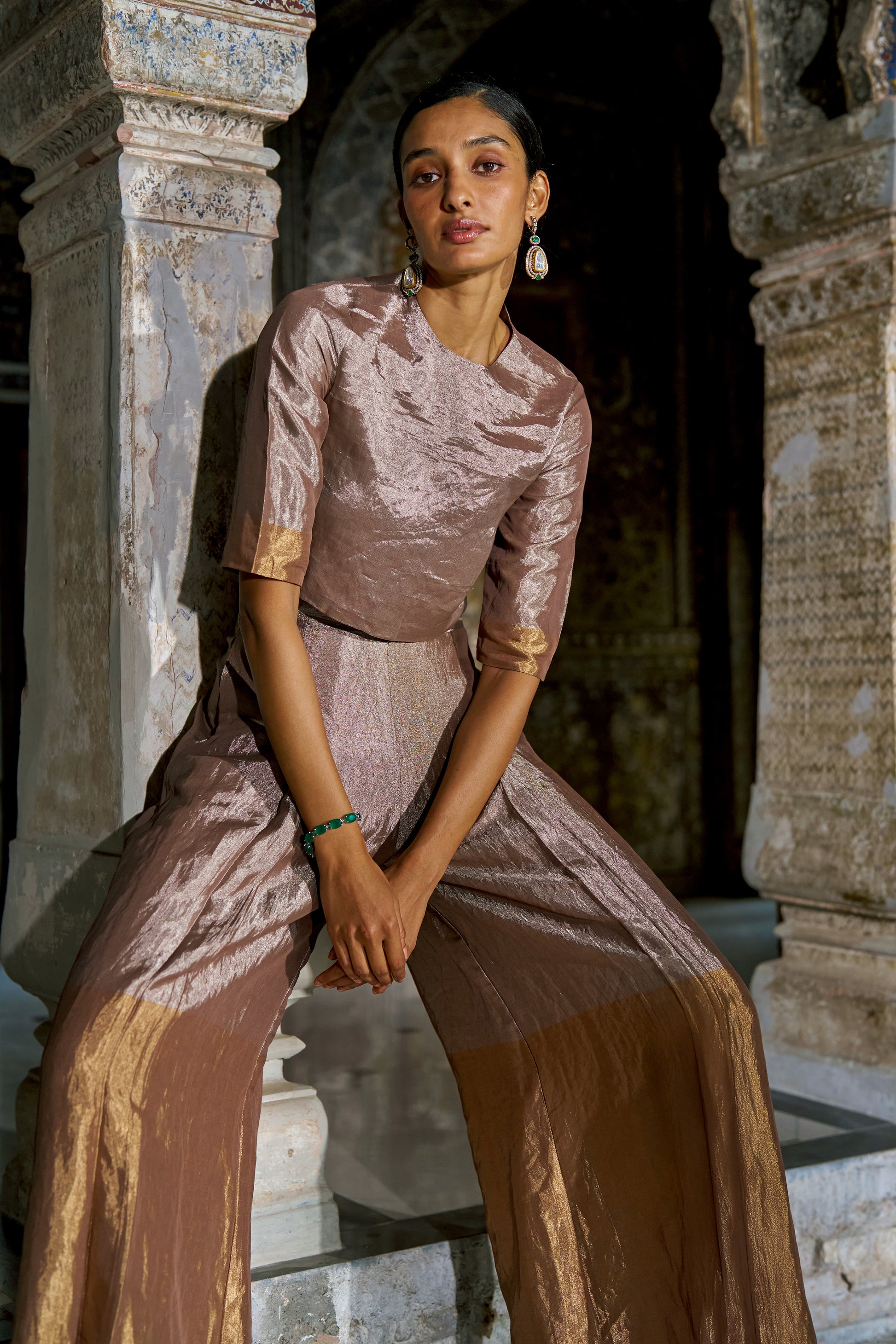Benares tissue blouse in champagne with soft iridescent sheen. Round neck and cropped sleeves with contrast golden cuffs. Structured fit with a zip-back closure and tasseled puller. Garment is fully lined. Paired with Benares crushed tissue pant in champagne with gold accents. Hand-sewn inverted pleats in the front. Wide-leg silhouette with contrast weave placed below the knee for added texture. Concealed side zip with hook/eye closure. Pockets in the sides.