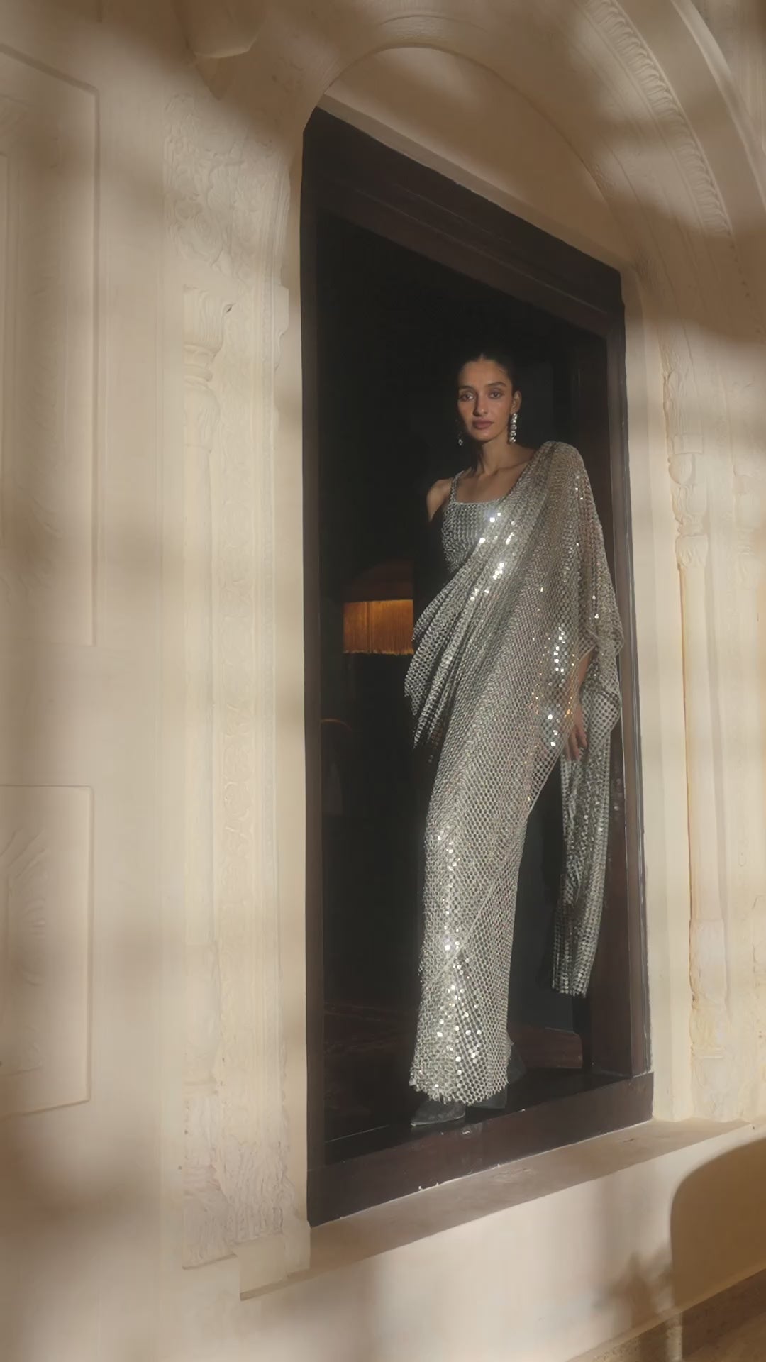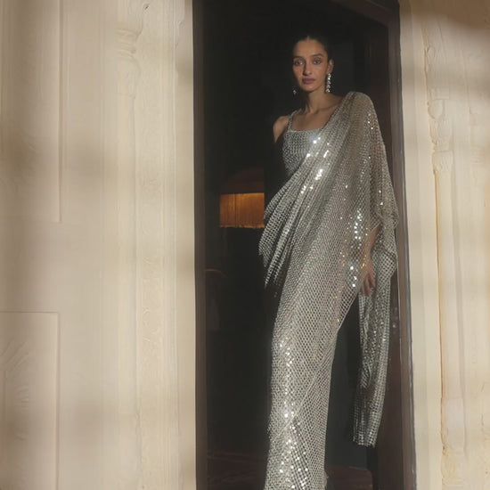 Sari-inspired drape gown in metallic silver sequin lattice. Soft sweetheart neckline framed with delicate shoulder straps, leading into a pleated asymmetric panel that wraps around the waist and over the shoulder in a sari-inspired drape detail. Hand-applied pleats. Concealed side zip with hook/eye closure. Garment is fully lined in black, which heightens drama. A luminous gown ideal for cocktails, dinners, and galas.