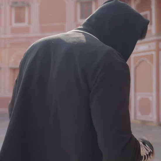 Black organic cotton full sleeve fleece hoodie with cord detailing inspired by military regiment unifroms. Embroidery runs symmeticallt along the front, framed by metal buttons on the sides and a metal zip in the center. Ribbed hem and cuffs, pockets in the side.