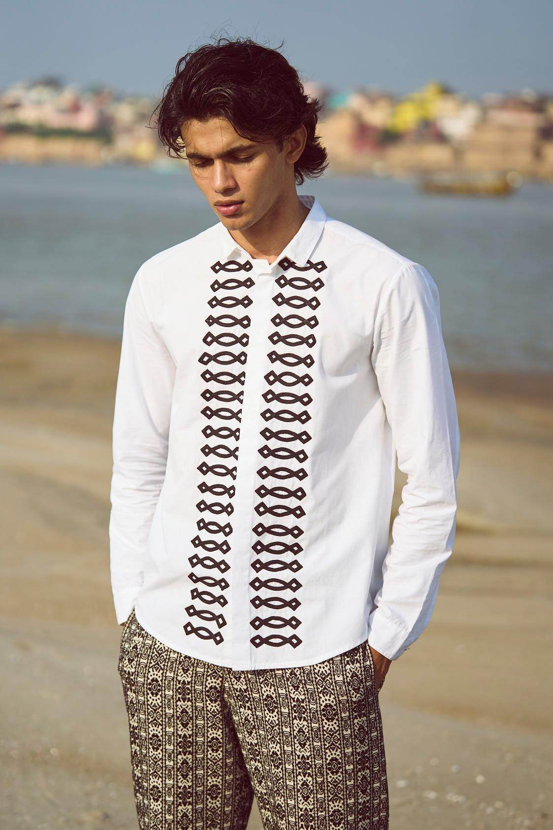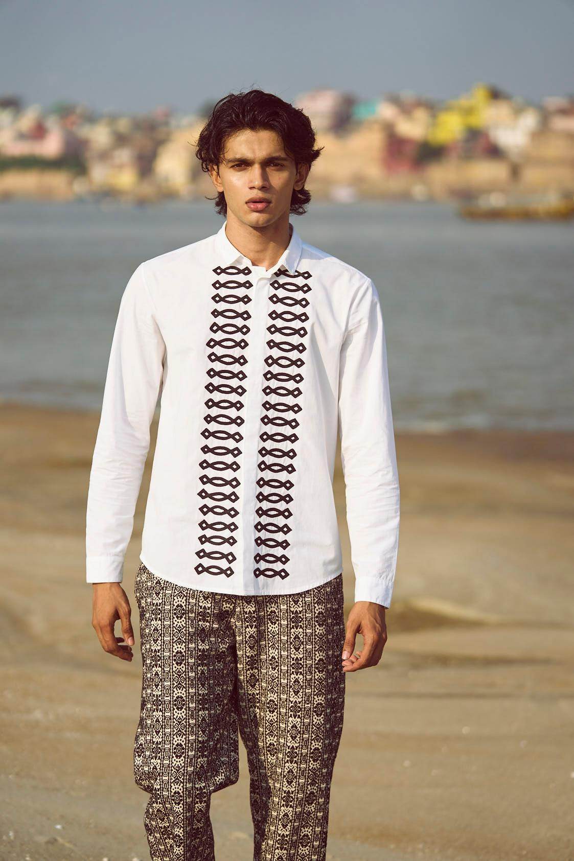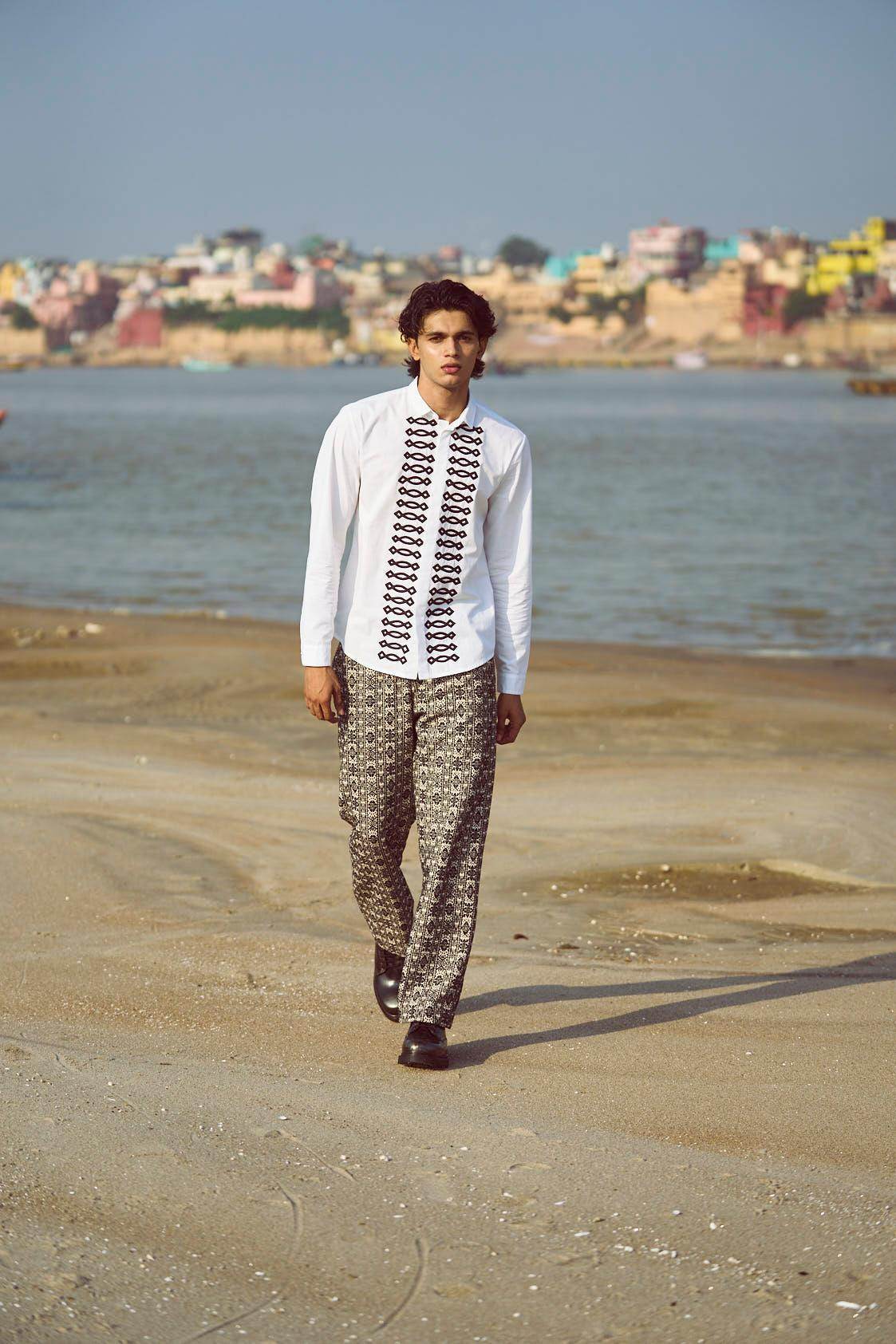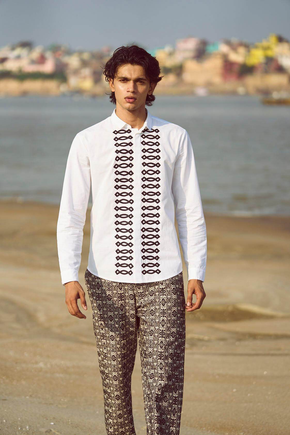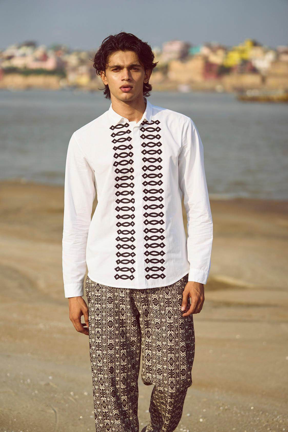 White regular fit cotton poplin shirt. Band leader's outfit inspired contrast black tape applique detail at the front running down the placket. Concealed button placket. Metallic button closure at the cuffs. Full sleeves.