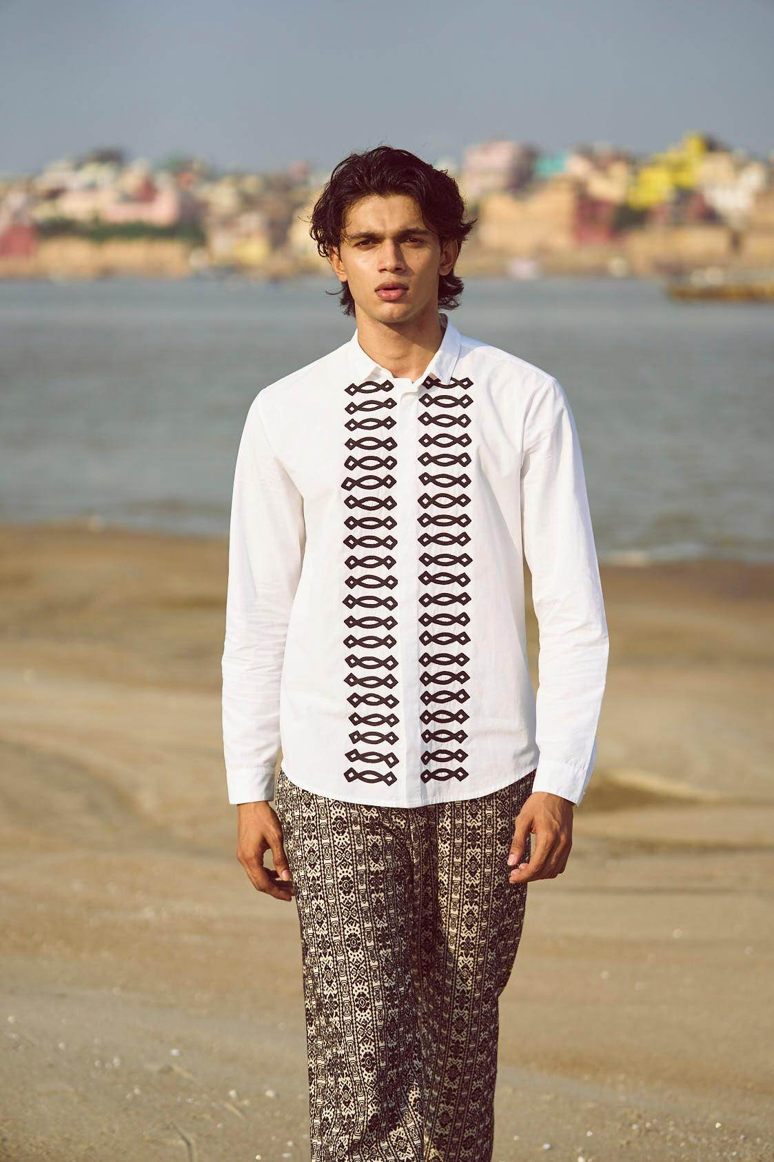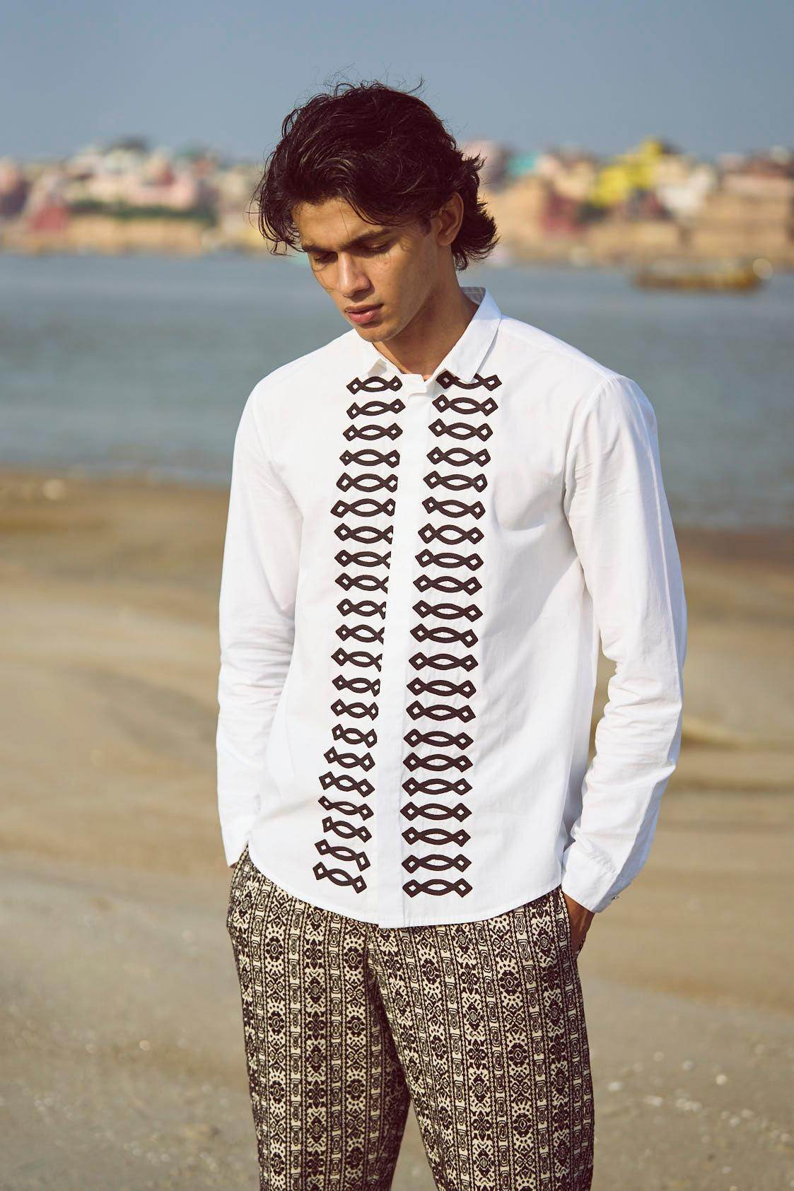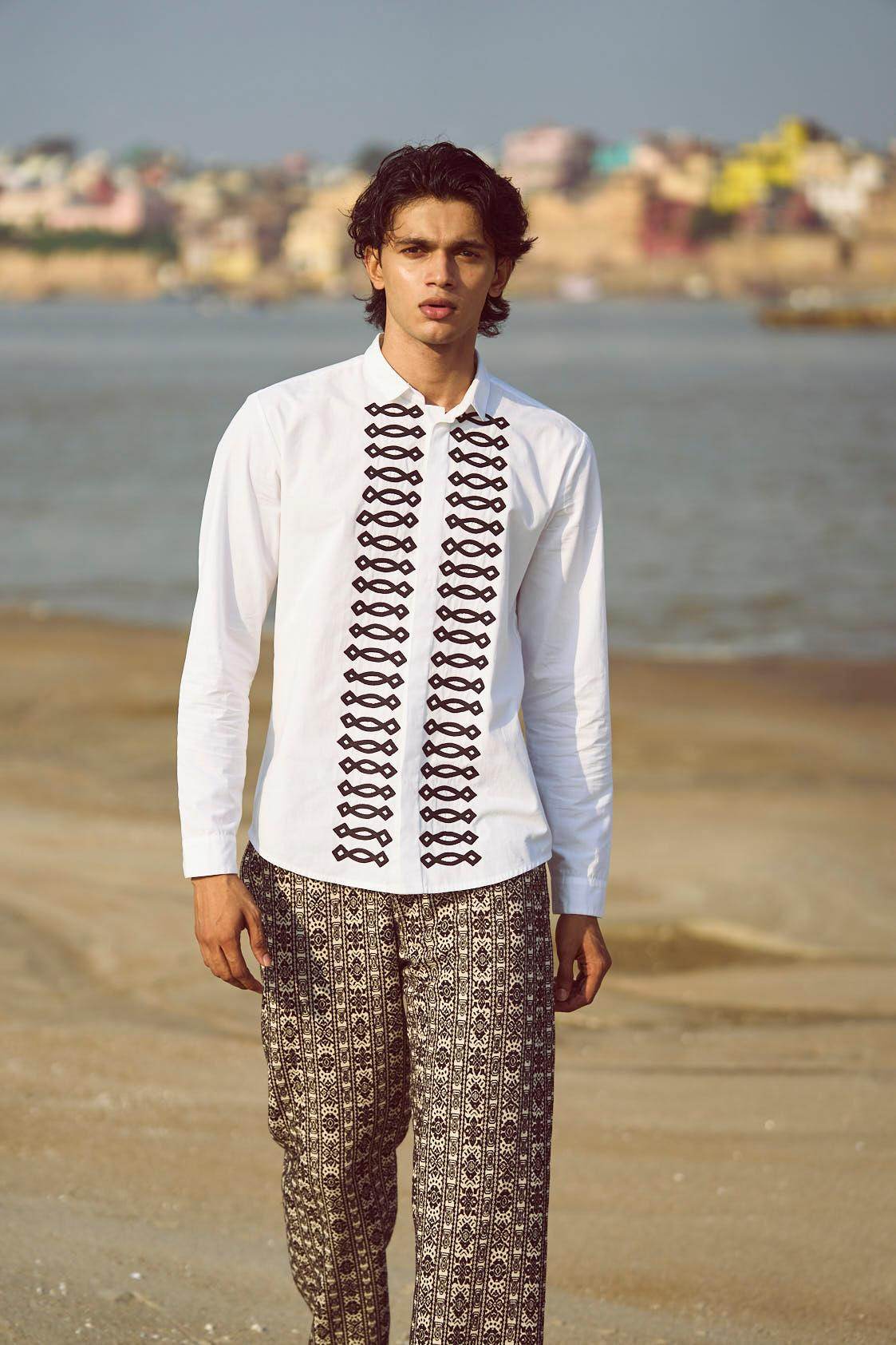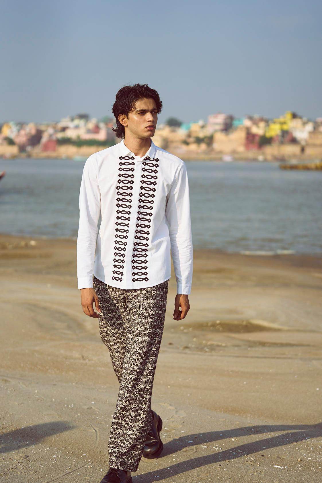 White regular fit cotton poplin shirt. Band leader's outfit inspired contrast black tape applique detail at the front running down the placket. Concealed button placket. Metallic button closure at the cuffs. Full sleeves.