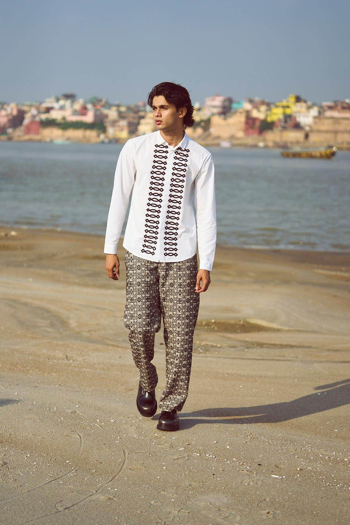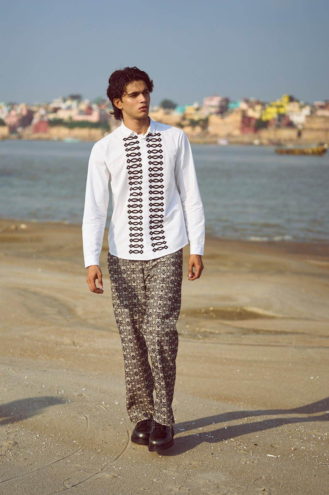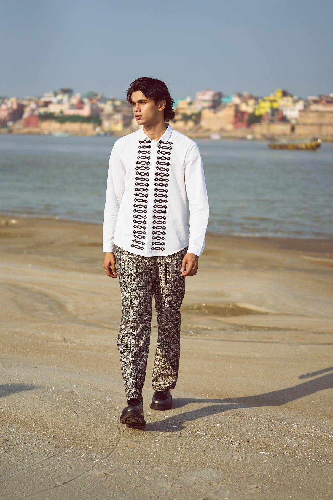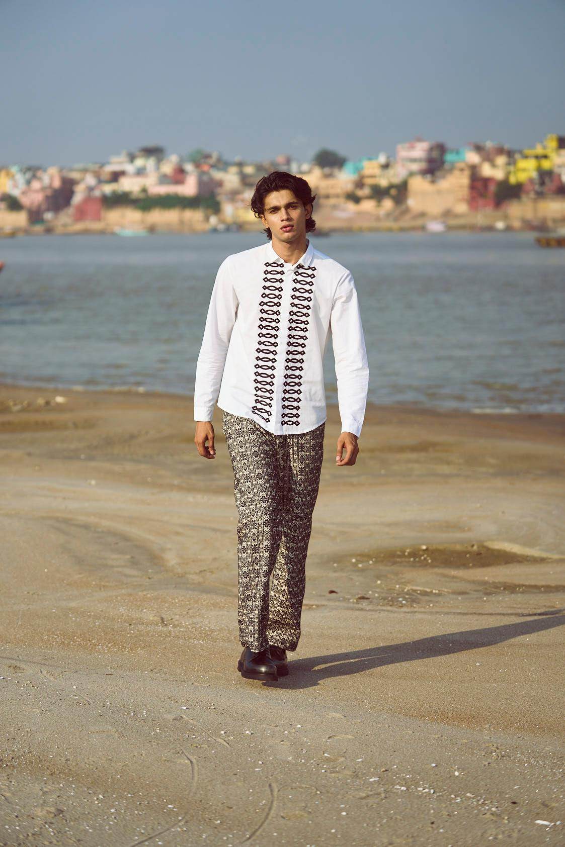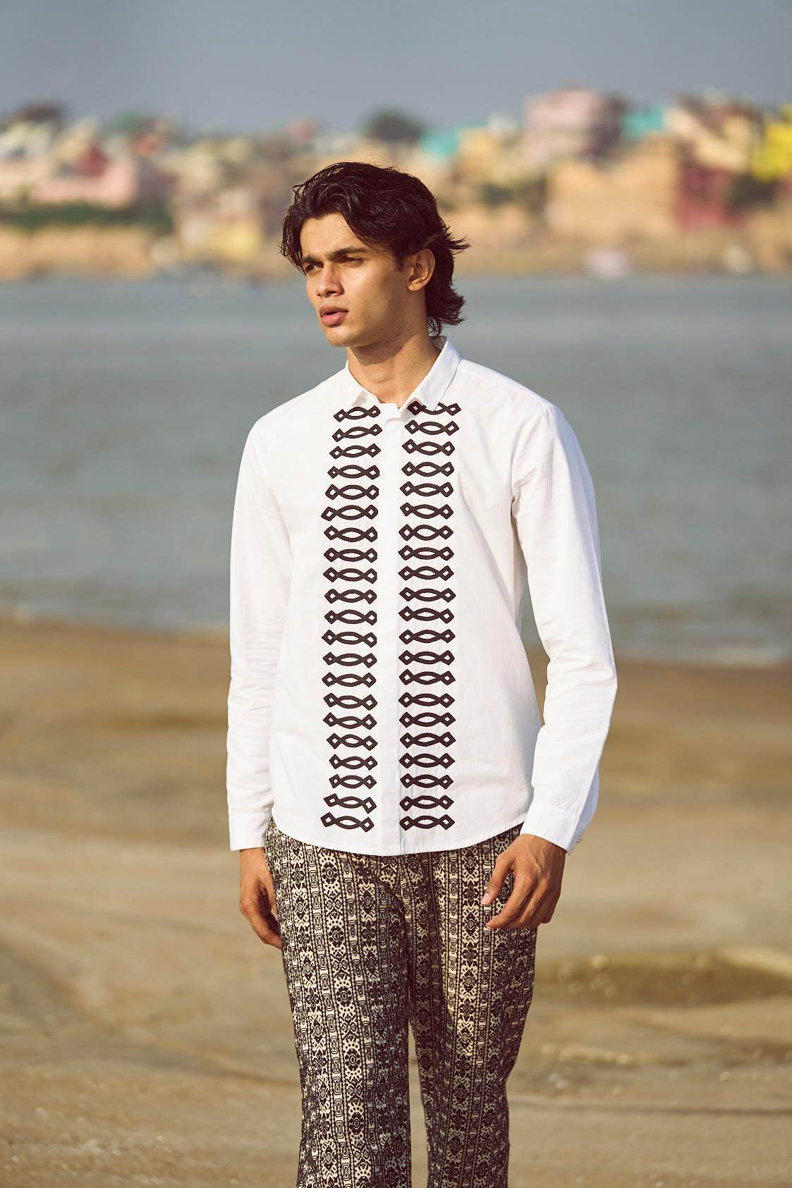 White regular fit cotton poplin shirt. Band leader's outfit inspired contrast black tape applique detail at the front running down the placket. Concealed button placket. Metallic button closure at the cuffs. Full sleeves.