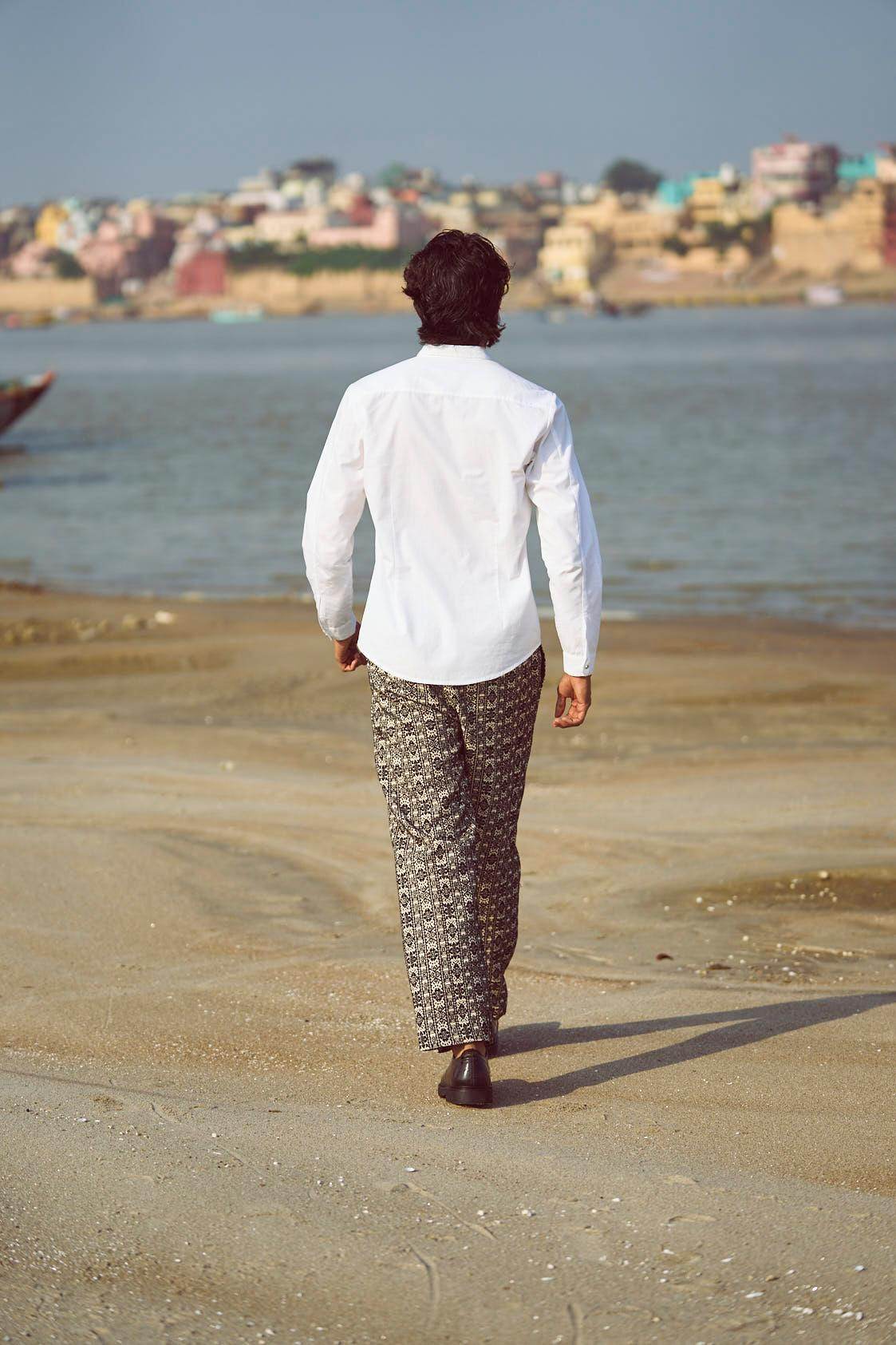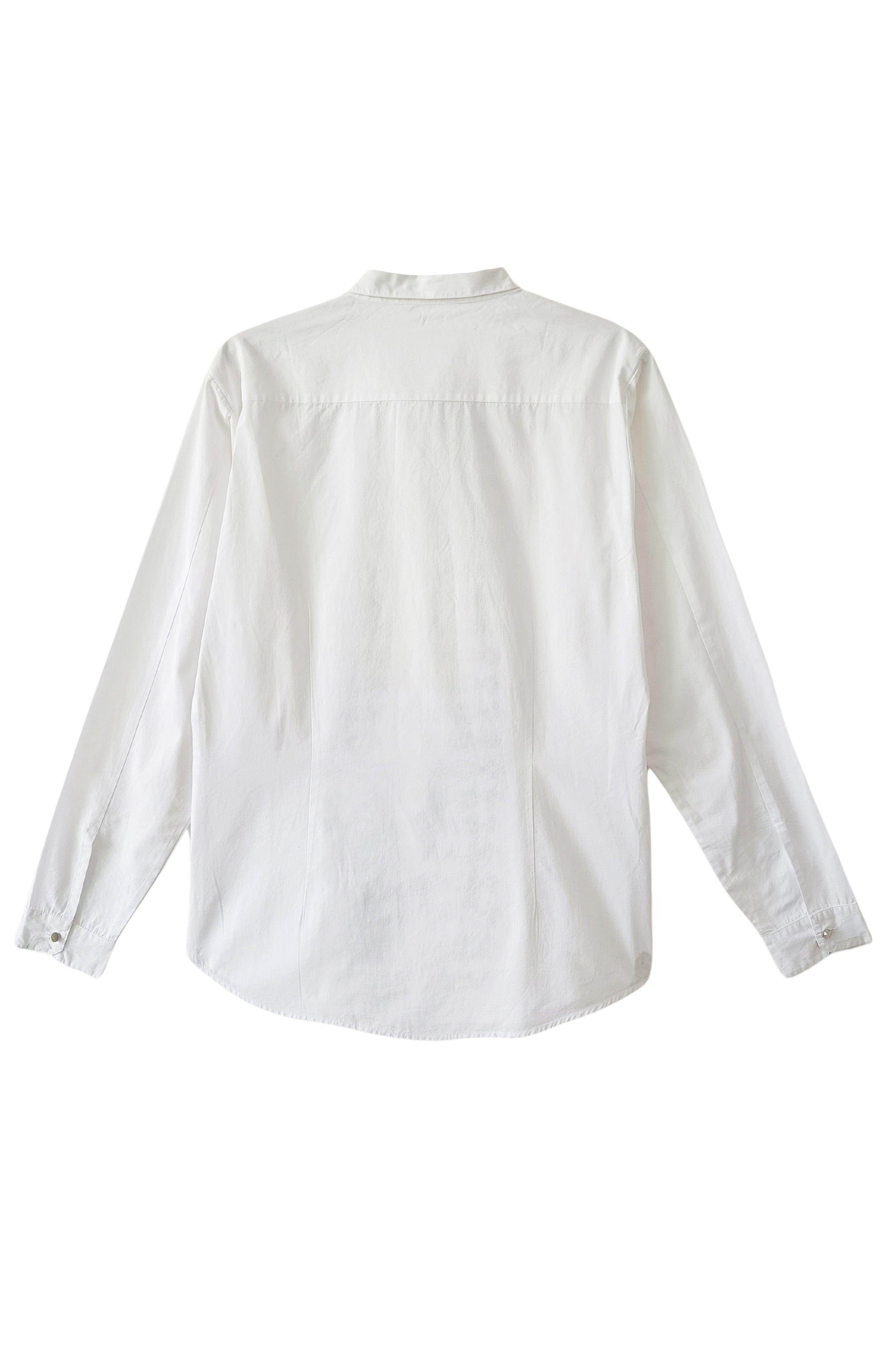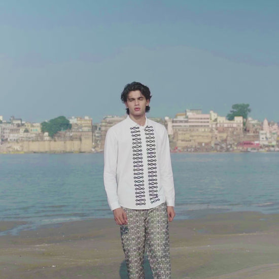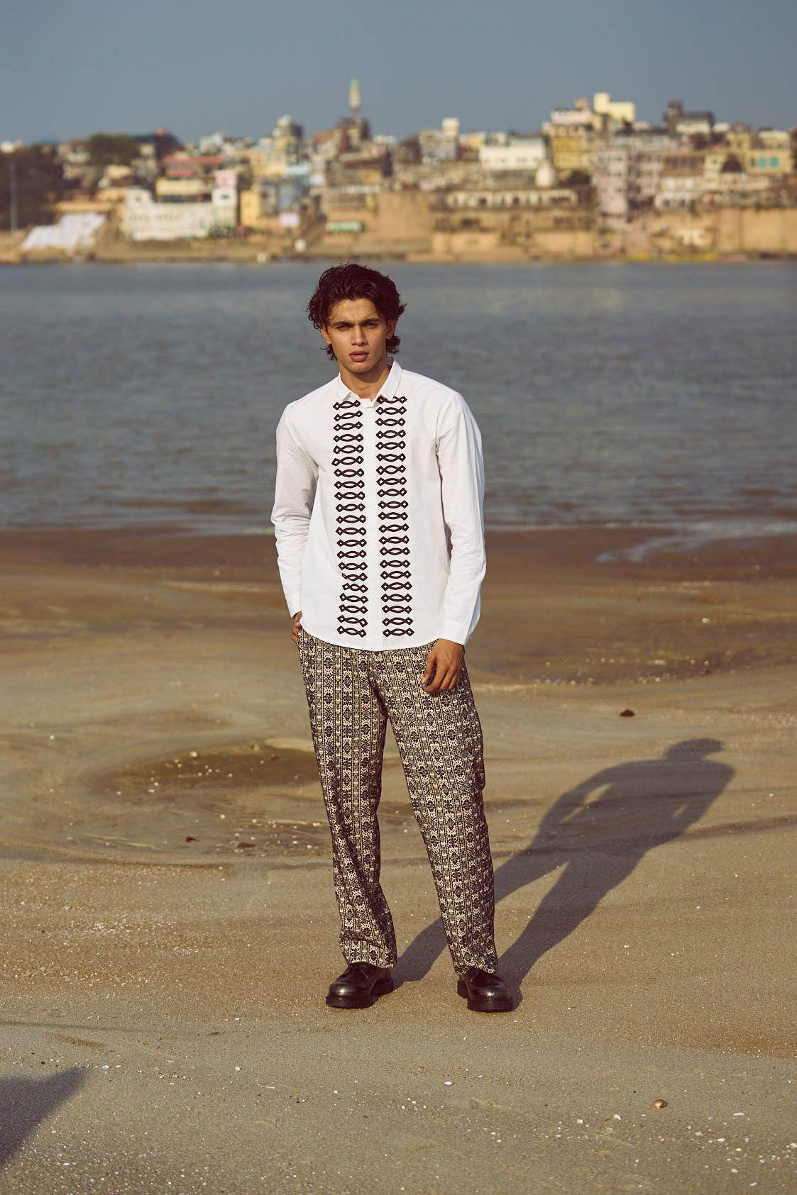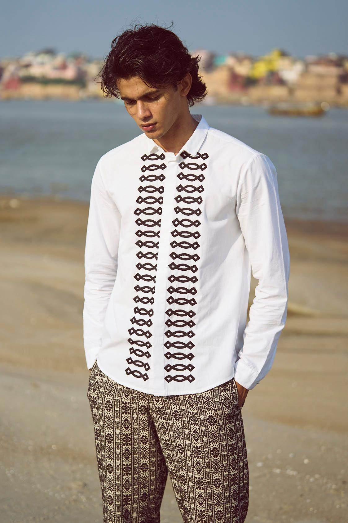 White regular fit cotton poplin shirt. Band leader's outfit inspired contrast black tape applique detail at the front running down the placket. Concealed button placket. Metallic button closure at the cuffs. Full sleeves.