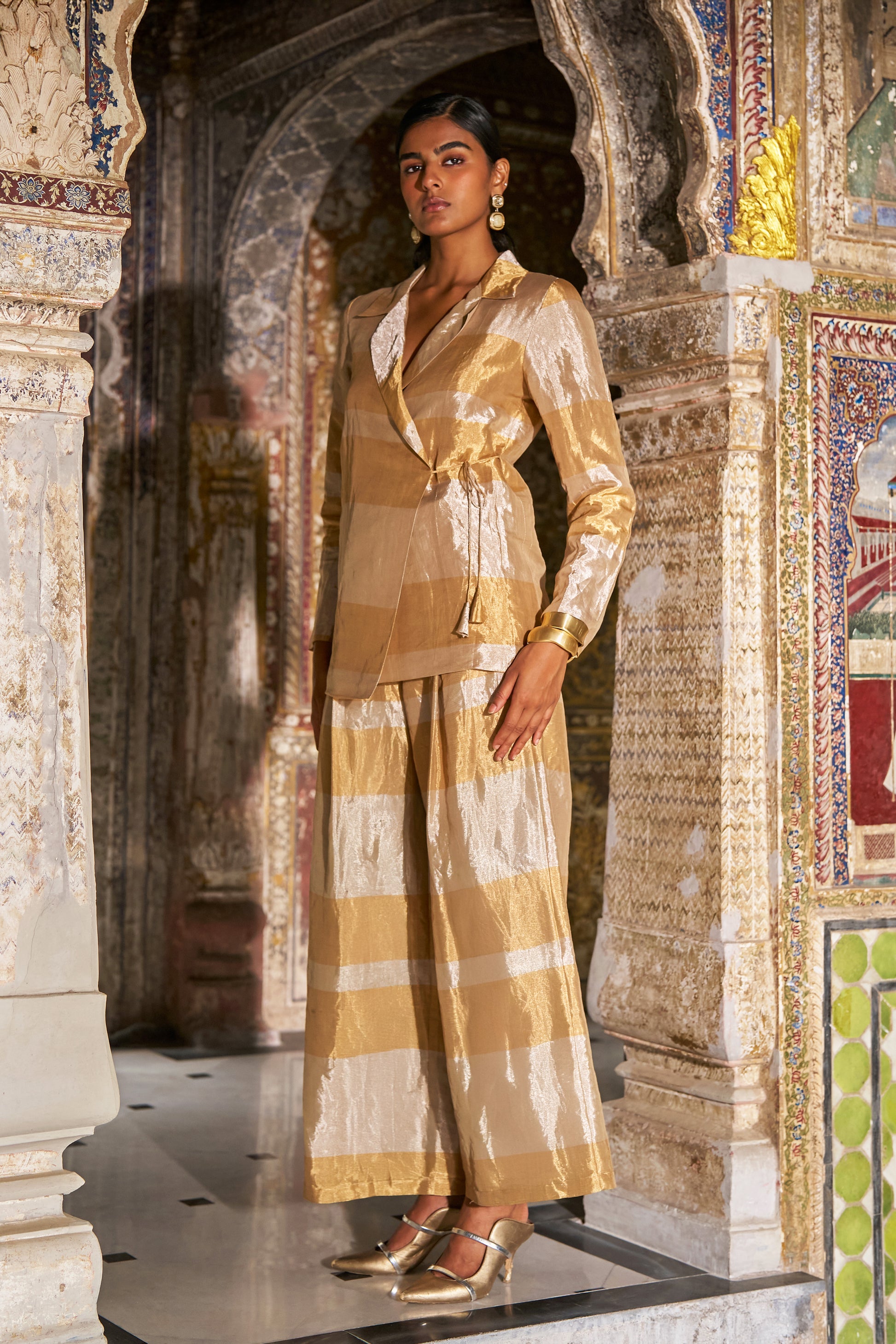 Benares tissue blazer with variegated gold and champagne stripes. Designed in a wrap style with front side tie detailing. Notch collar with full sleeves. Fully lined.