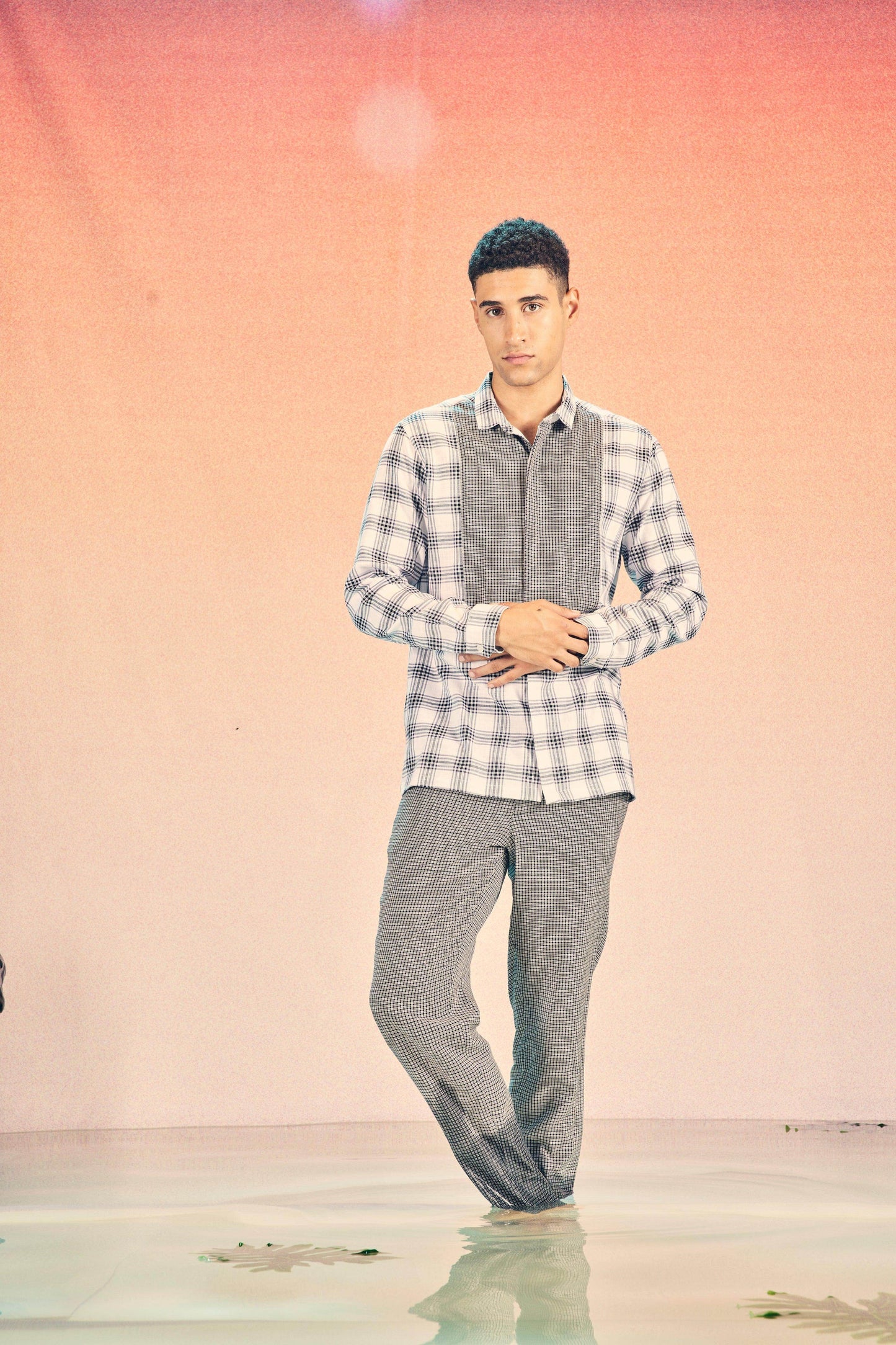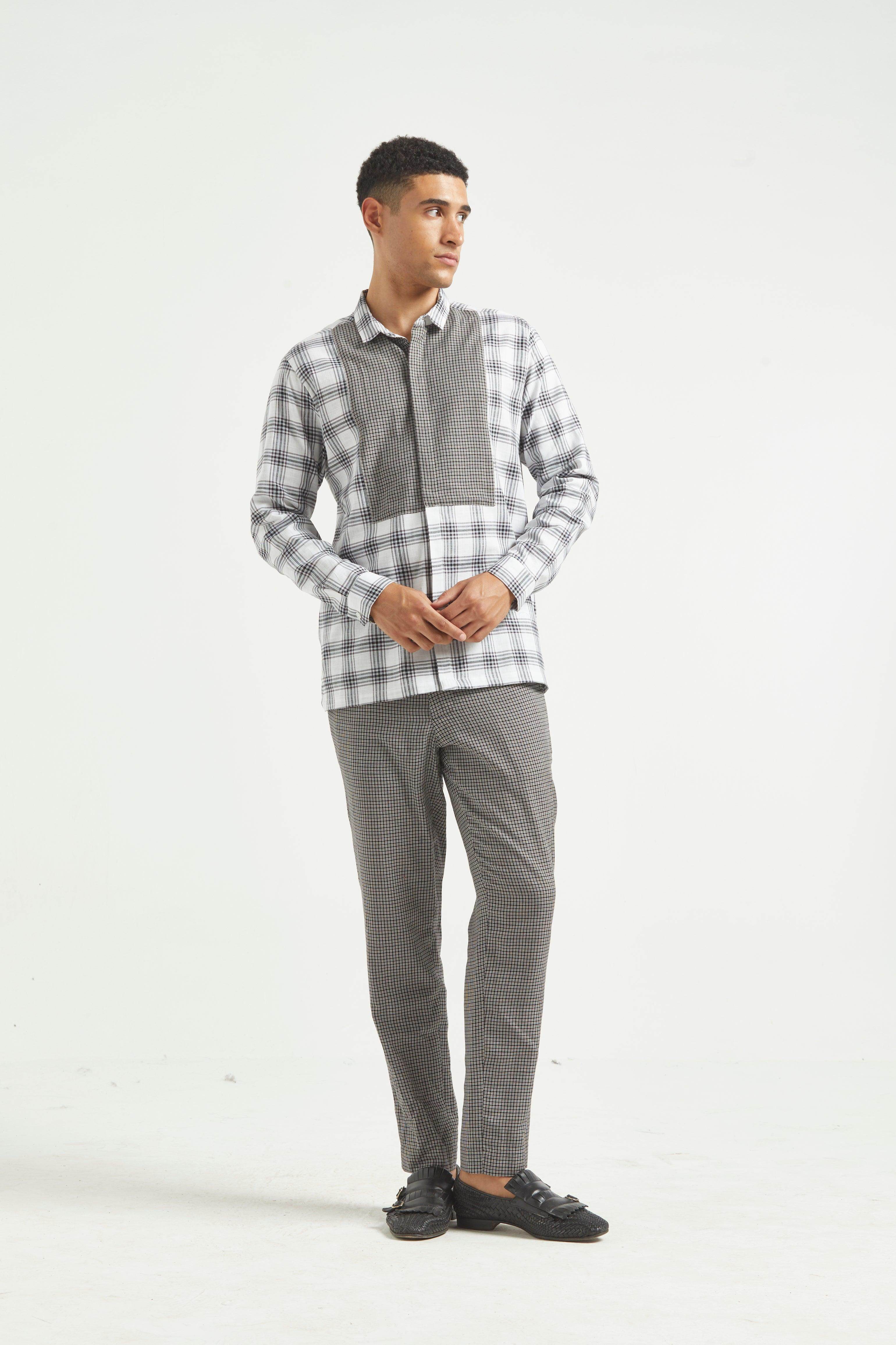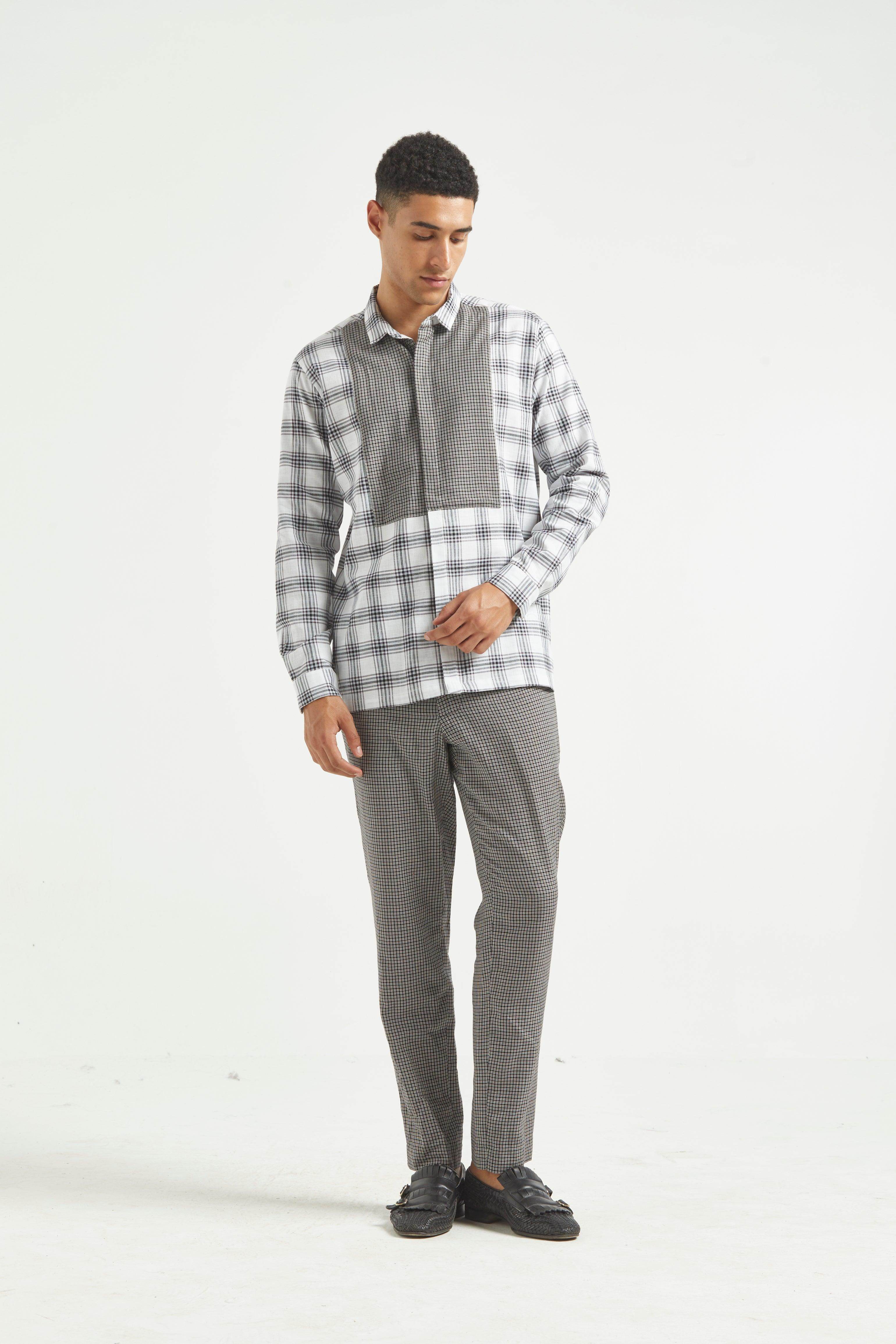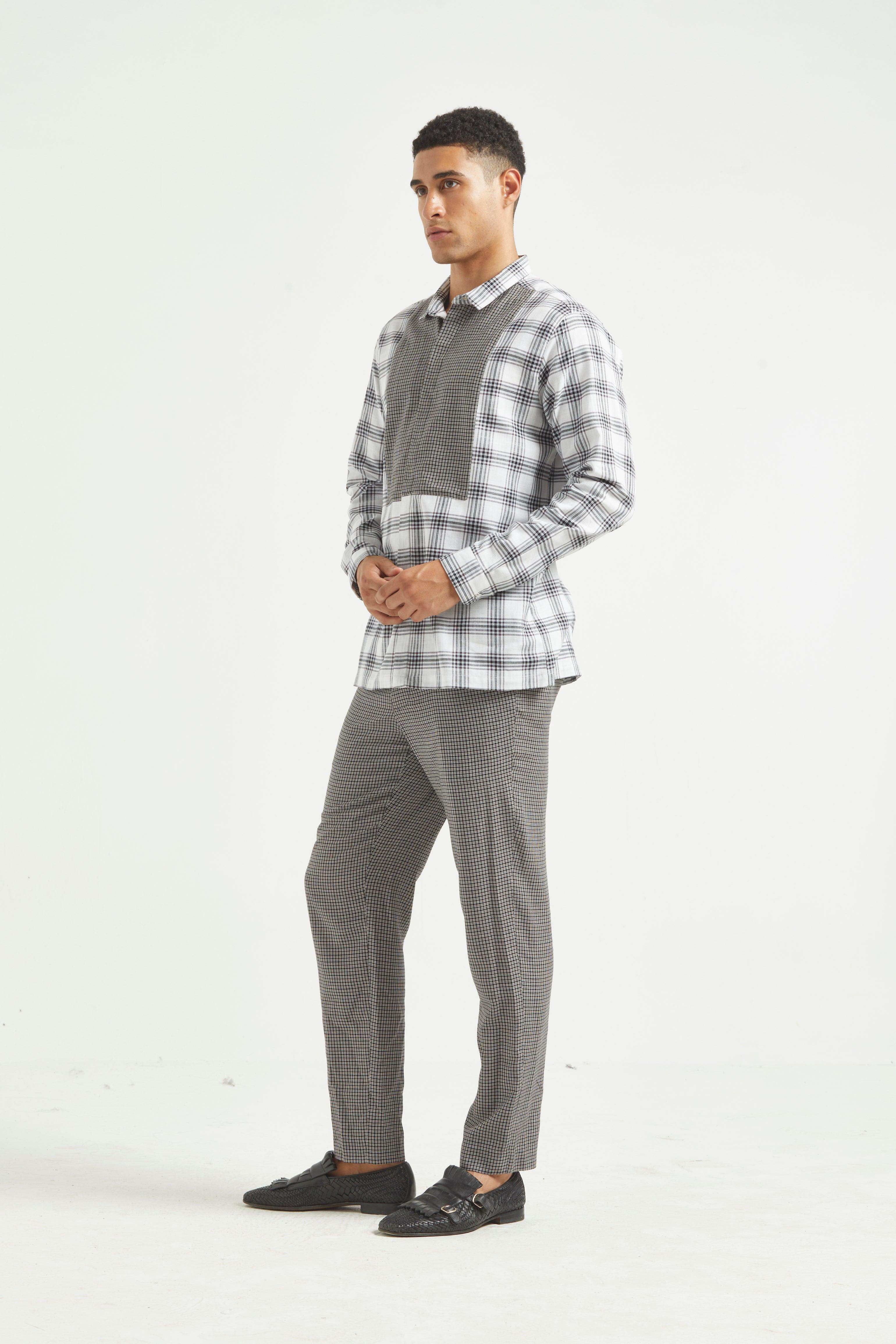 Large scale black and white tonal check shirt with contrast smaller scale checked bib. Button-down front, concealed placket. Full sleeve. Paired with black and white micro check patterned pants in 100% cotton. Regular fit. Pockets on the side, concealed zip fly. Hook closure at the front