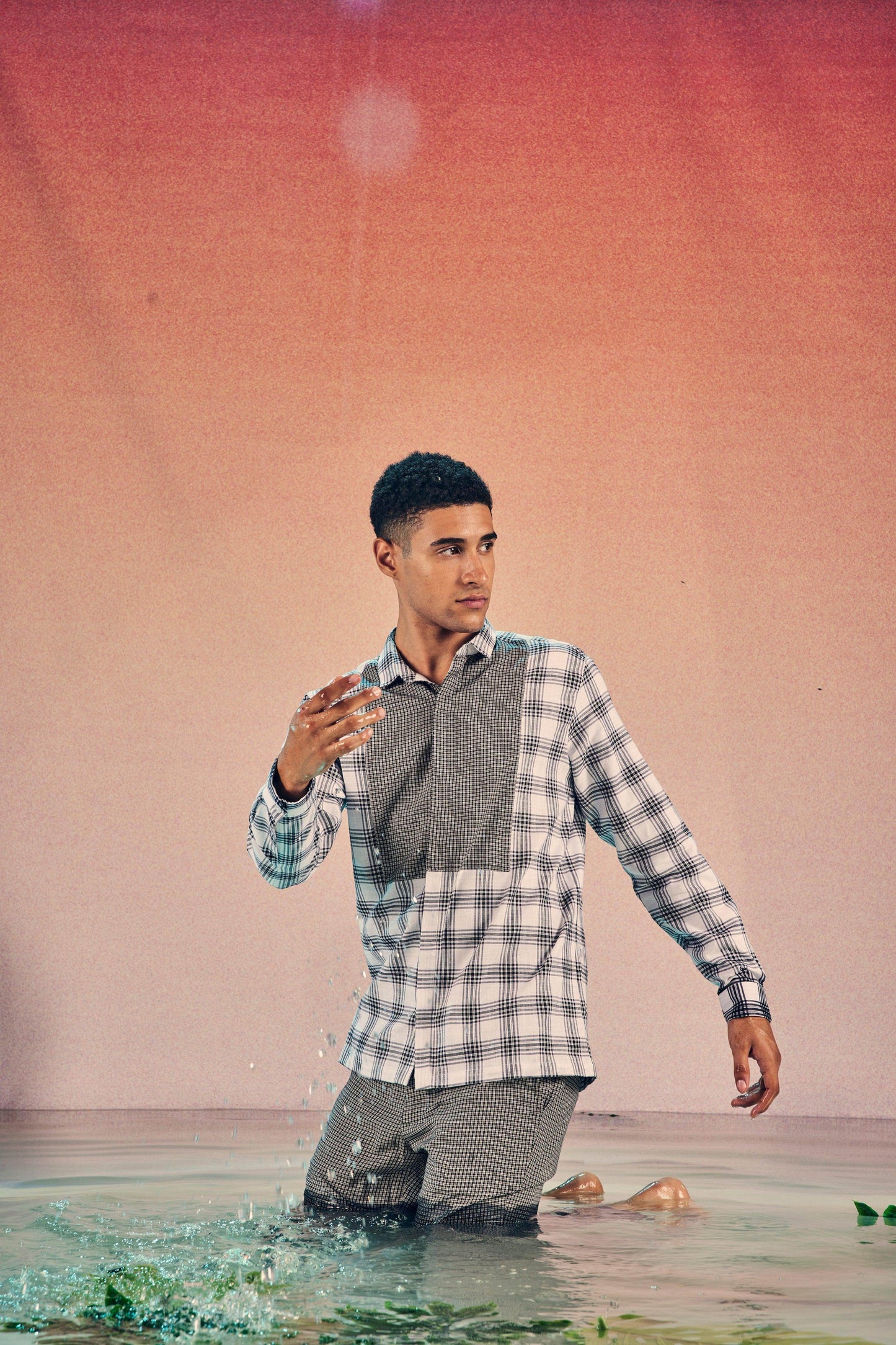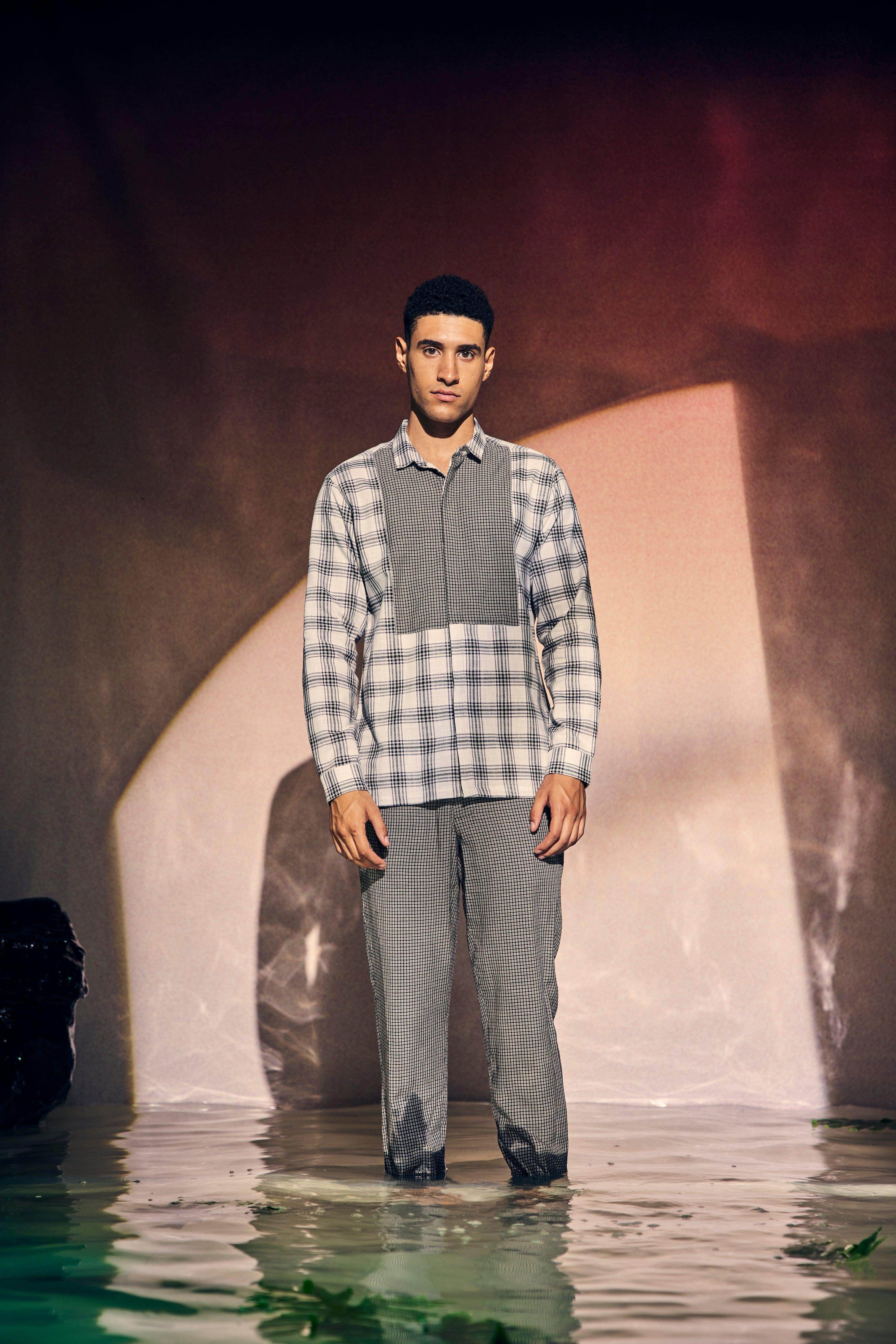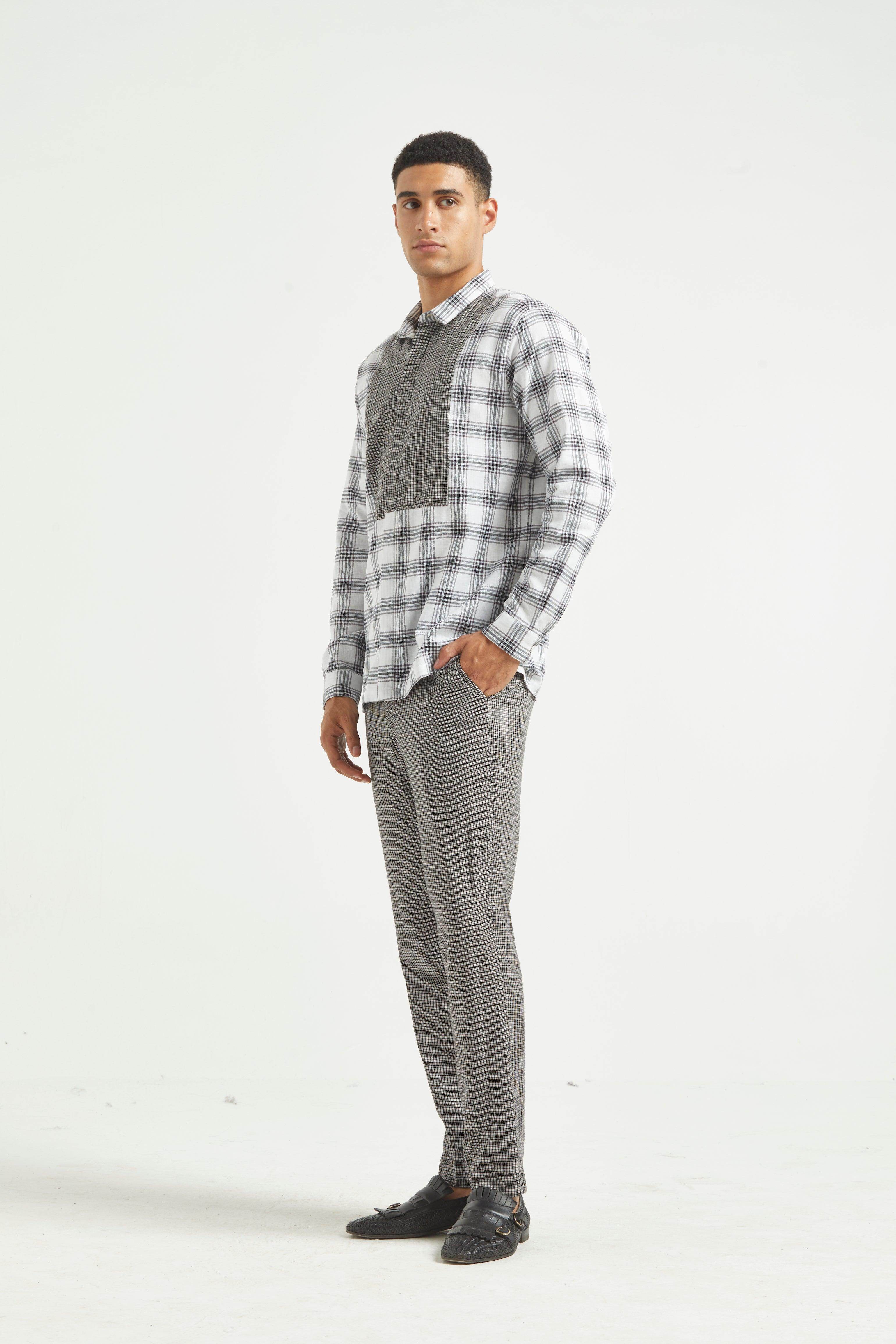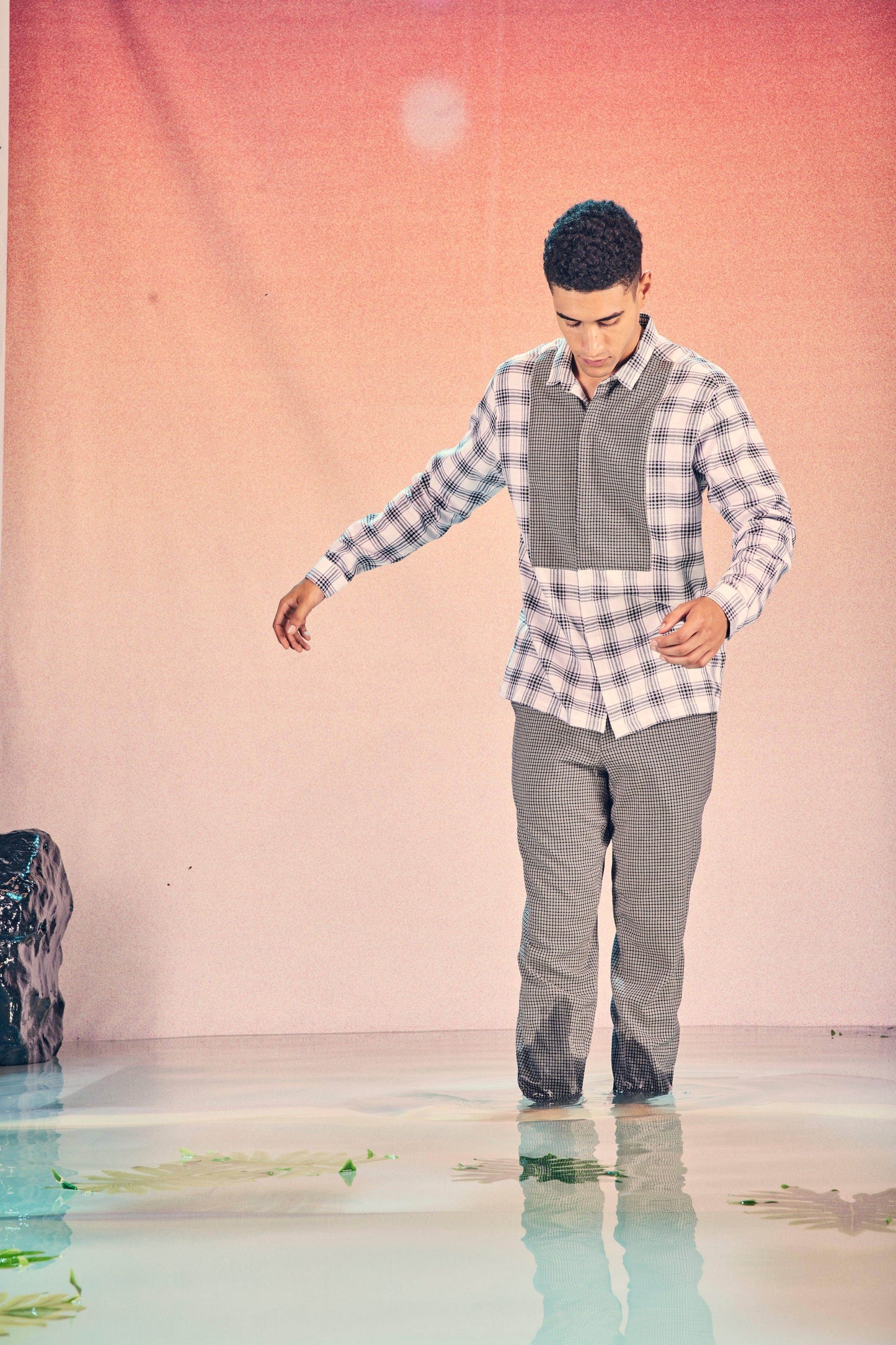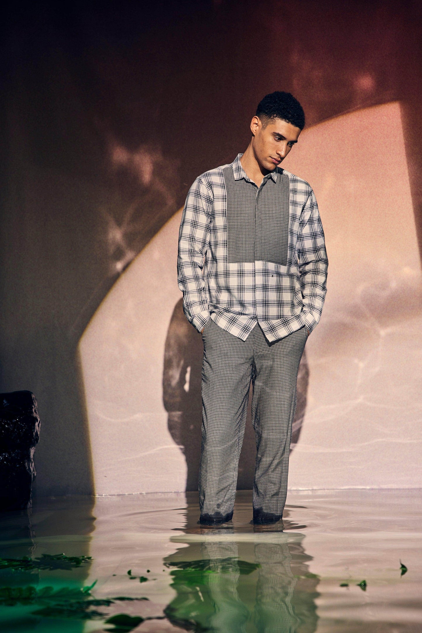 Large scale black and white tonal check shirt with contrast smaller scale checked bib. Button-down front, concealed placket. Full sleeve. Paired with black and white micro check patterned pants in 100% cotton. Regular fit. Pockets on the side, concealed zip fly. Hook closure at the front