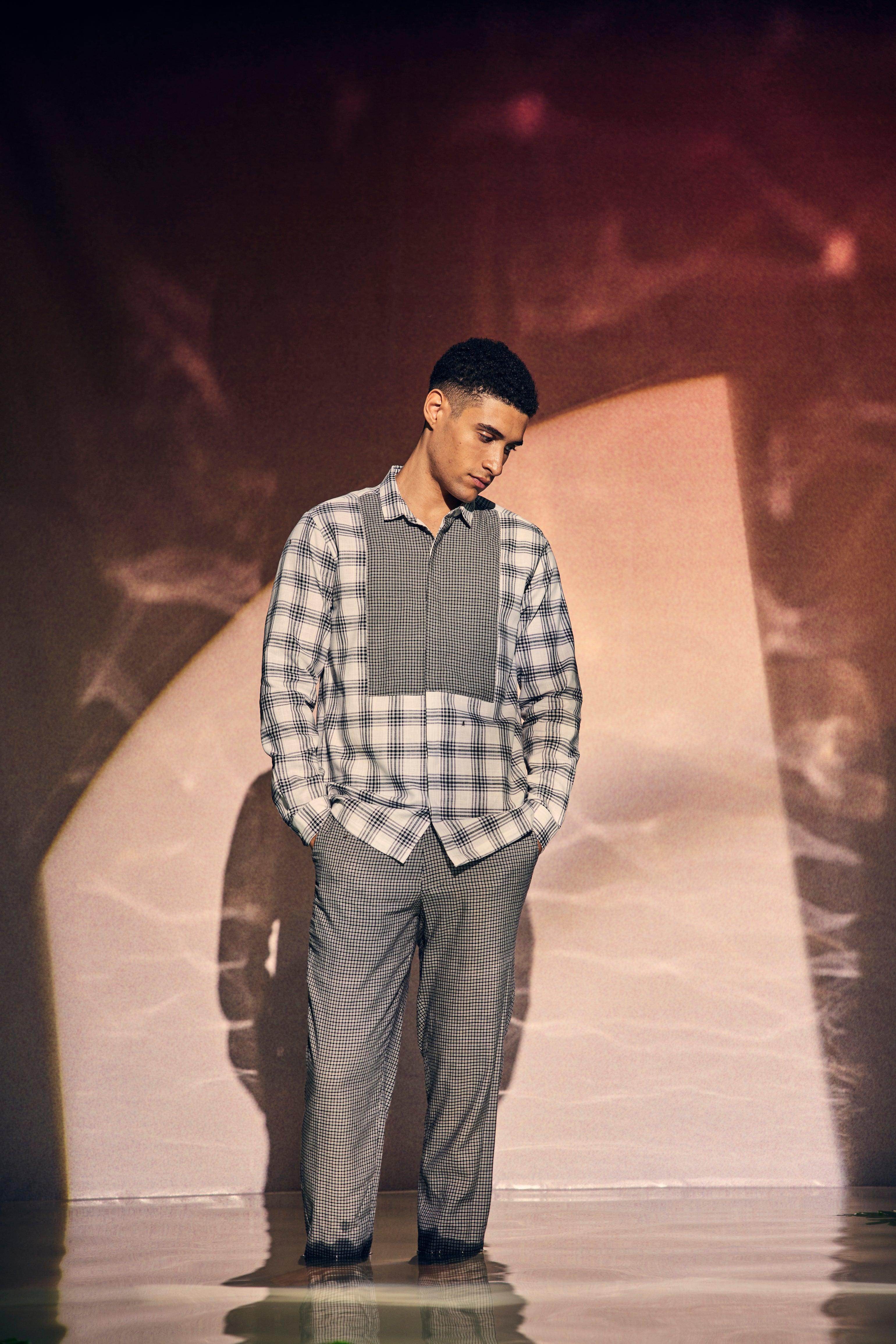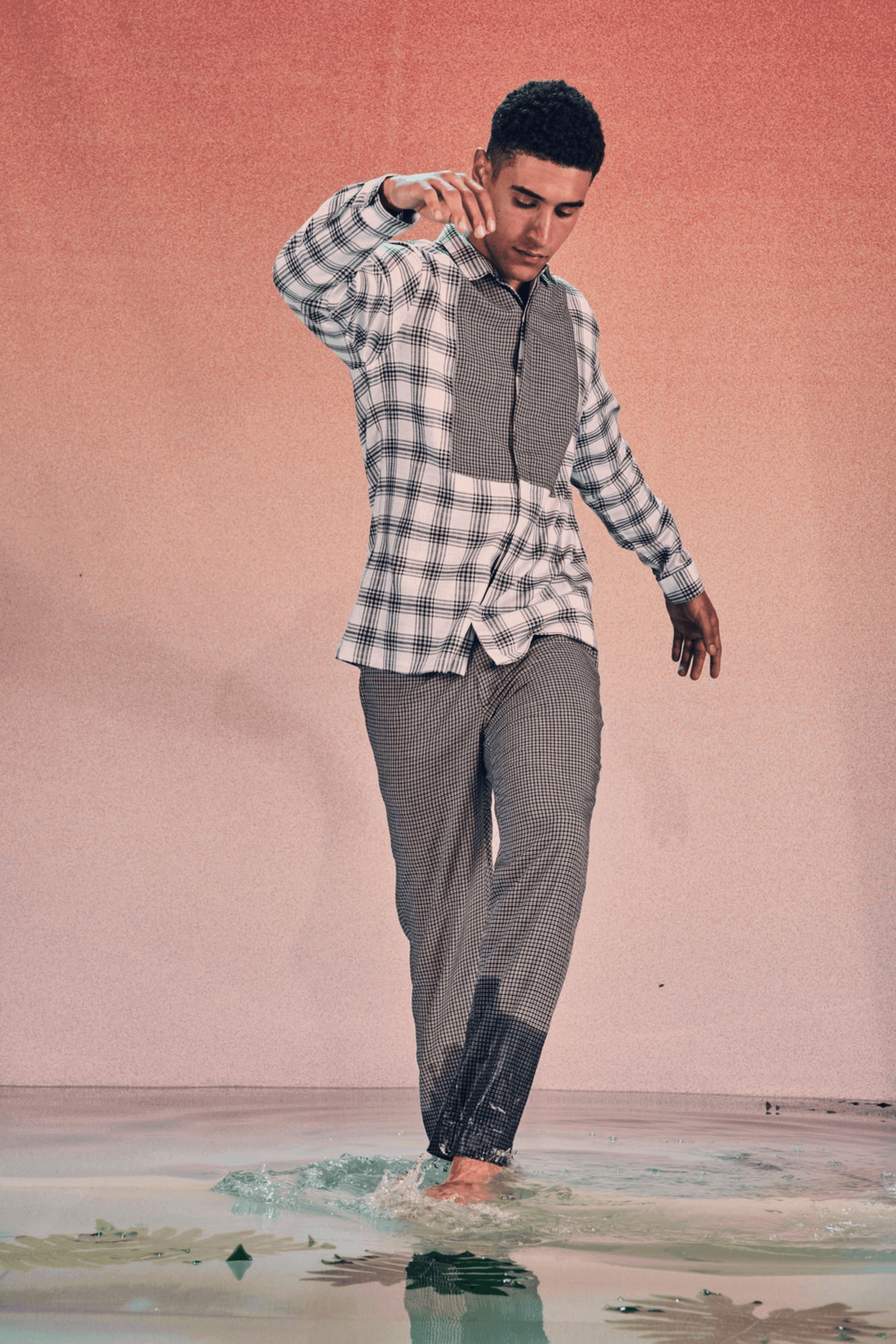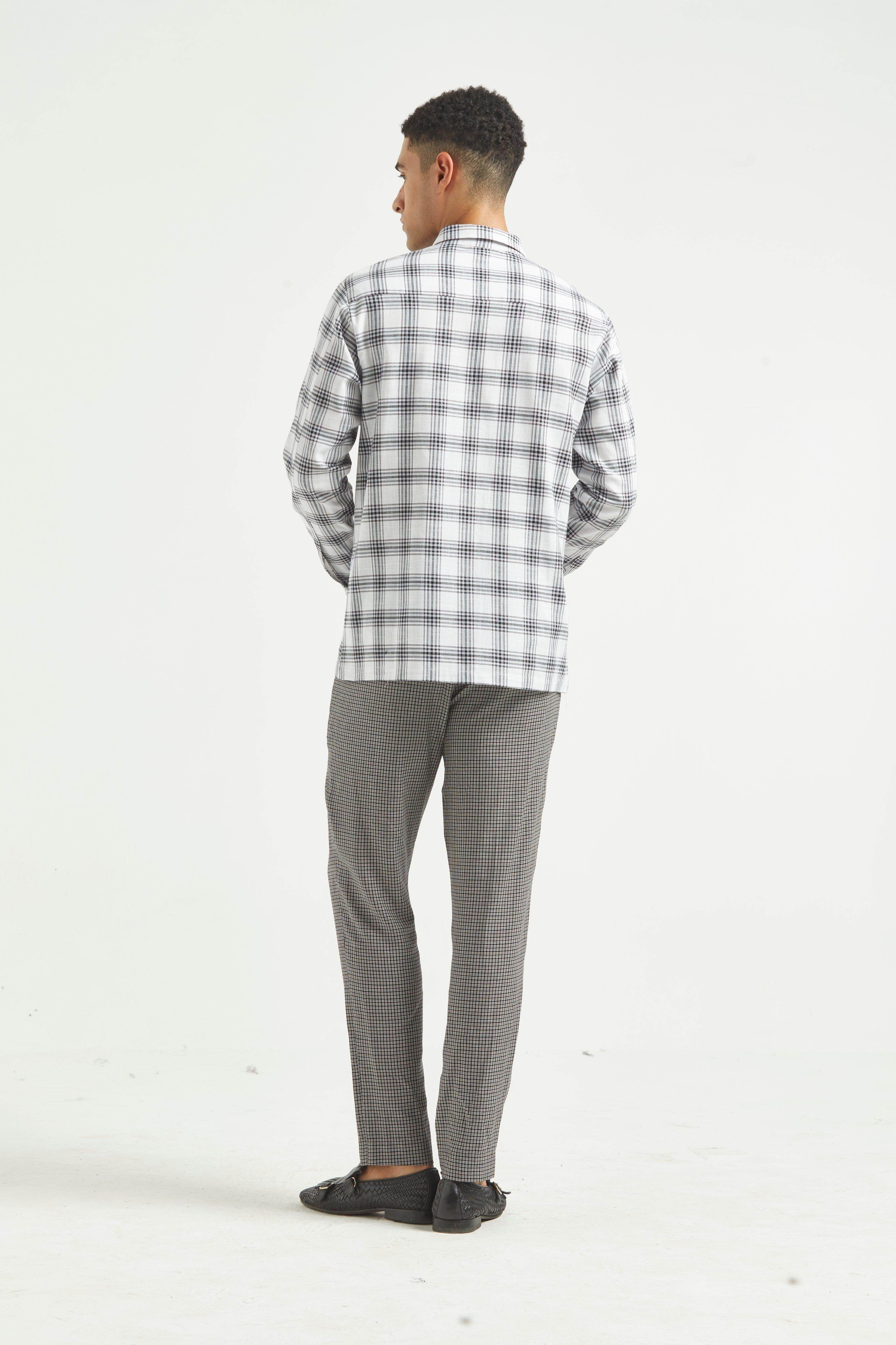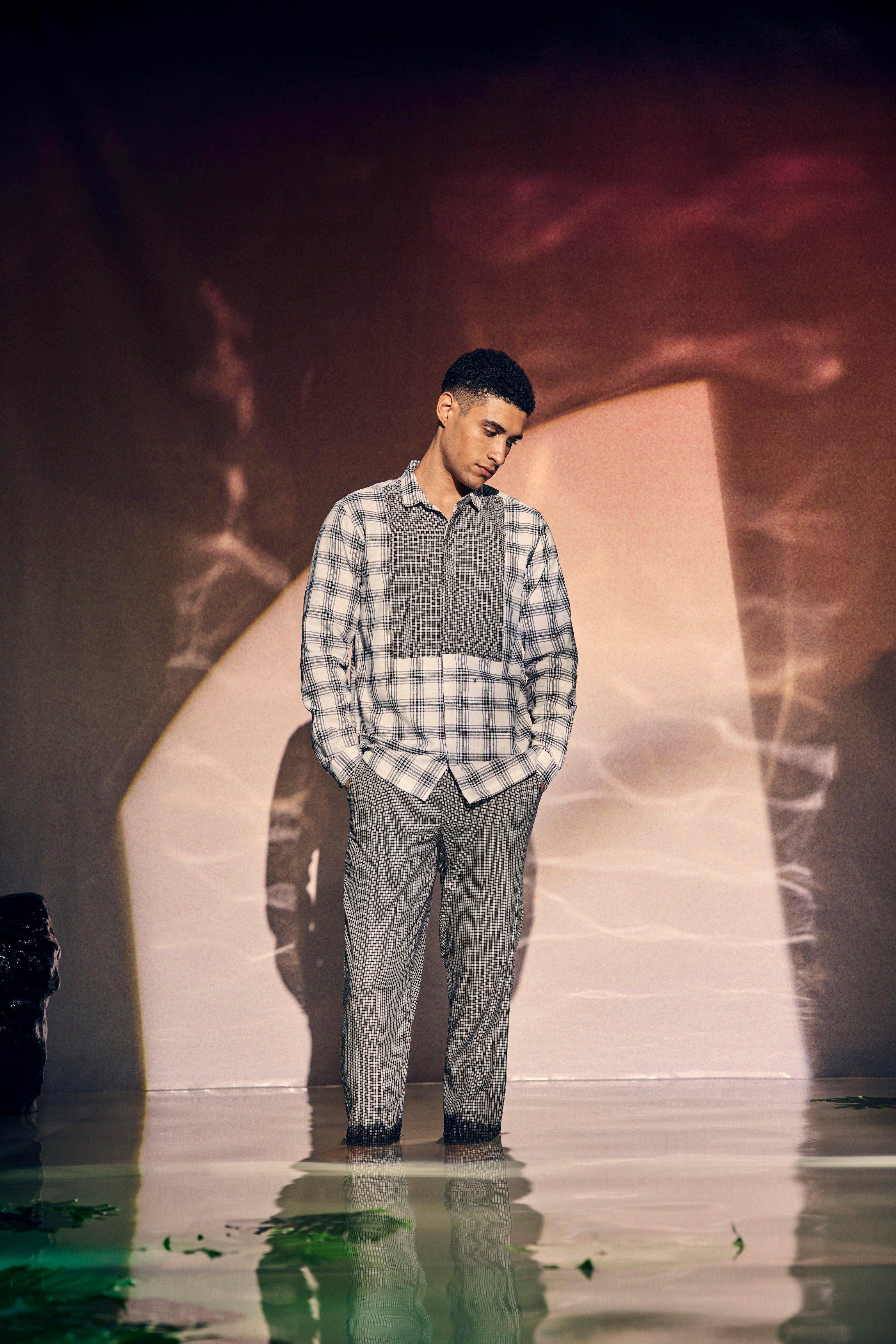 Large scale black and white tonal check shirt with contrast smaller scale checked bib. Button-down front, concealed placket. Full sleeve. Paired with black and white micro check patterned pants in 100% cotton. Regular fit. Pockets on the side, concealed zip fly. Hook closure at the front