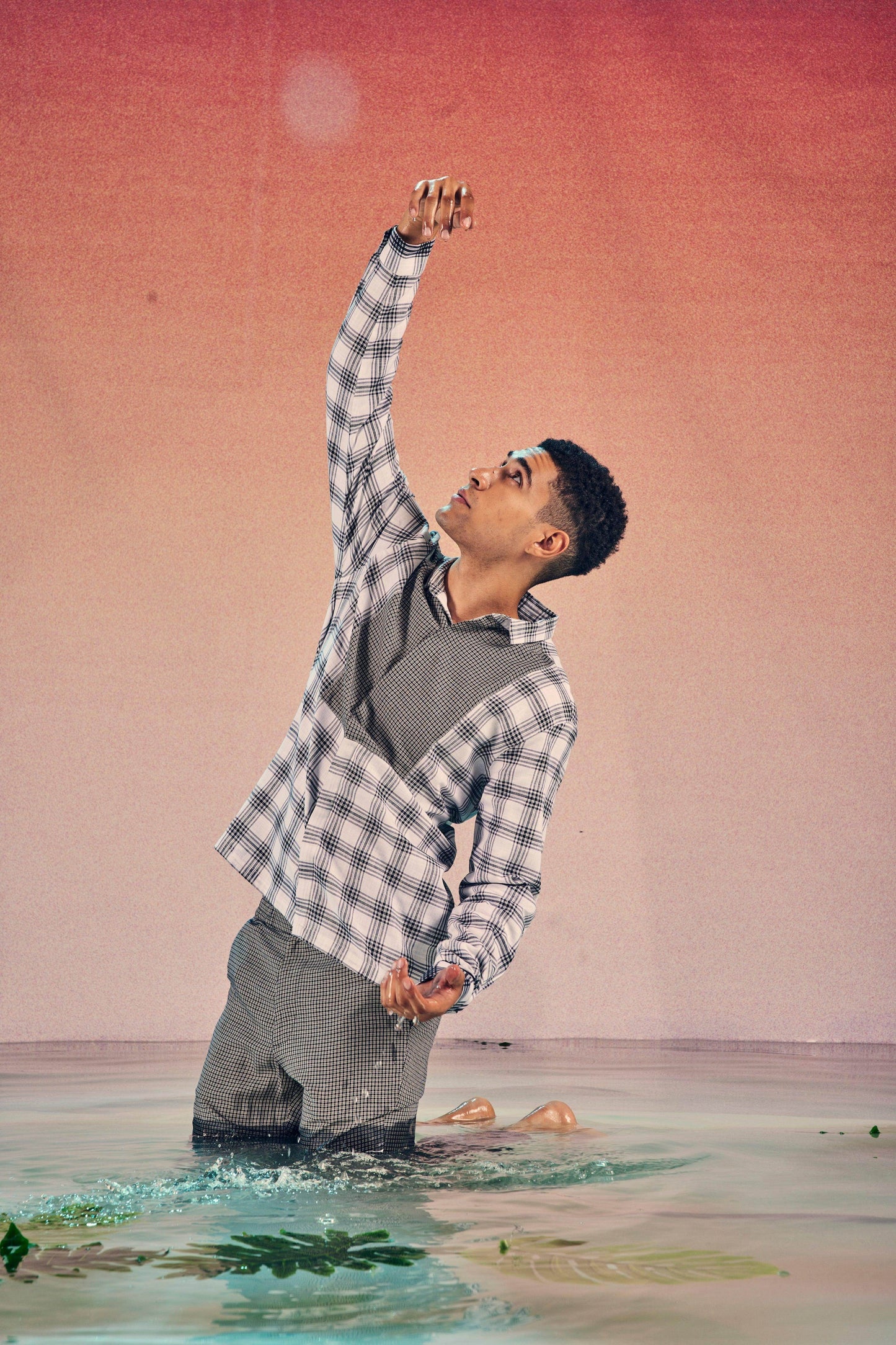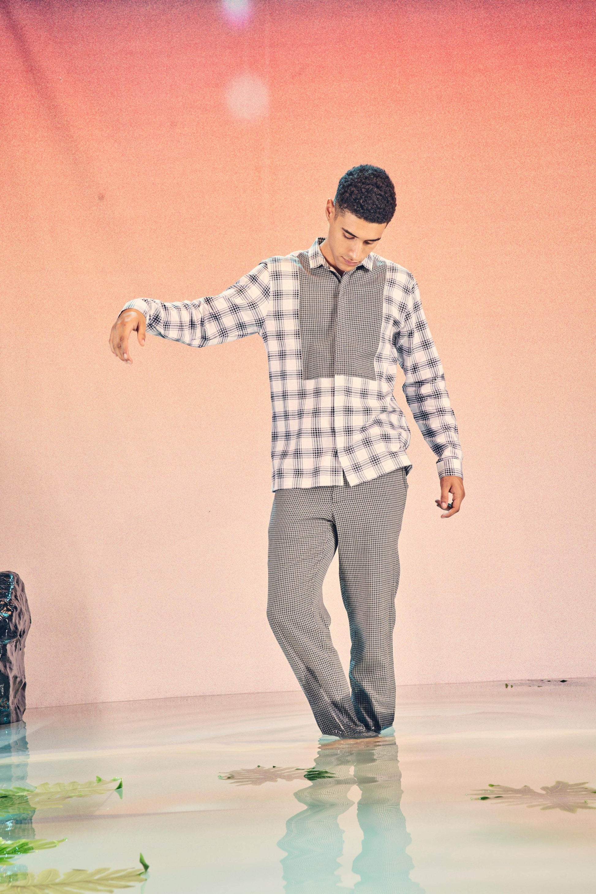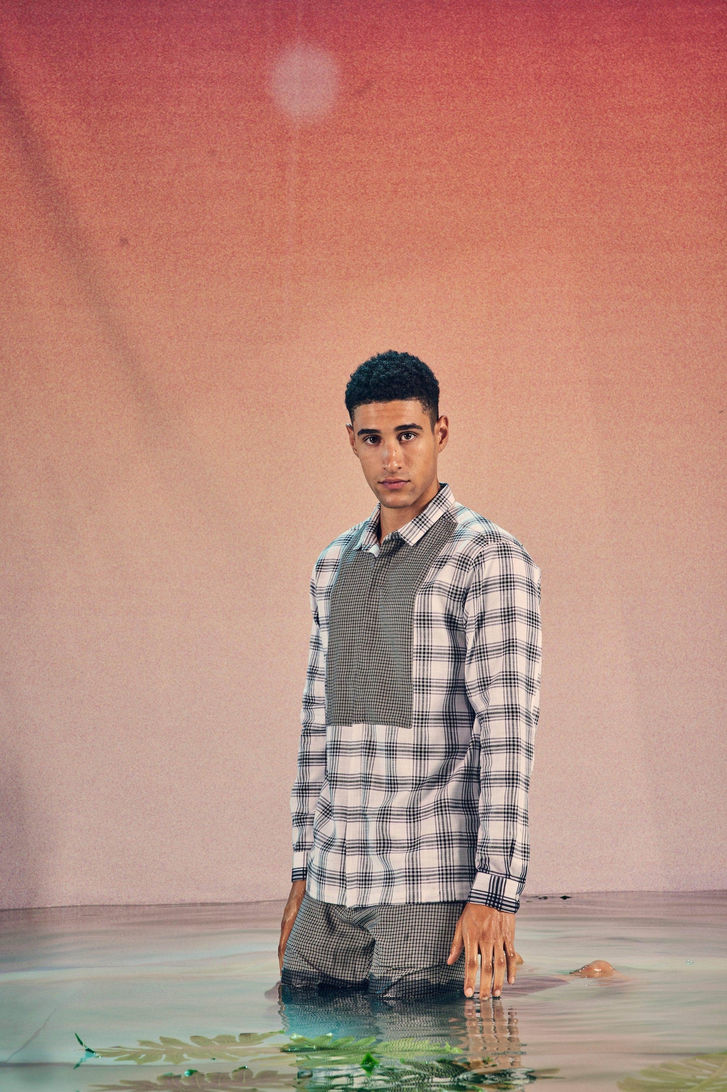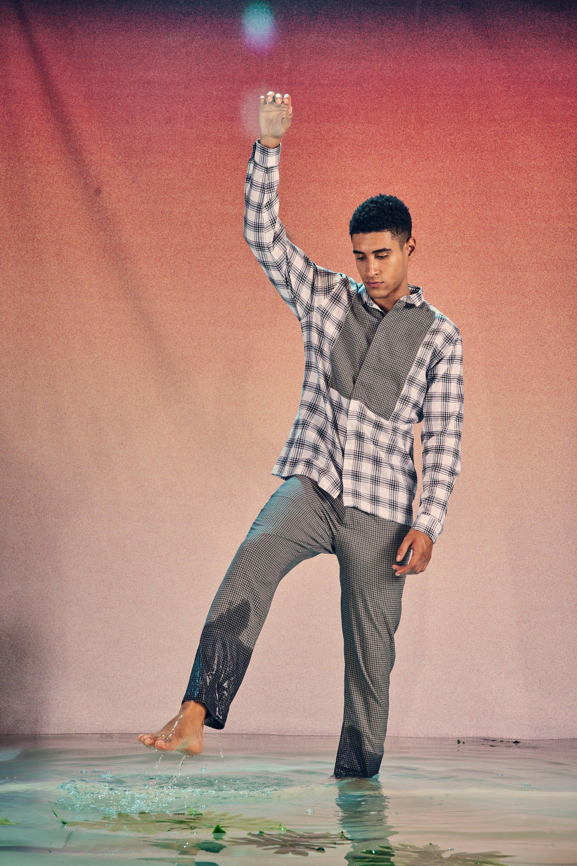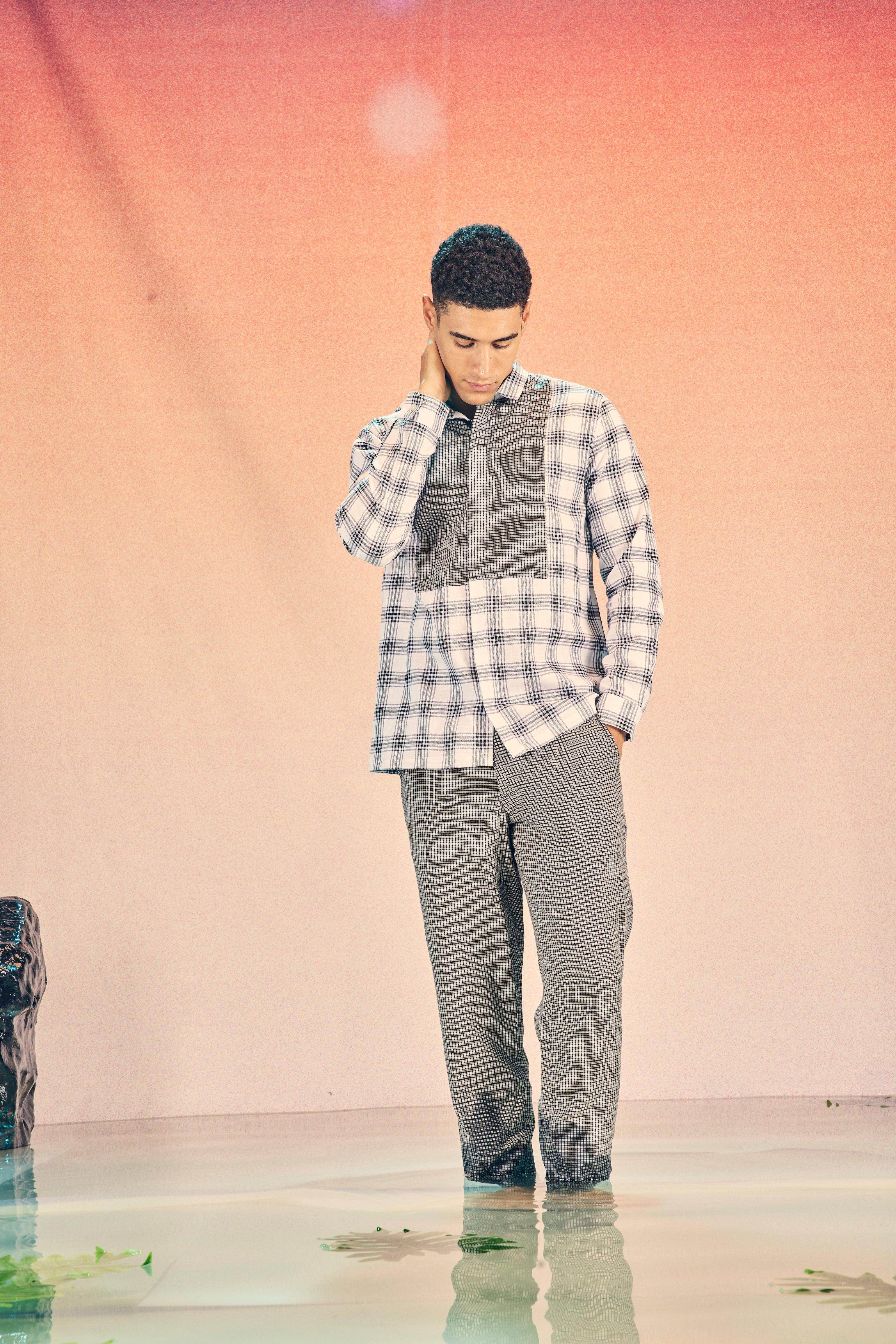Large scale black and white tonal check shirt with contrast smaller scale checked bib. Button-down front, concealed placket. Full sleeve. Paired with black and white micro check patterned pants in 100% cotton. Regular fit. Pockets on the side, concealed zip fly. Hook closure at the front