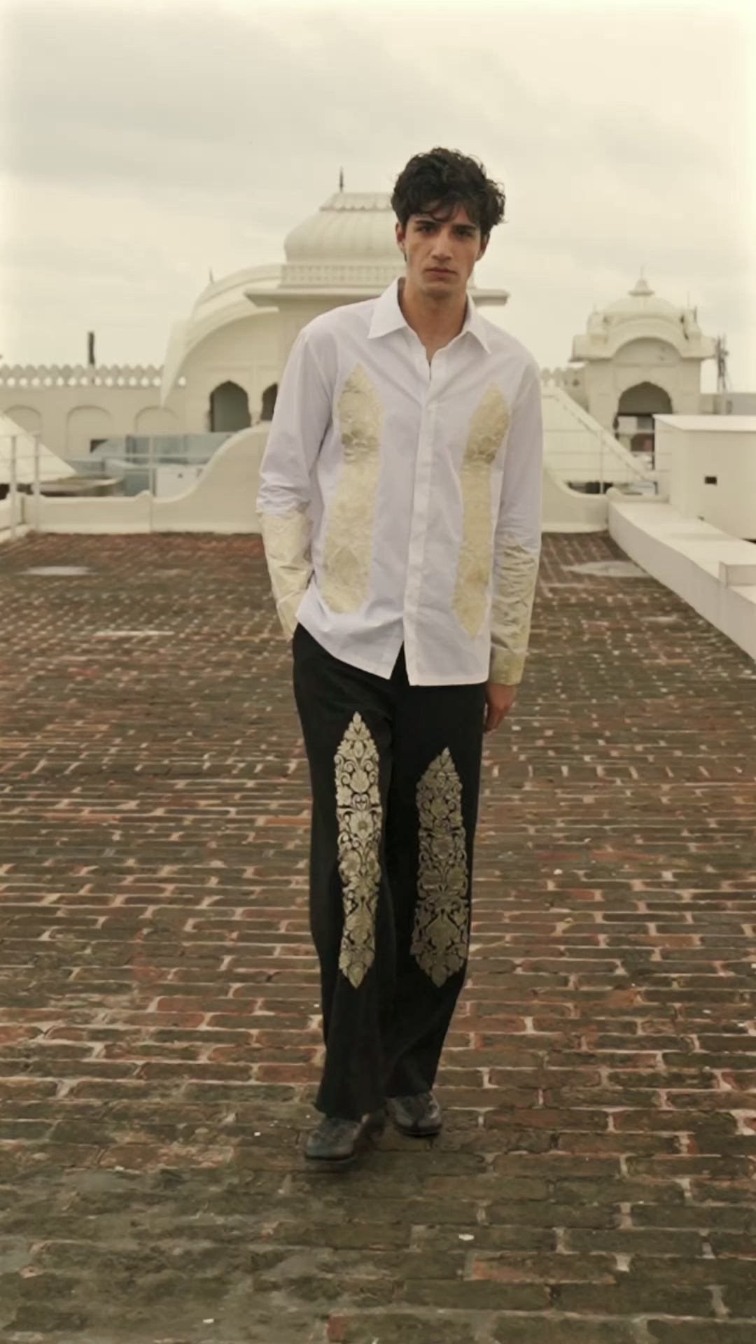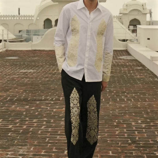 Straight cut black pant with hand-sewn Brocade Chanderi patches placed at the front knees. Belt loops at the waist with front zip and hook/eye closure. Pockets in the sides. Made in all weather suiting material.