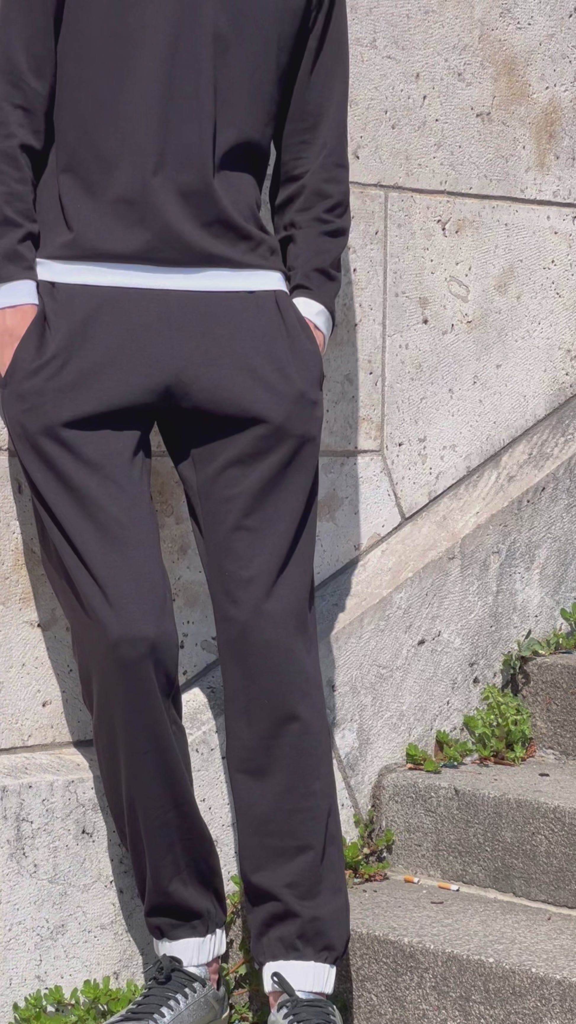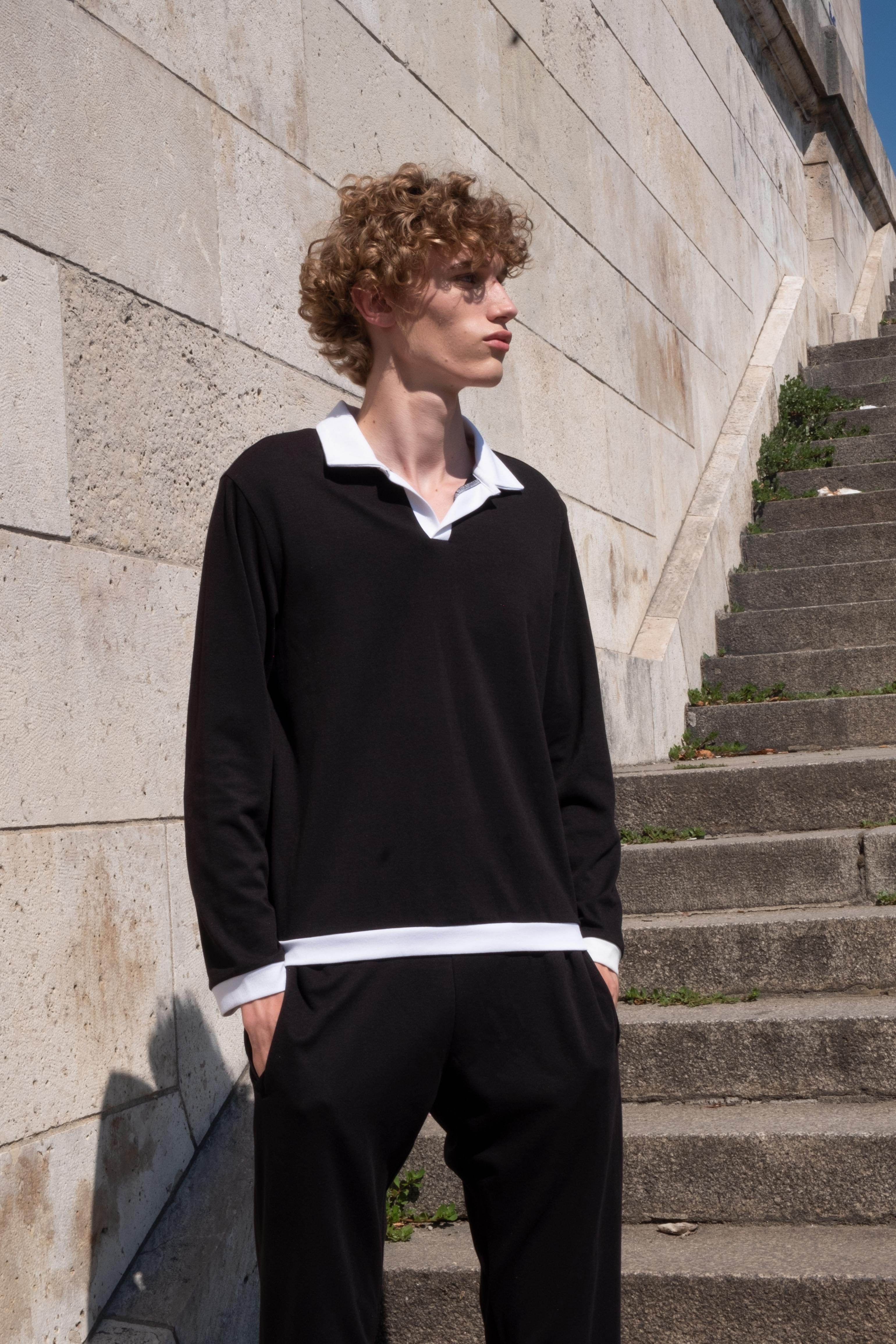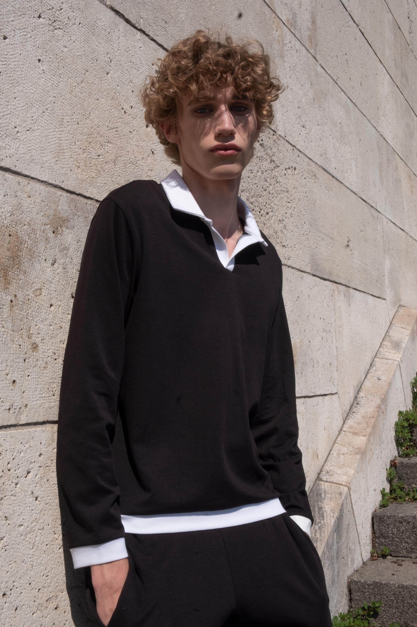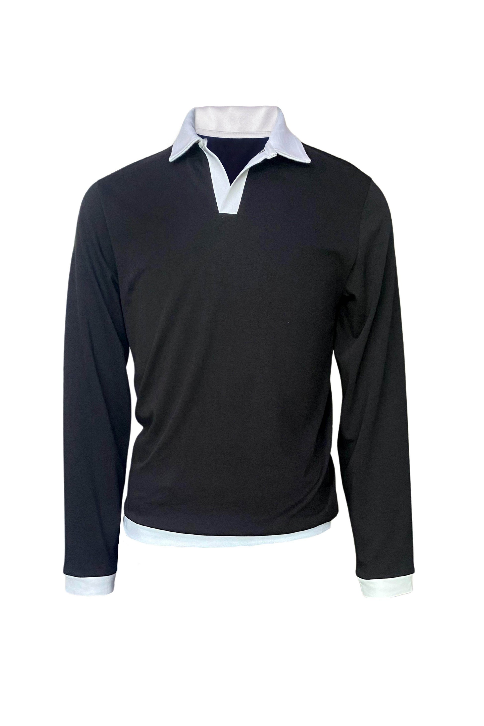 Black long sleeve polo with contrasting white collar, placket, cuff, and hem detail. Regular fit. Sustainably sourced recycled polyester and Pima cotton blend.