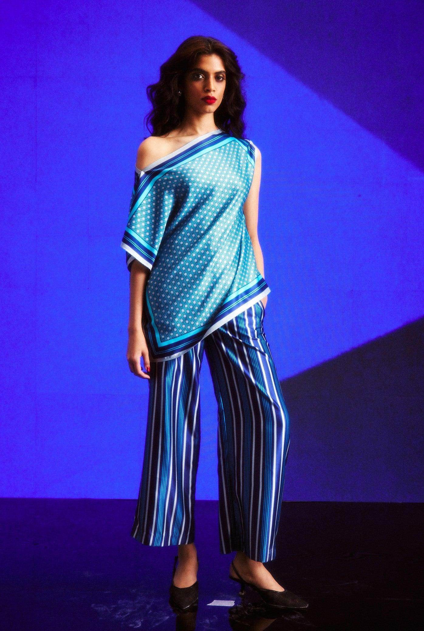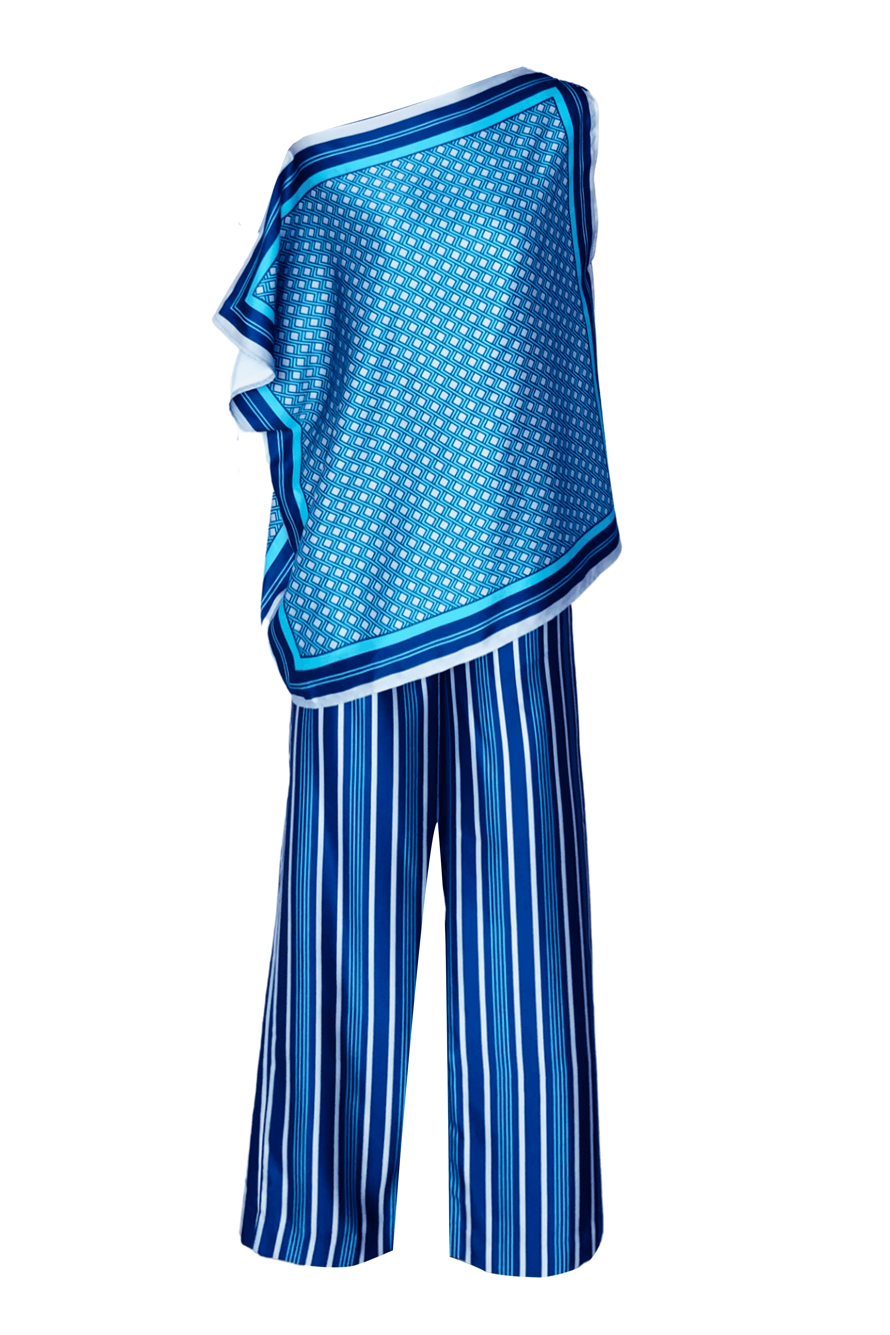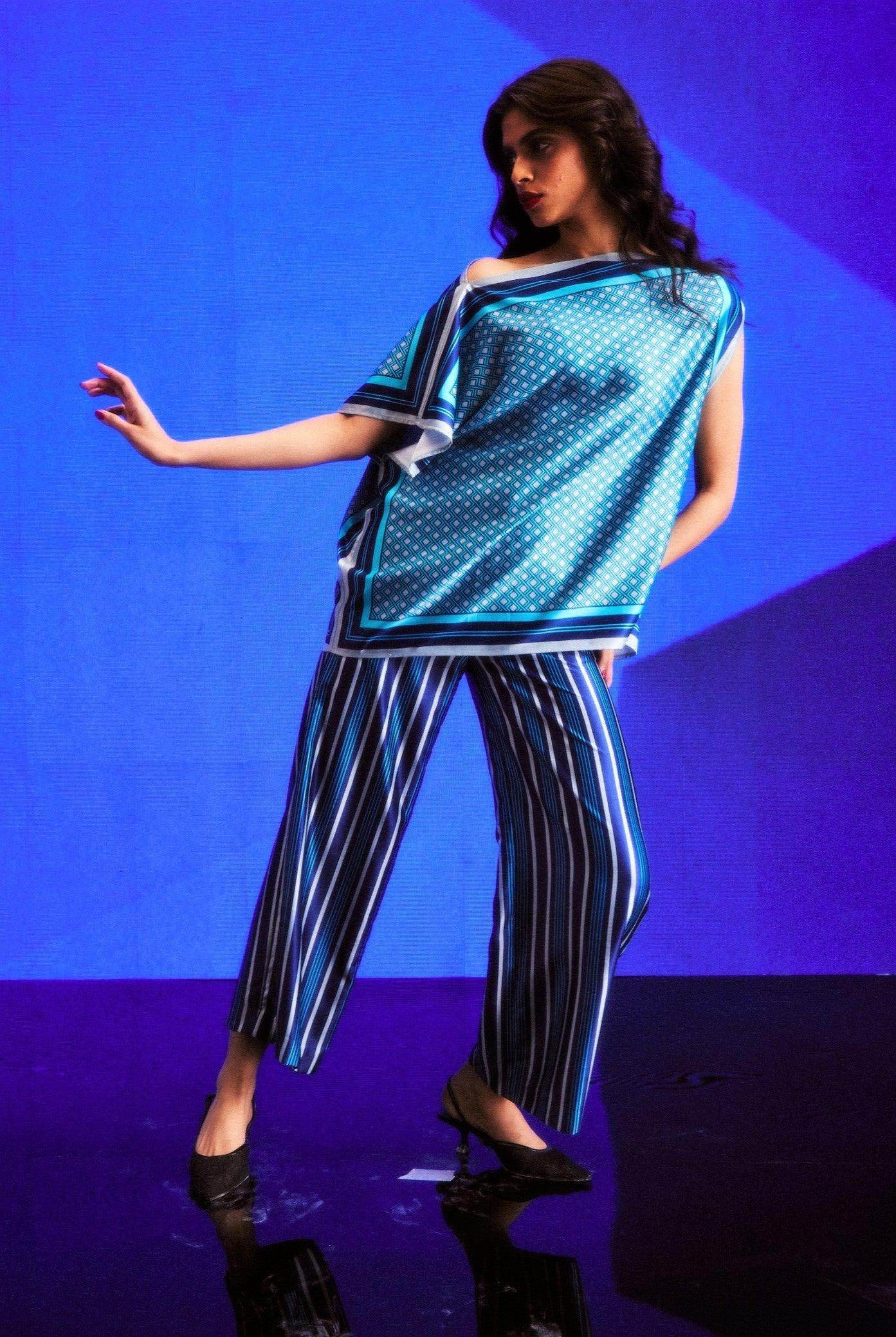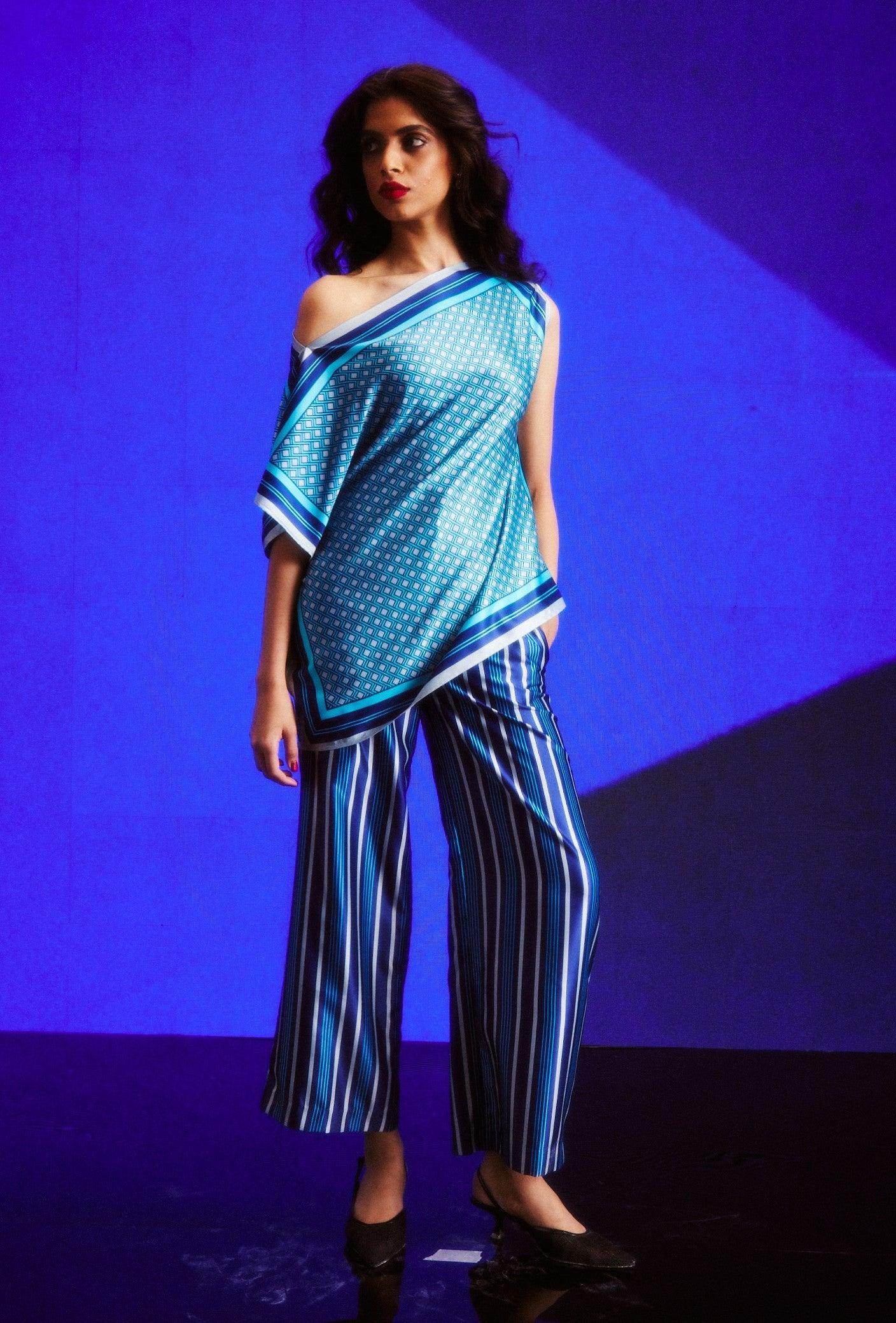 Geometric-printed top in shades of blue and grey with contrasting placed borders outlining the top. Kaftan-style details and can be worn two ways - as a one-shoulder scarf top or off-shoulder. Paired with complementing printed stripe straight pants. Semi-elasticated at the waist, pockets on the side. Hook and eye closure at the front, zip fly.