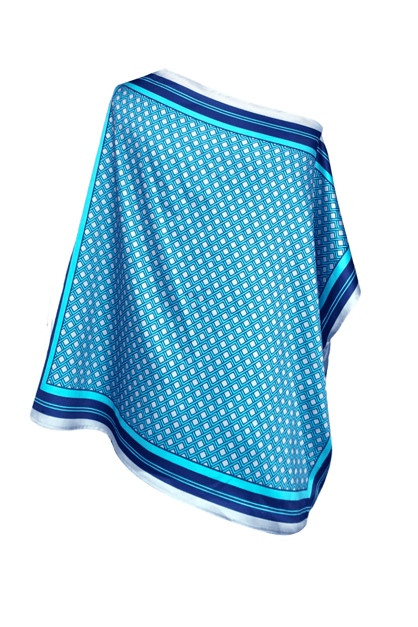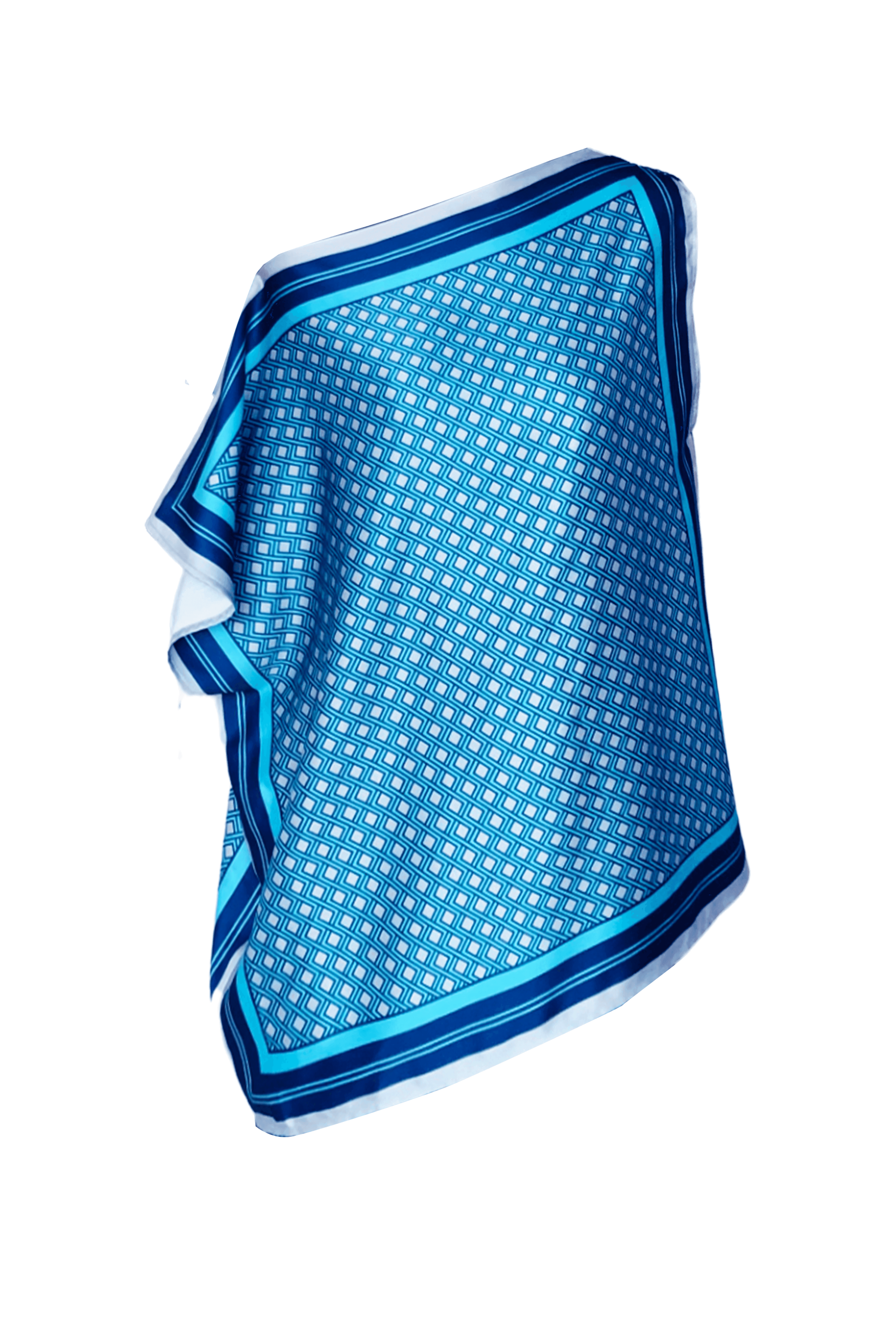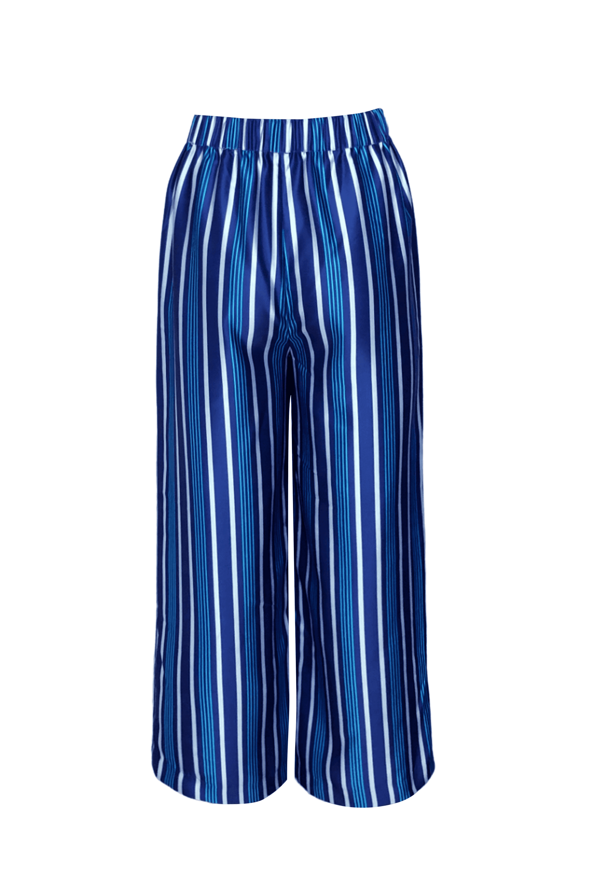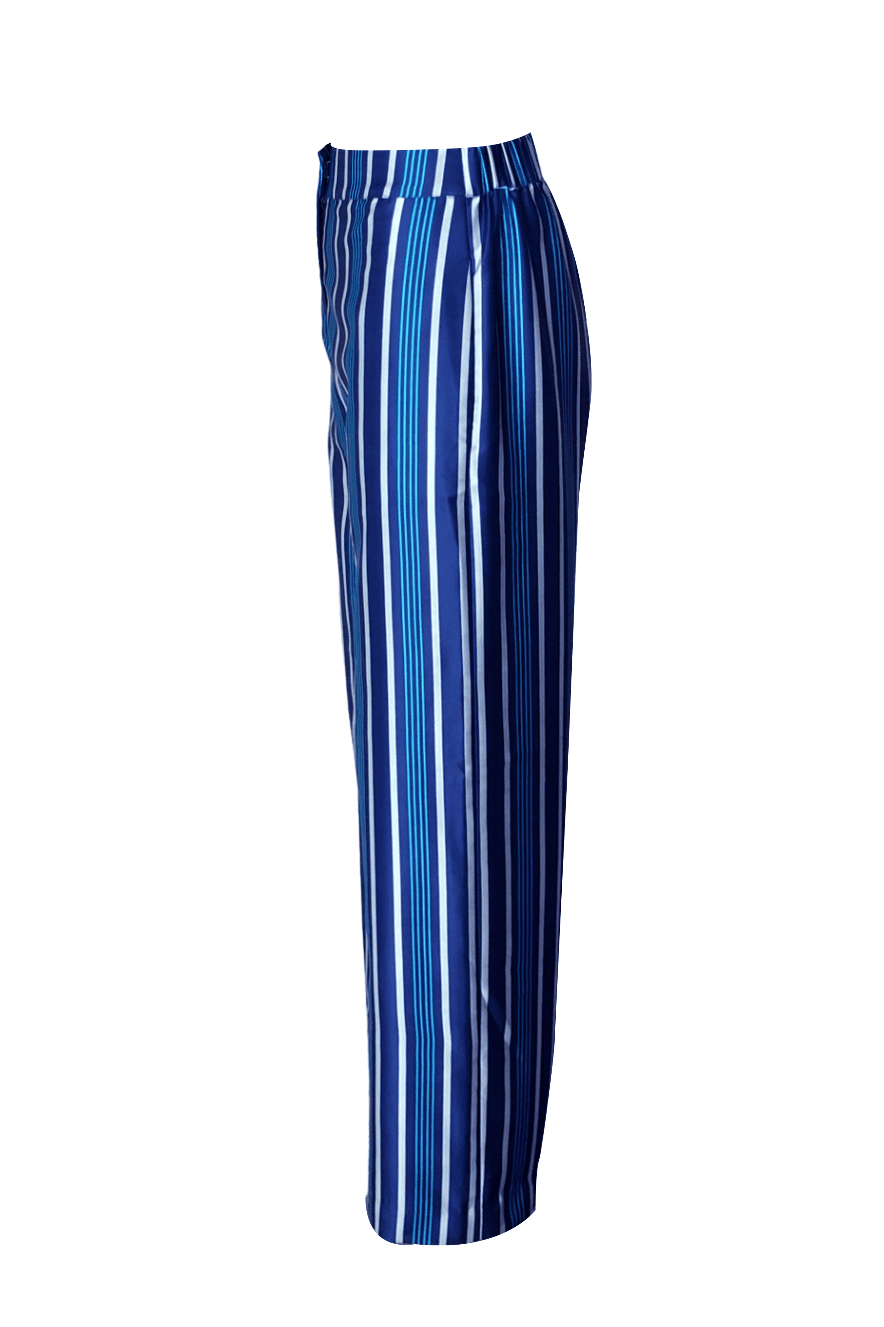 Geometric-printed top in shades of blue and grey with contrasting placed borders outlining the top. Kaftan-style details and can be worn two ways - as a one-shoulder scarf top or off-shoulder. Paired with complementing printed stripe straight pants. Semi-elasticated at the waist, pockets on the side. Hook and eye closure at the front, zip fly.