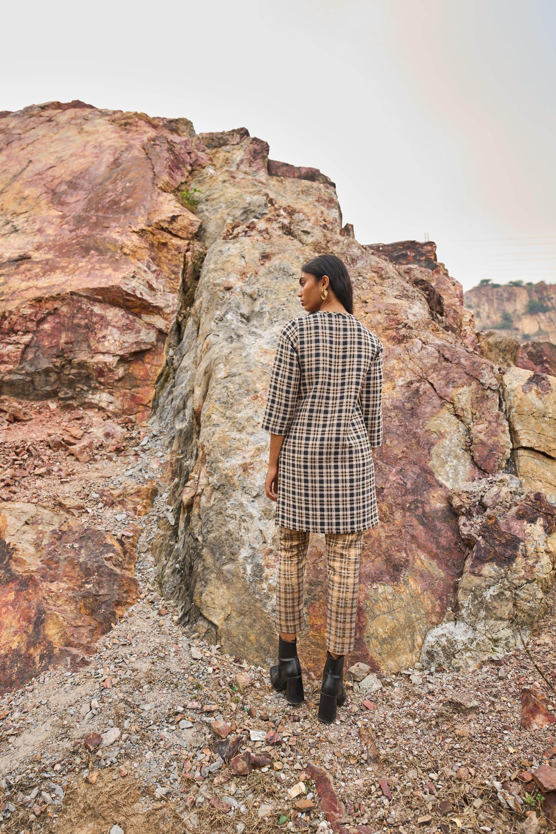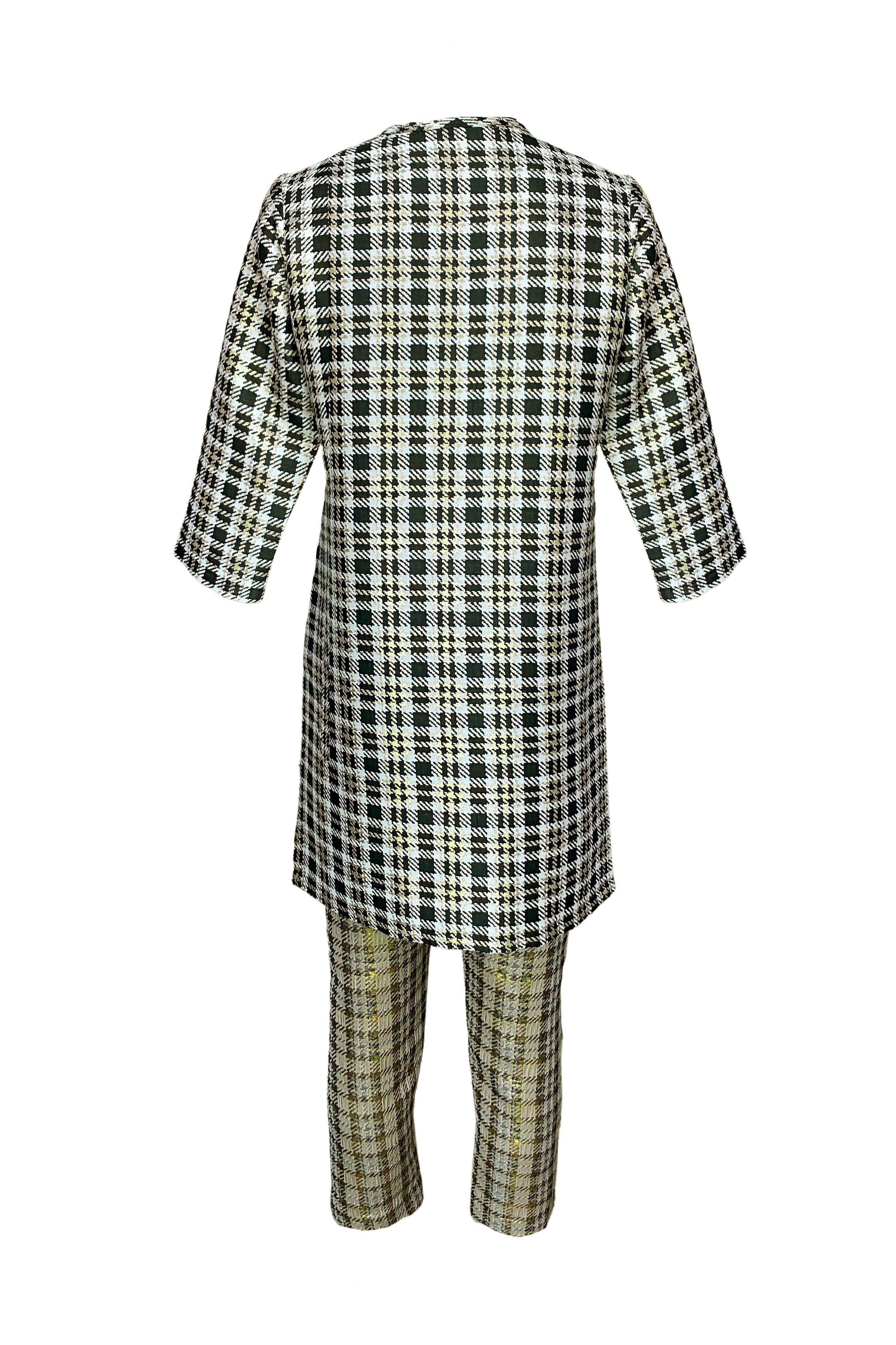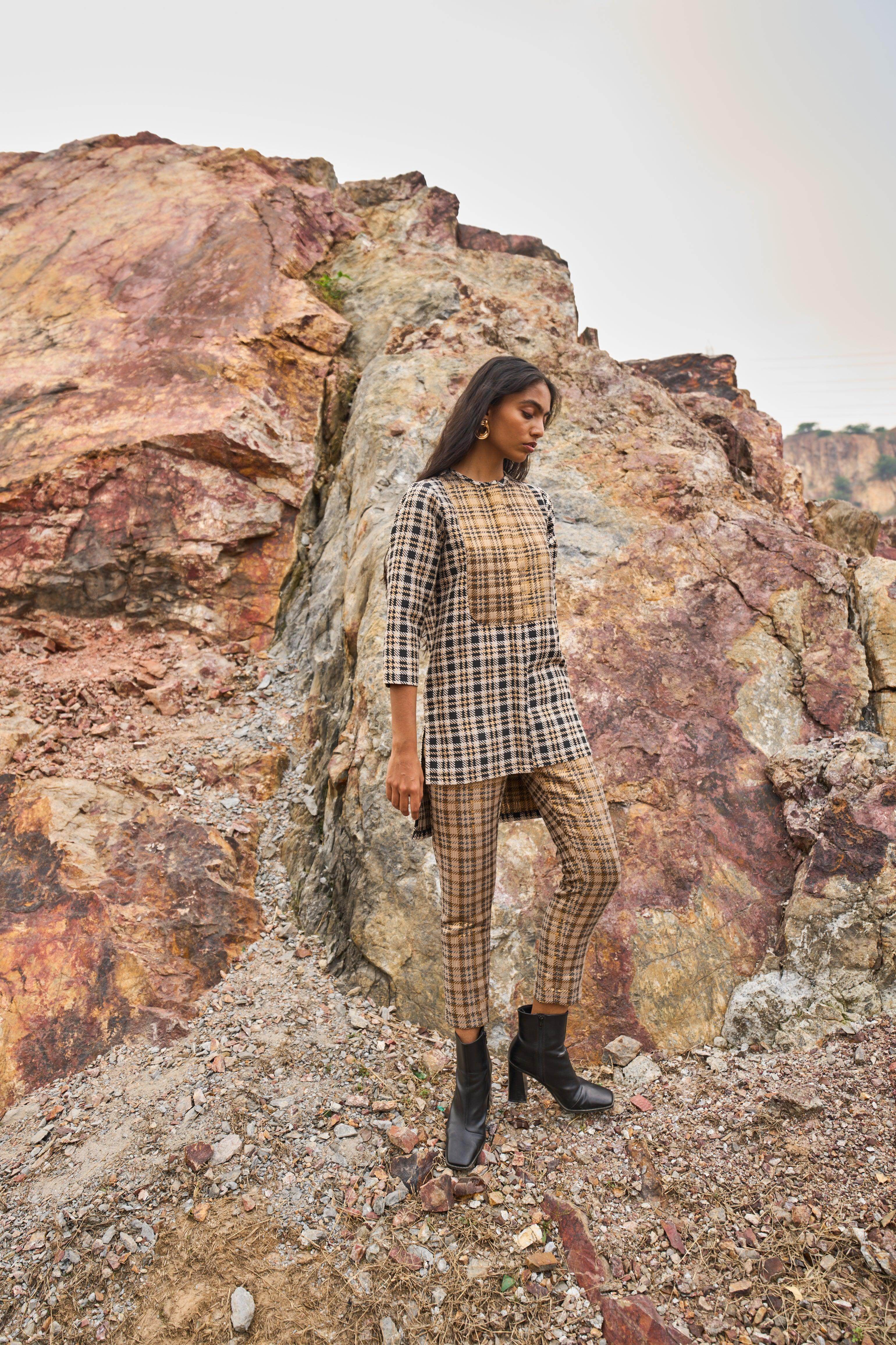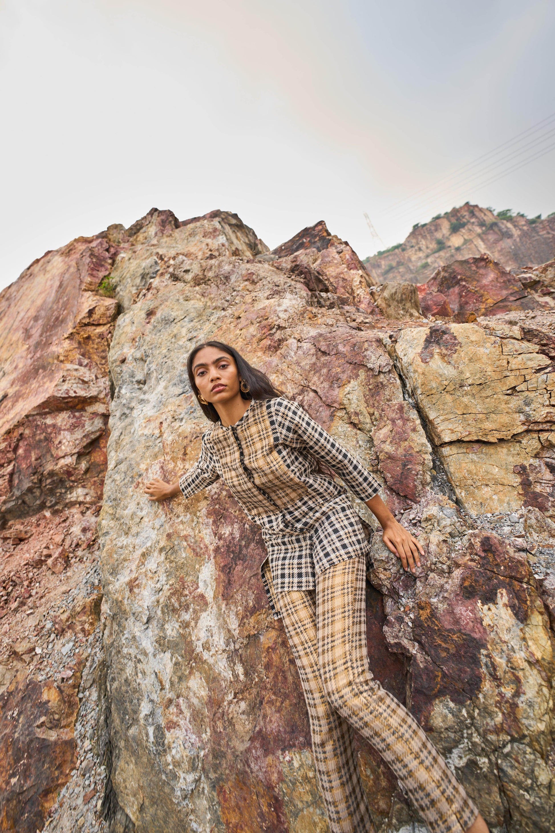 High-low houndstooth brocade pant set in dual-faced fabric. Round neck, concealed button placket. The top is made with one side of the fabric and the pants and the bib are made with the reverse side. Vent on the sides of the top. The pants have zip closure at the front and pockets on the side. Tapered fit.