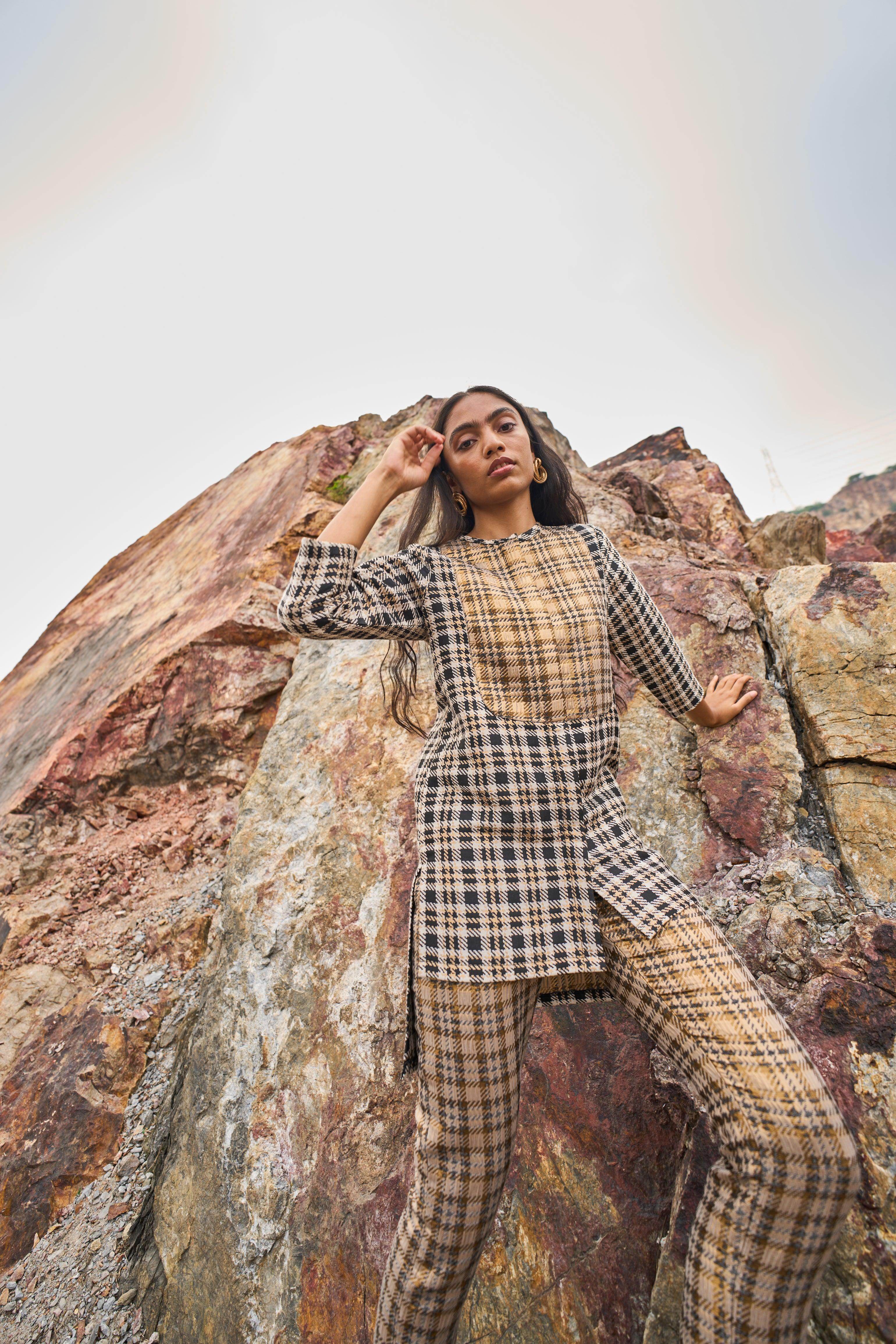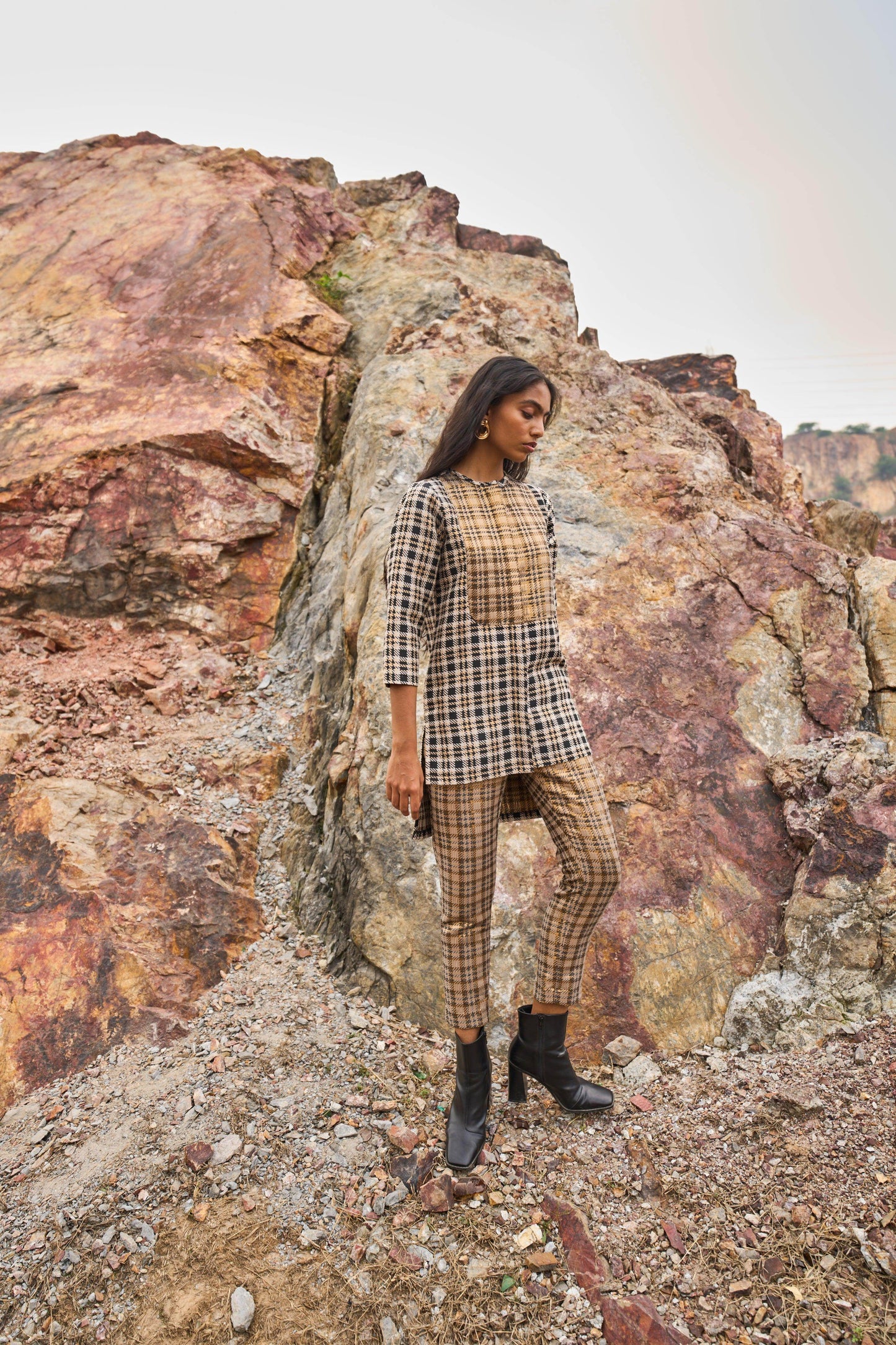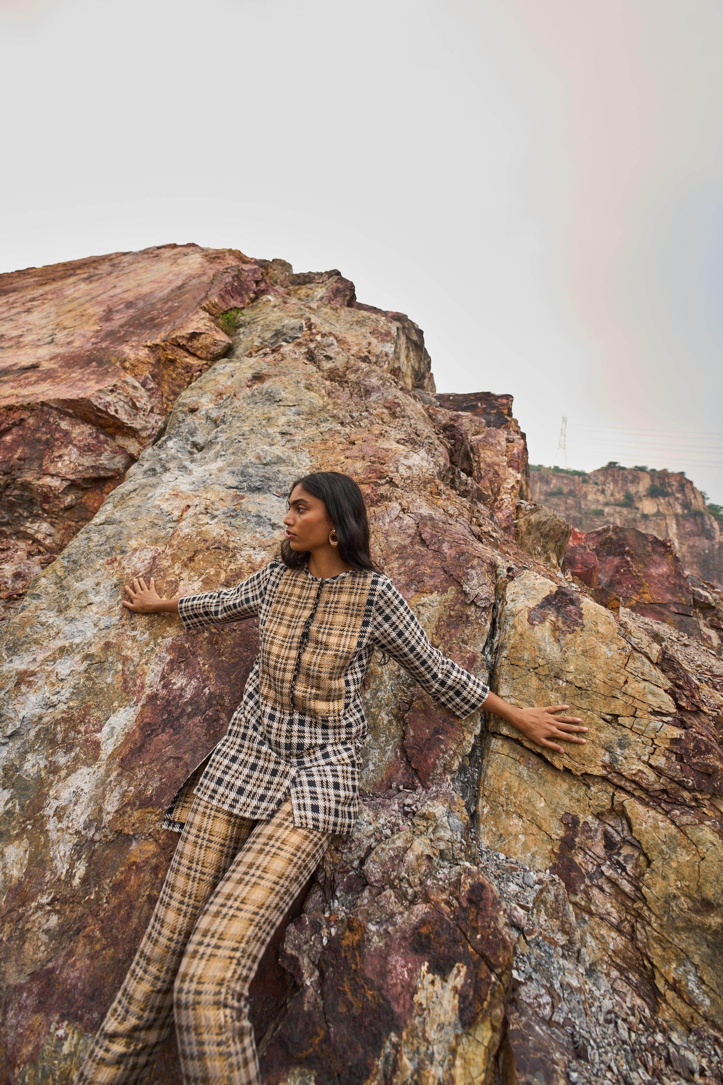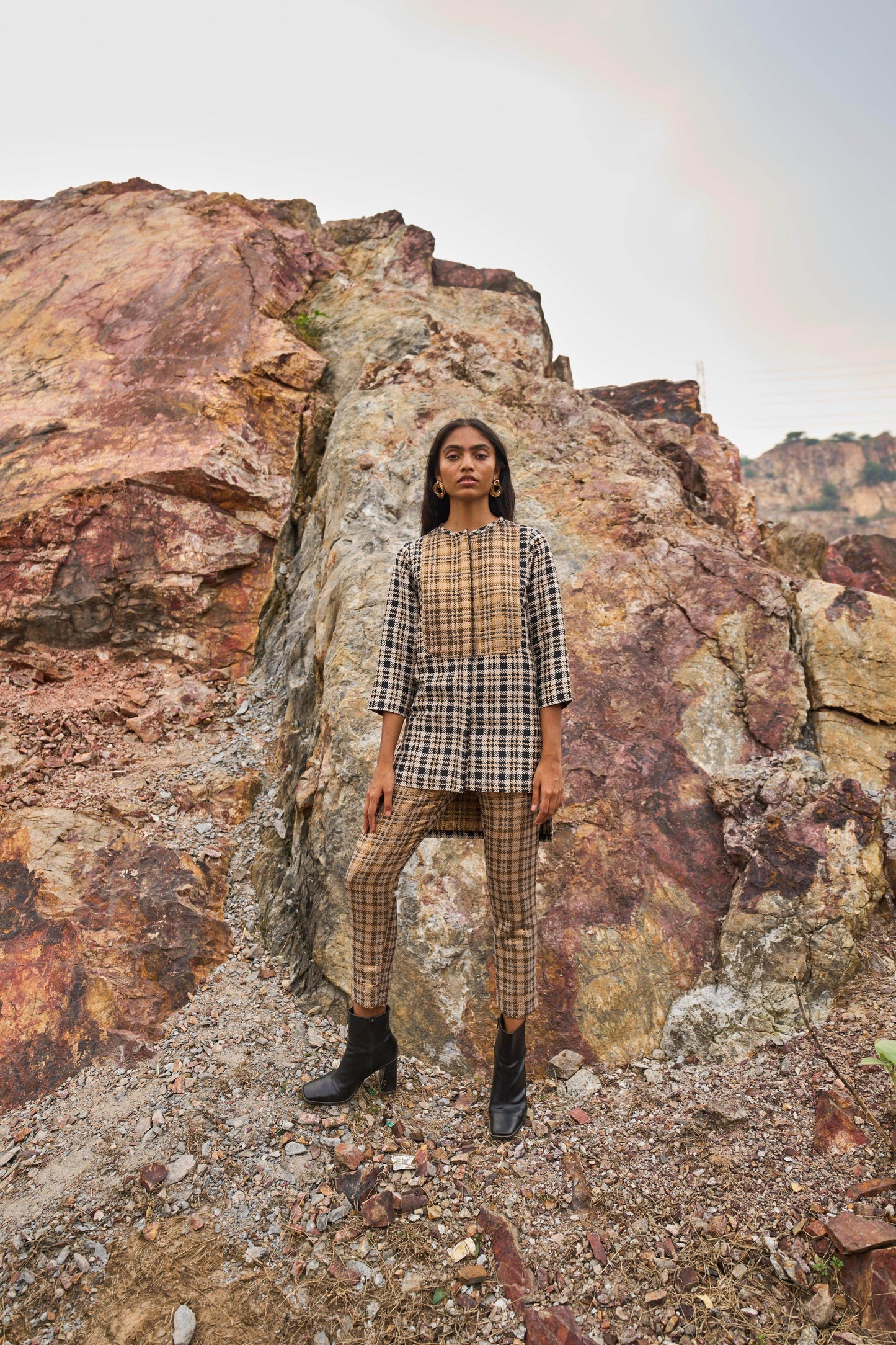 High-low houndstooth brocade pant set in dual-faced fabric. Round neck, concealed button placket. The top is made with one side of the fabric and the pants and the bib are made with the reverse side. Vent on the sides of the top. The pants have zip closure at the front and pockets on the side. Tapered fit.