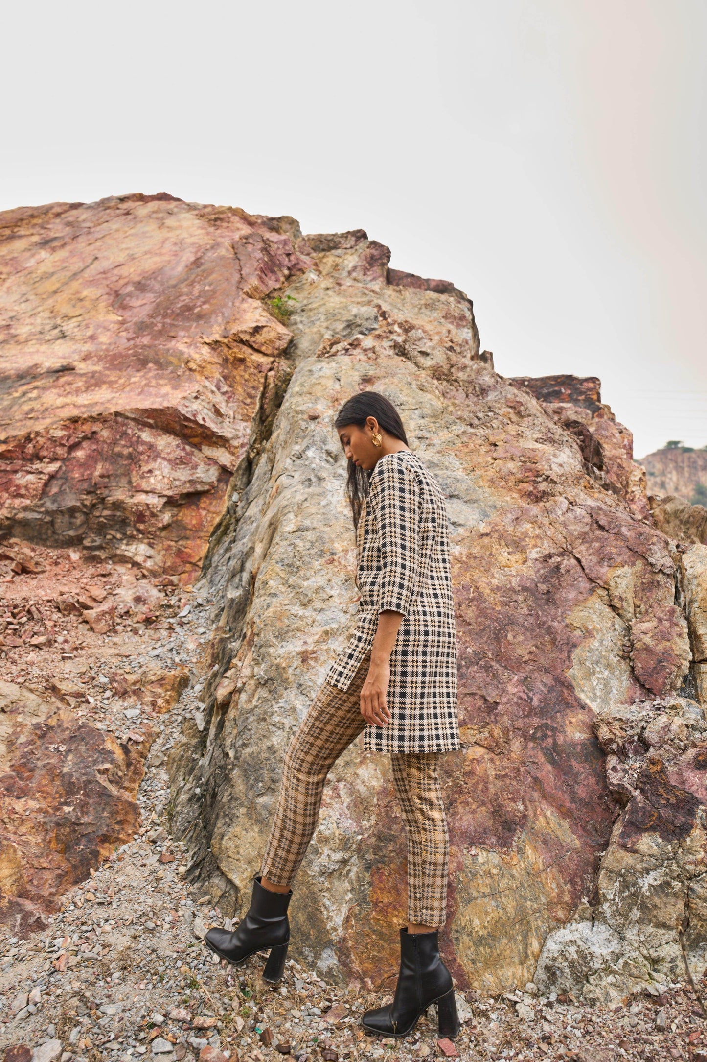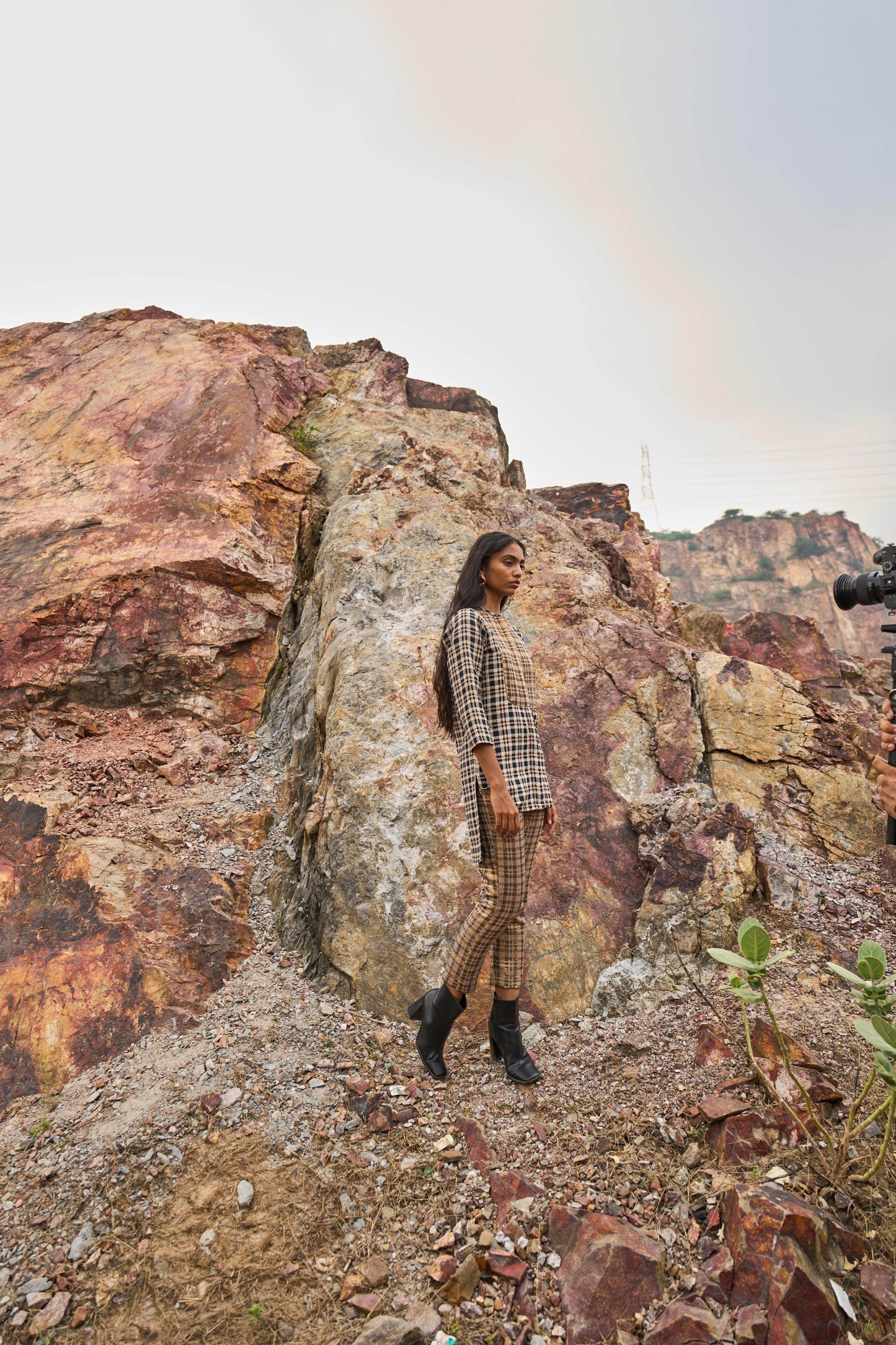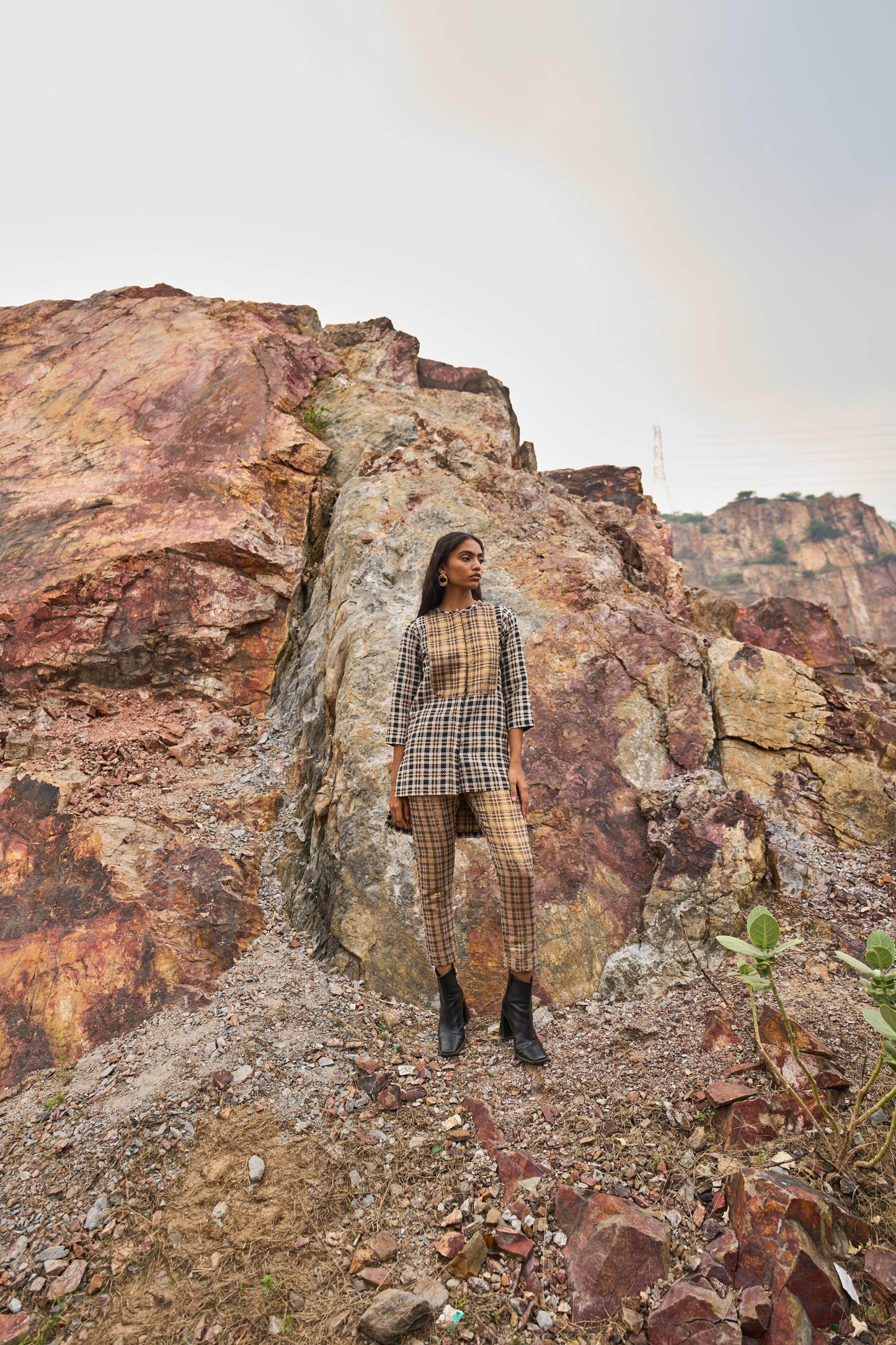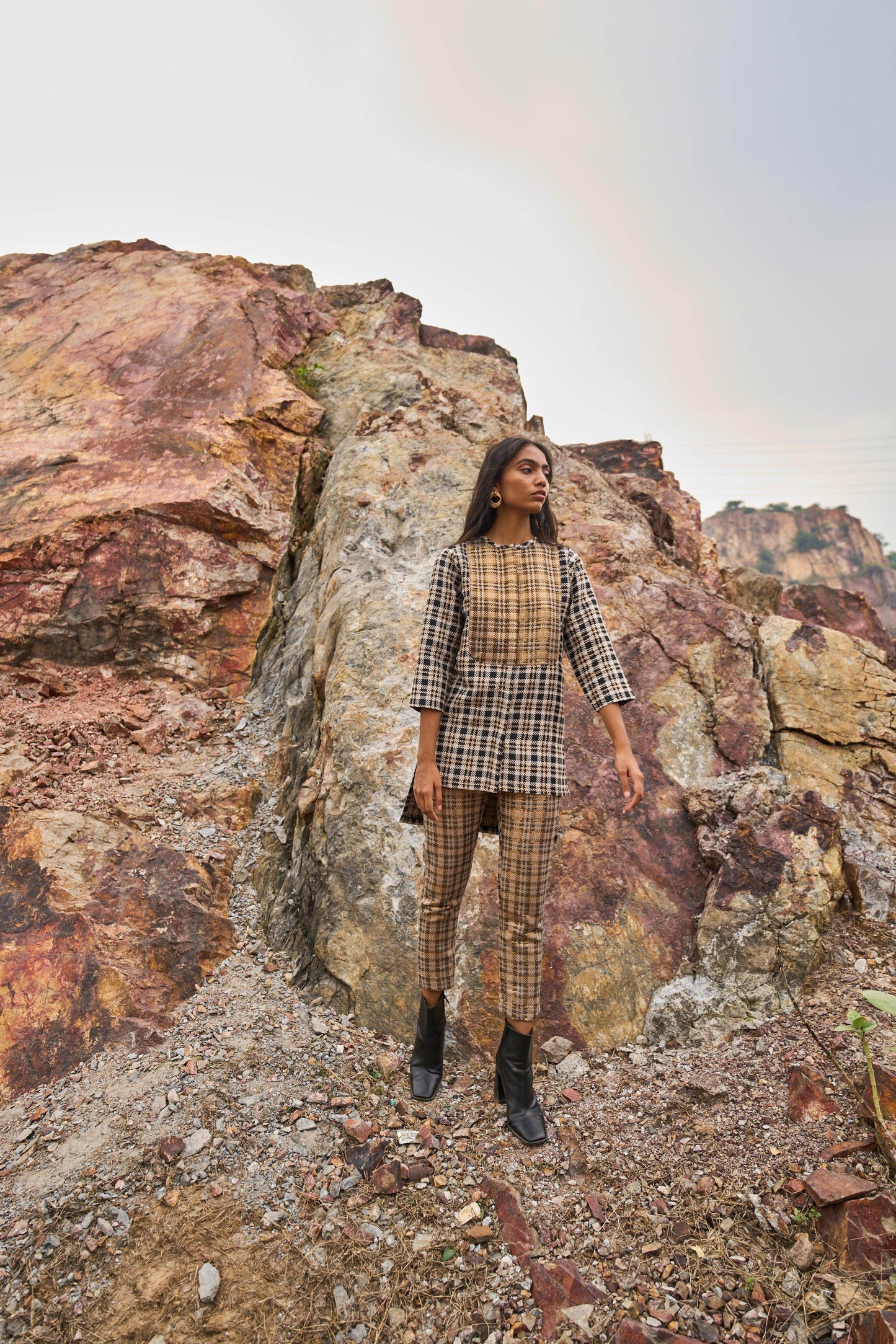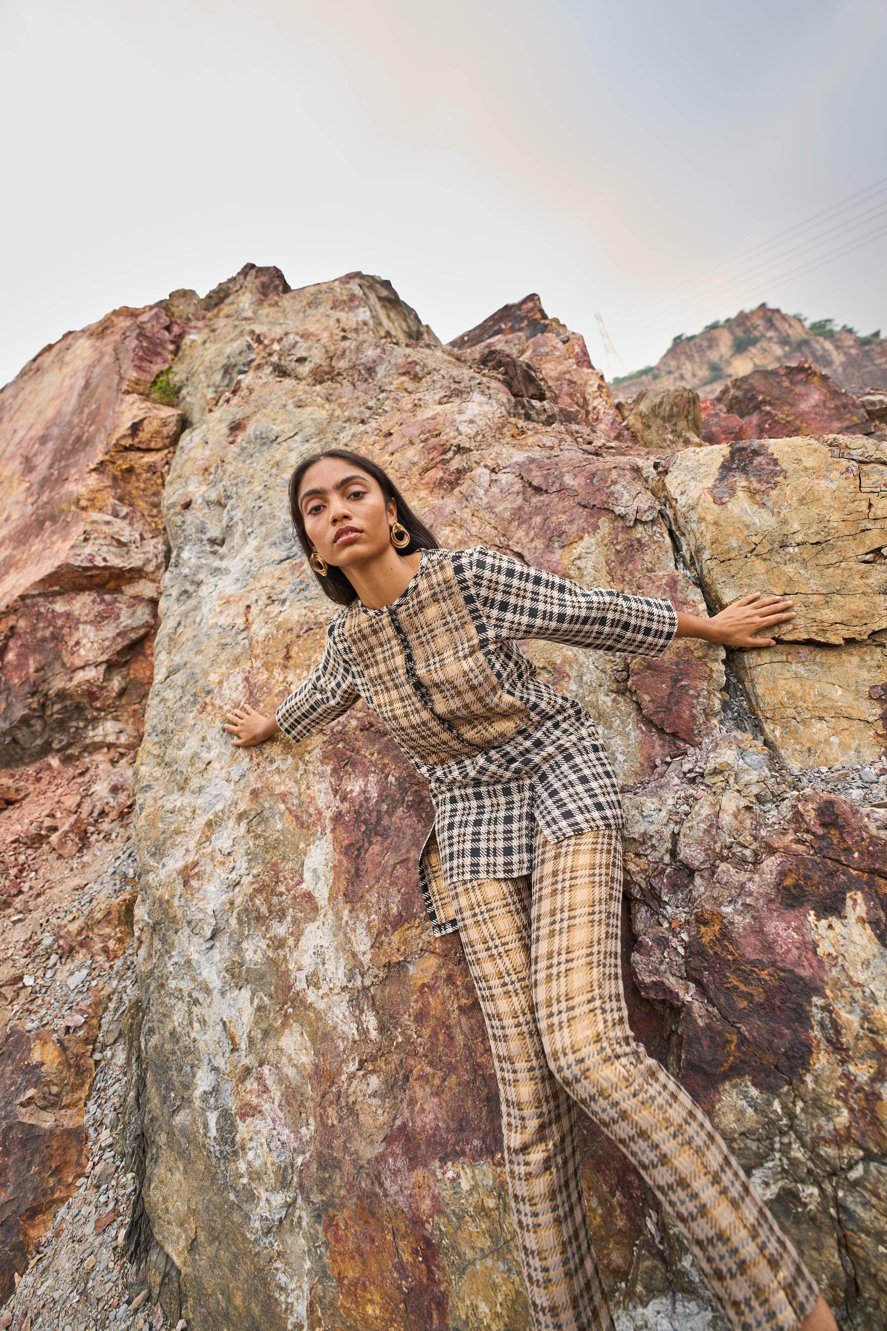 High-low houndstooth brocade pant set in dual-faced fabric. Round neck, concealed button placket. The top is made with one side of the fabric and the pants and the bib are made with the reverse side. Vent on the sides of the top. The pants have zip closure at the front and pockets on the side. Tapered fit.