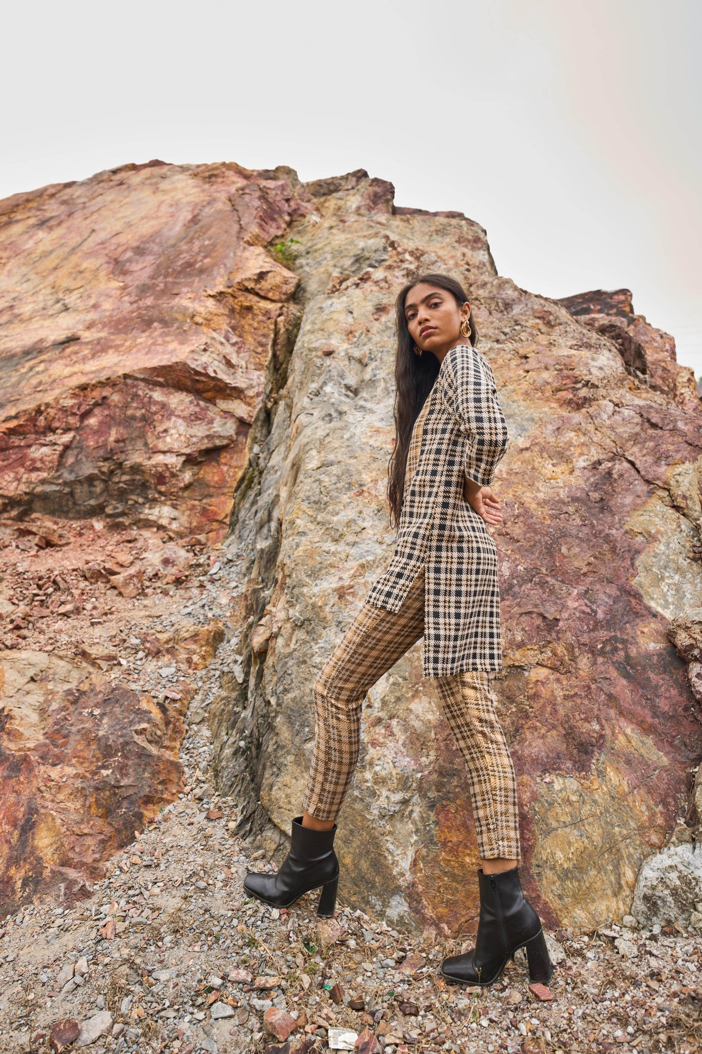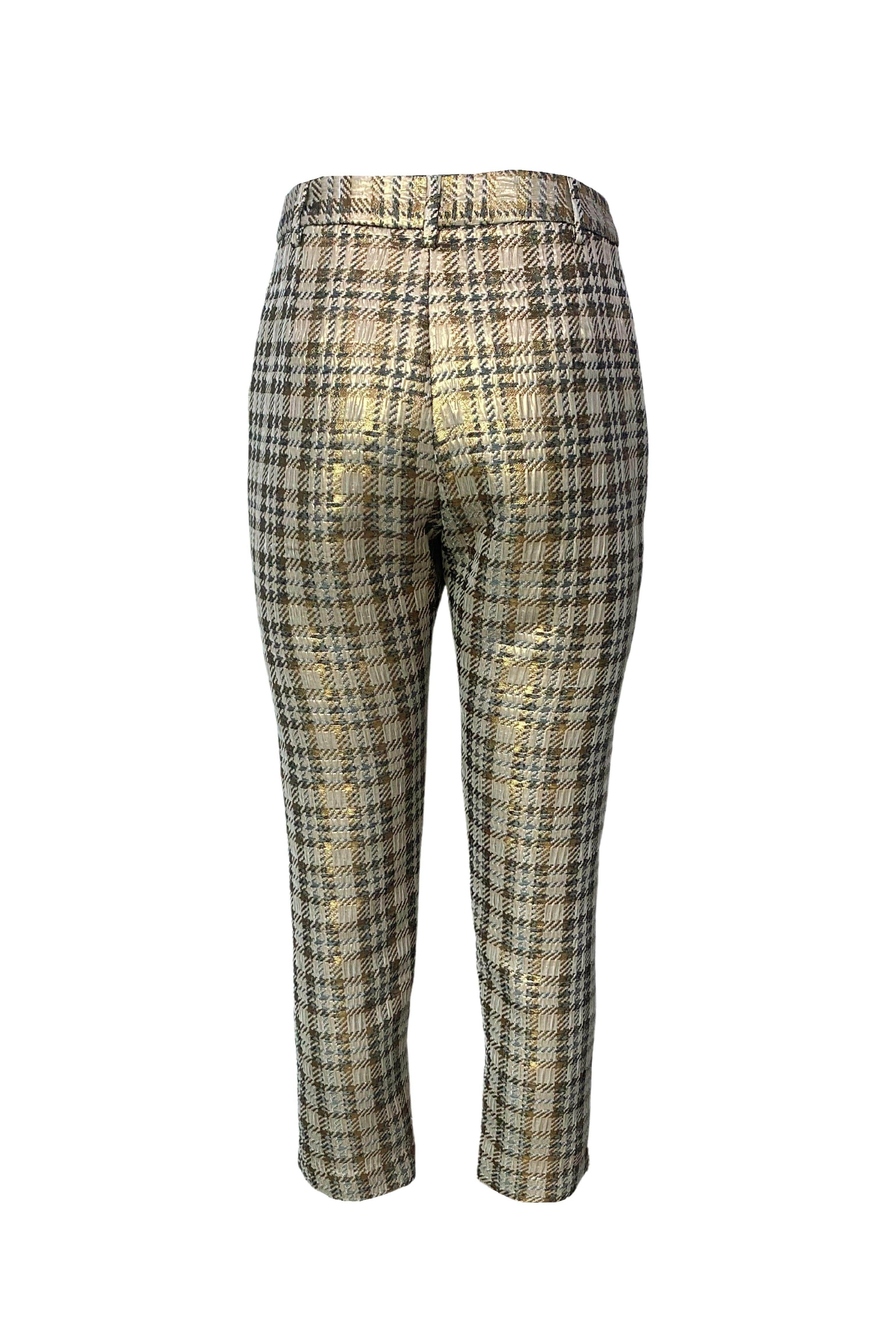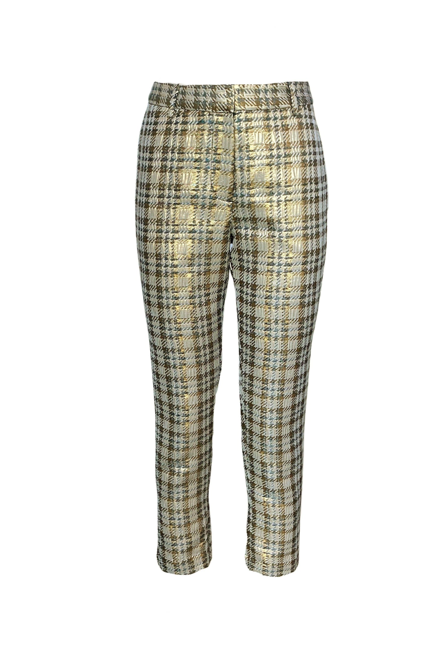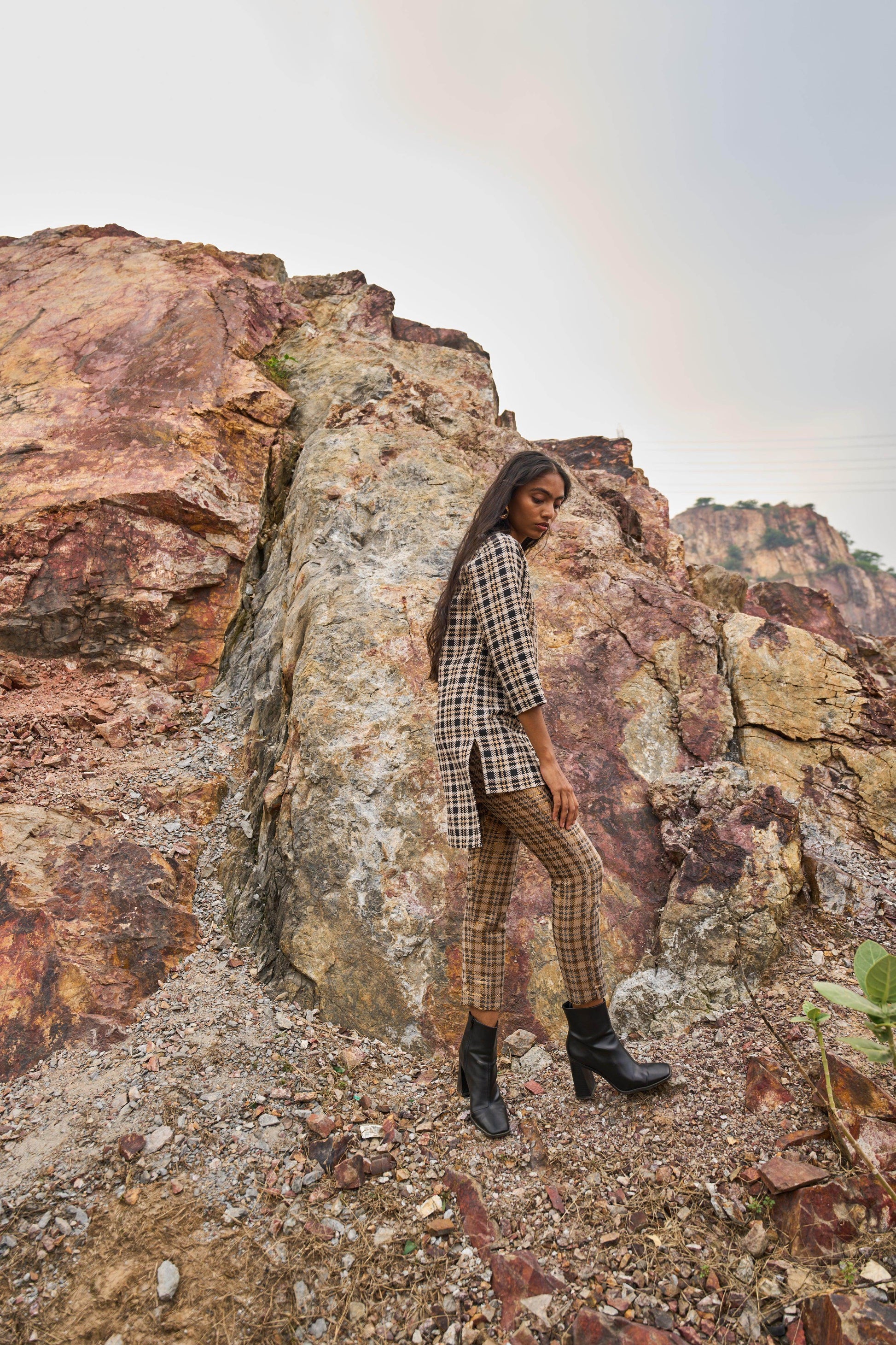 High-low houndstooth brocade pant set in dual-faced fabric. Round neck, concealed button placket. The top is made with one side of the fabric and the pants and the bib are made with the reverse side. Vent on the sides of the top. The pants have zip closure at the front and pockets on the side. Tapered fit.