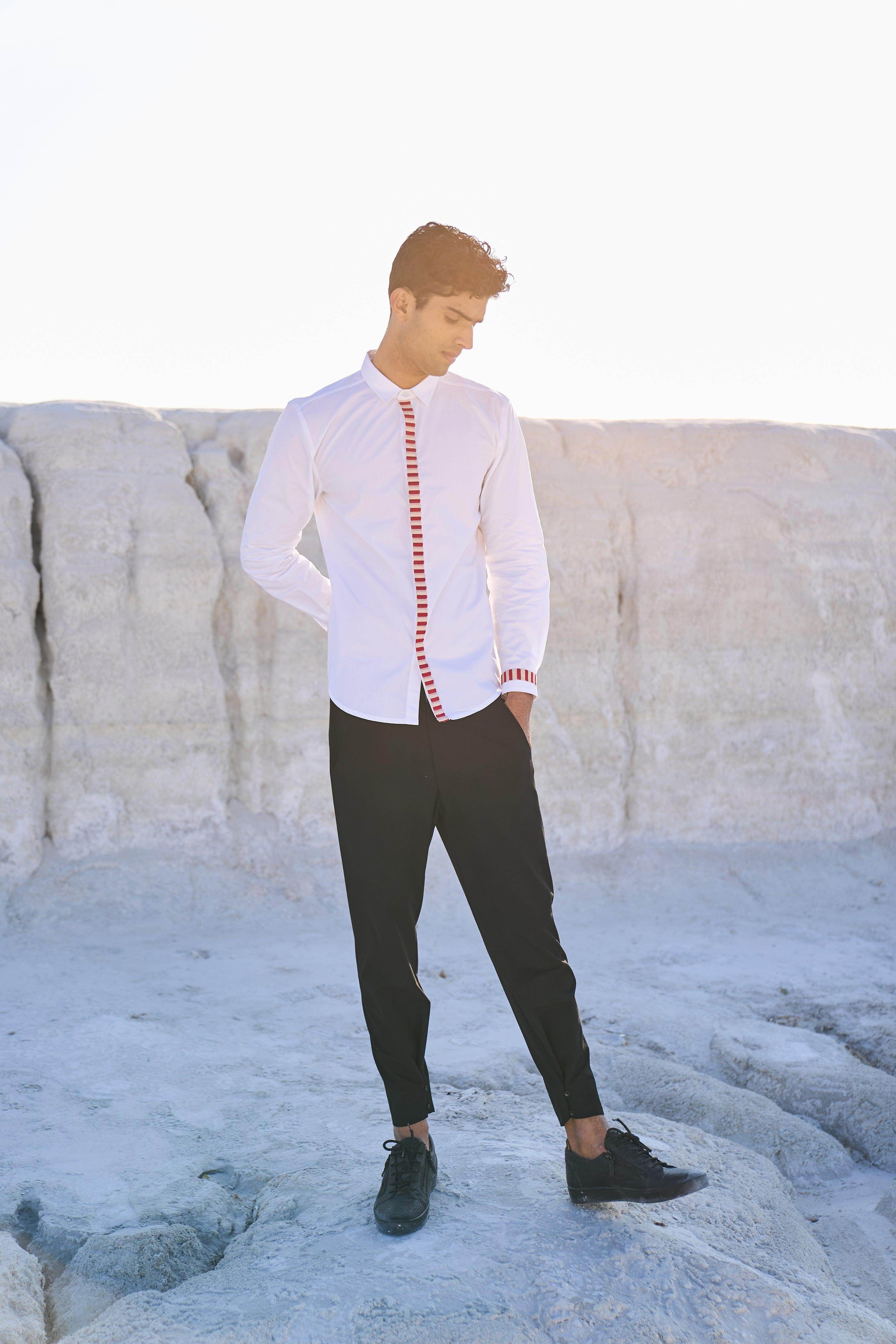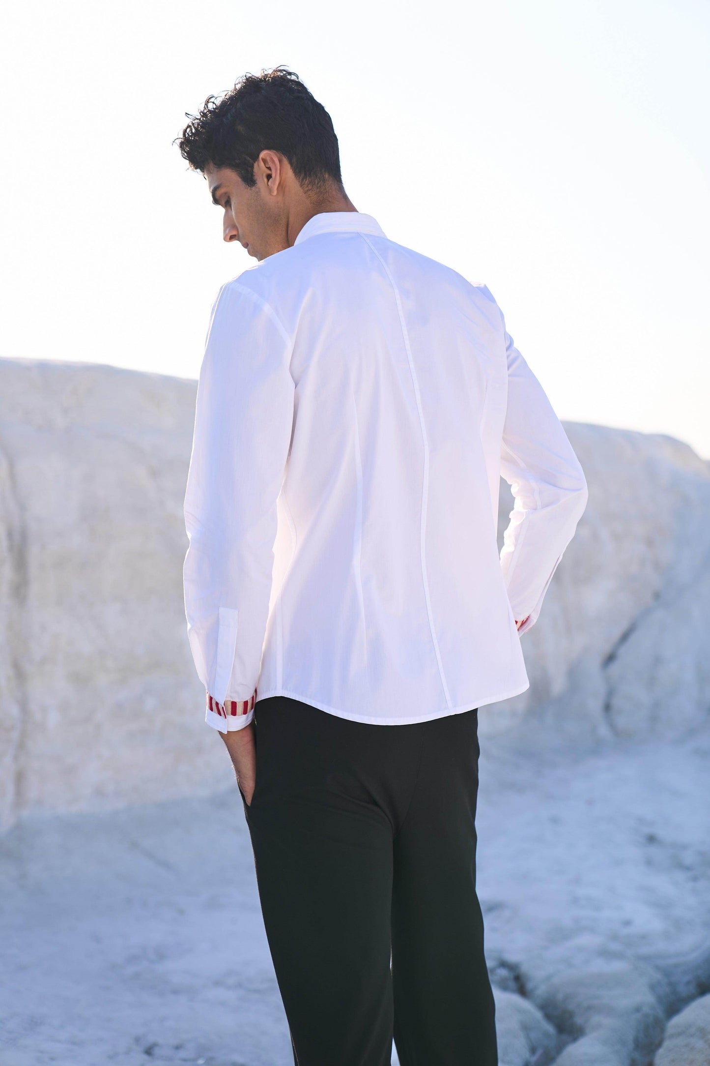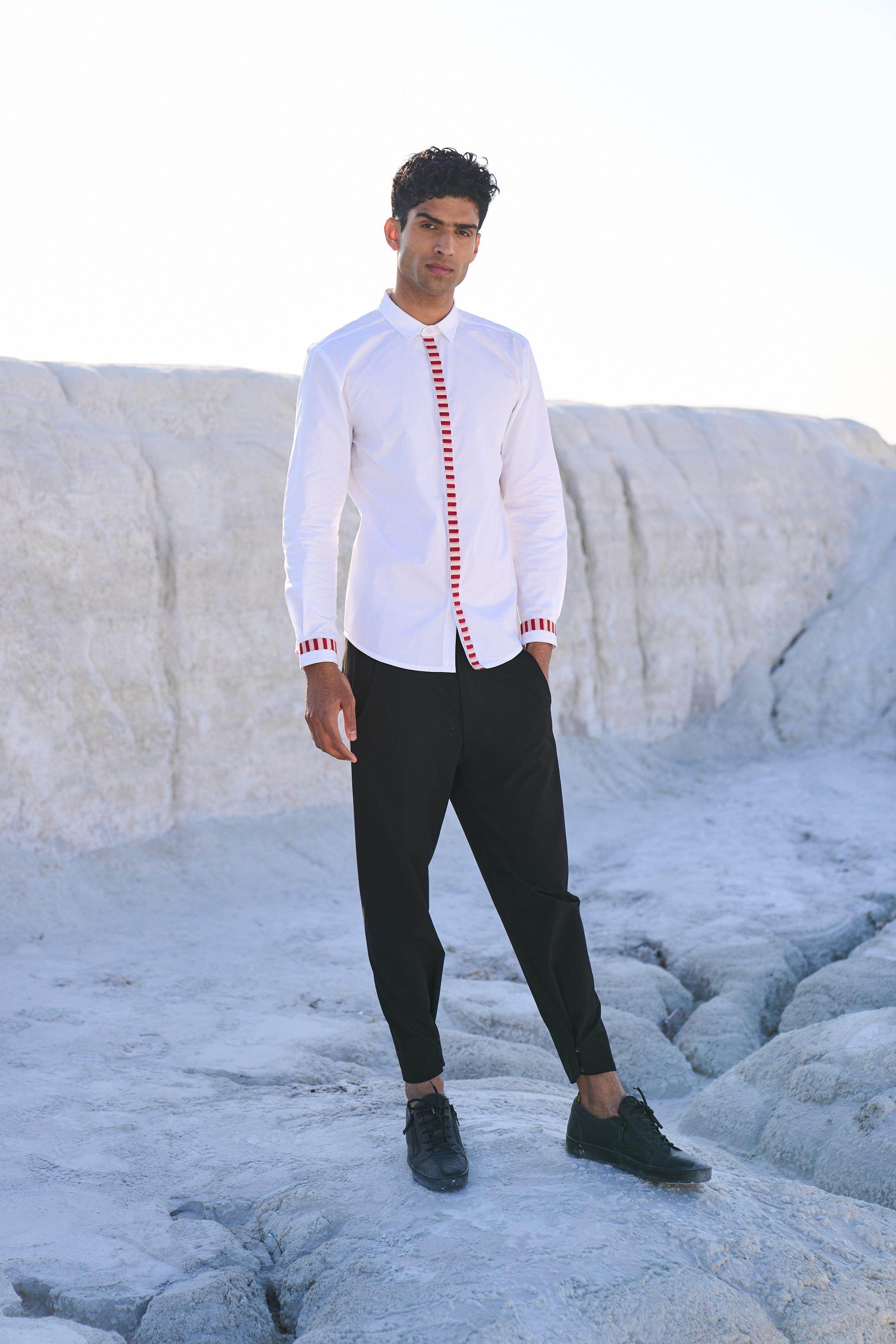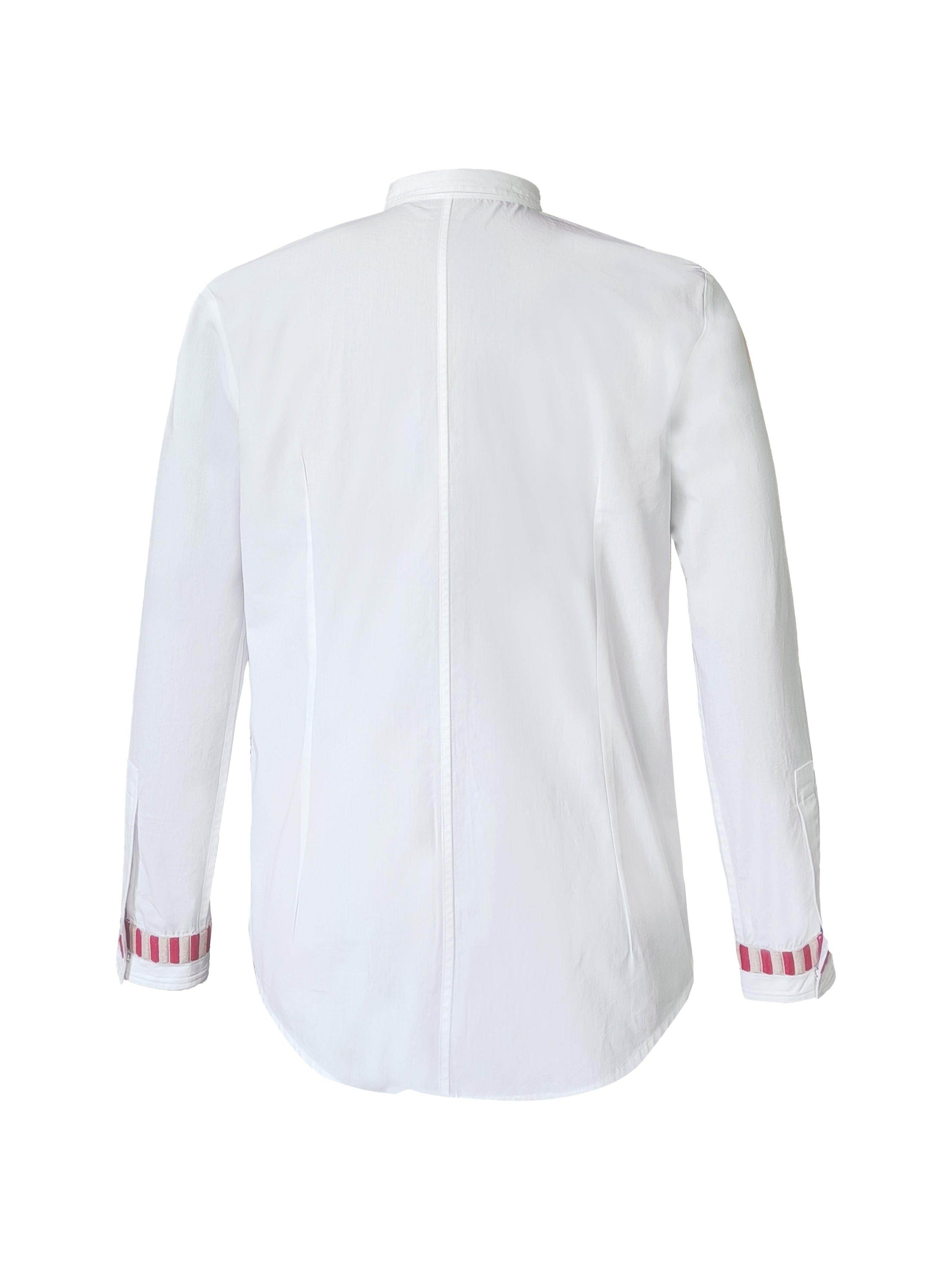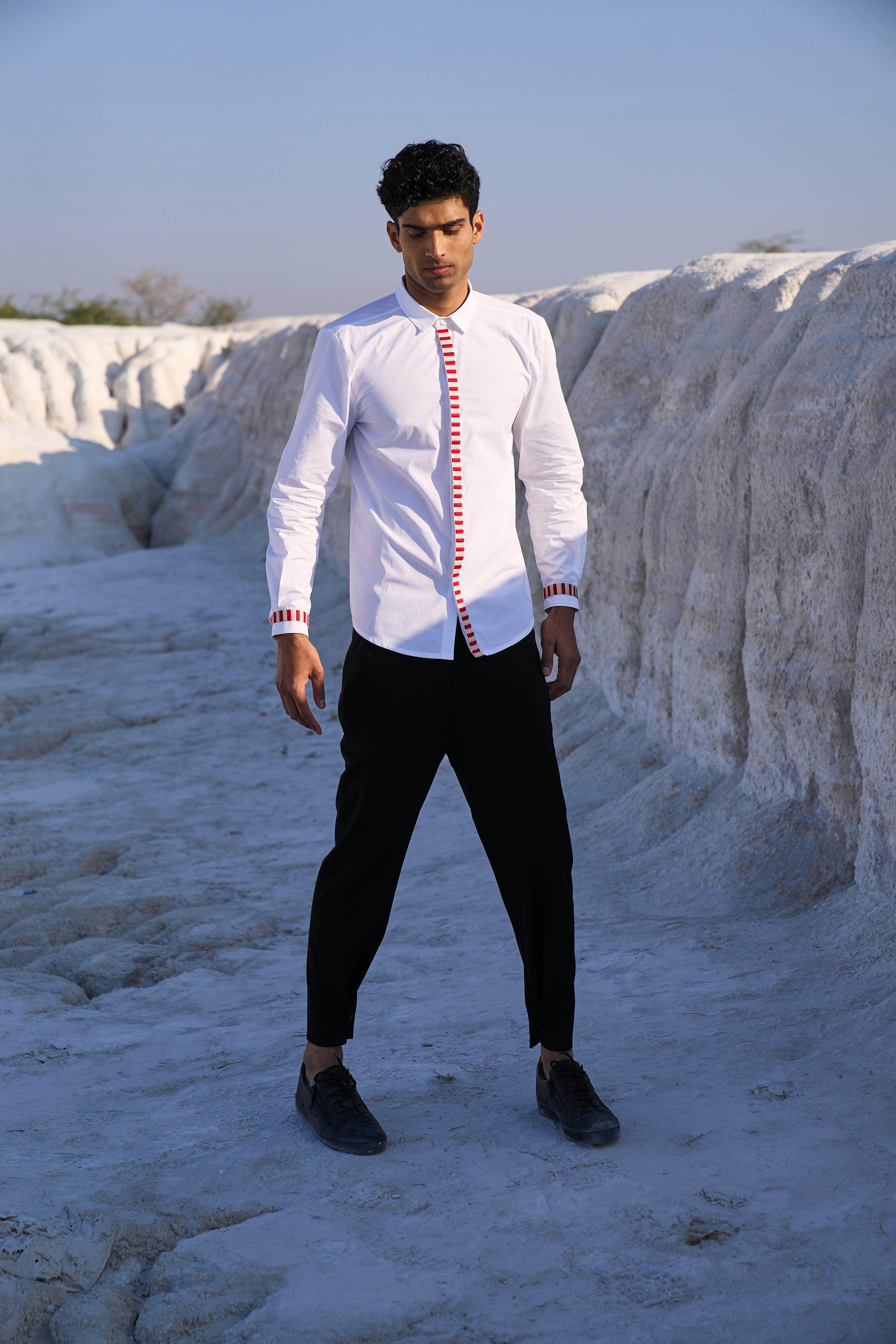 White regular fit shirt with candy stripe inspired tape running down the front placket and the cuffs. Concealed button placket, full sleeves. Regular fit.