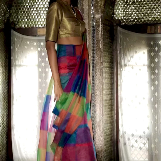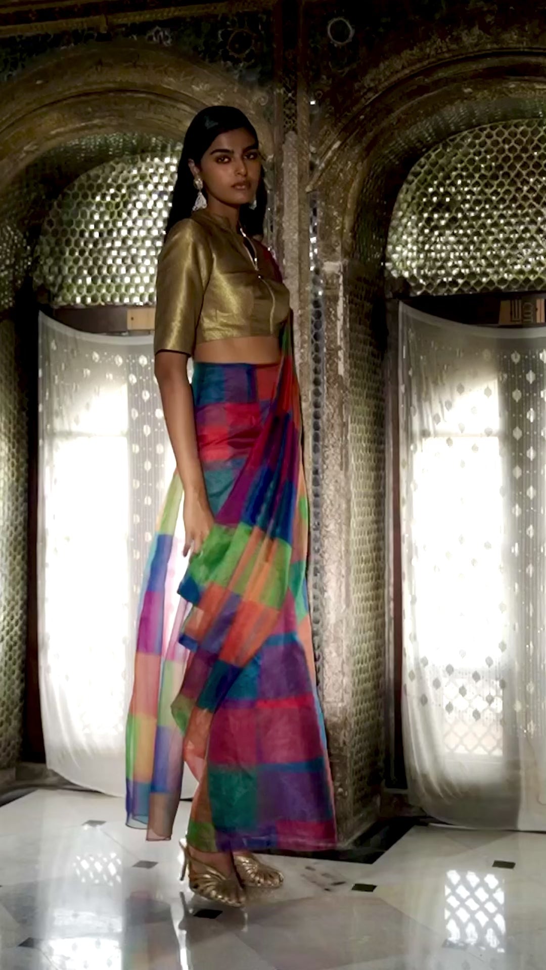 Soft organza maxi skirt in bright multicolour checks. Draped straight cut with hand-applied pleats and a free-flowing panel at the waist, mimicking a sari drape. Concealed side zip closure. Garment is fully lined.