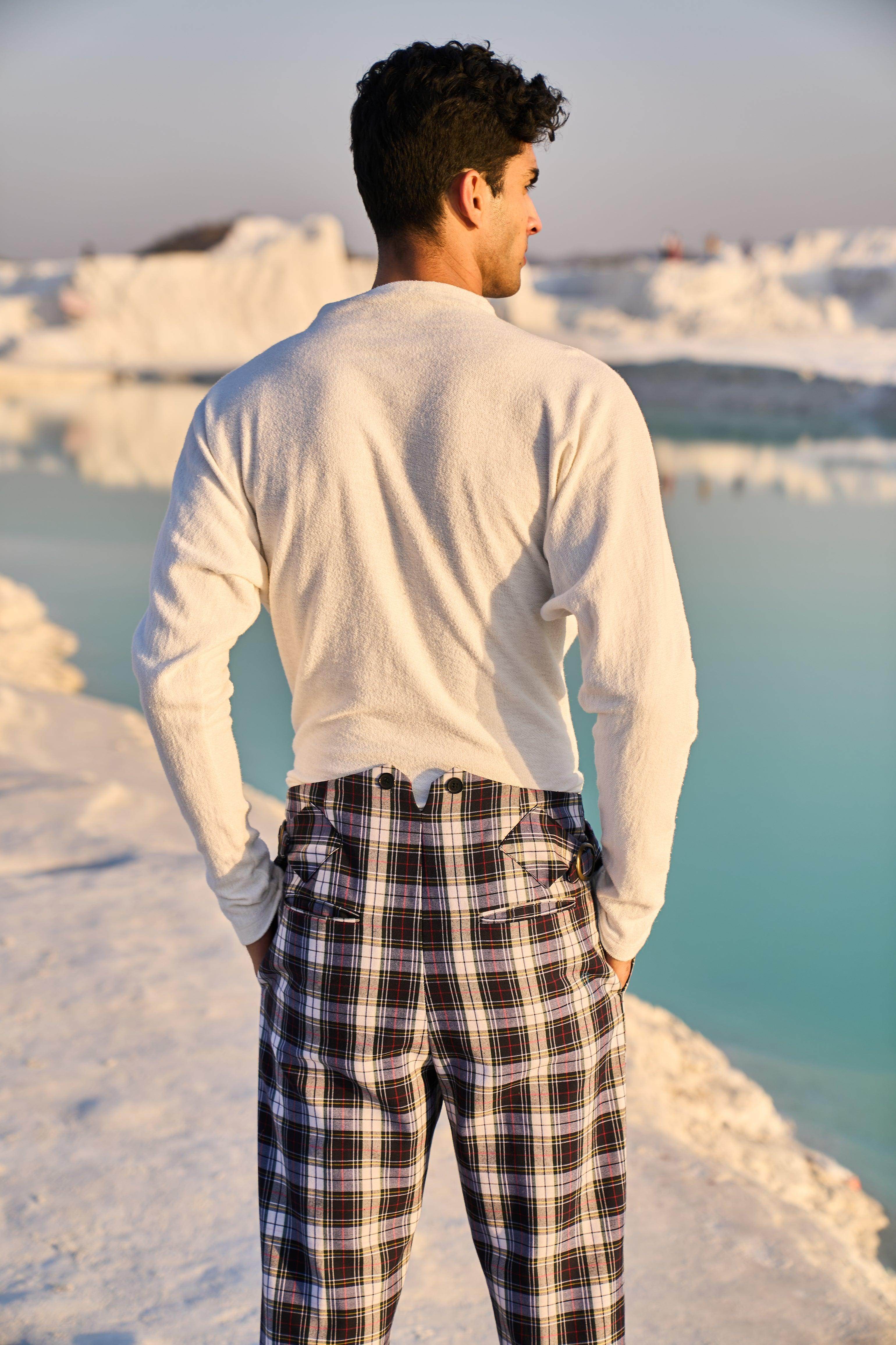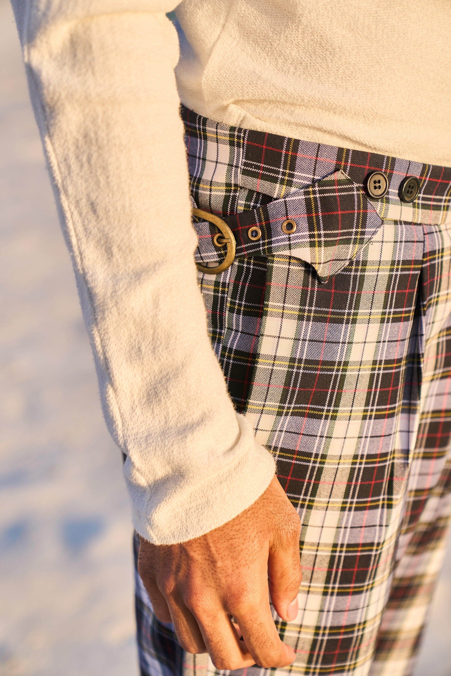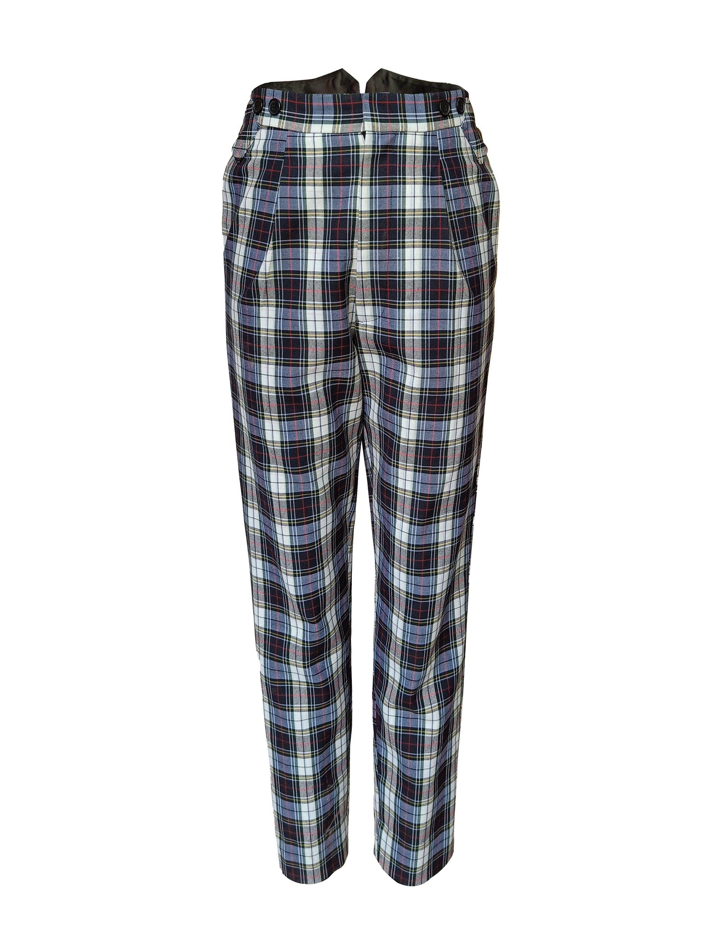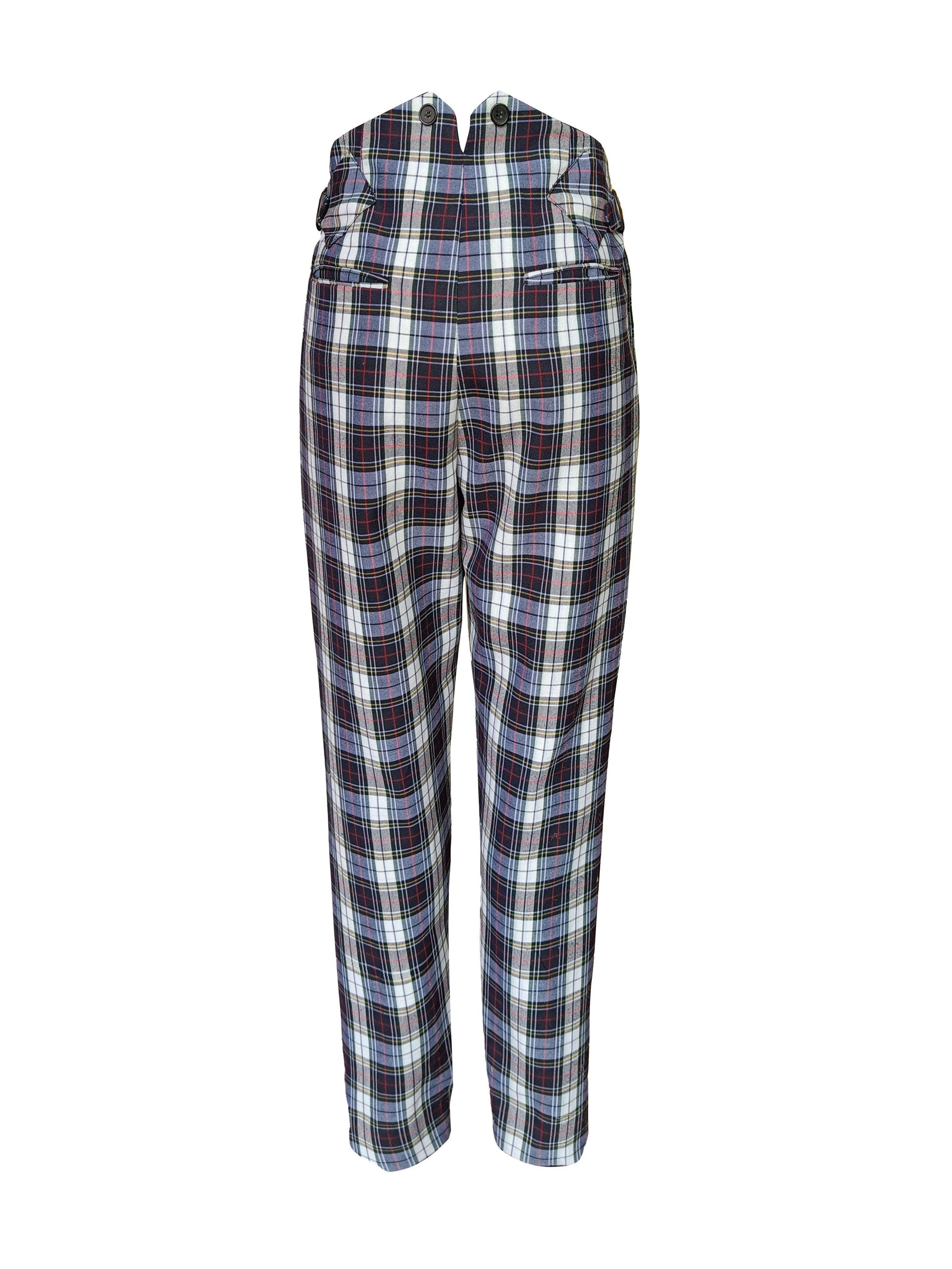 Checked pants with victorian notch shaped back. Metallic buckle detail on the side. Zip closure at the front. Pockets on the side and back.
