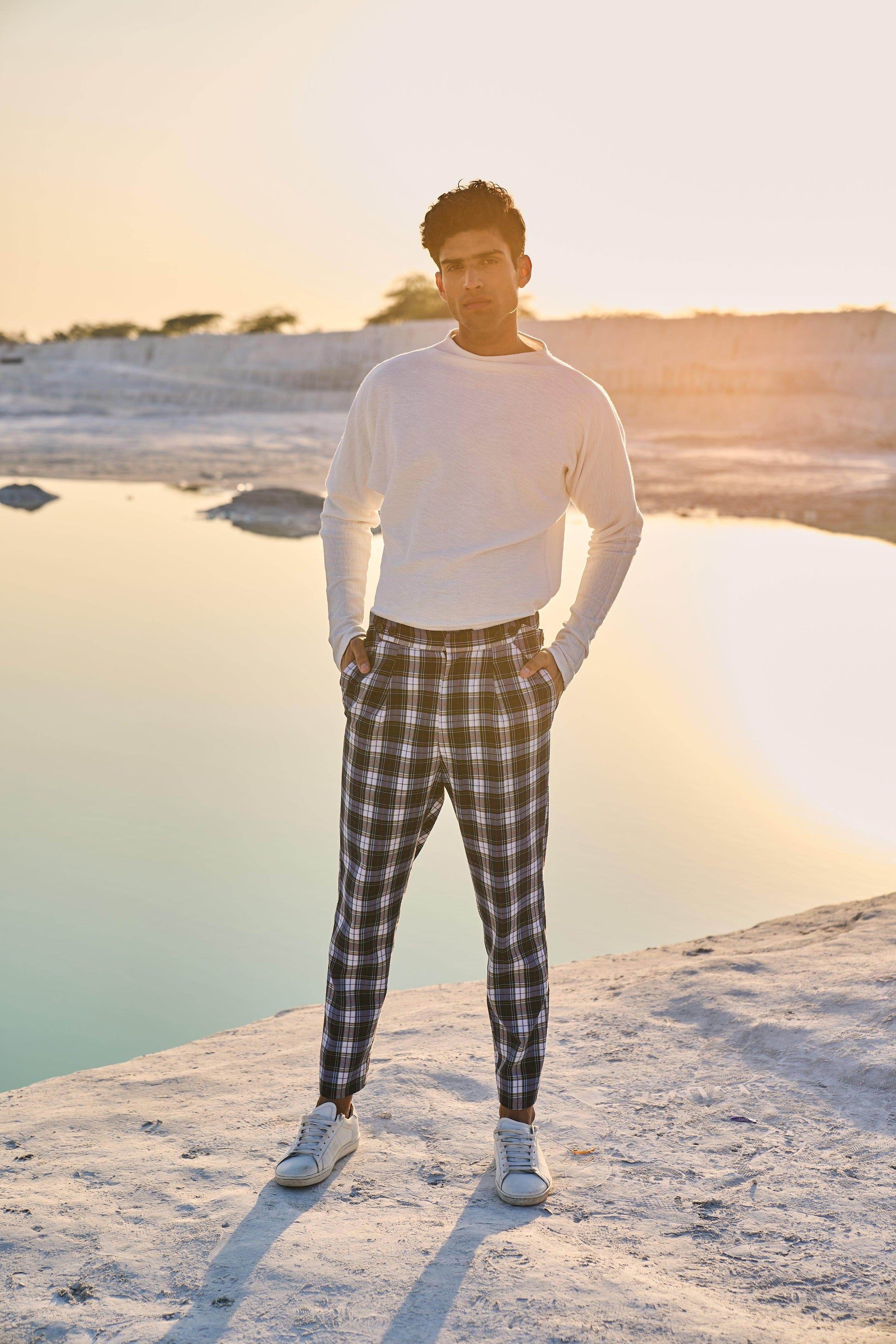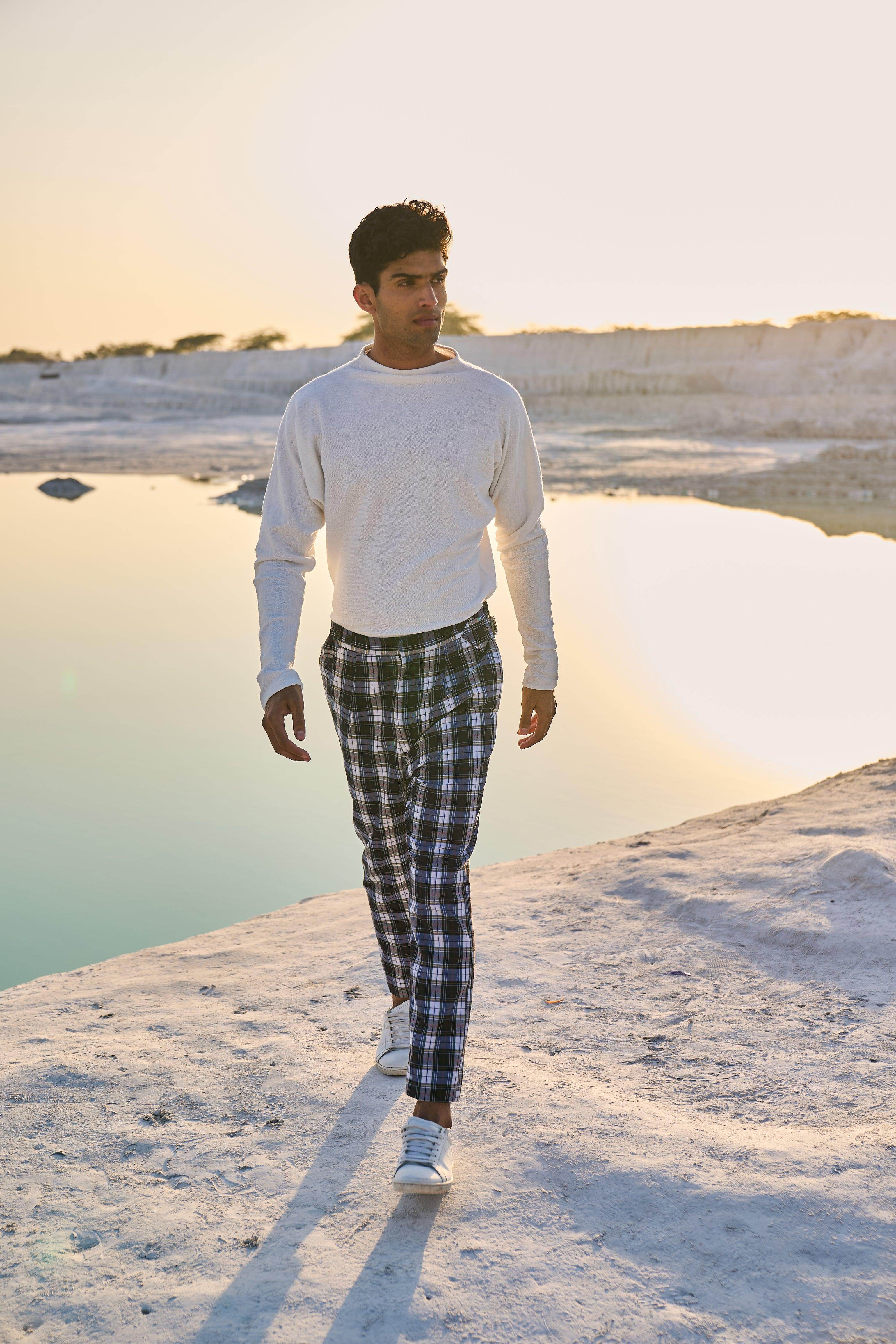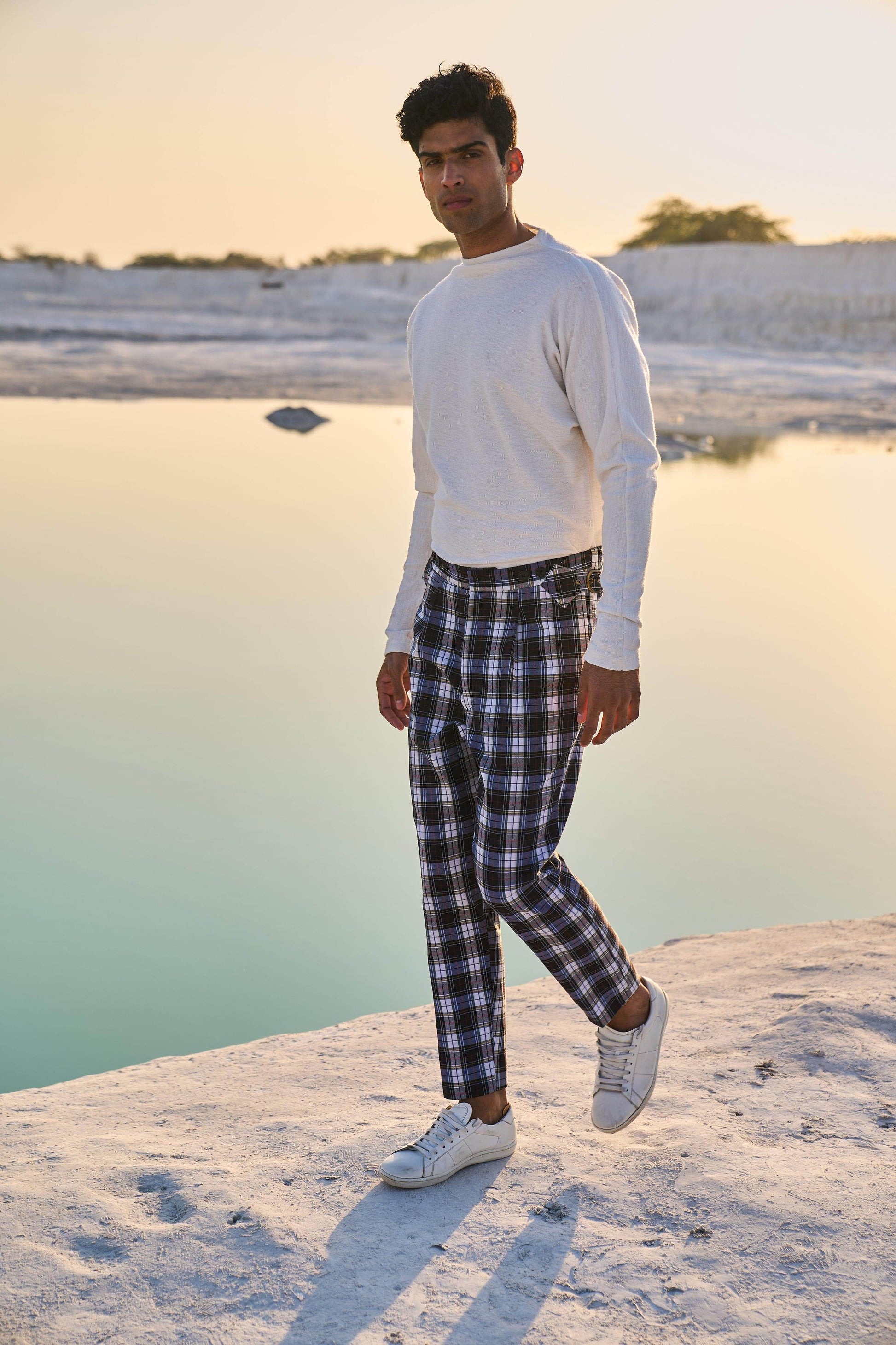 Checked pants with victorian notch shaped back. Metallic buckle detail on the side. Zip closure at the front. Pockets on the side and back.