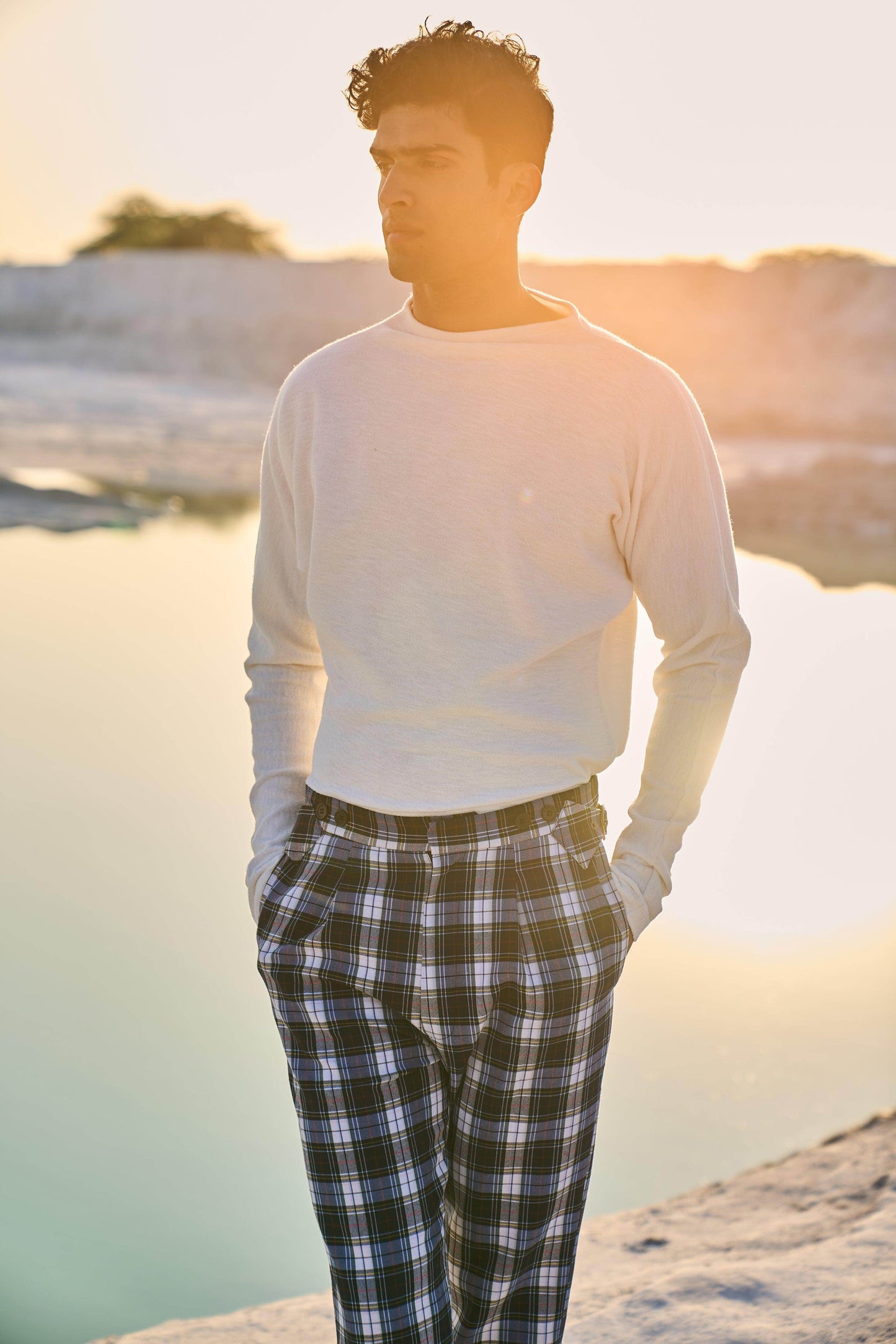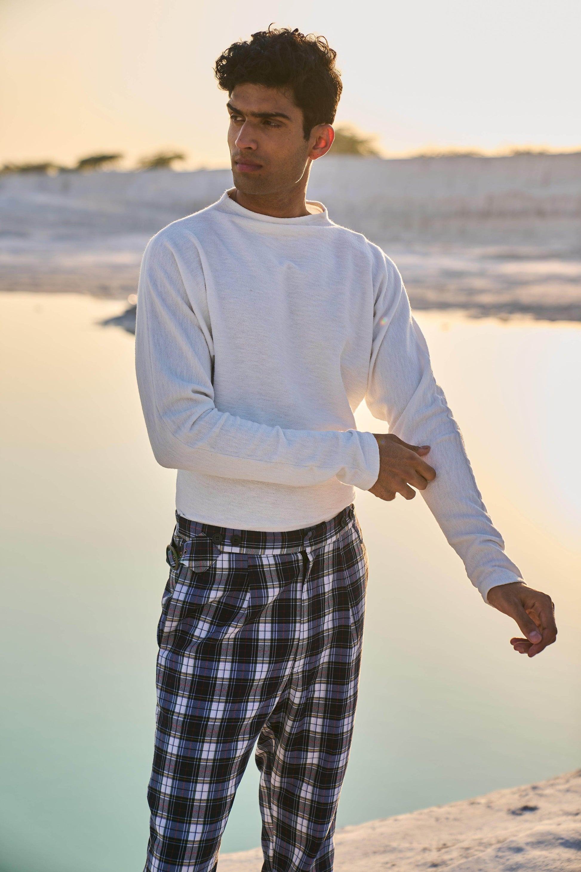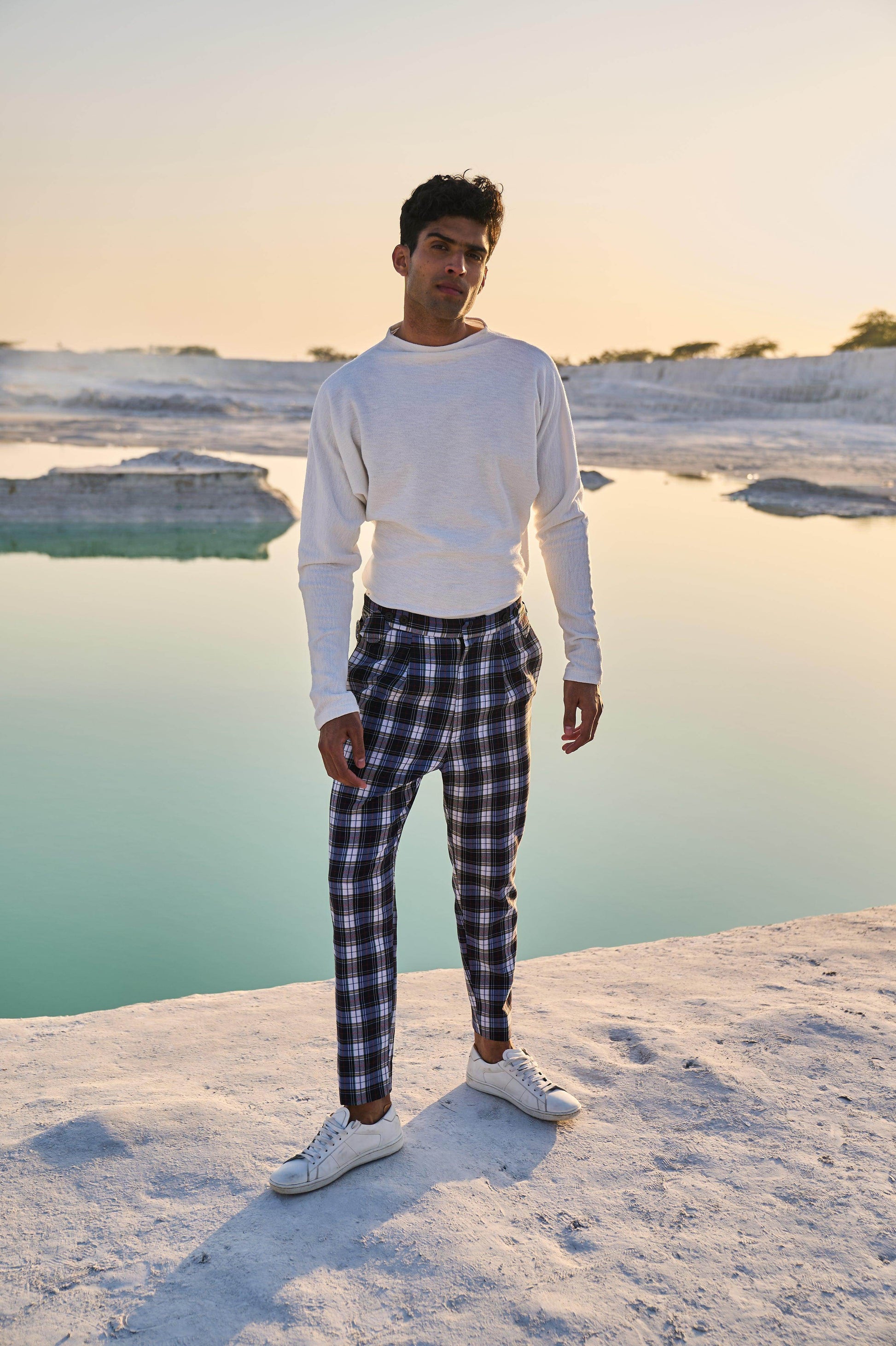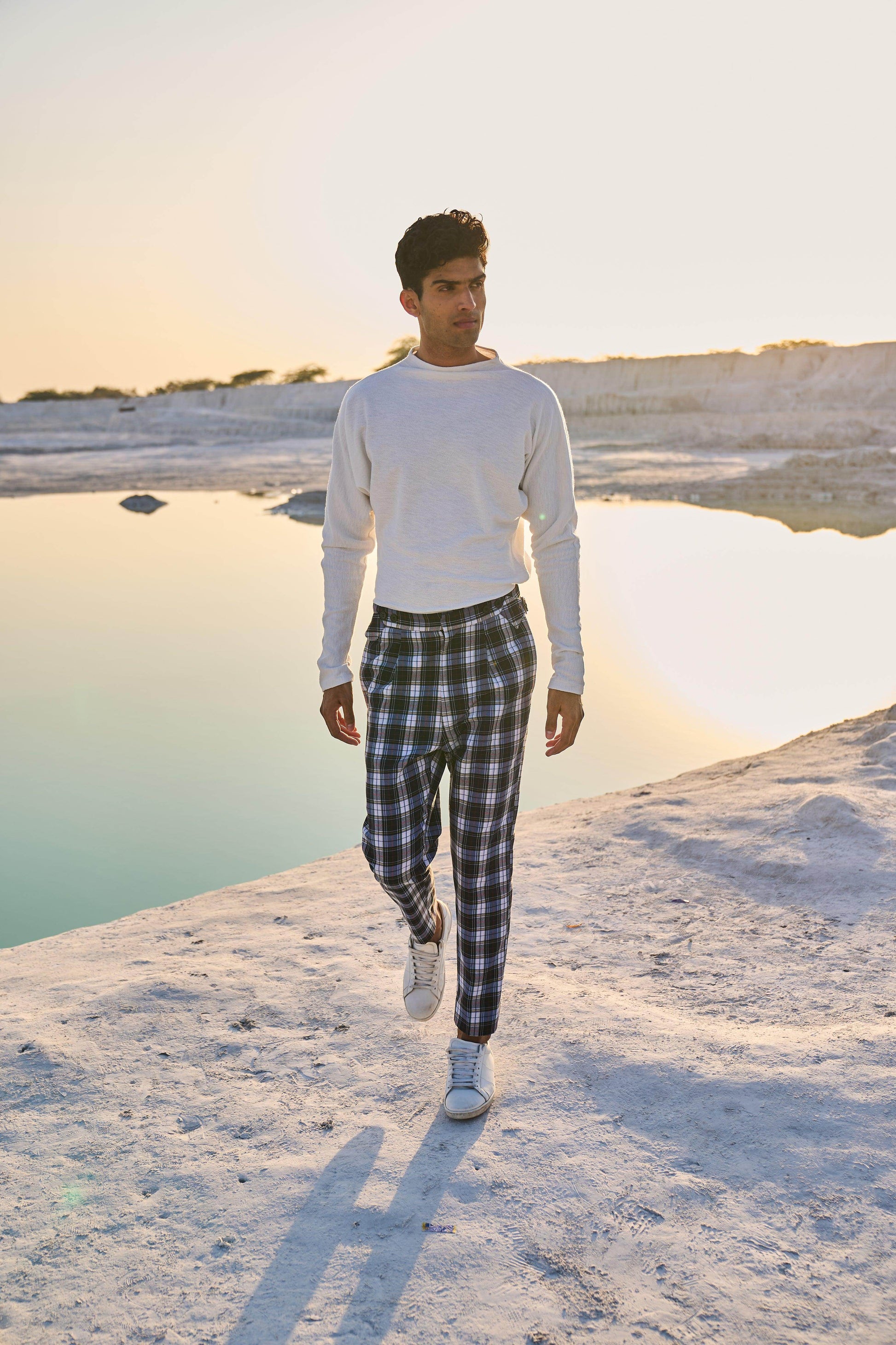 Checked pants with victorian notch shaped back. Metallic buckle detail on the side. Zip closure at the front. Pockets on the side and back.