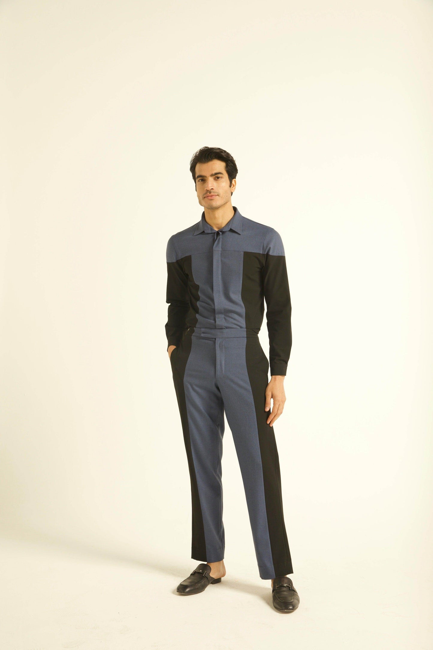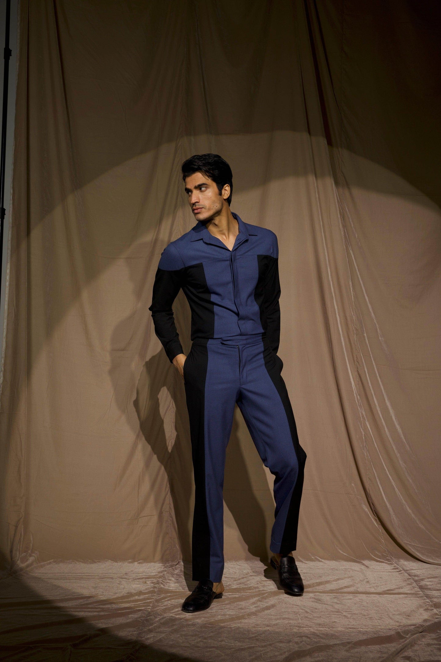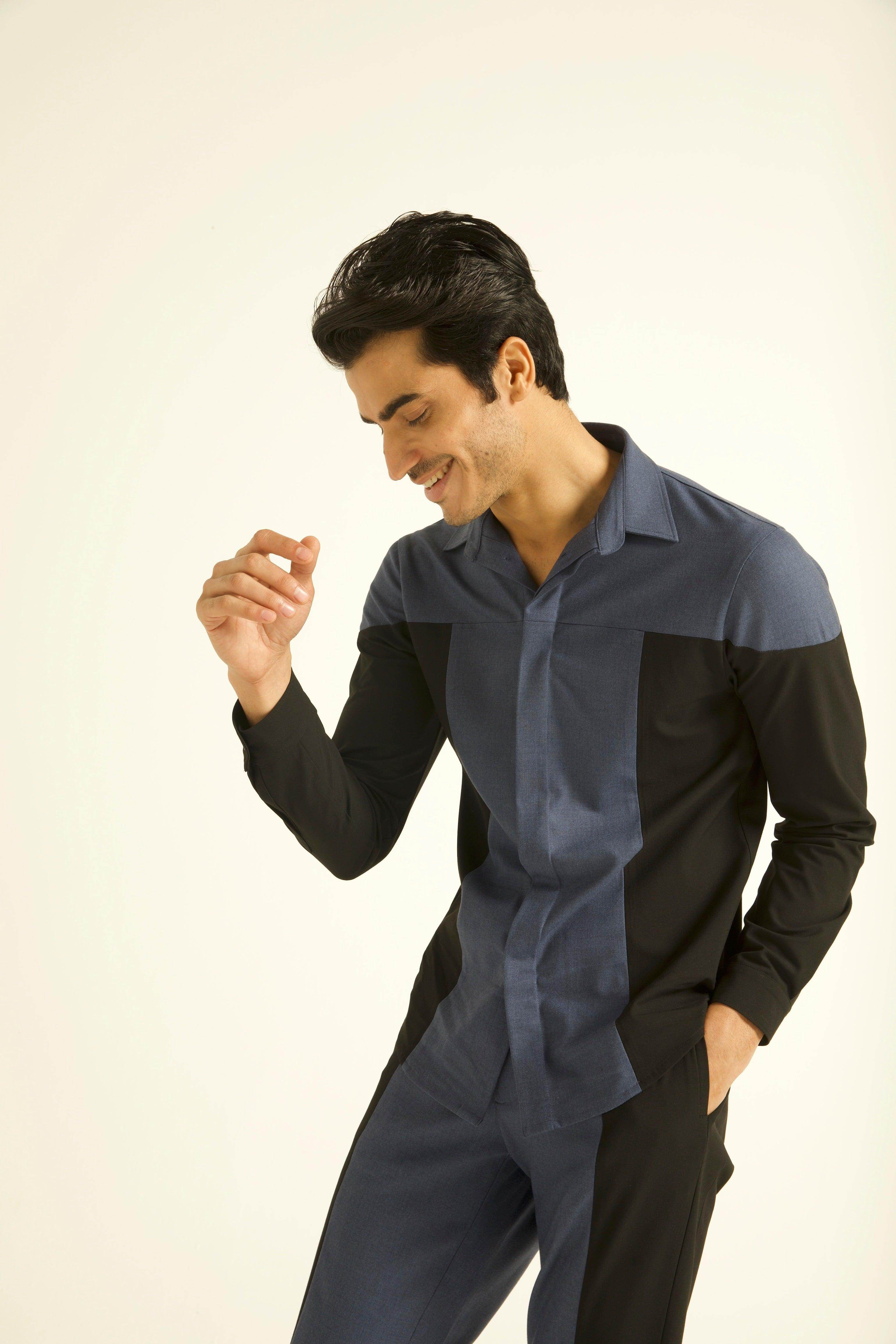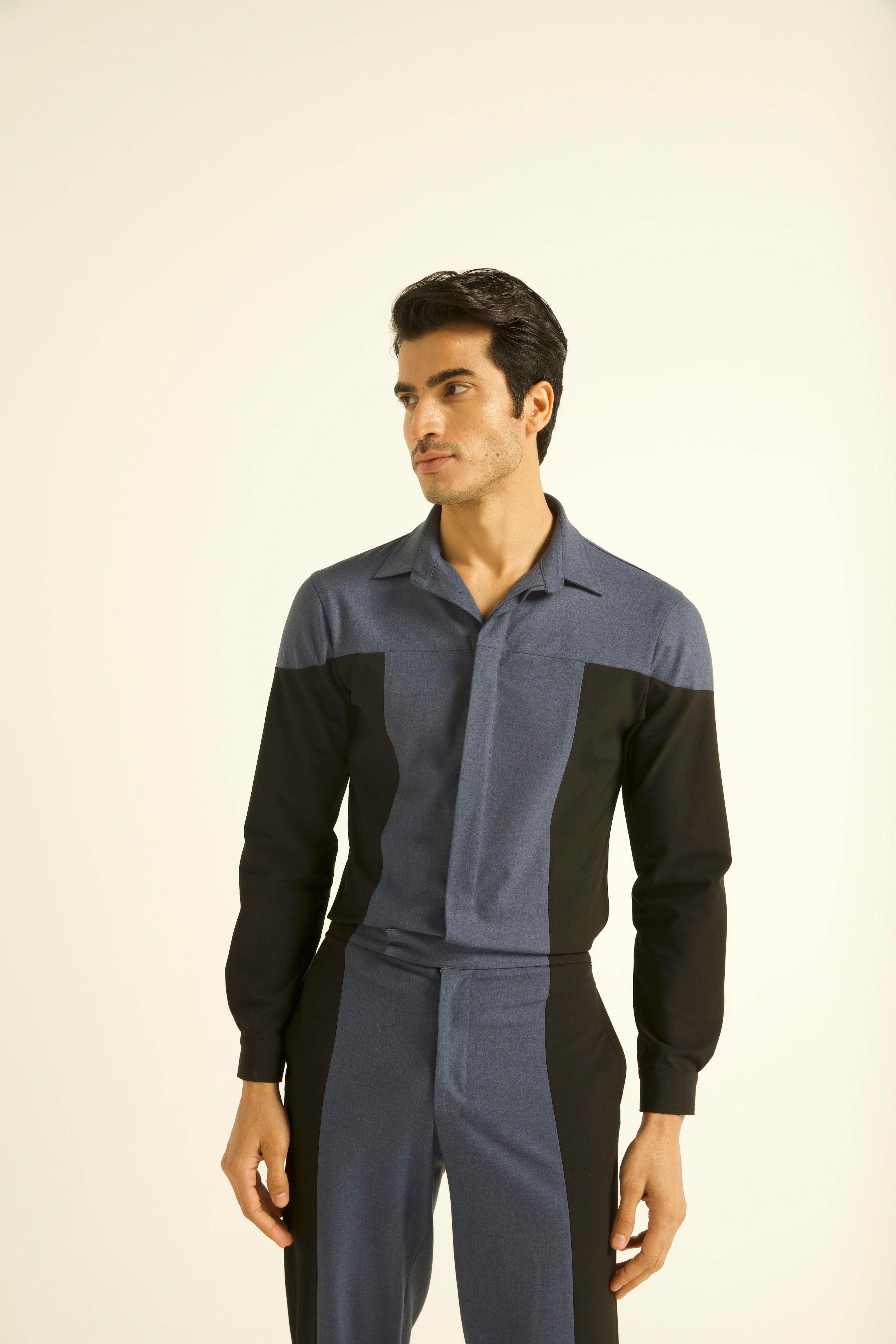 Blue and black color block long-sleeved shirt. Concealed placket, regular fit. Made of all weather suiting material.