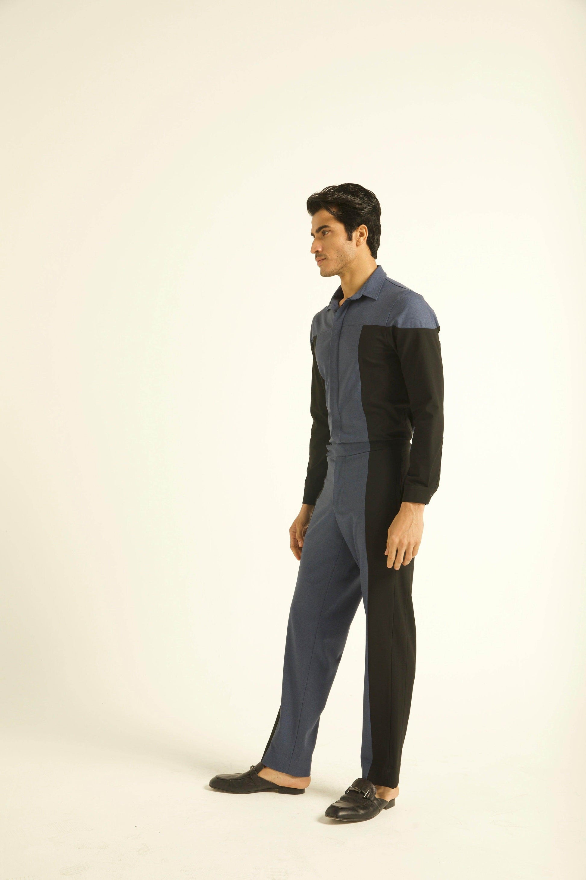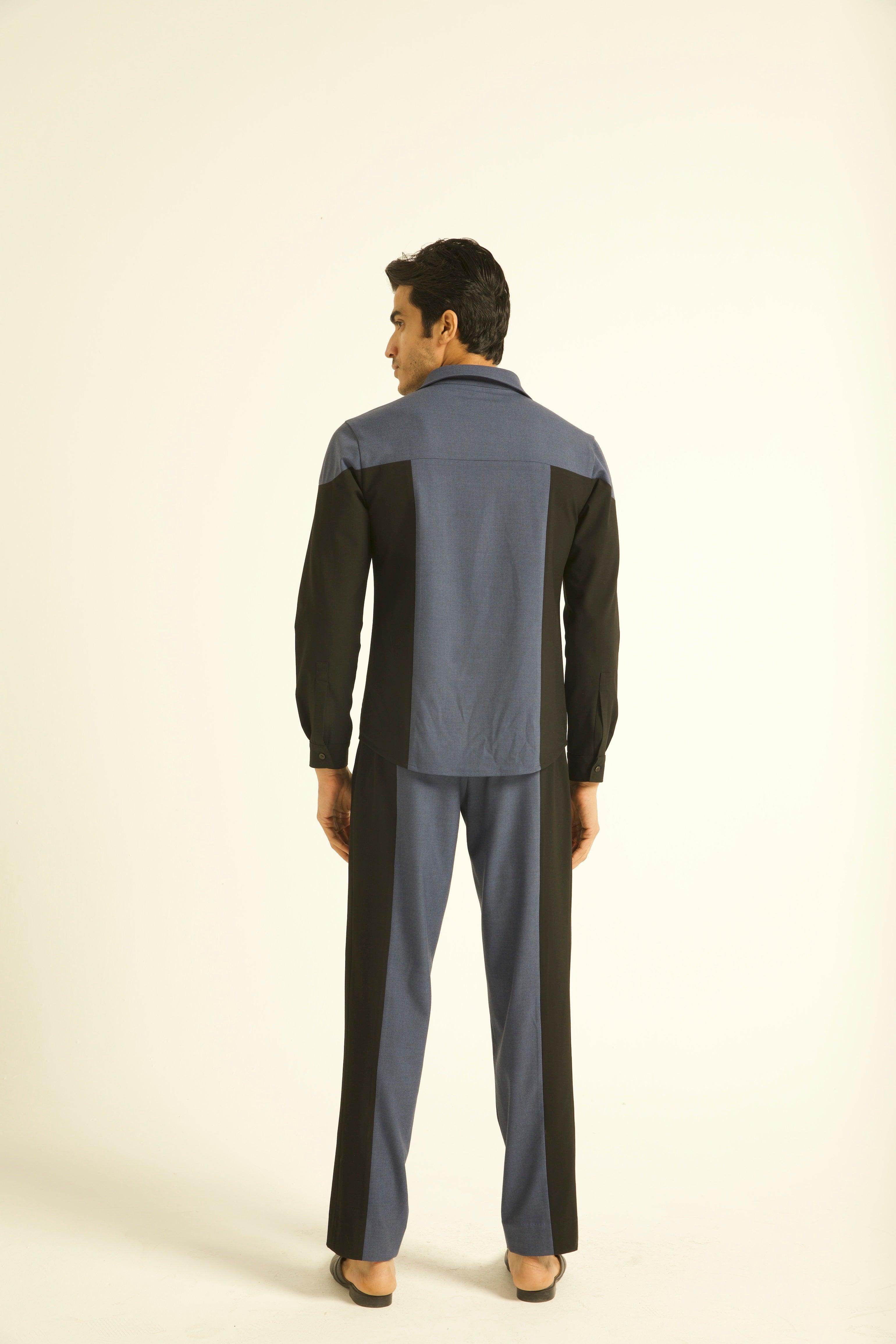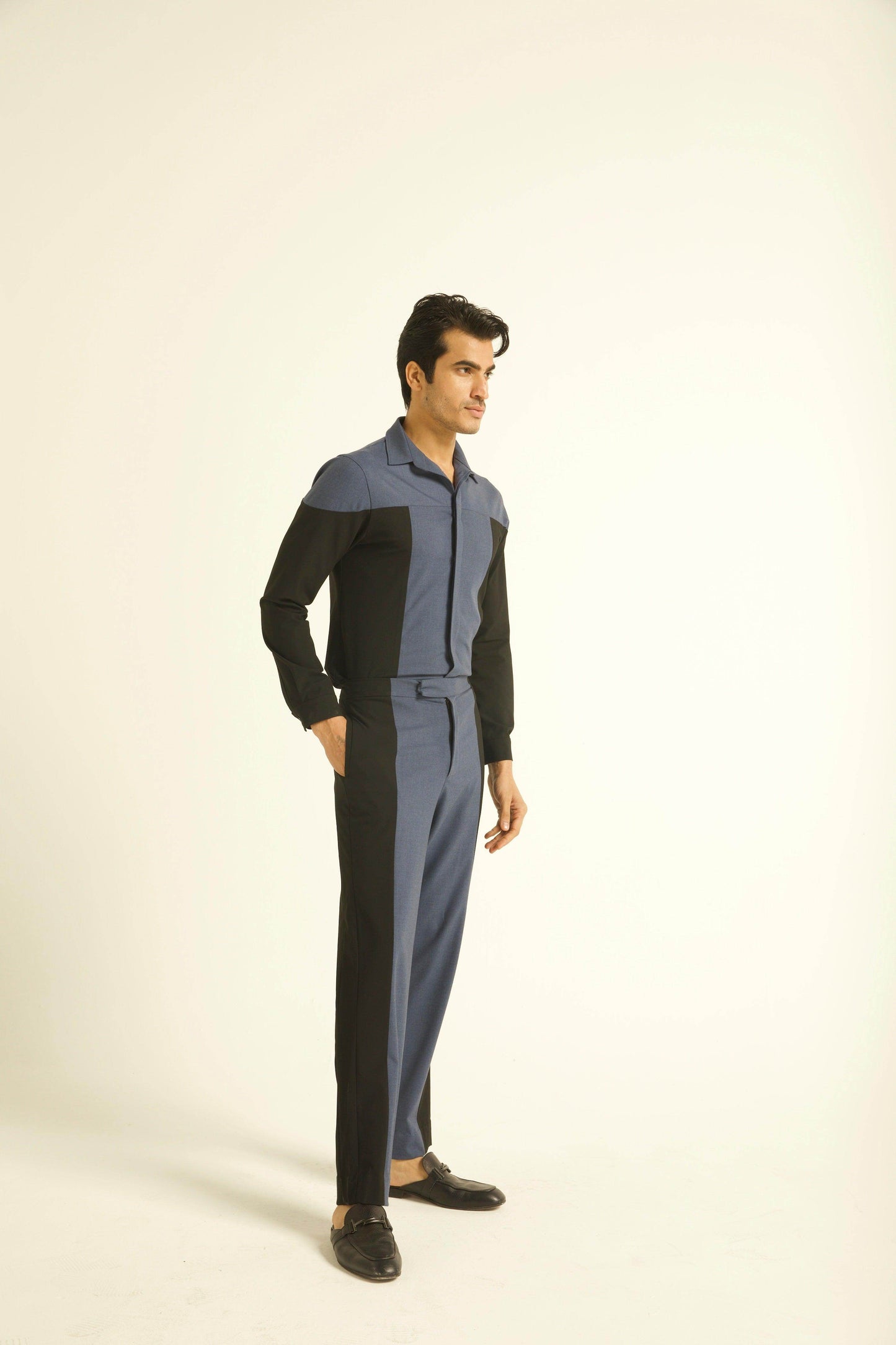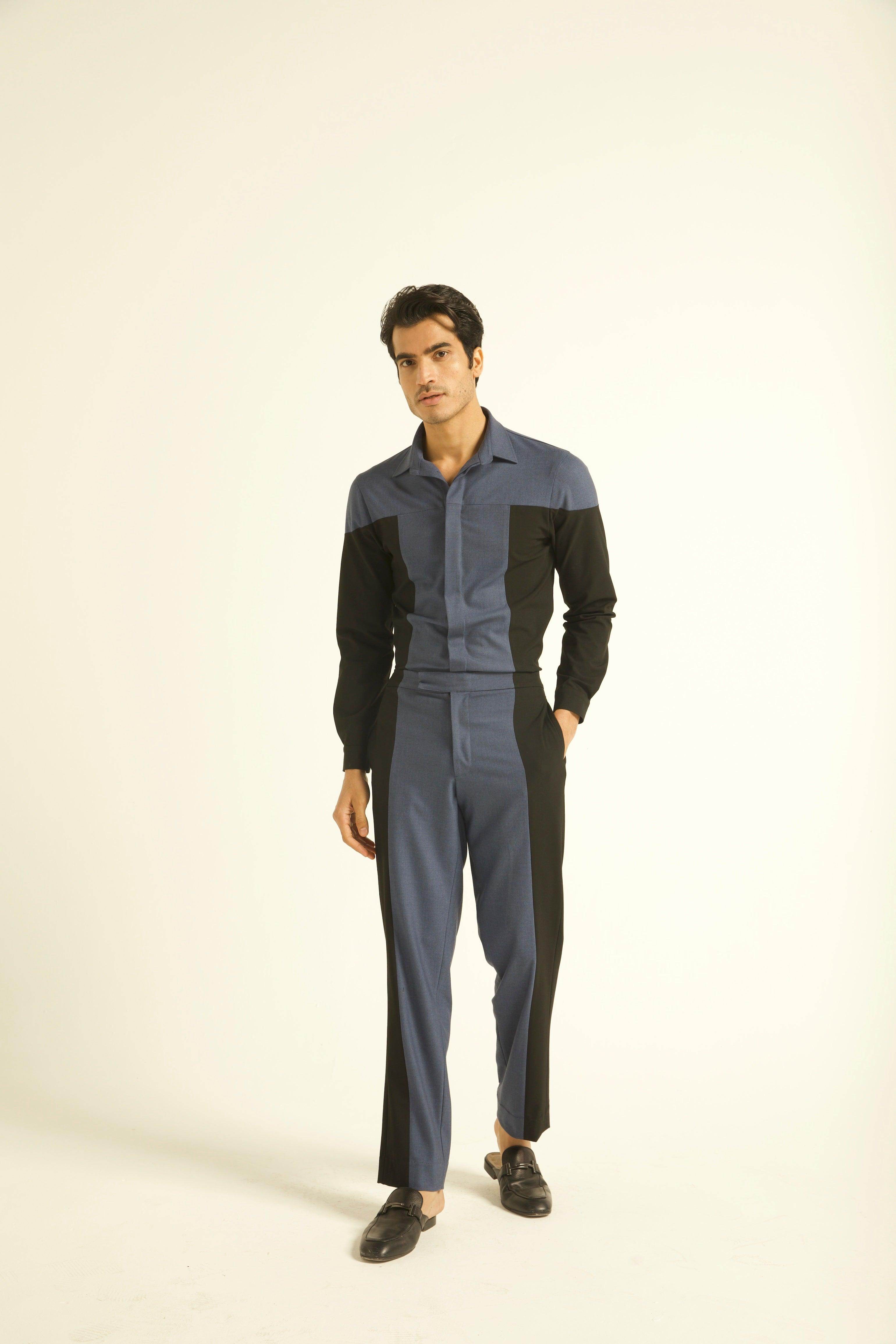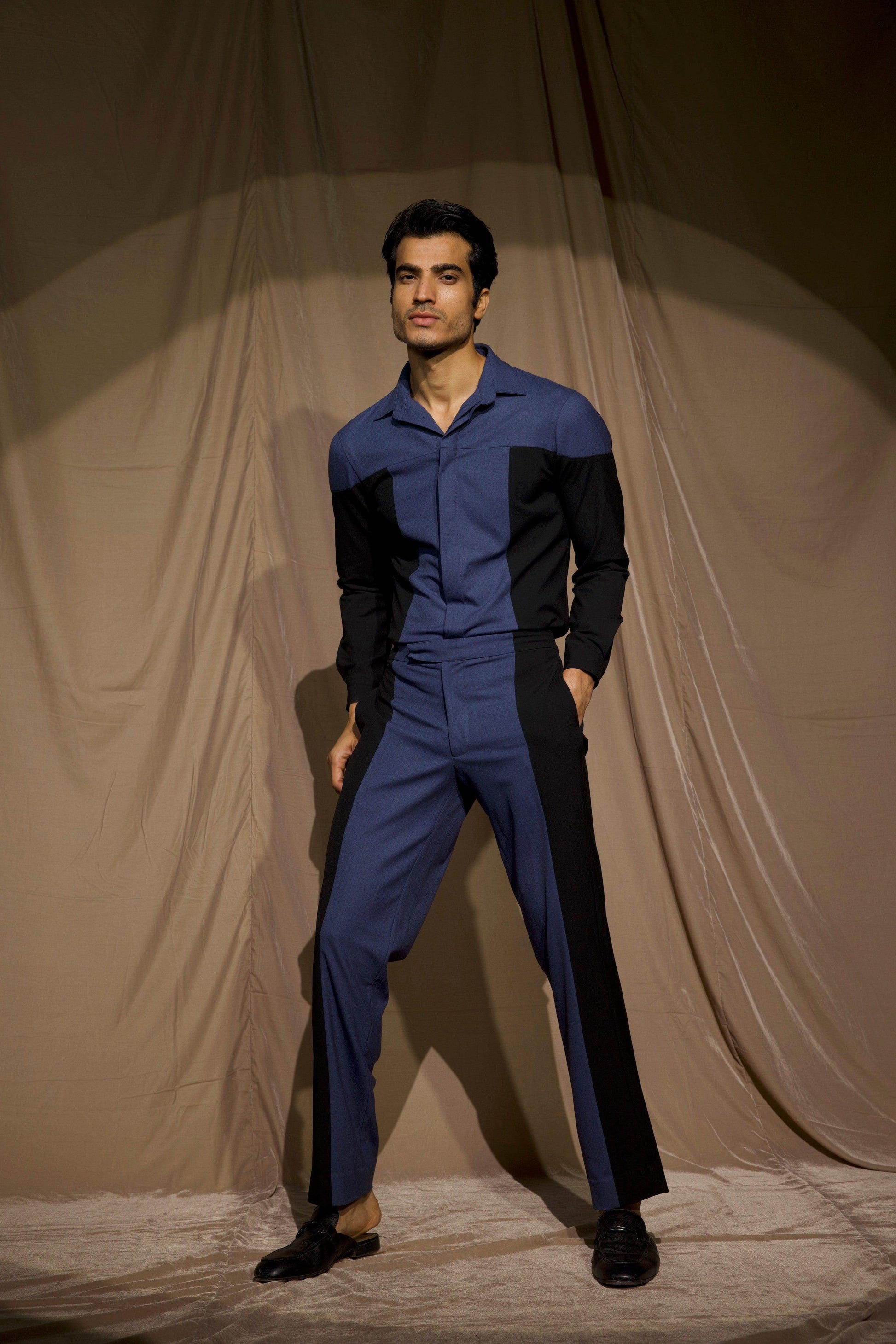 Blue and black color block long-sleeved shirt. Concealed placket, regular fit. Made of all weather suiting material.