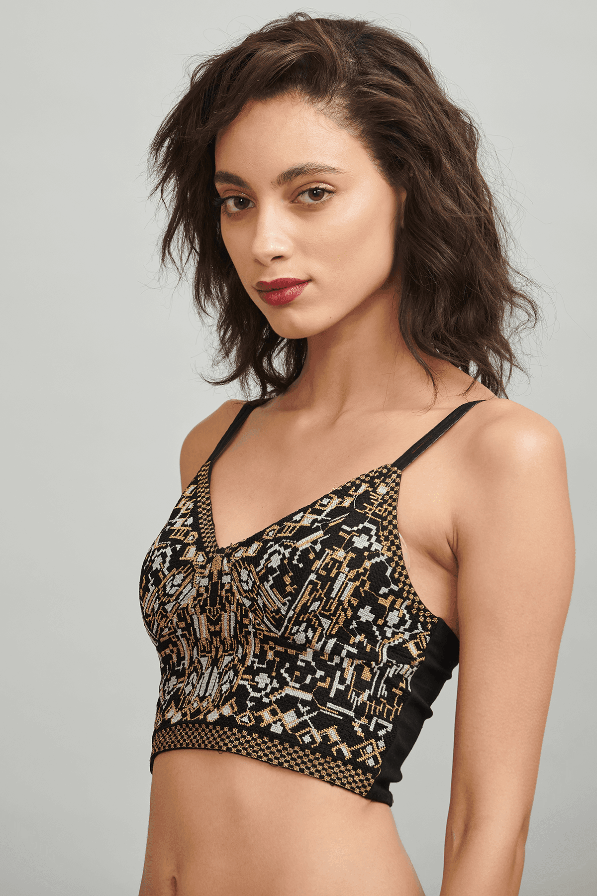 Cross stitch embroidery in metallic gold and silver threads. Mid crop bralette in stretch ponte fabric.
