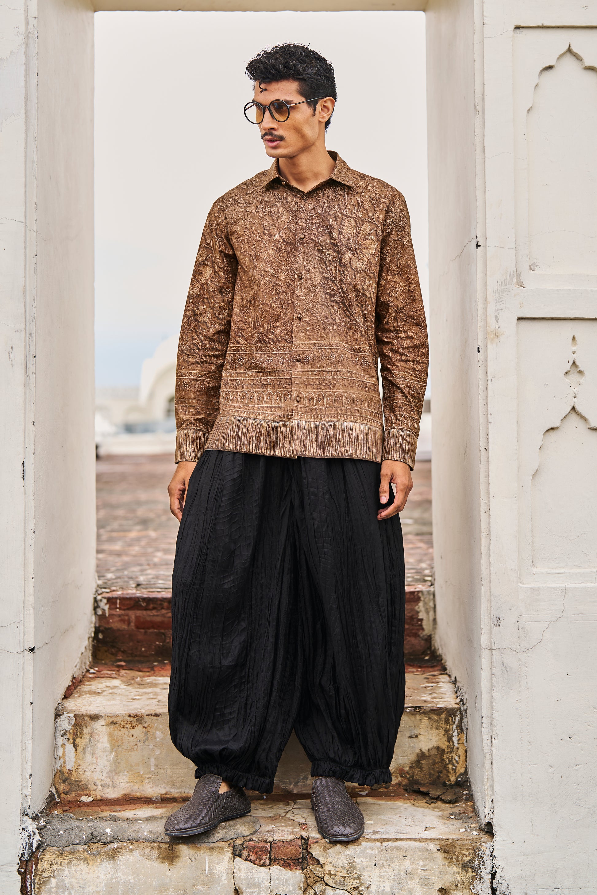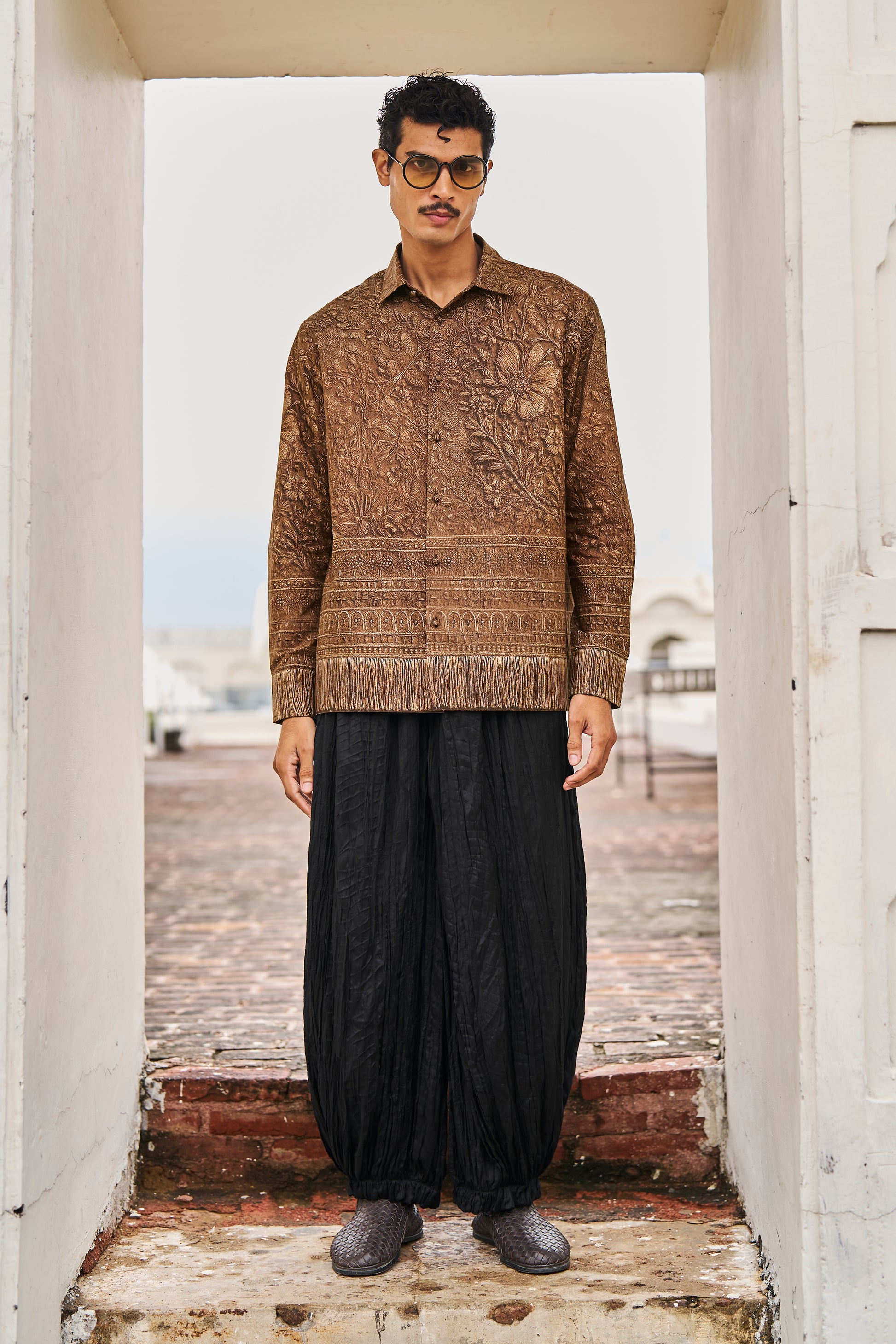 Hand-crushed textured black pant with a crinkled finish. Semi elasticated waistband with zip and hook/eye closure. Elasticated cuffs for shape.