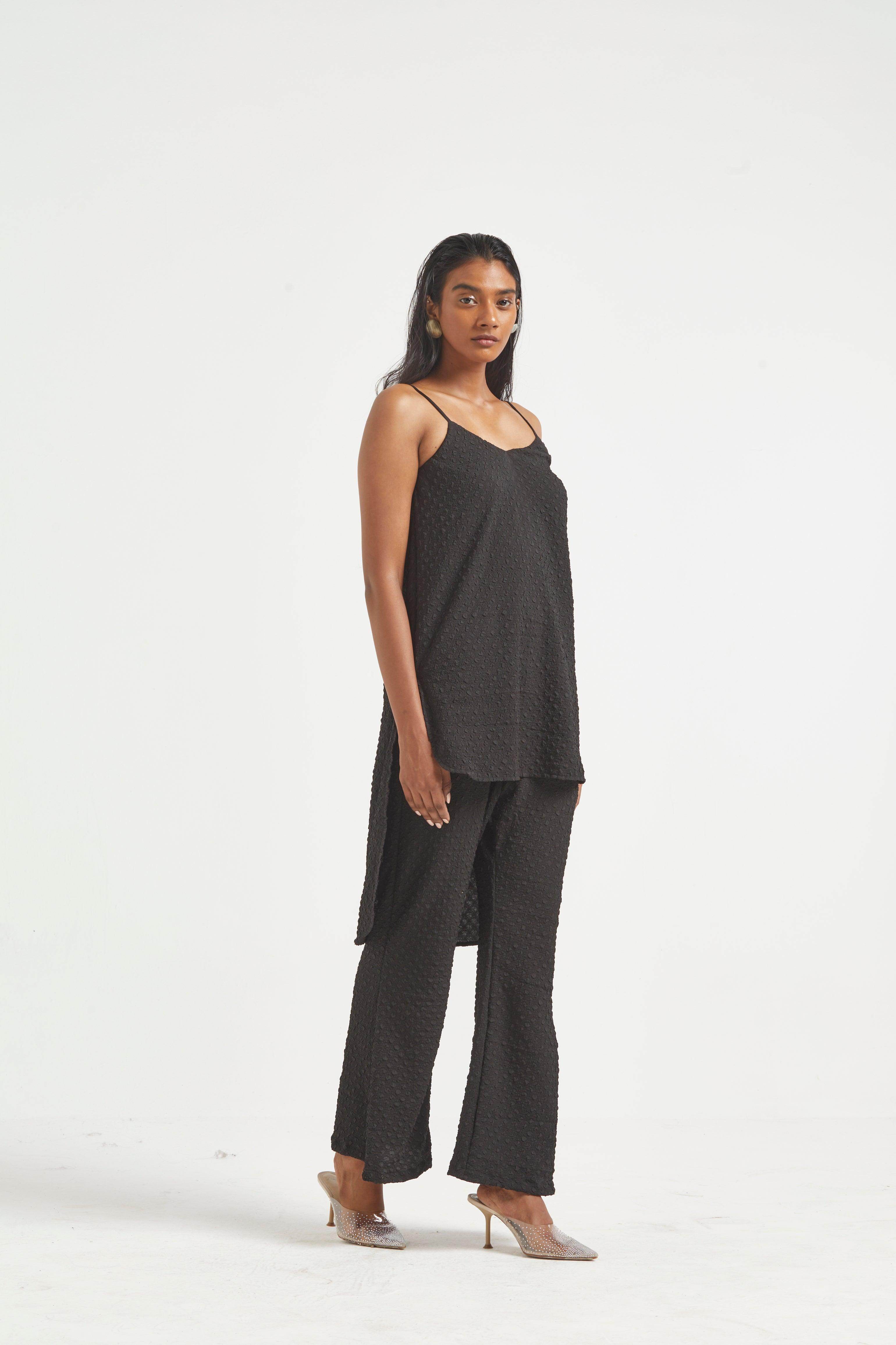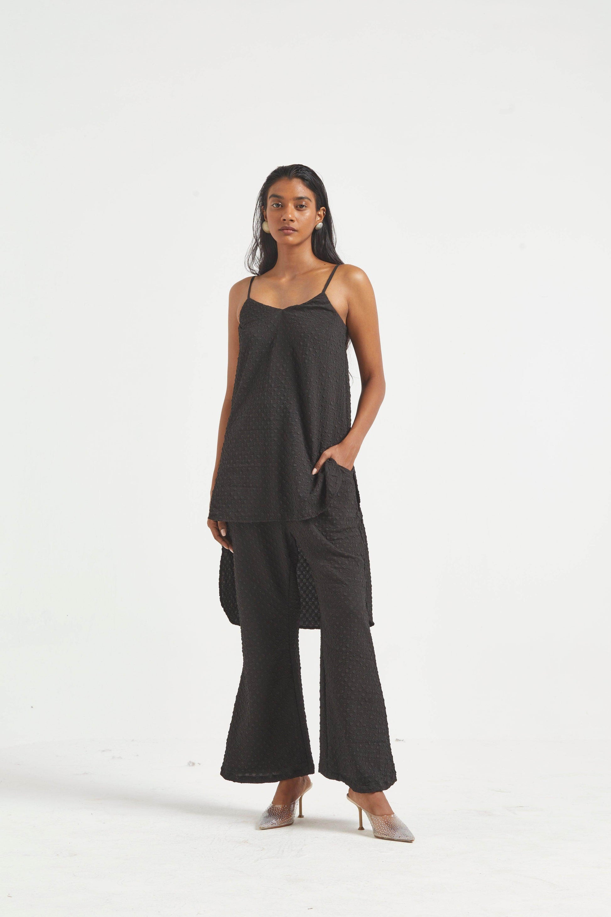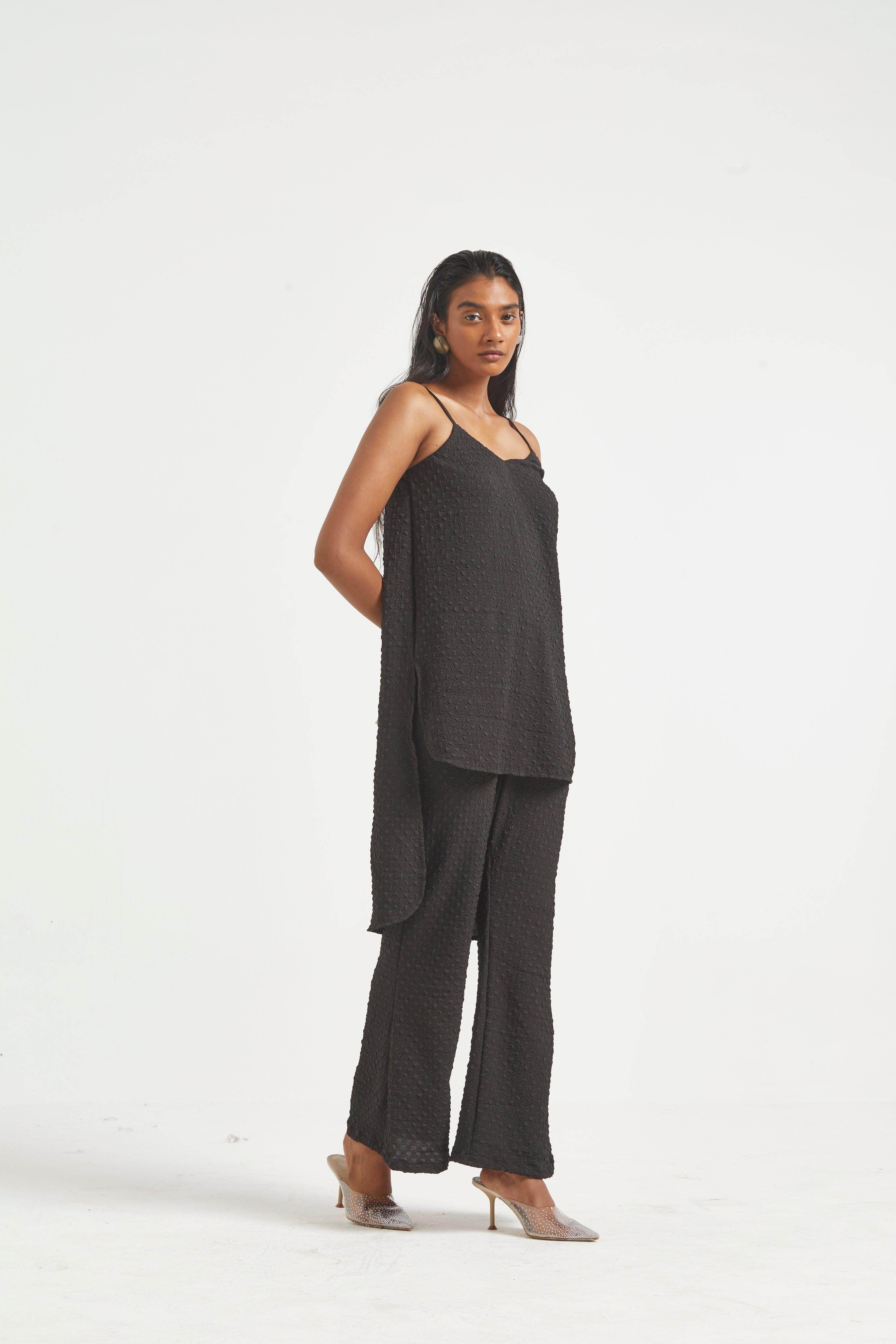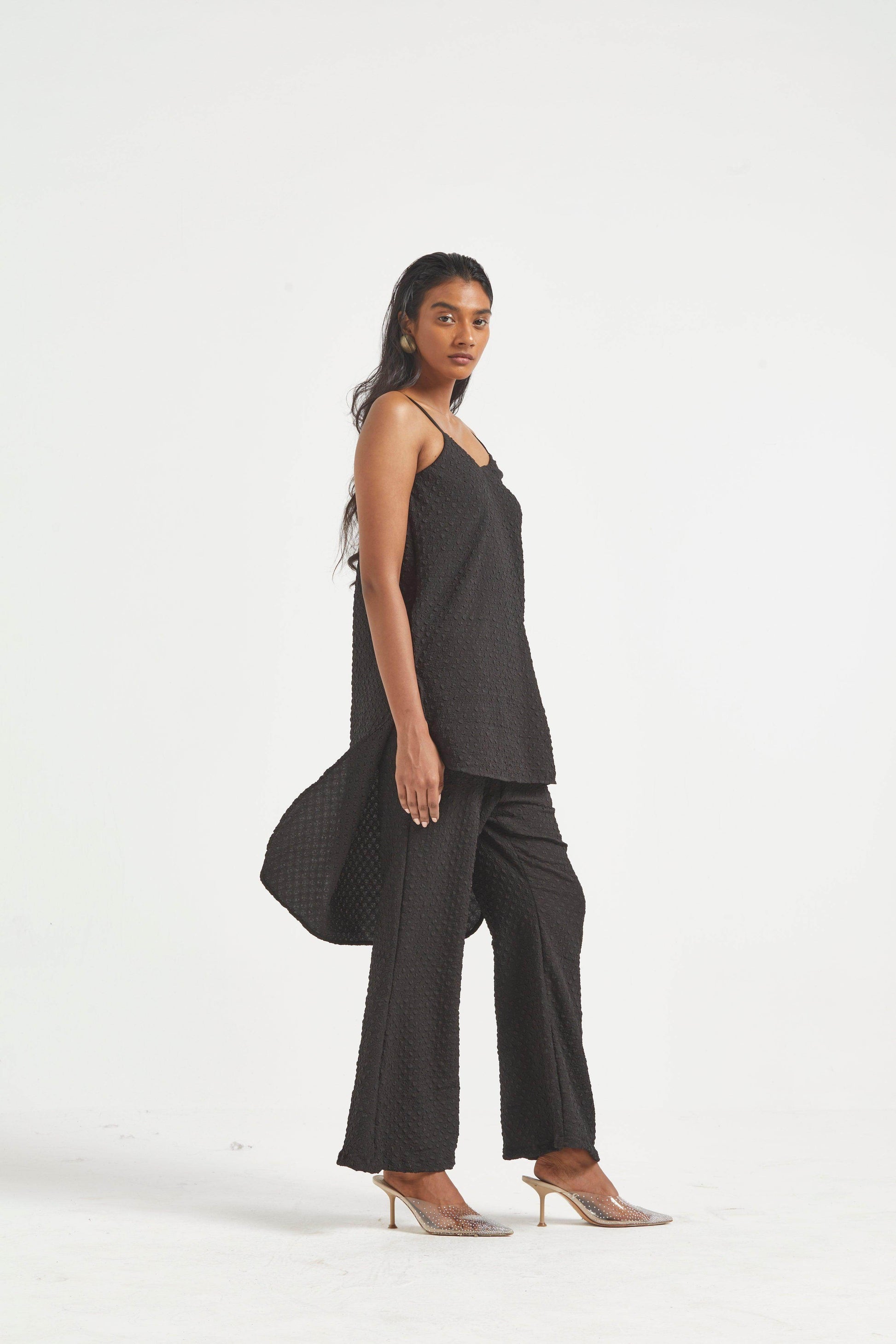 High low top in crushed and embossed black fabric. Adjustable straps on shoulder, elasticated at the back. Vent on sides. Paired with matching flared pants. Pockets on the side, elasticated at the waist.