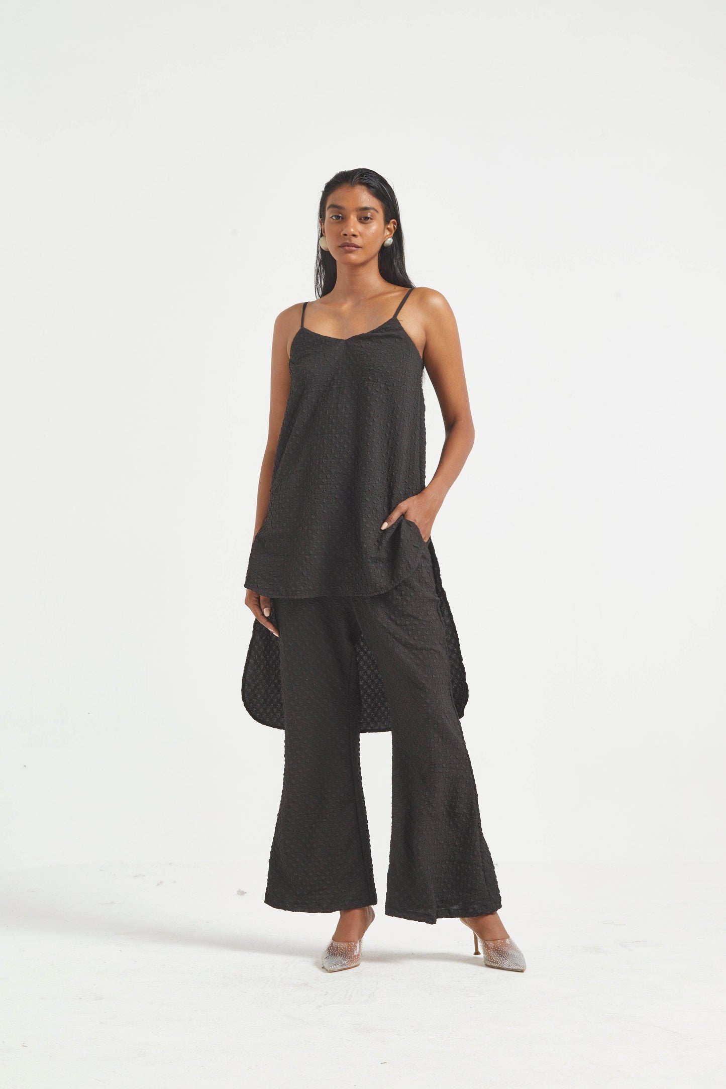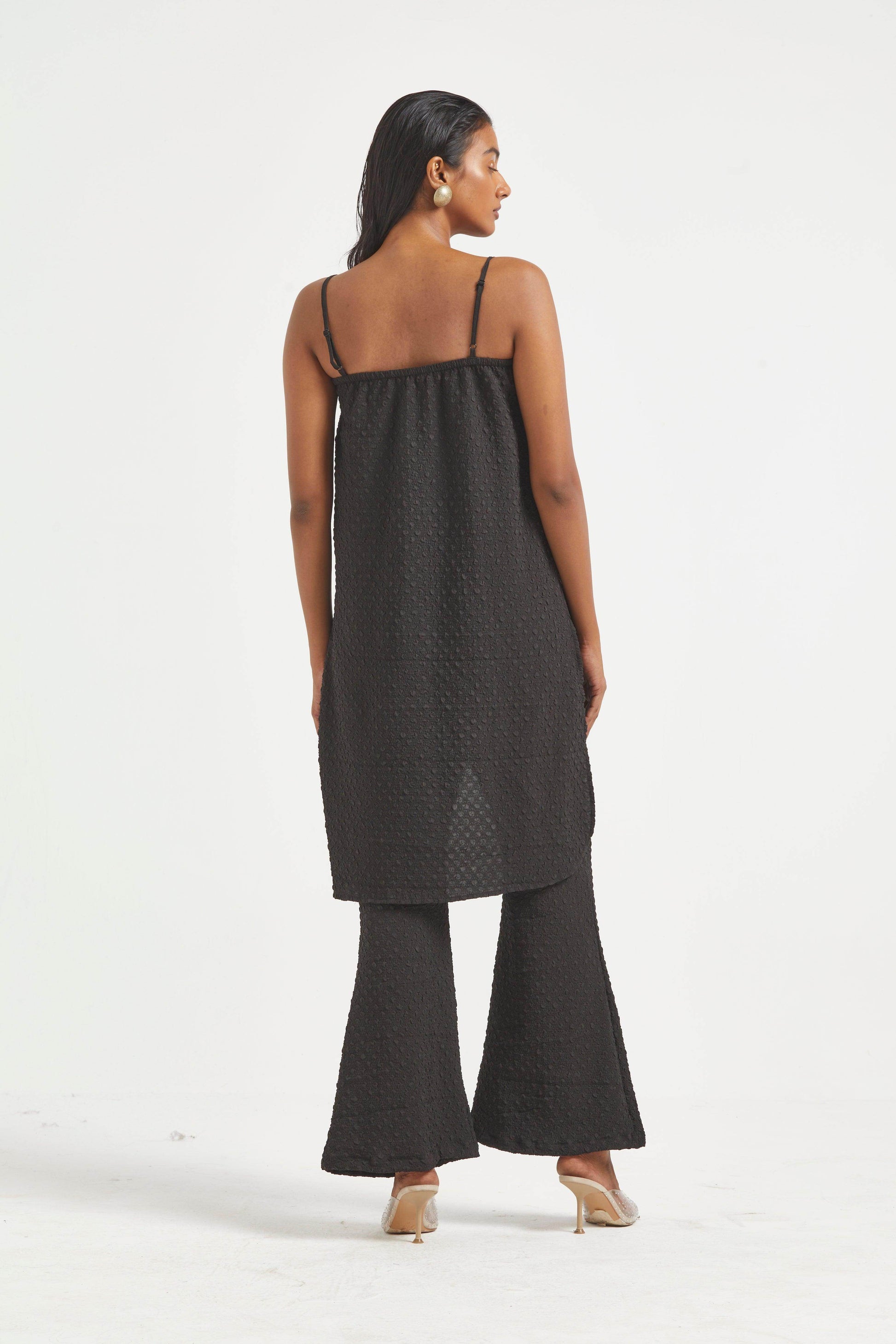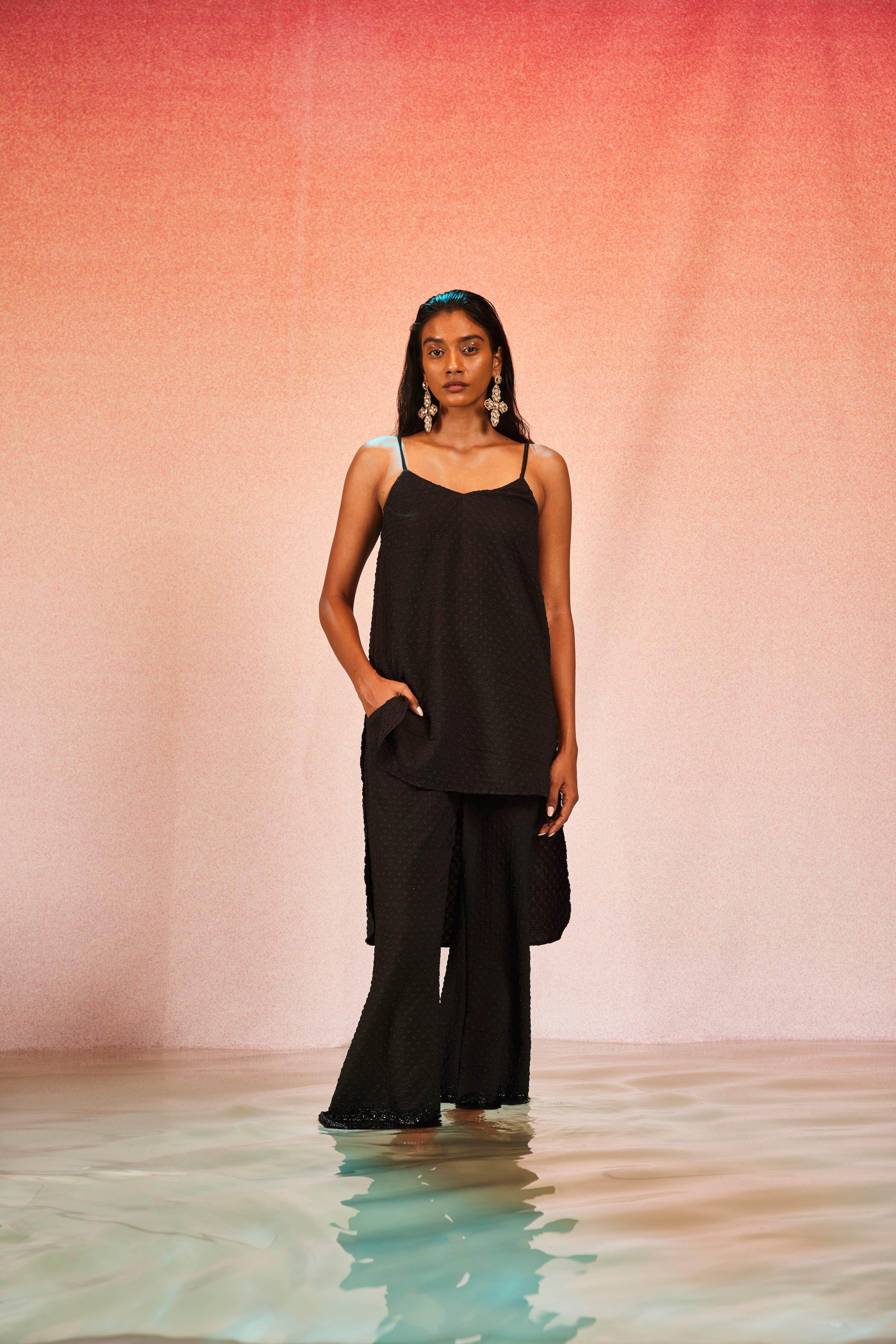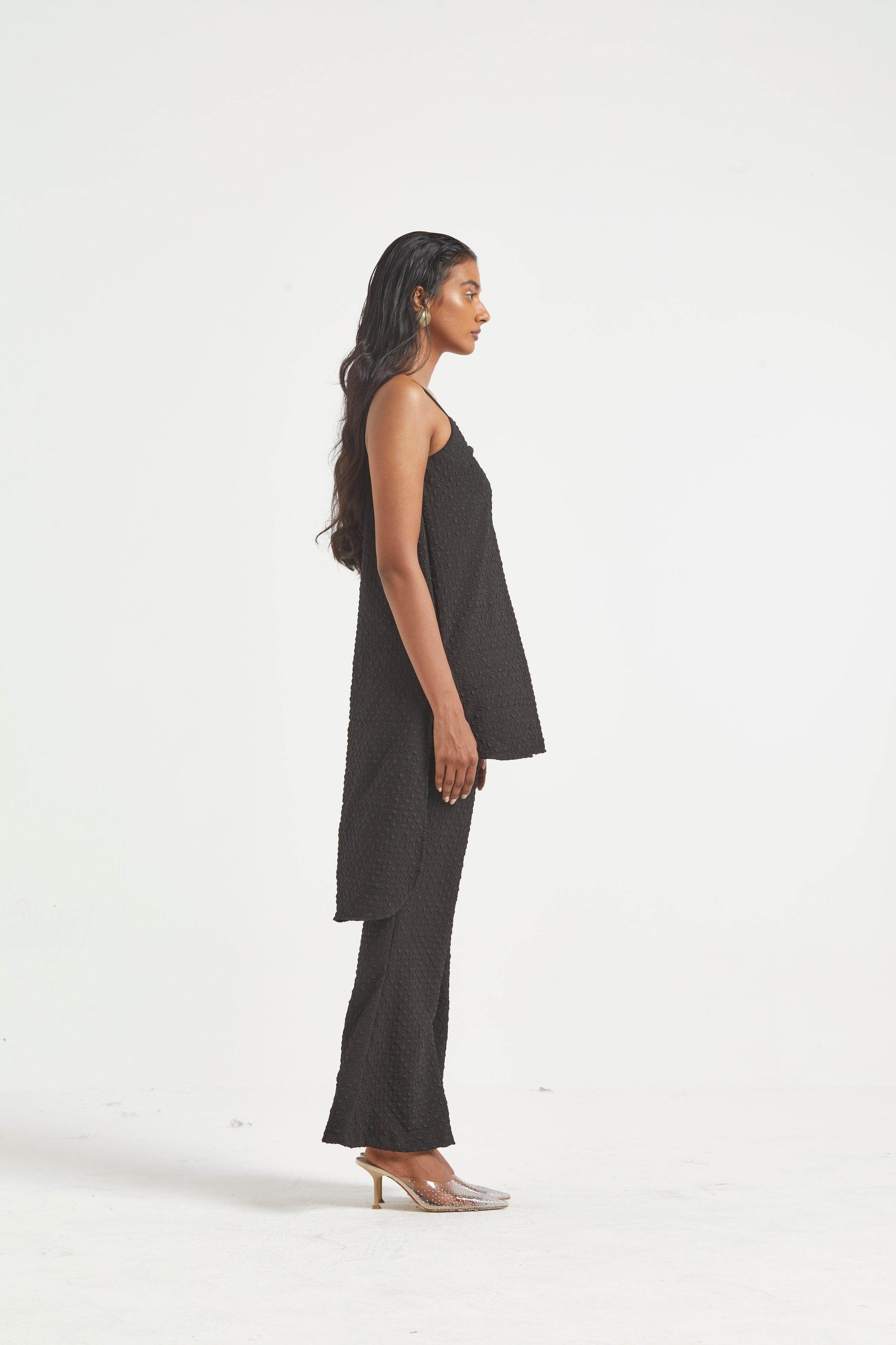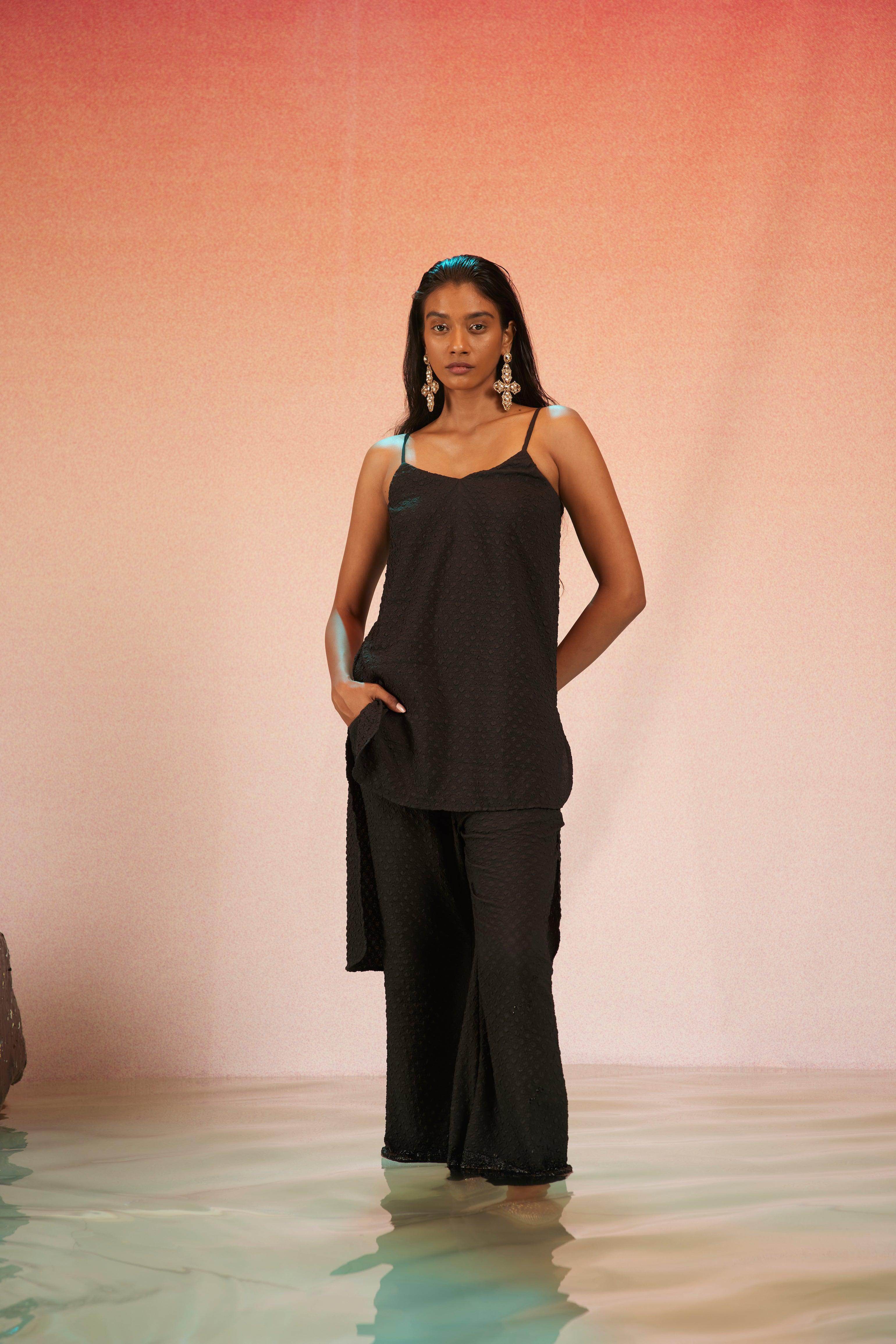 High low top in crushed and embossed black fabric. Adjustable straps on shoulder, elasticated at the back. Vent on sides. Paired with matching flared pants. Pockets on the side, elasticated at the waist.