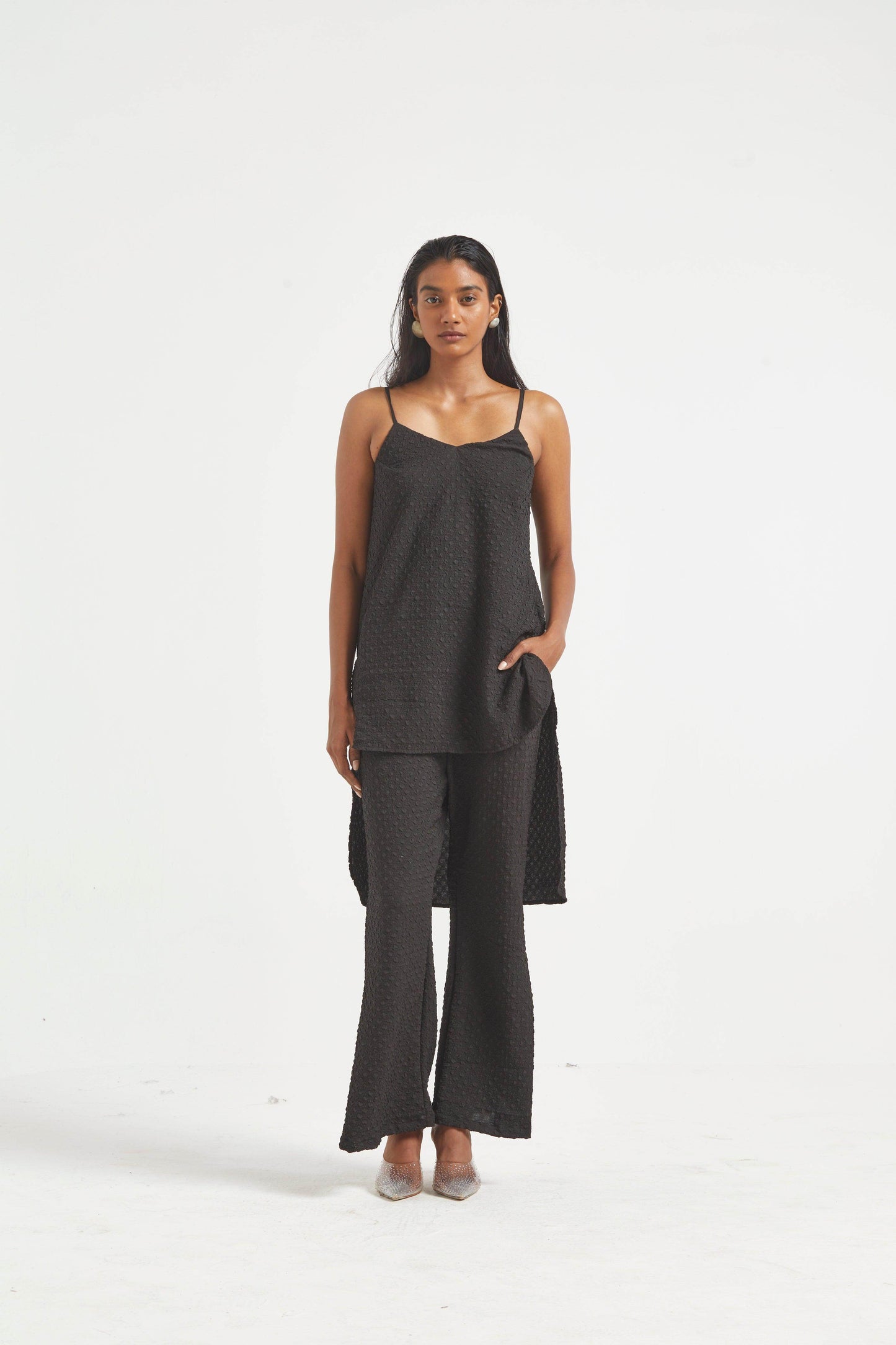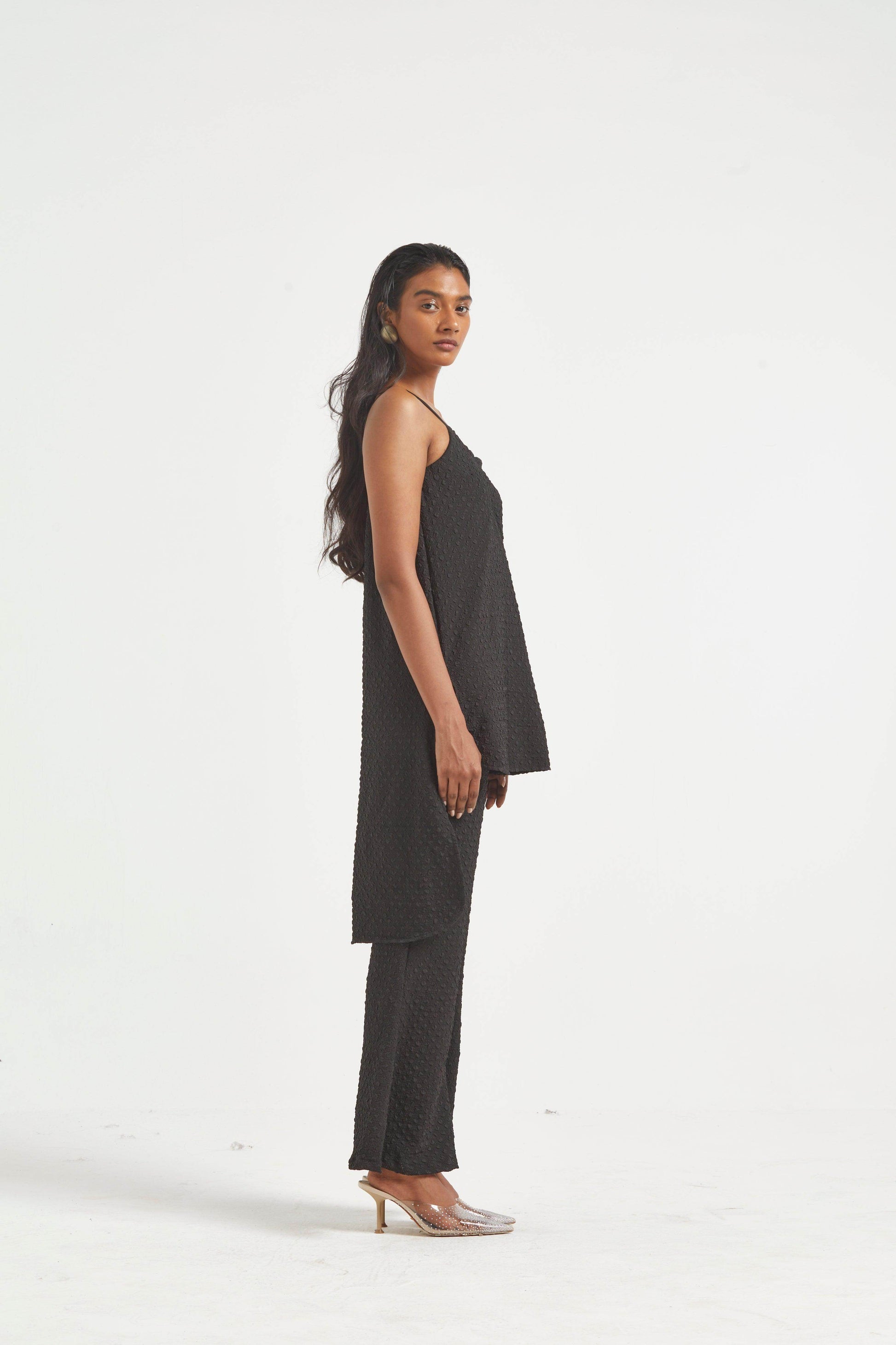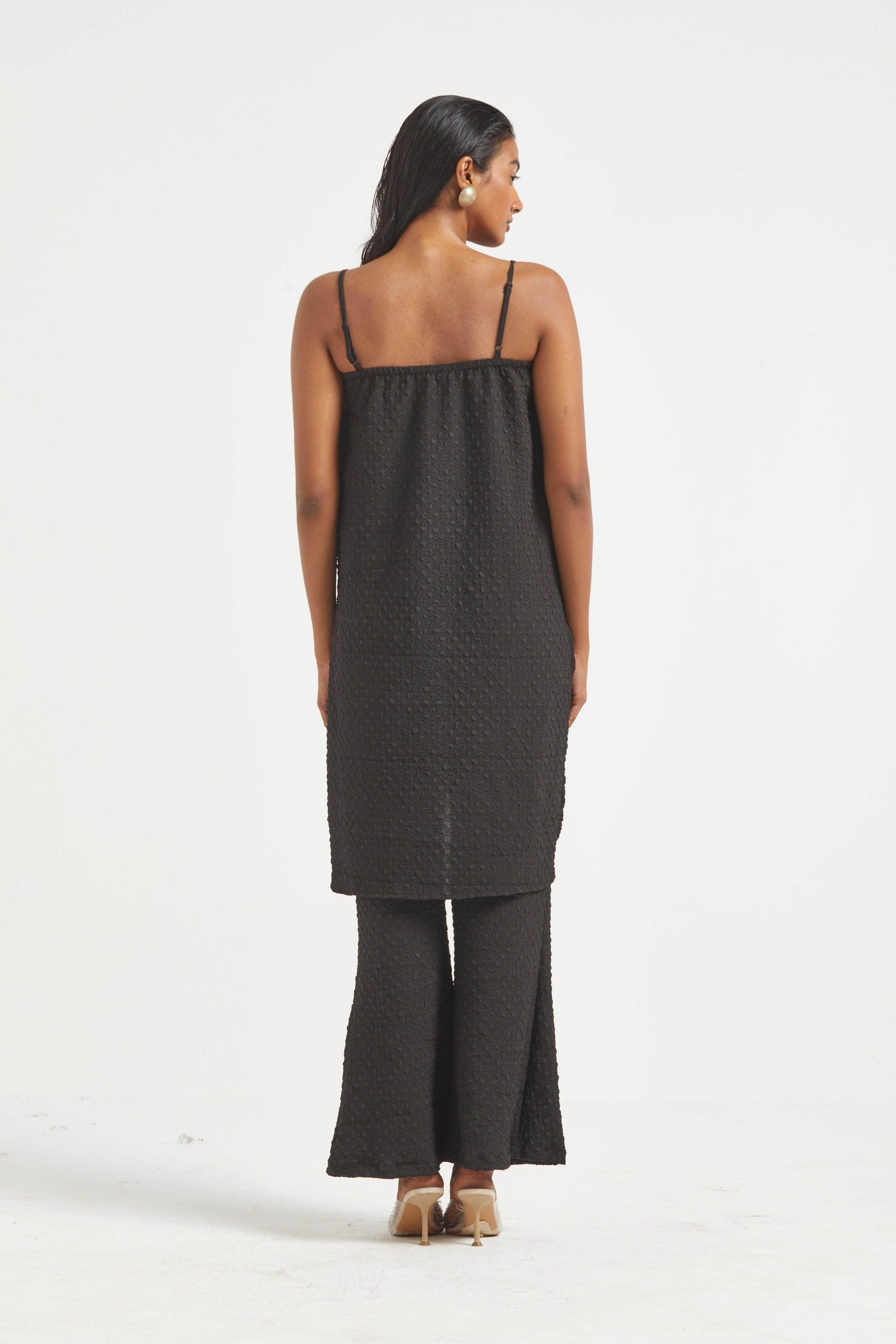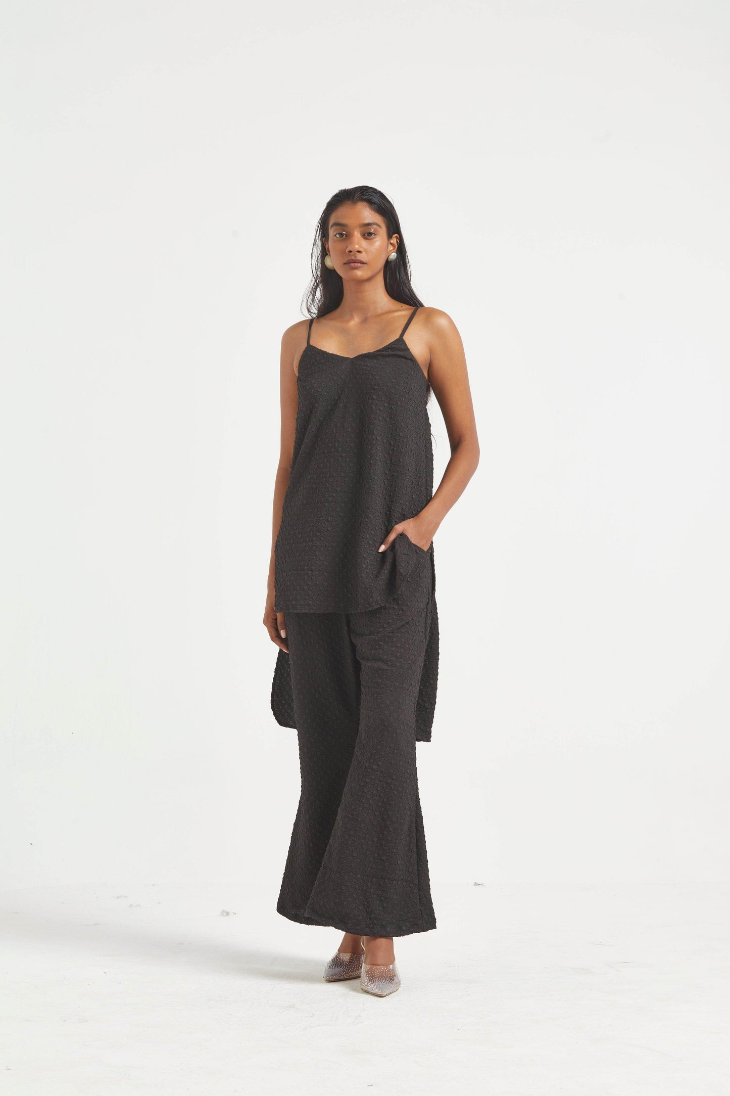 High low top in crushed and embossed black fabric. Adjustable straps on shoulder, elasticated at the back. Vent on sides. Paired with matching flared pants. Pockets on the side, elasticated at the waist.