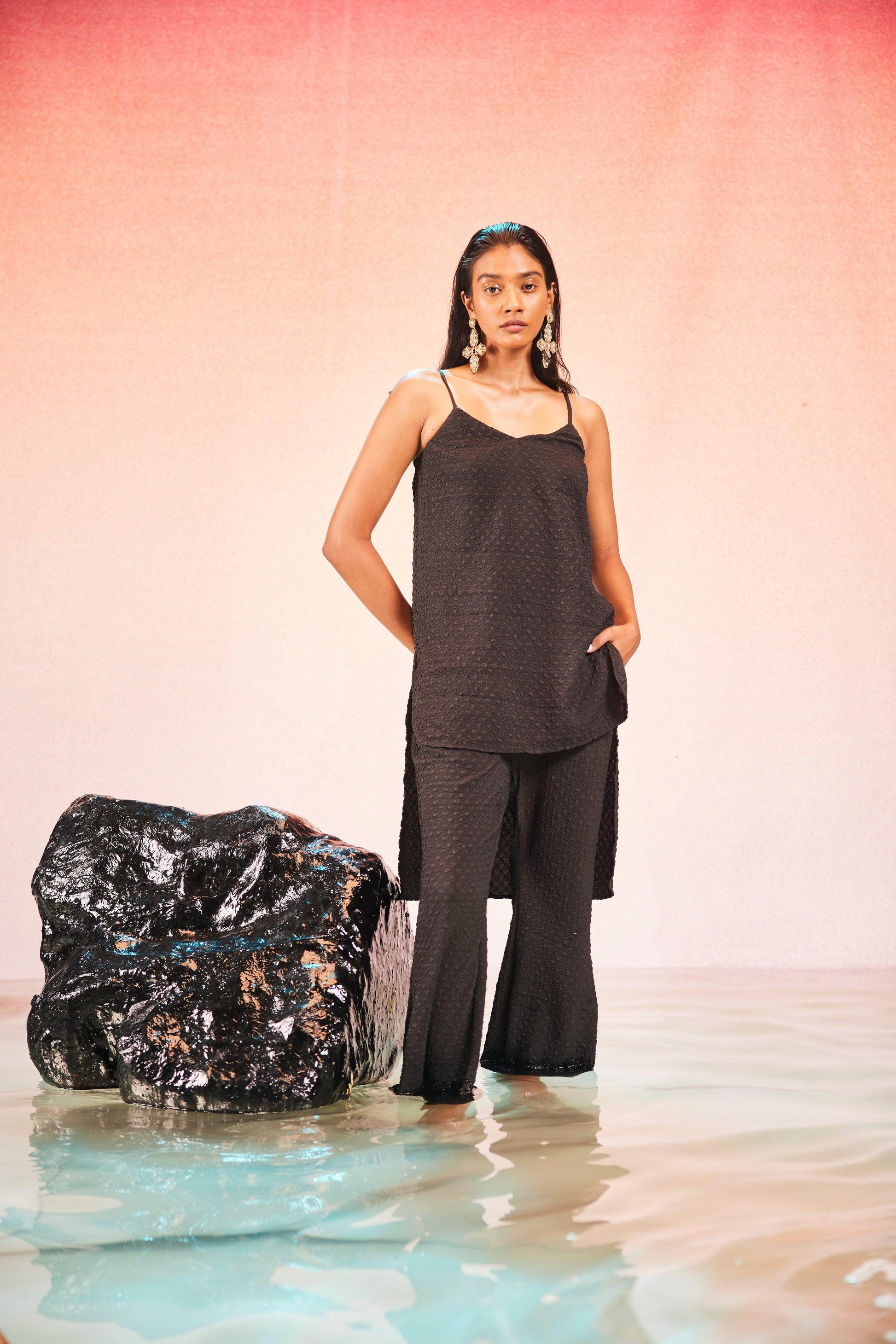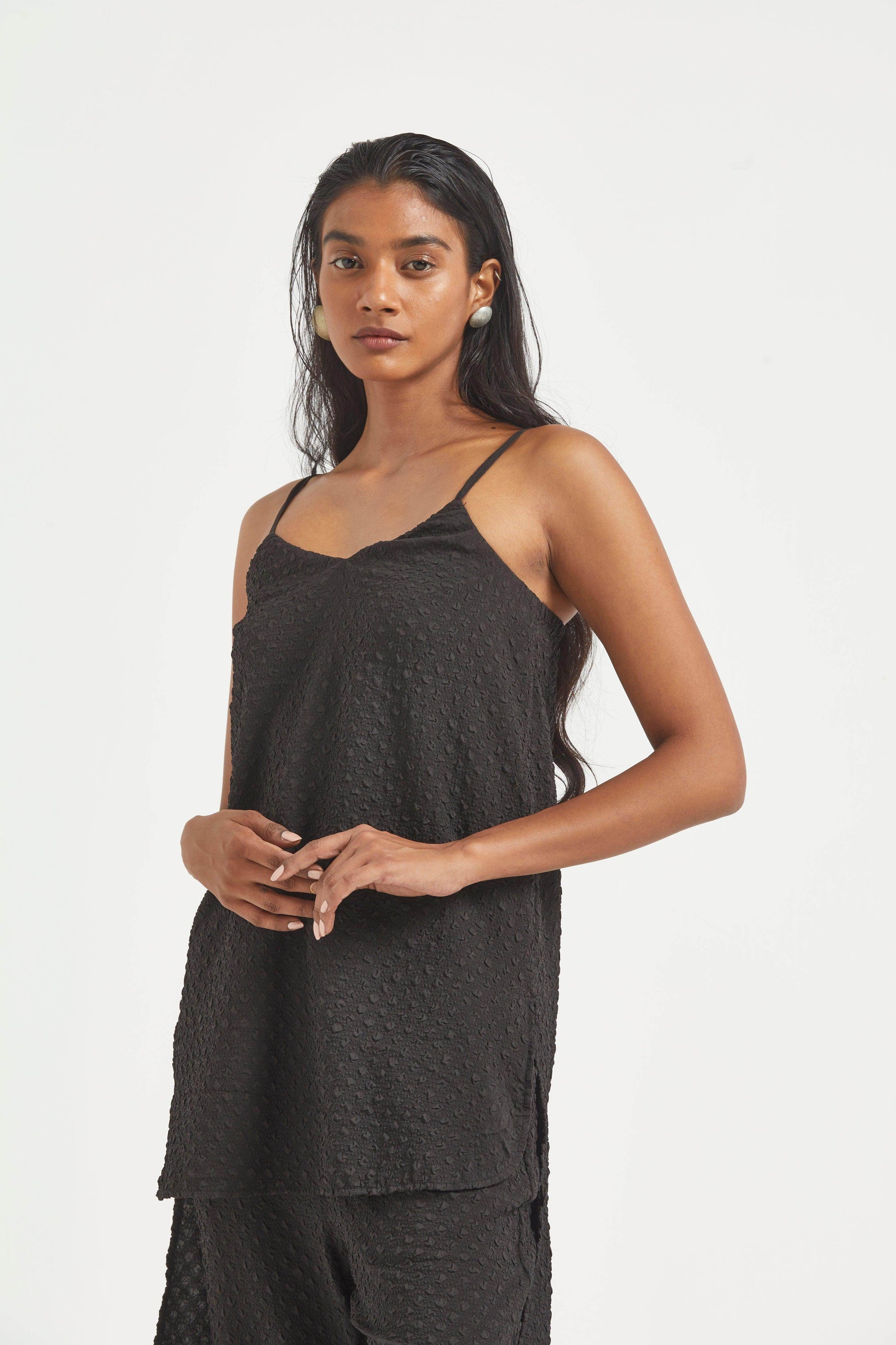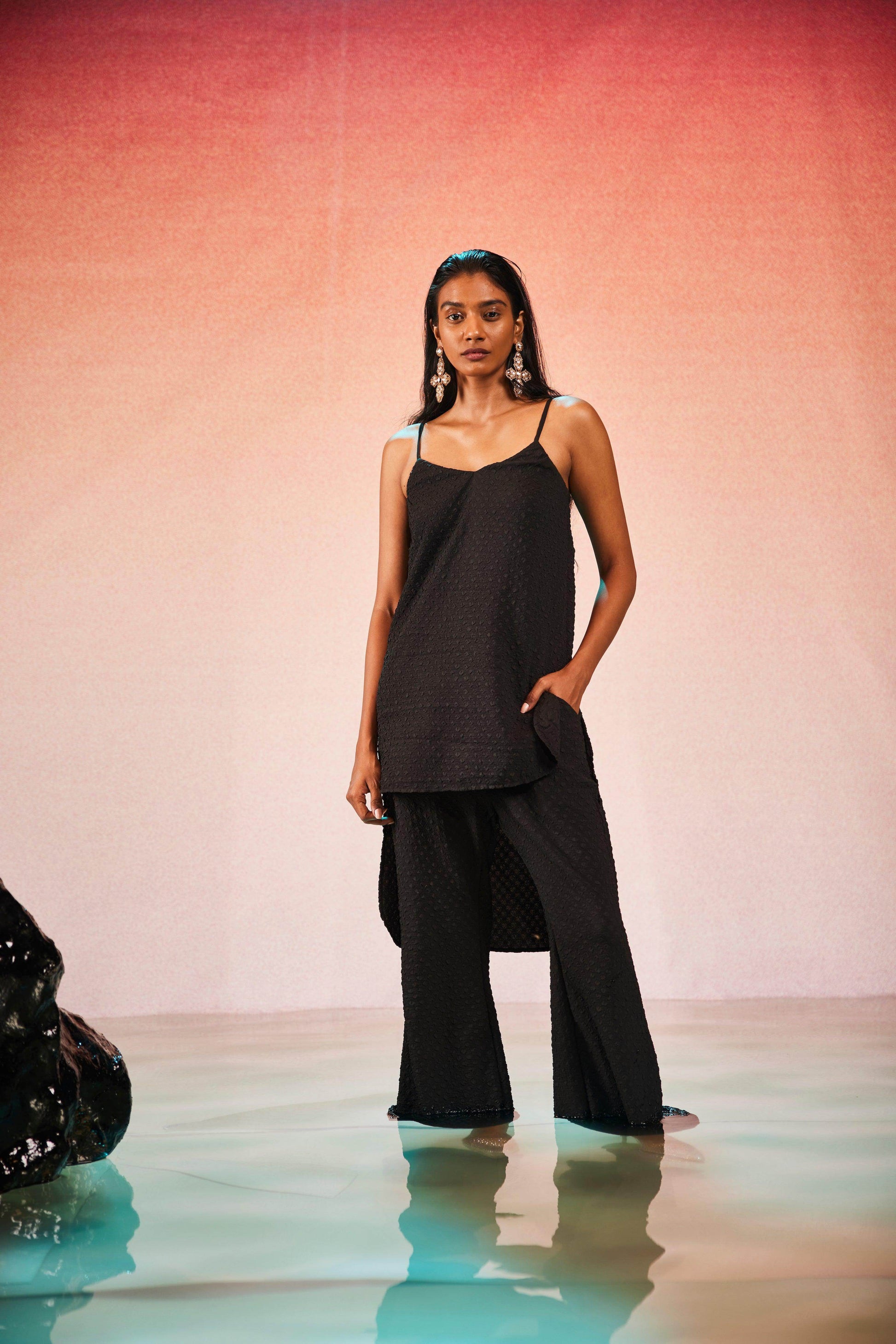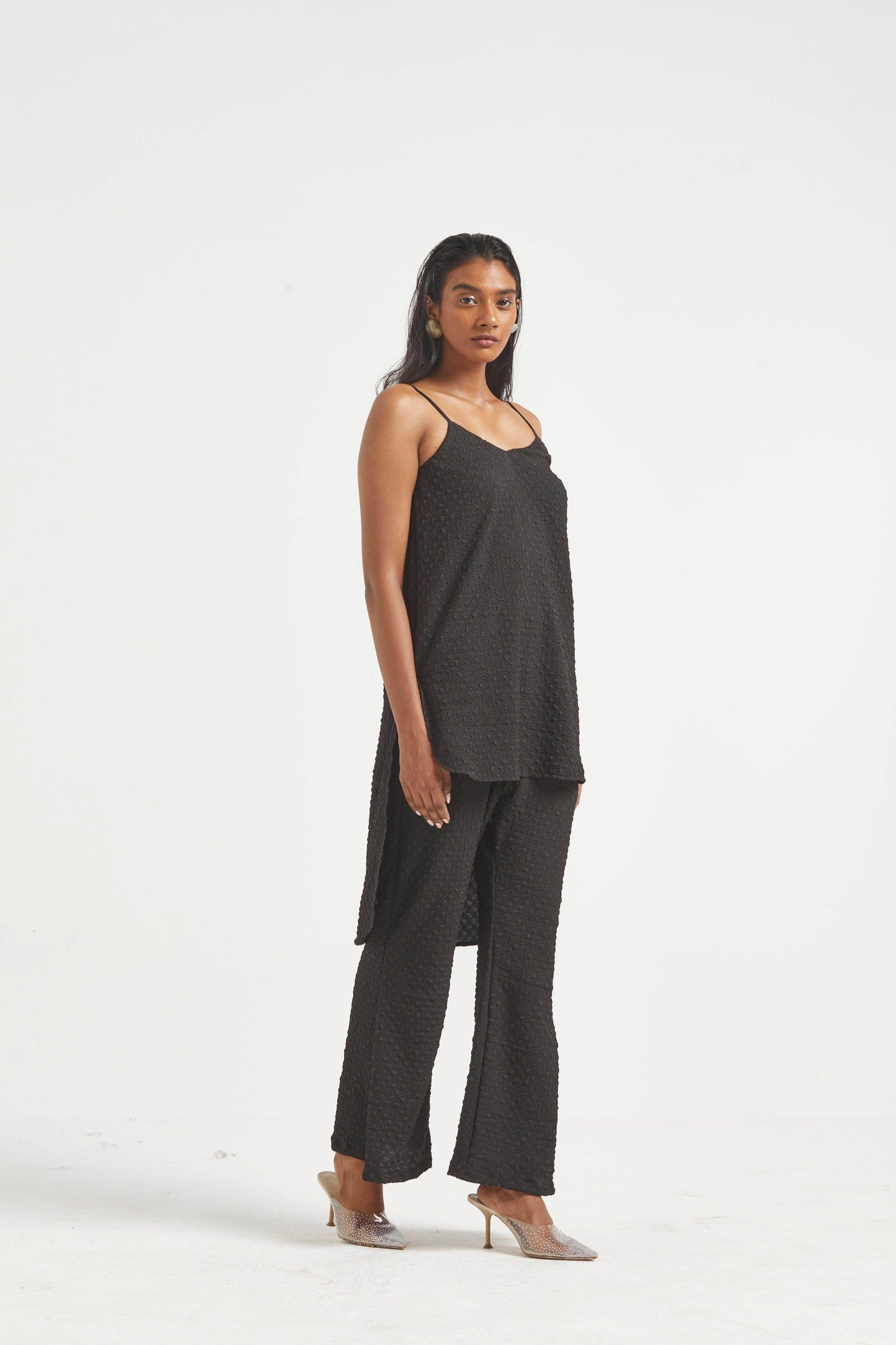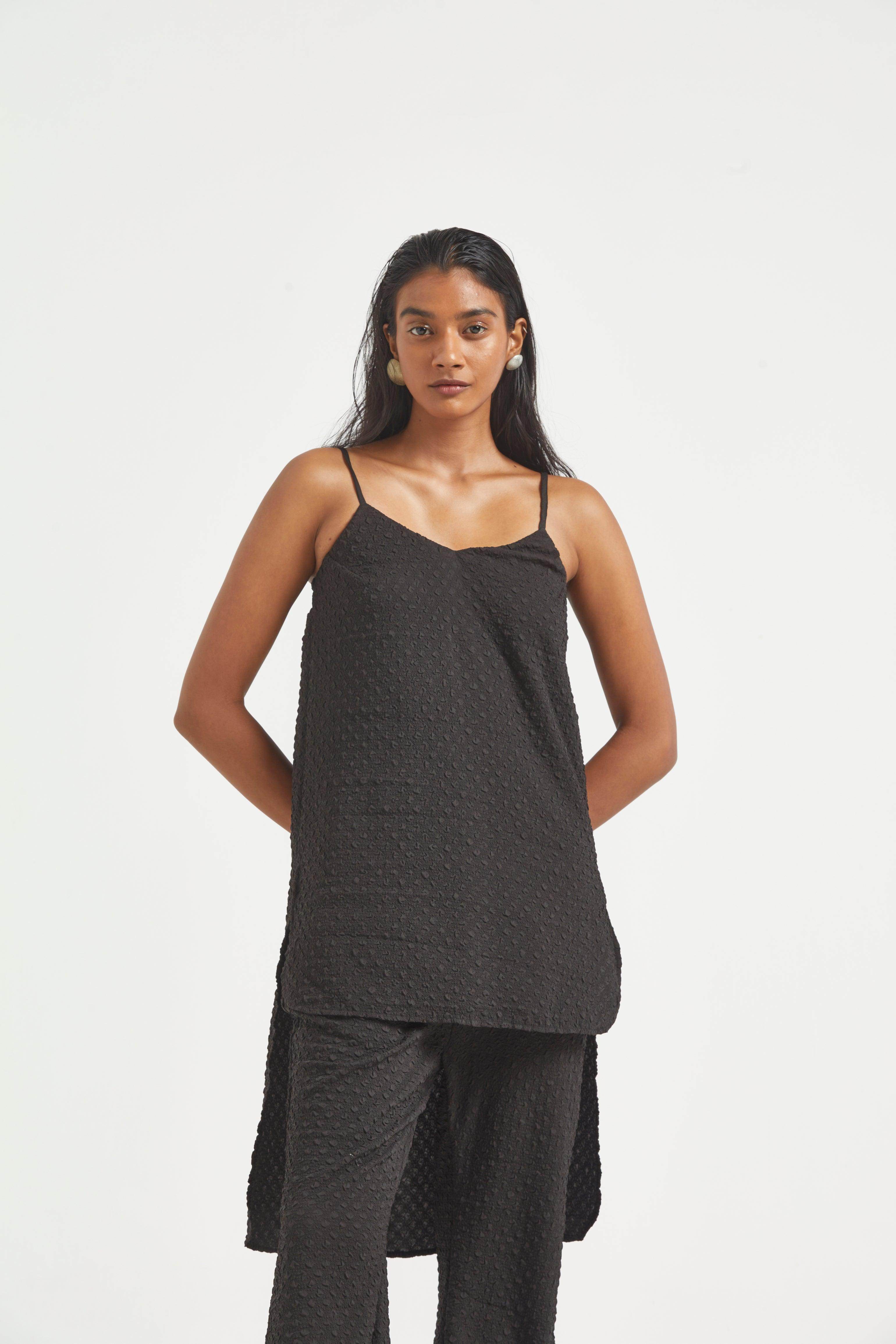 High low top in crushed and embossed black fabric. Adjustable straps on shoulder, elasticated at the back. Vent on sides. Paired with matching flared pants. Pockets on the side, elasticated at the waist.