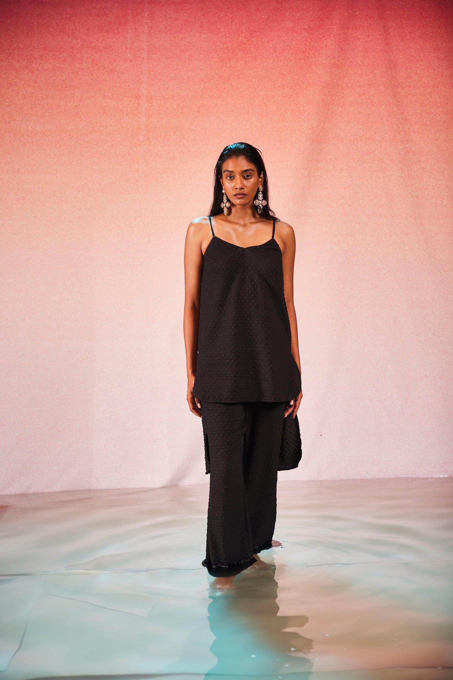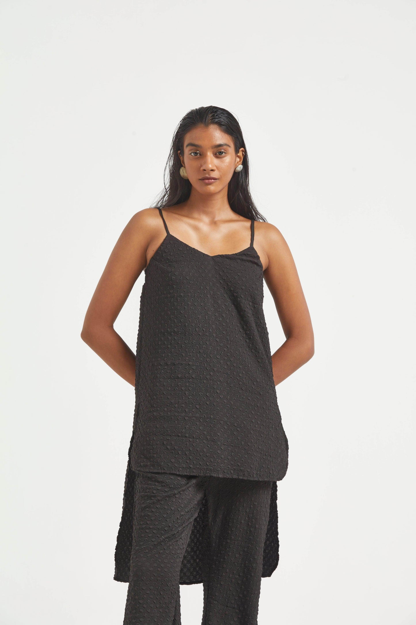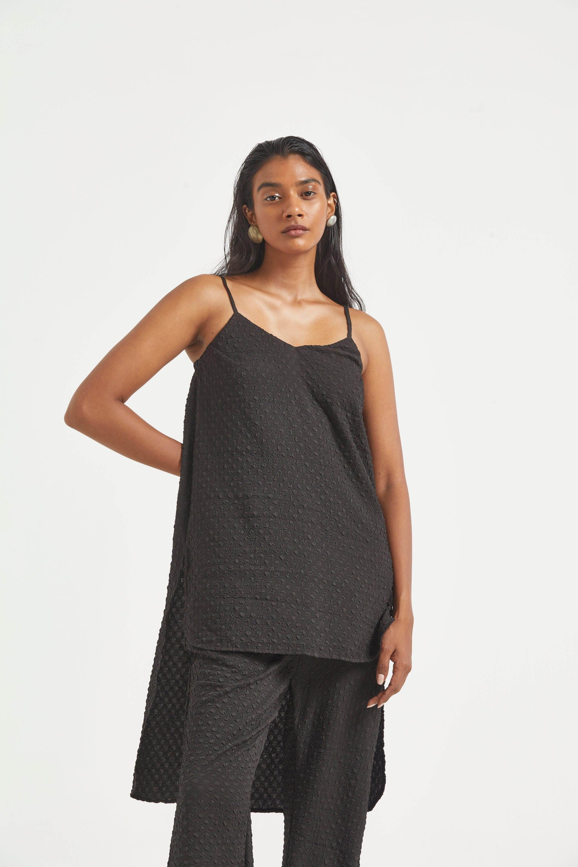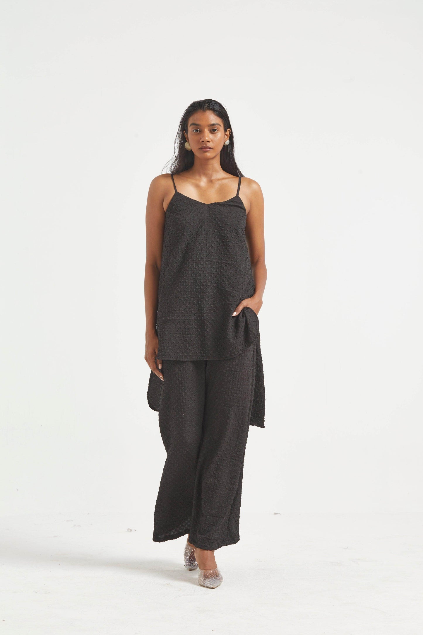 High low top in crushed and embossed black fabric. Adjustable straps on shoulder, elasticated at the back. Vent on sides. Paired with matching flared pants. Pockets on the side, elasticated at the waist.