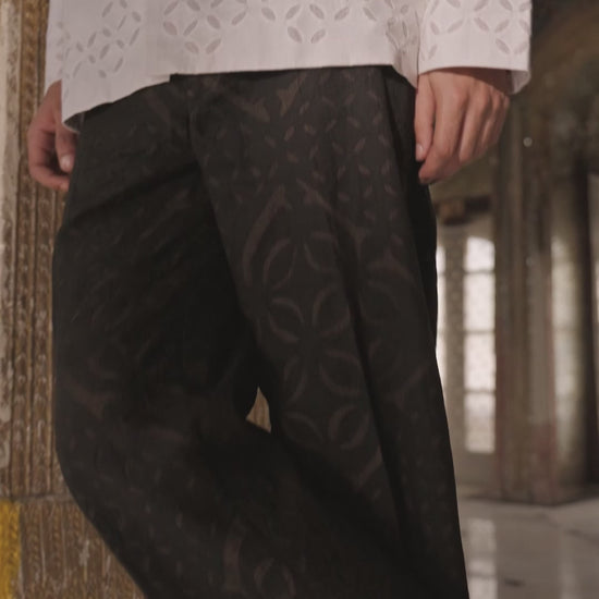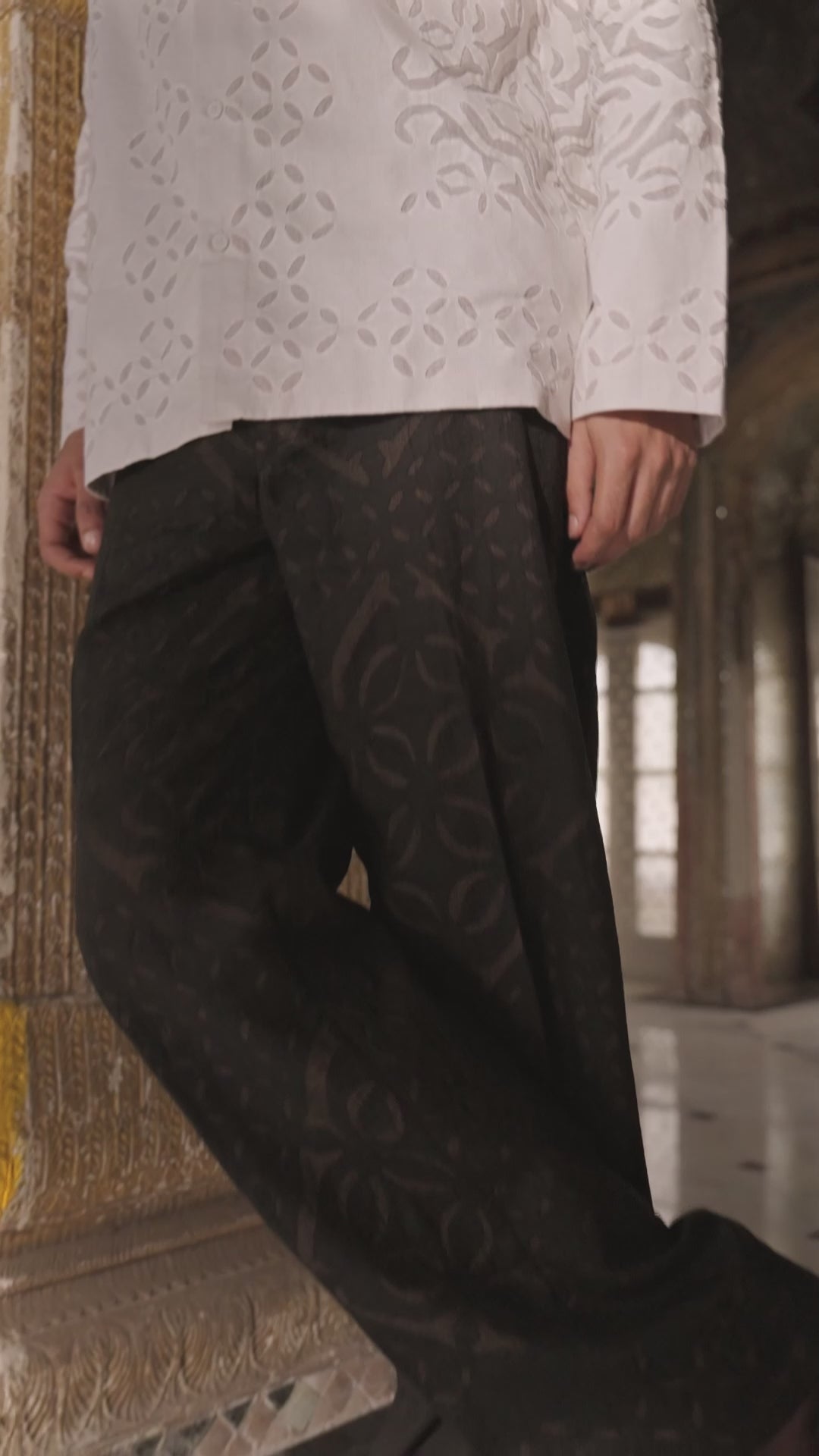 Black straight cut pant in all-over hand-sewn cutwork appliqué. Concealed zip and button closure with belt loops at the waist. Pockets in the sides. Garment is fully lined. Lightweight fabric with intricate placement for a textural finish. As these are manually cut and embroidered, slight variations in the cutwork patterns may occur from piece to piece, making each pant unique.