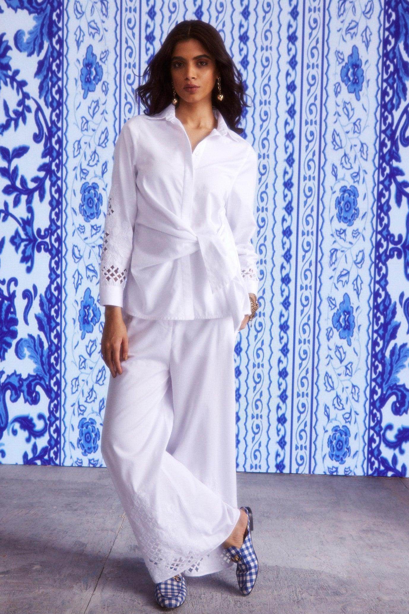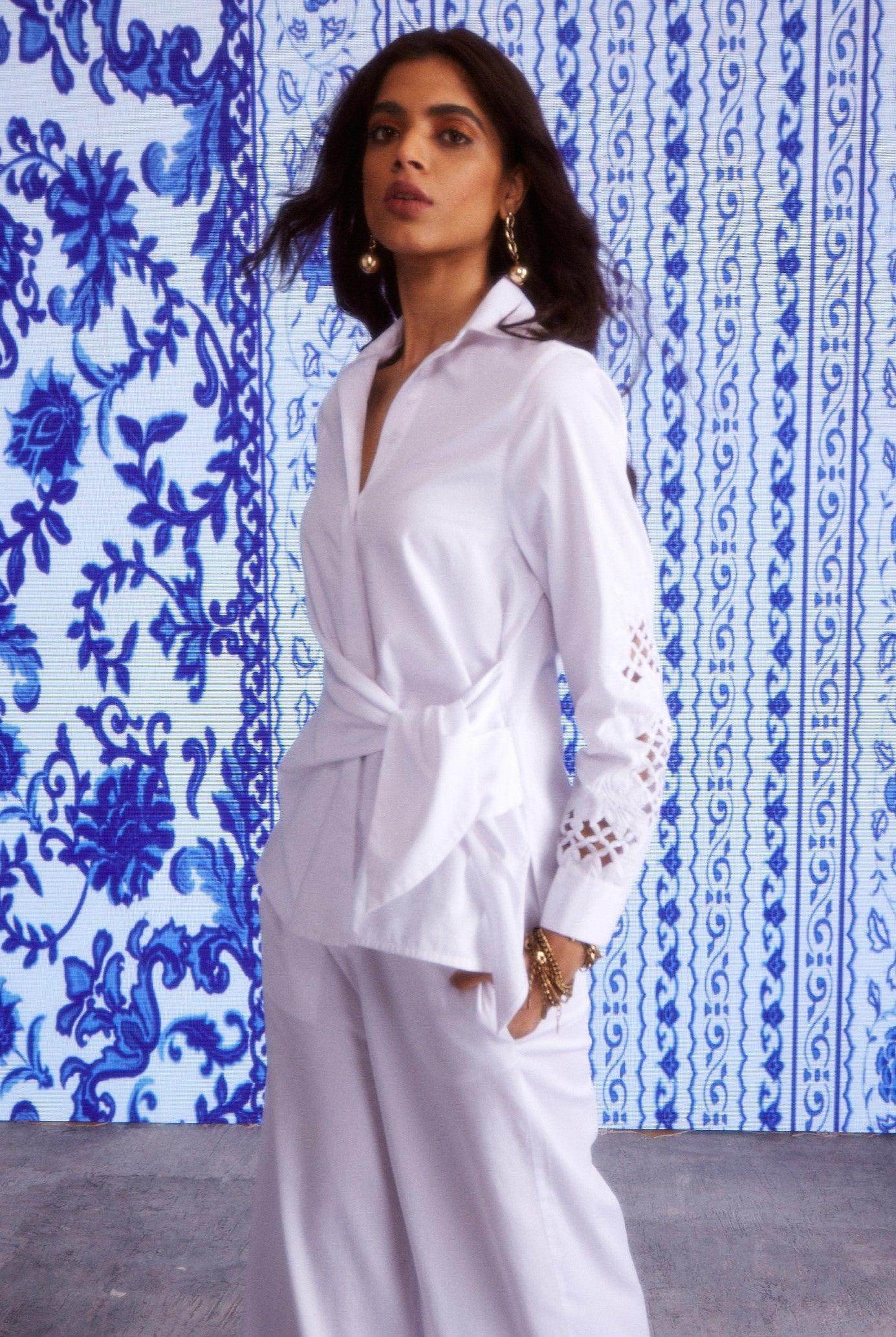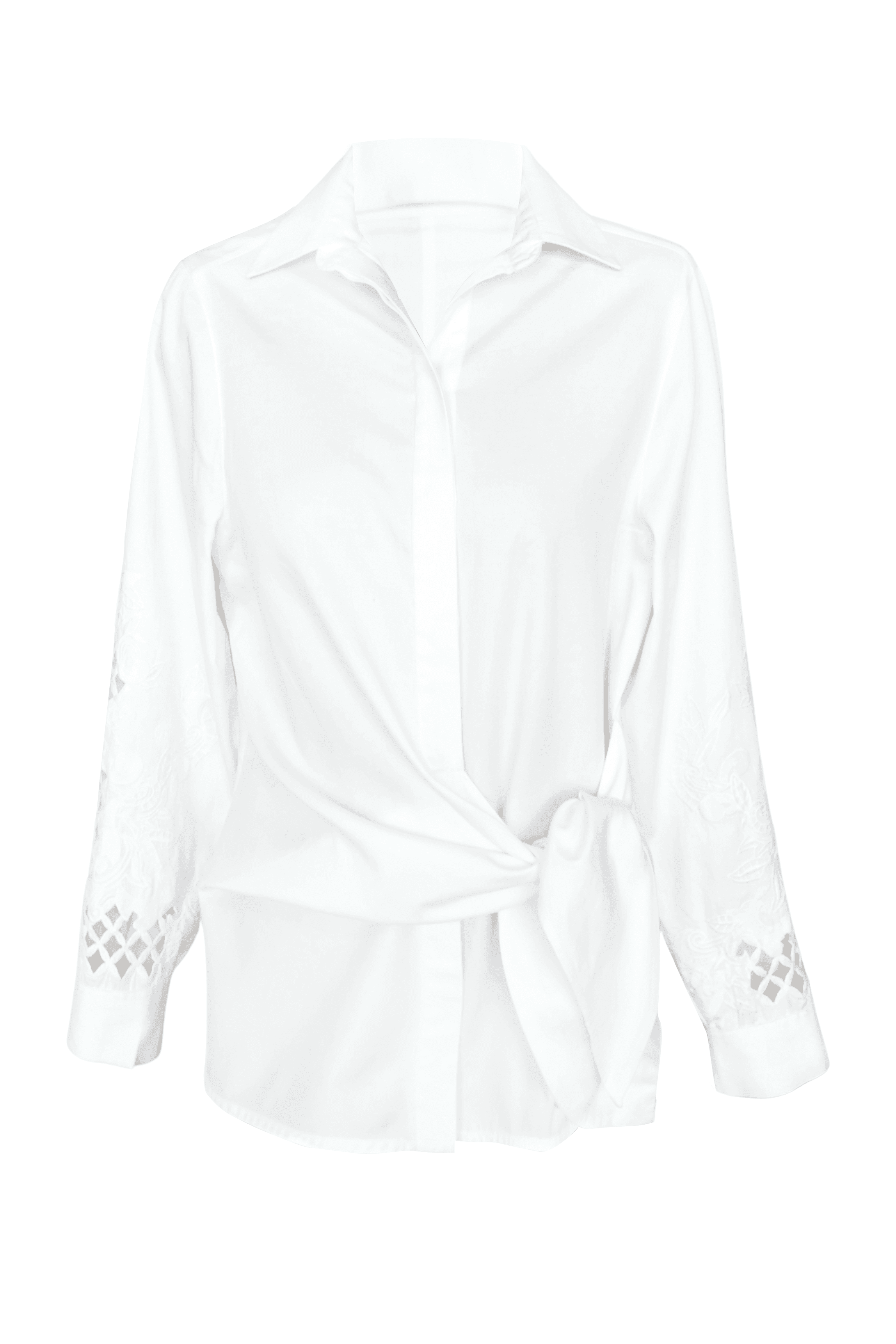 White cotton poplin full sleeve button-down shirt with a self-tie knot on the side. Placement tonal cutwork embroidery detail on the cuff of the sleeves. Regular fit.