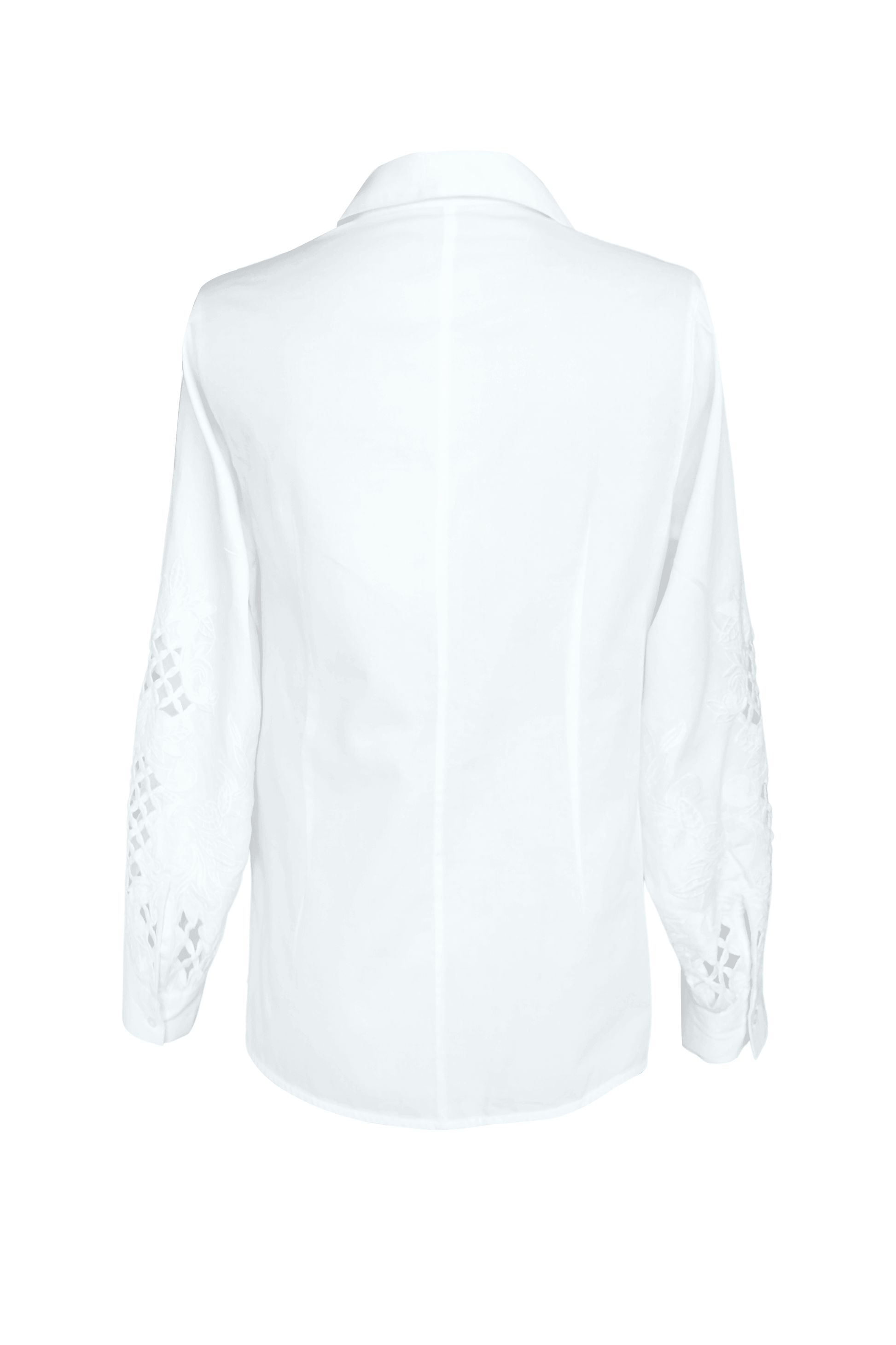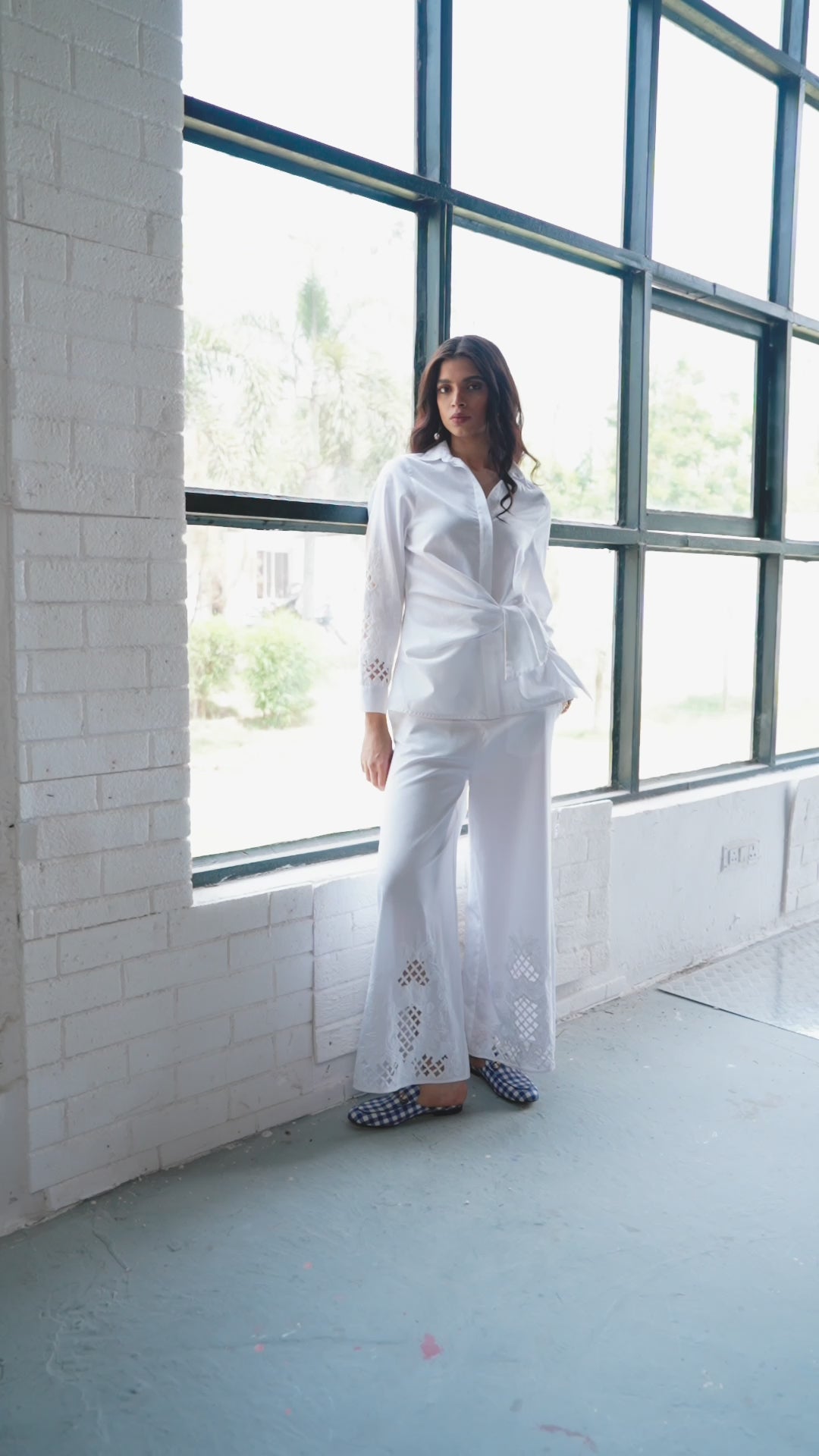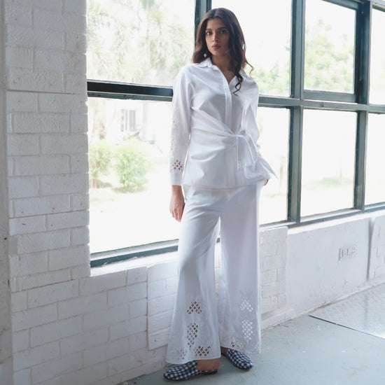 White cotton poplin full sleeve button-down shirt with a self-tie knot on the side. Placement tonal cutwork embroidery detail on the cuff of the sleeves. Regular fit.