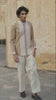 Light khaki organic cotton poplin full sleeve shirt with placed contrast off white fine embroidery on the center front, collar and sleeve cuff. Band collar, concealed placket. Regular fit.