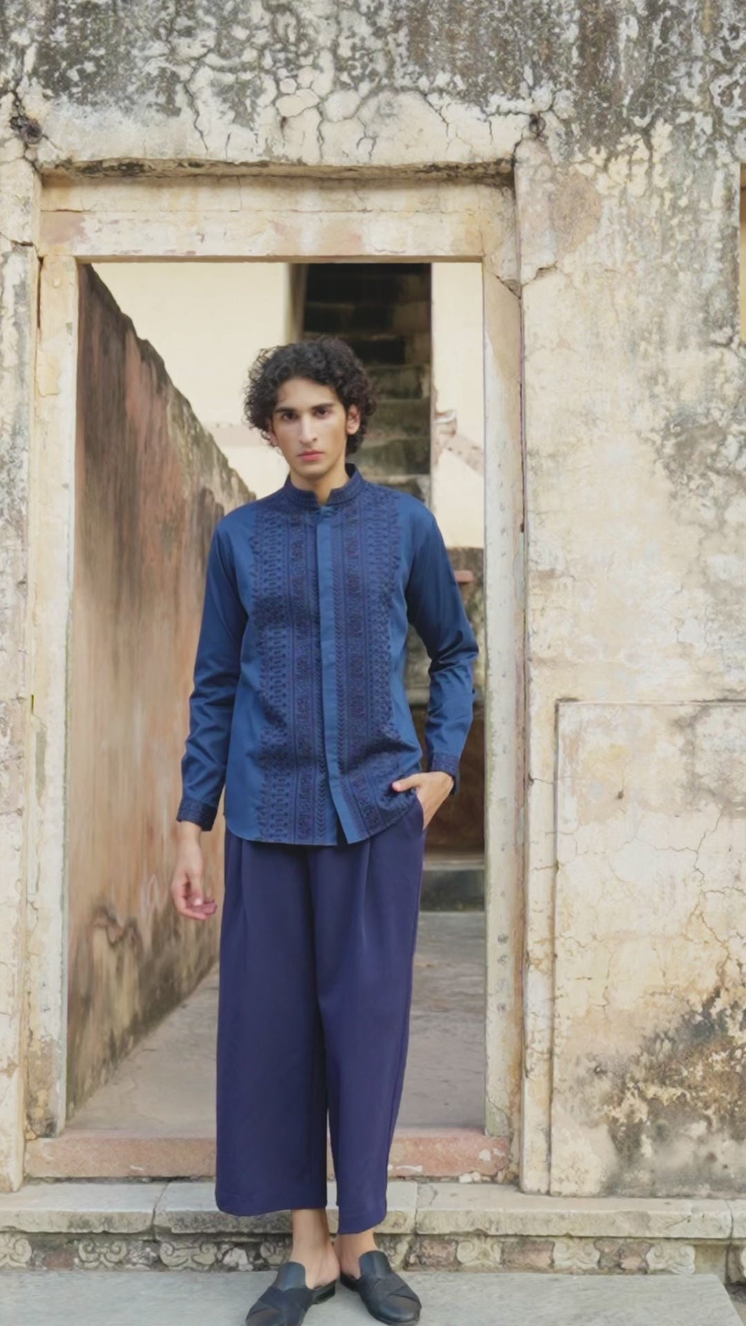 Blue organic cotton poplin full sleeve shirt with placed tonal darker navy embroidery on the center front, collar and sleeve cuff. Band collar, concealed placket. Regular fit.