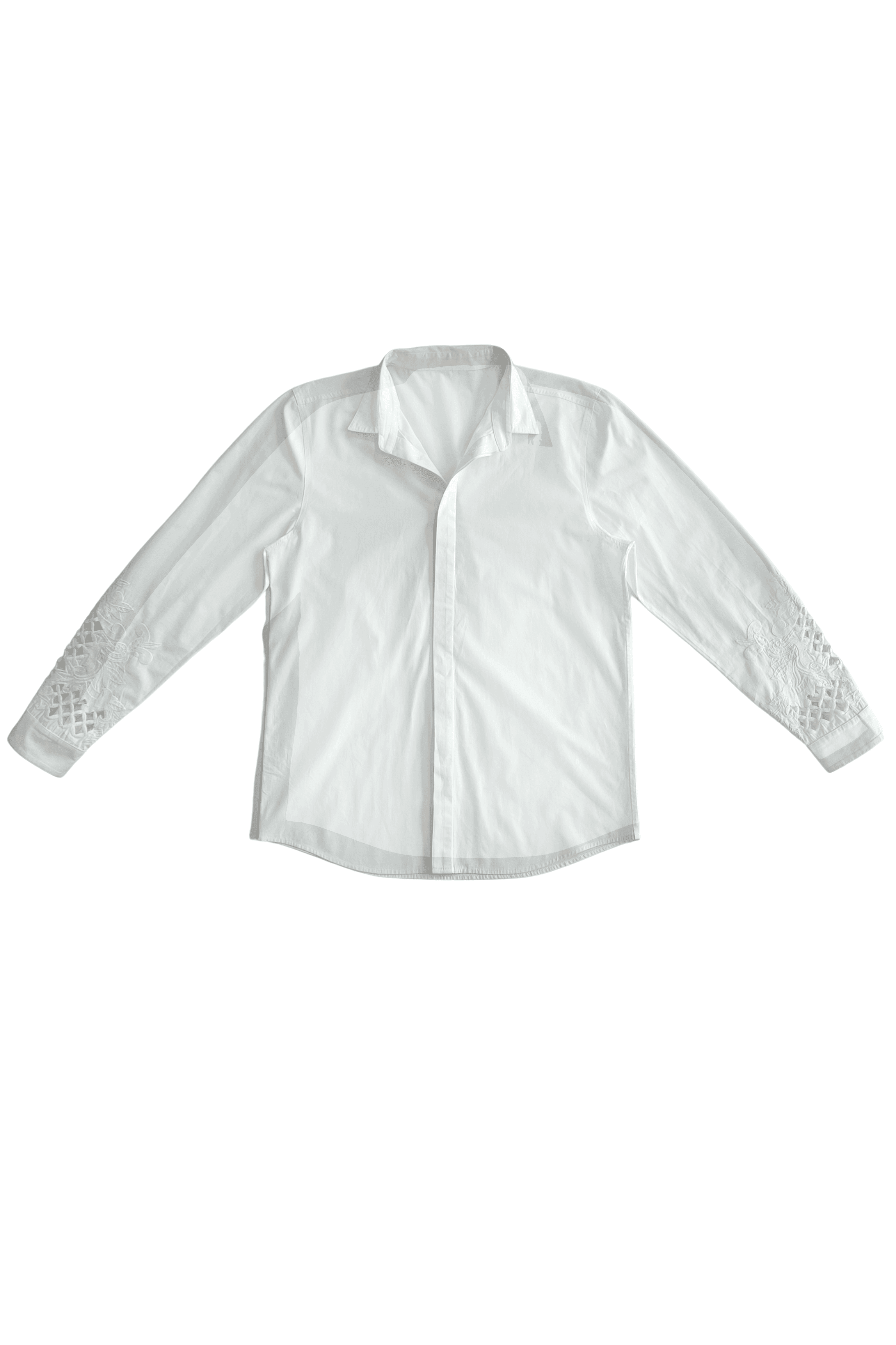 White full sleeve cotton poplin shirt with tonal cutwork embroidery detail around the sleeve cuff. Concealed button placket. Regular fit.